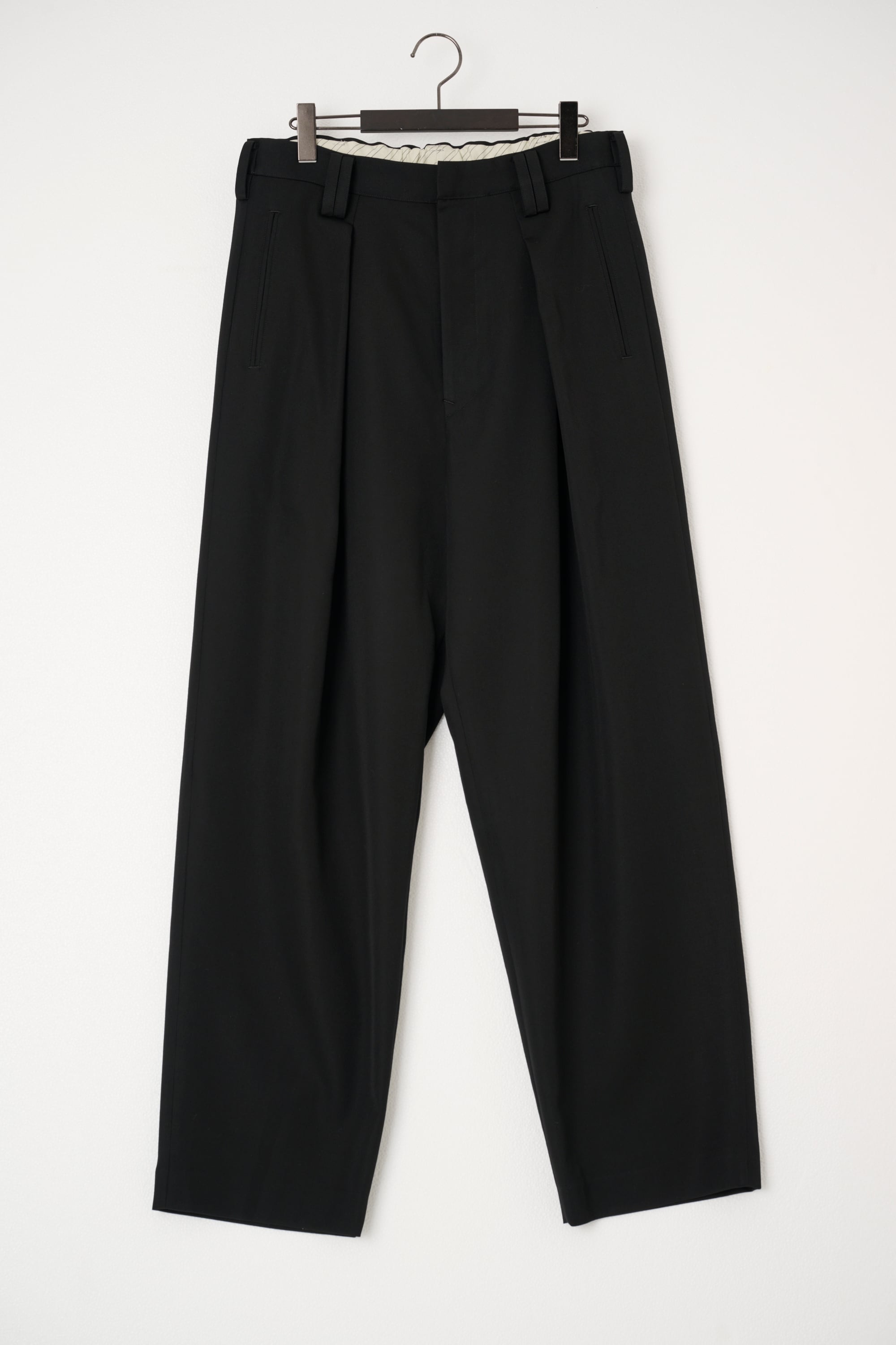 フロントのクロスタックが⽴体的なシルエットを⽣み出し、素材のドレープ感を感じるパンツです。セミワイドめなシルエットながら、腰回りはすっきりとするよう調整し、上品でエレガントなバランスに仕上がっています。