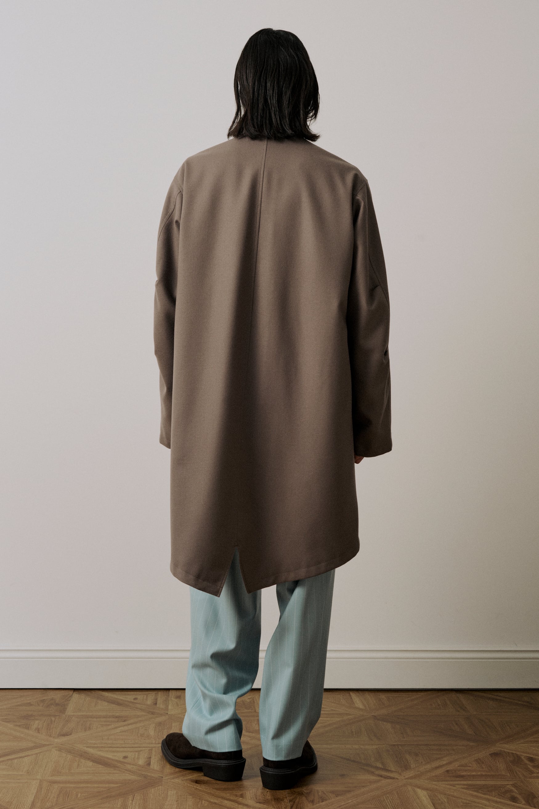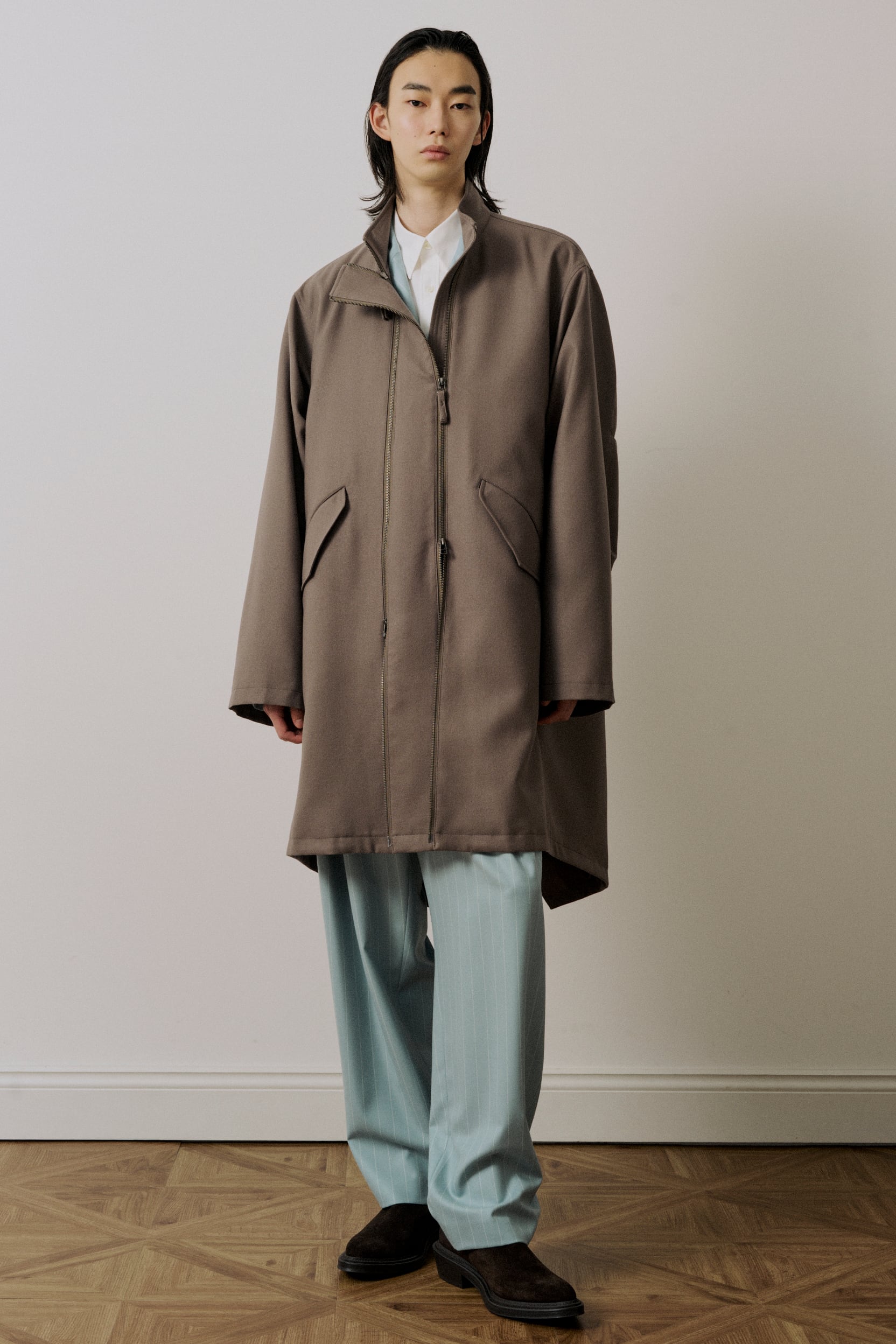 ウール特有の暖かさと柔らかな質感が特徴で、上品で落ち着いた印象を与えます。フロントはダブルファスナー仕様で、着脱のしやすさとスタイリングのアレンジが可能です。デザインベースはモッズコートを踏襲しつつ、現代的なシルエットで仕上げられています。