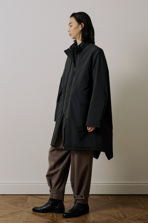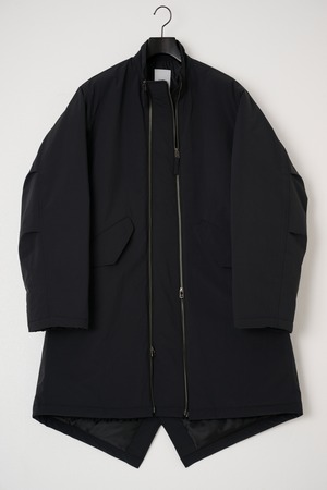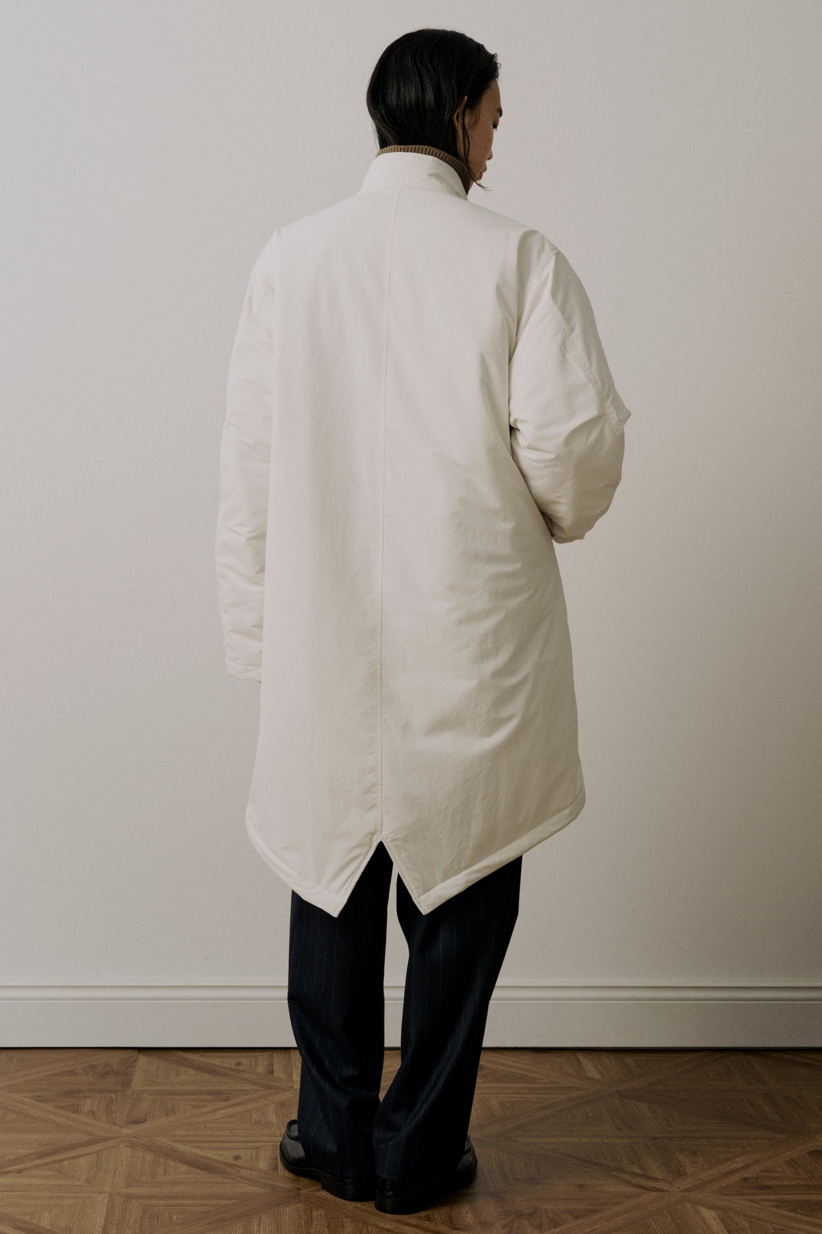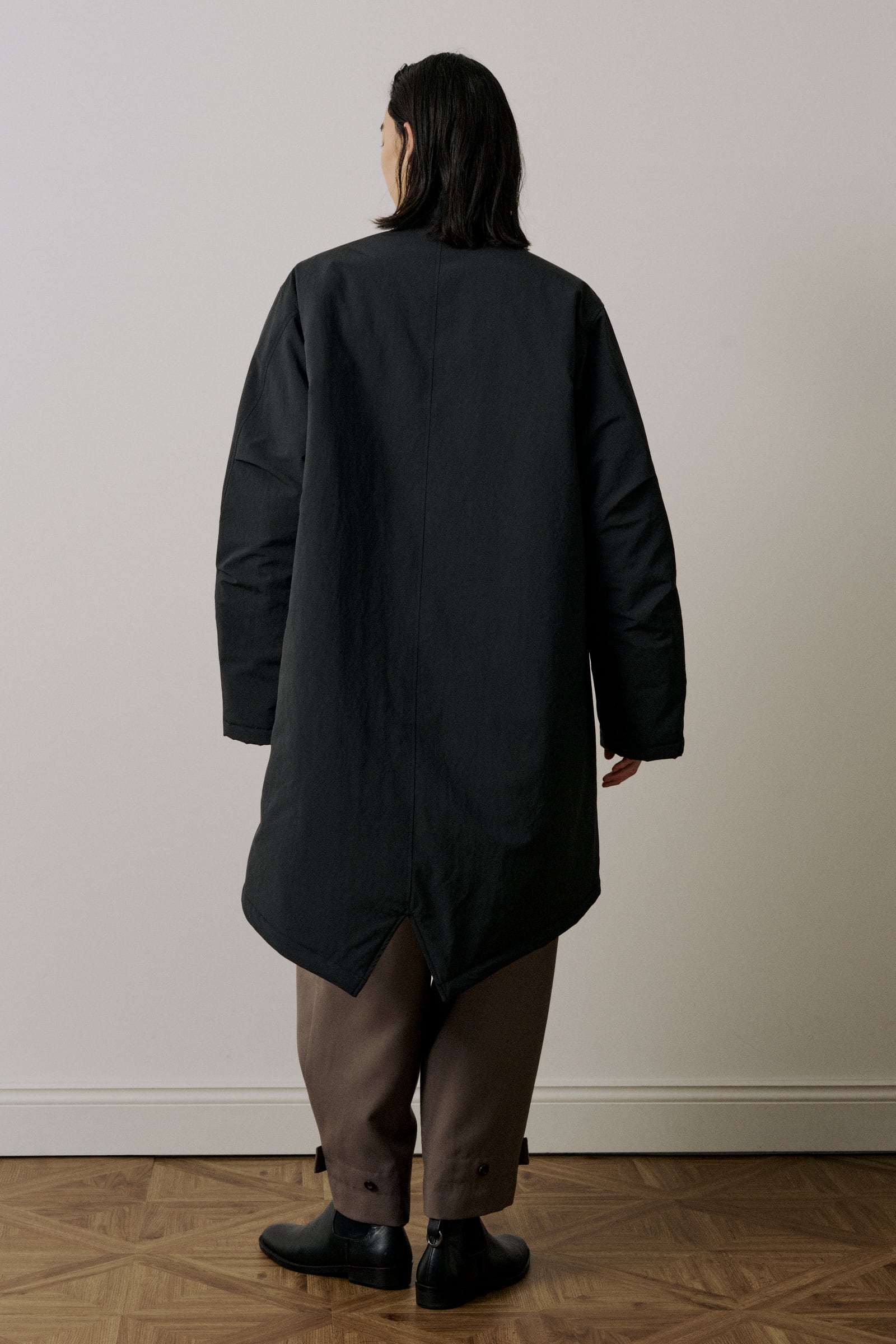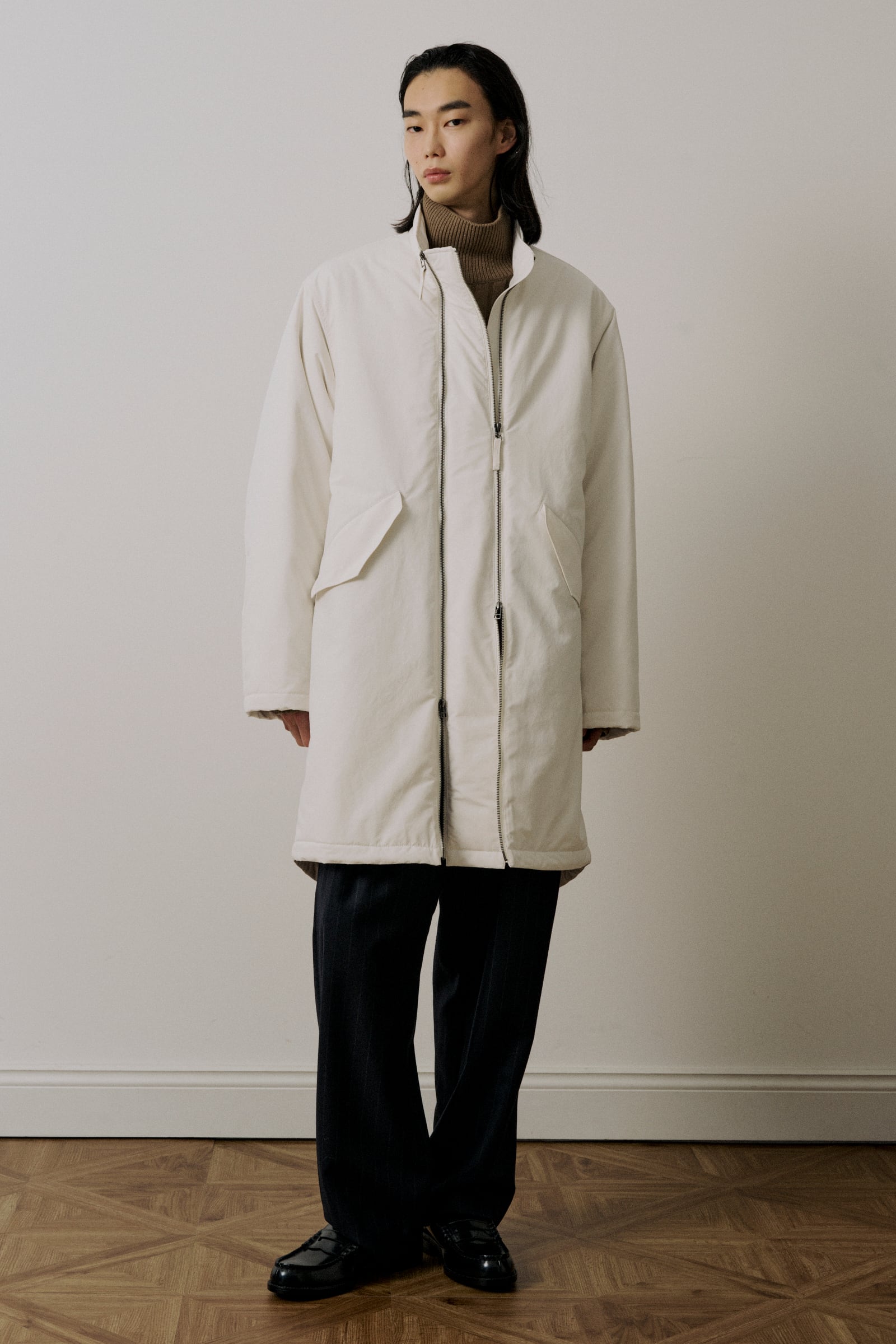 モッズコートをベースに、ダブルファスナー仕様にアレンジし、ミニマルなディテールで都会的なデザインに仕上げました。裏地には光電子の綿を使用したキルティングを採用し、軽さと高い保温性を両立しています。