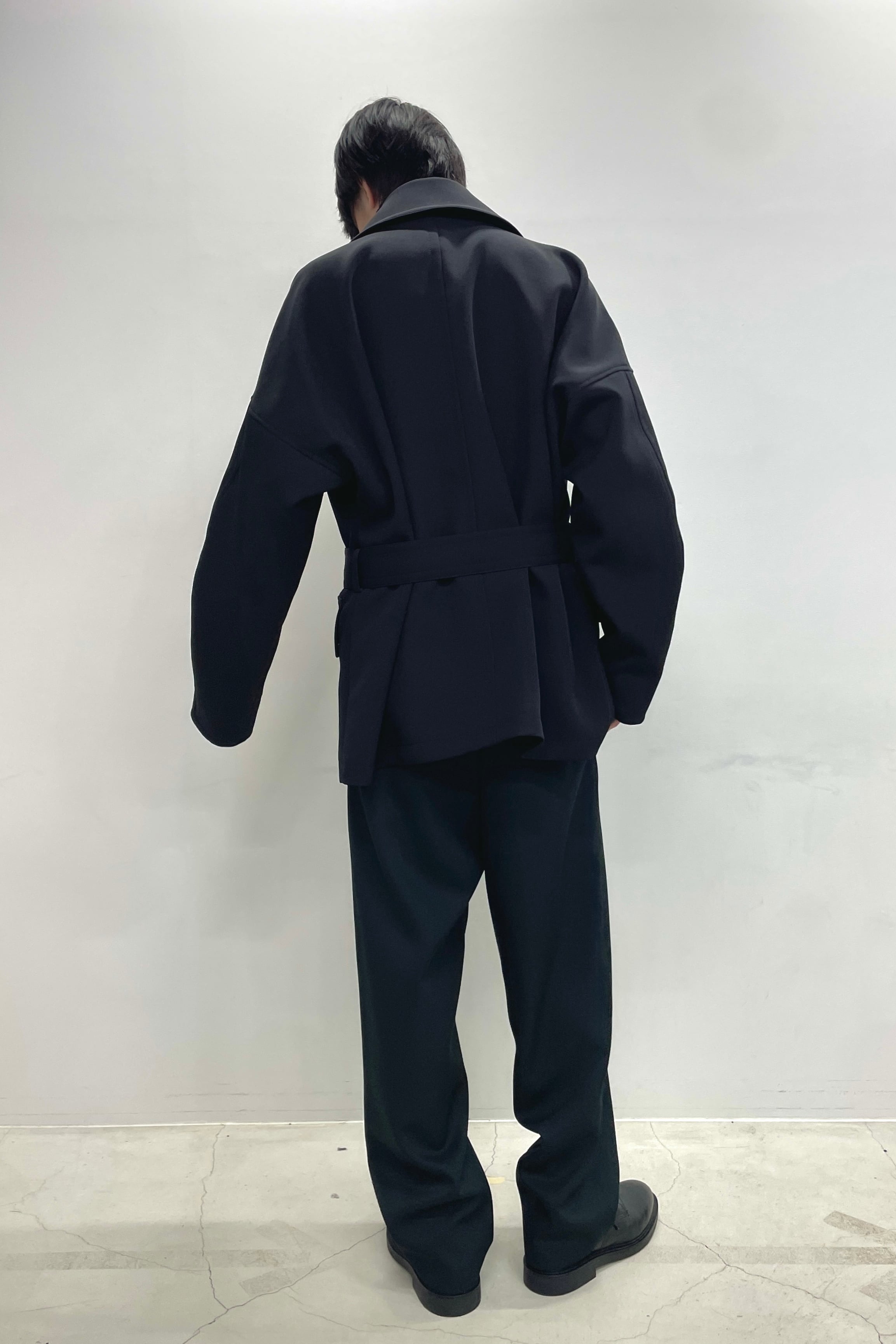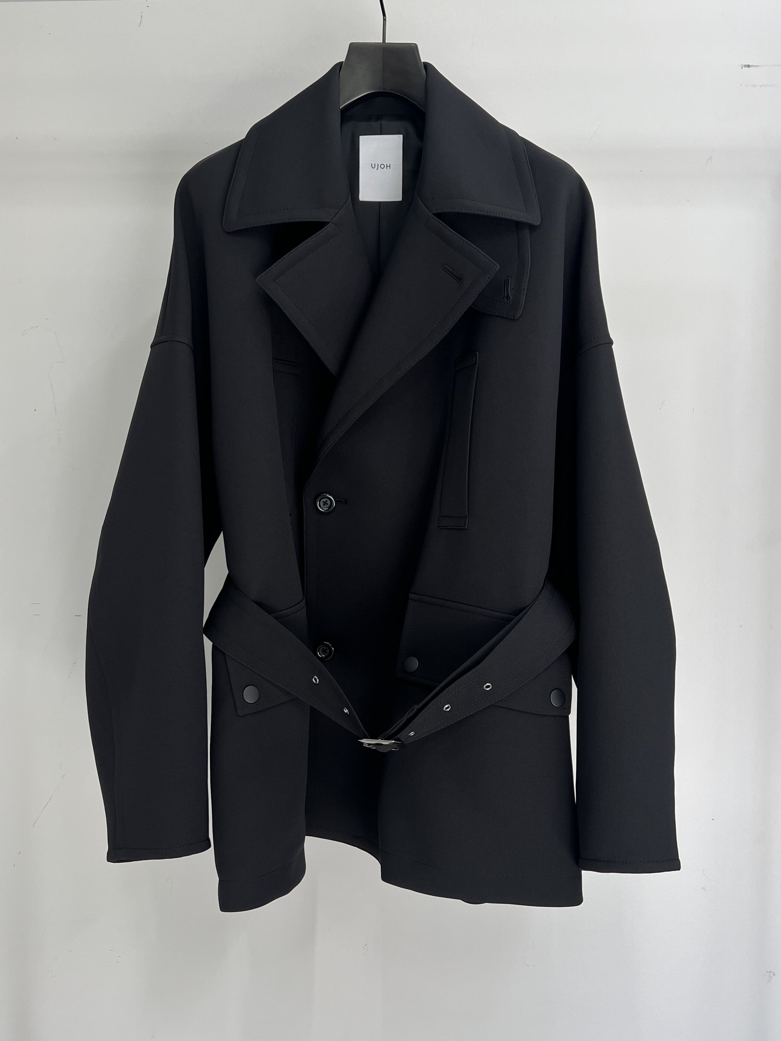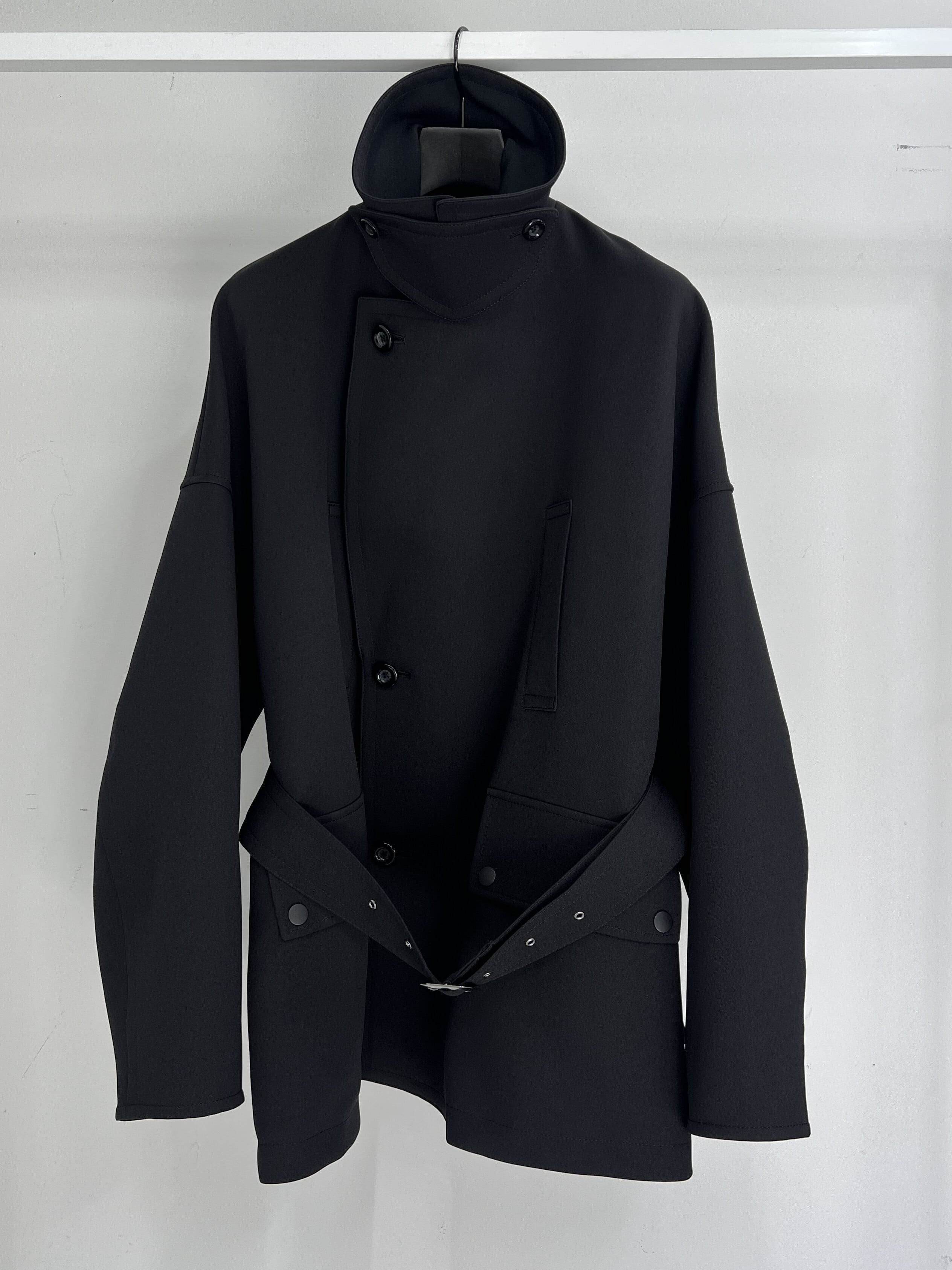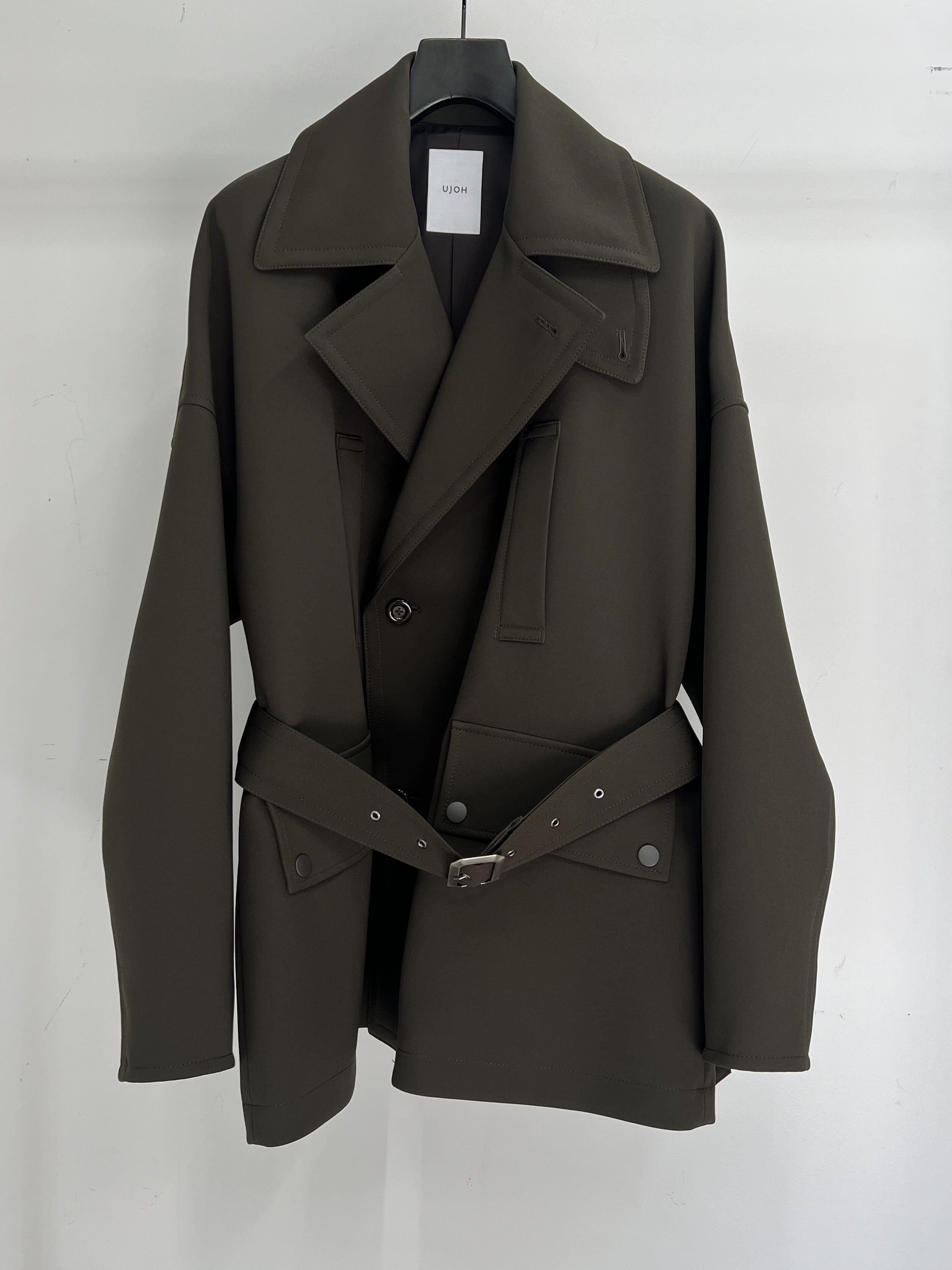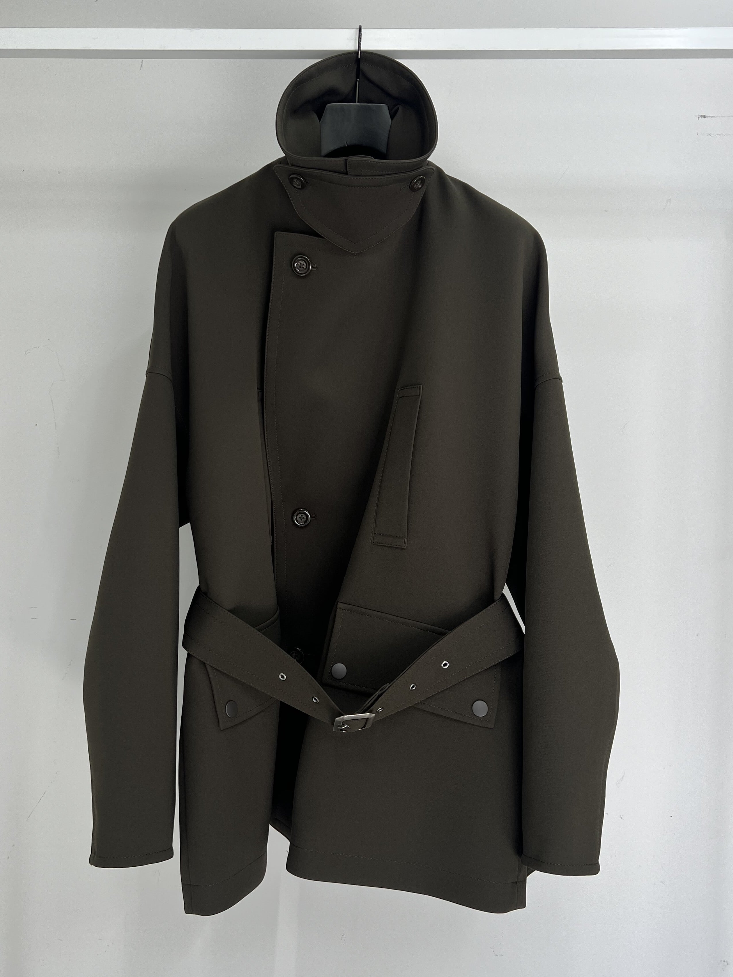 スタンドカラーとウエストベルトがシルエットを引き締め、クラシックながらモダンな印象のミドル丈コートです。ドロップショルダーとオーバーサイズなシルエットです。腰にはフラップ付きポケット、胸にはハンドウォーマーポケットをデザインし、高い機能性と洗練されたデザインを兼ね備えたコートです。