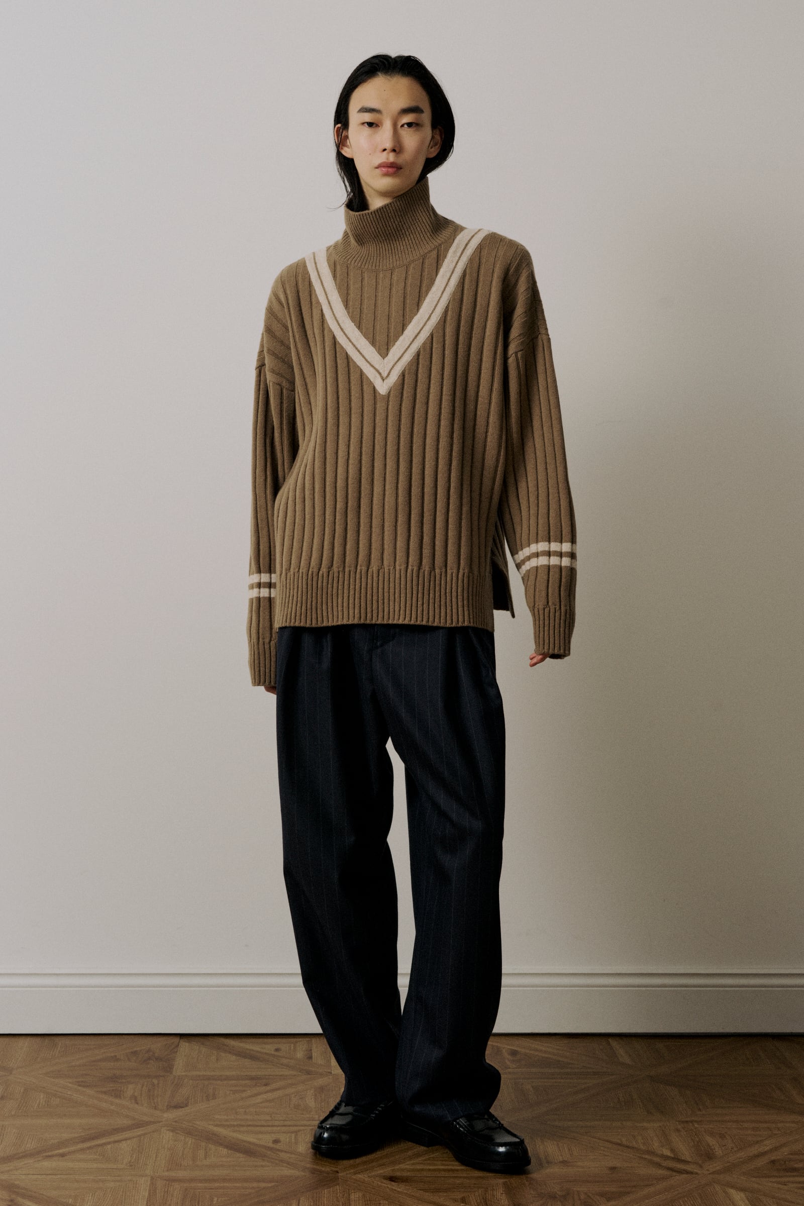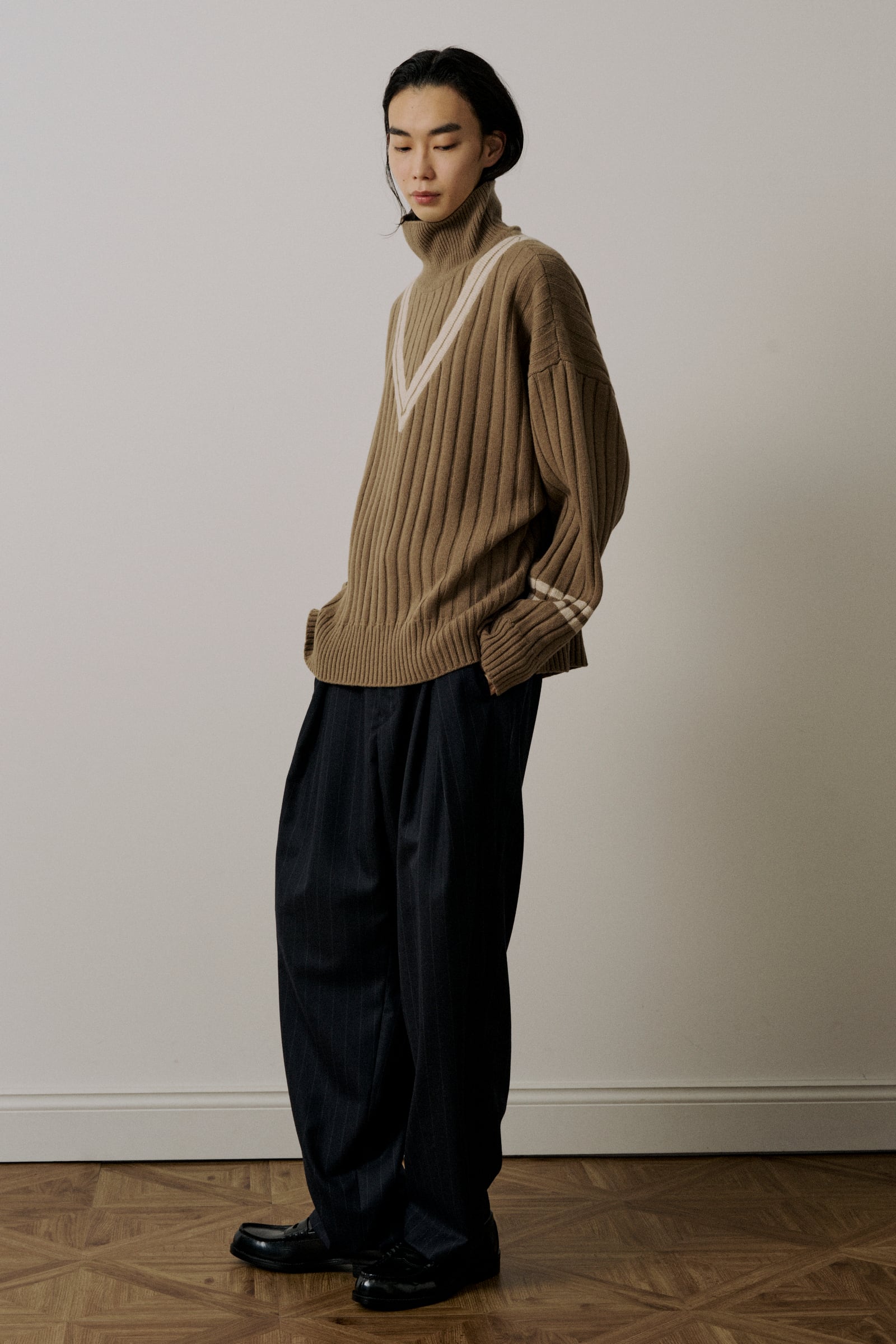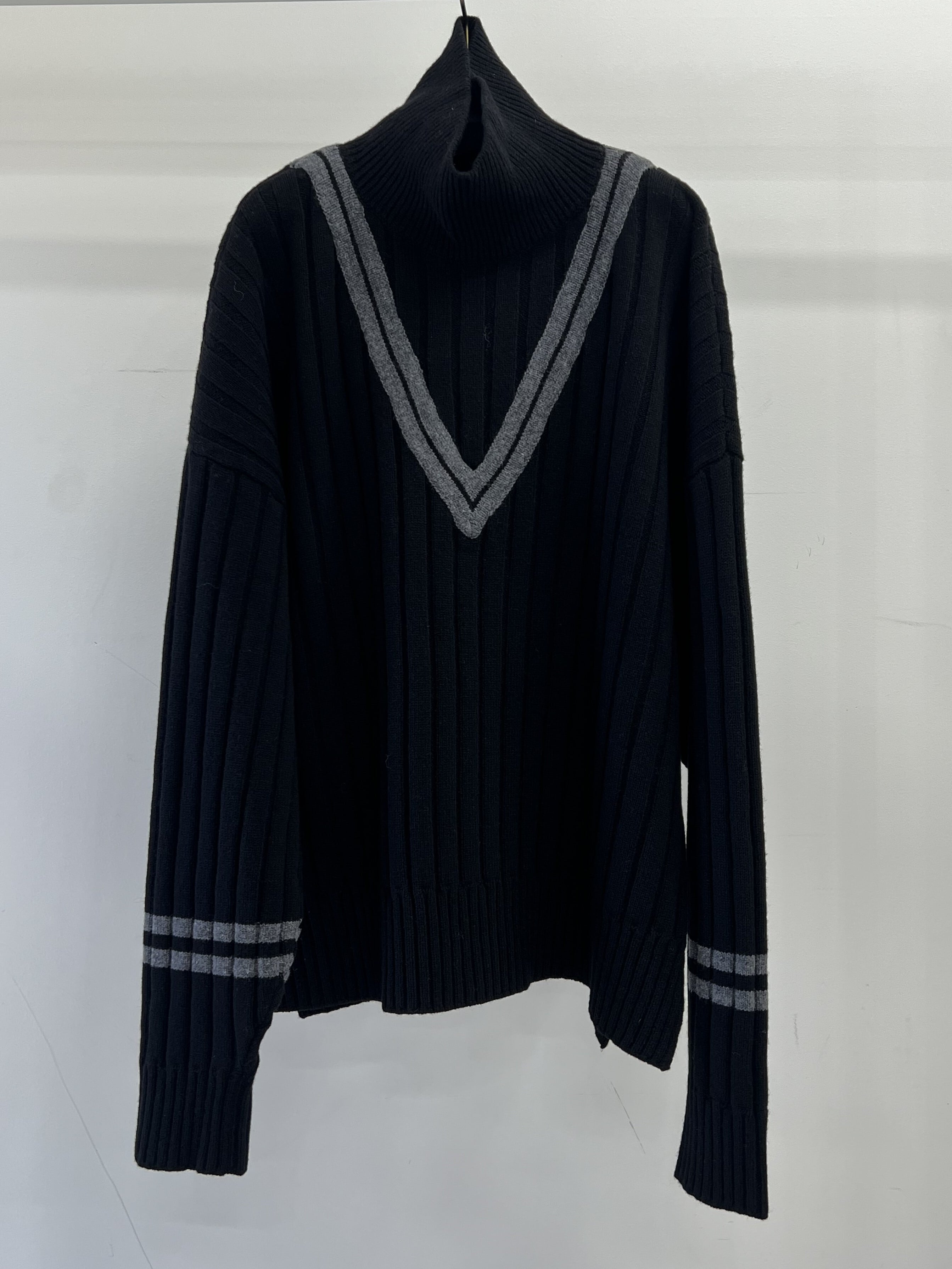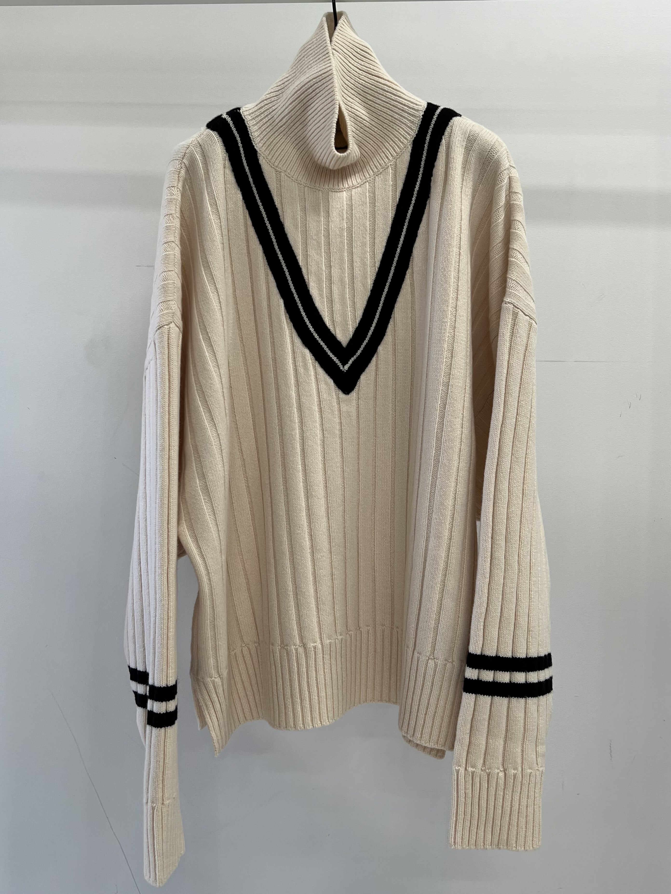 ゆとりのあるクロップドシルエットにボリュームのある袖が特徴のタートルネックニットです。配色のラインがポイントです。