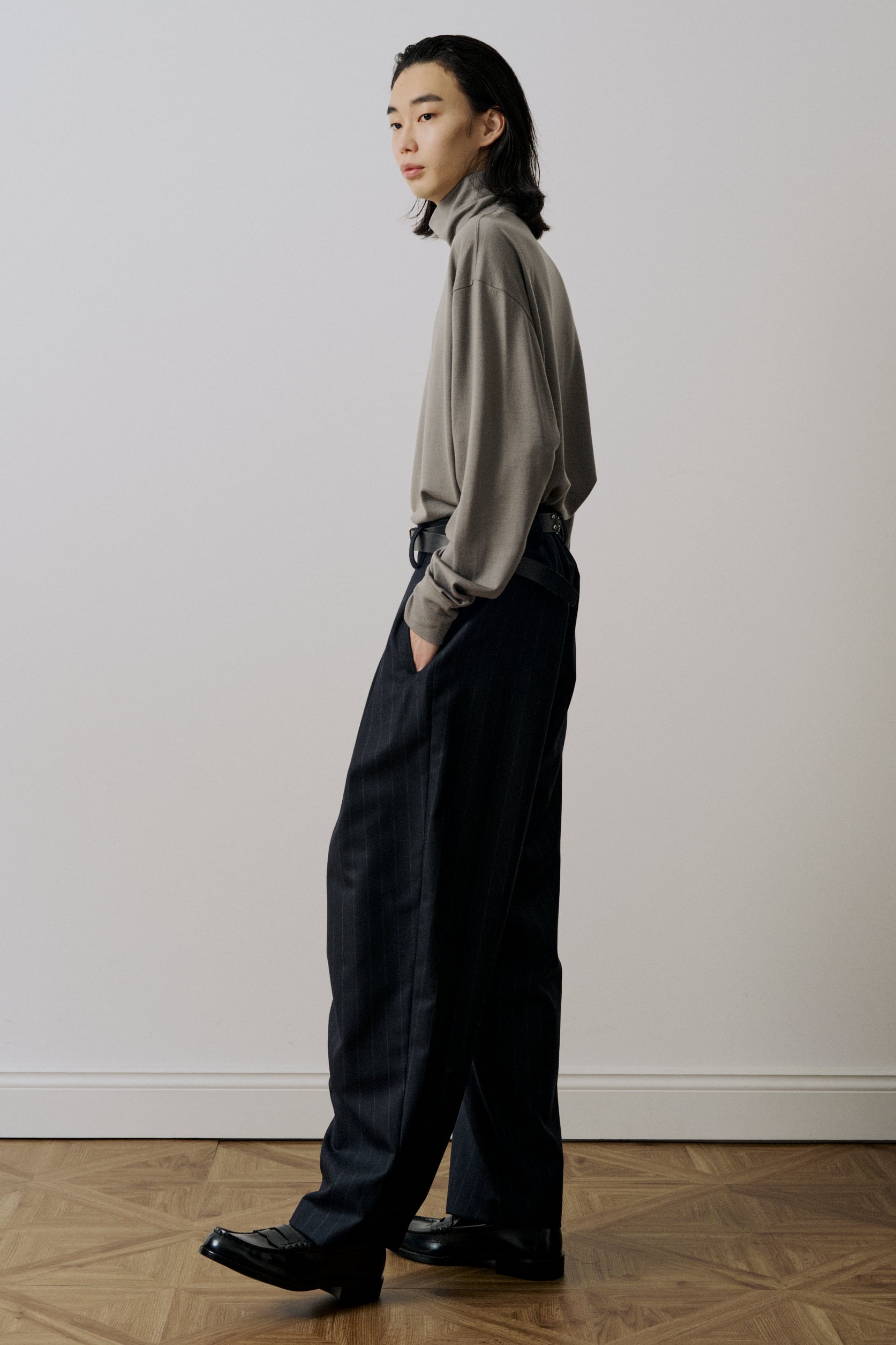 フロントのクロスタックが立体的なシルエットを生み出し、素材のドレープ感を感じるパンツです。セミワイドめなシルエットながら、腰回りはすっきりとするよう調整し、上品でエレガントなバランスに仕上がっています。