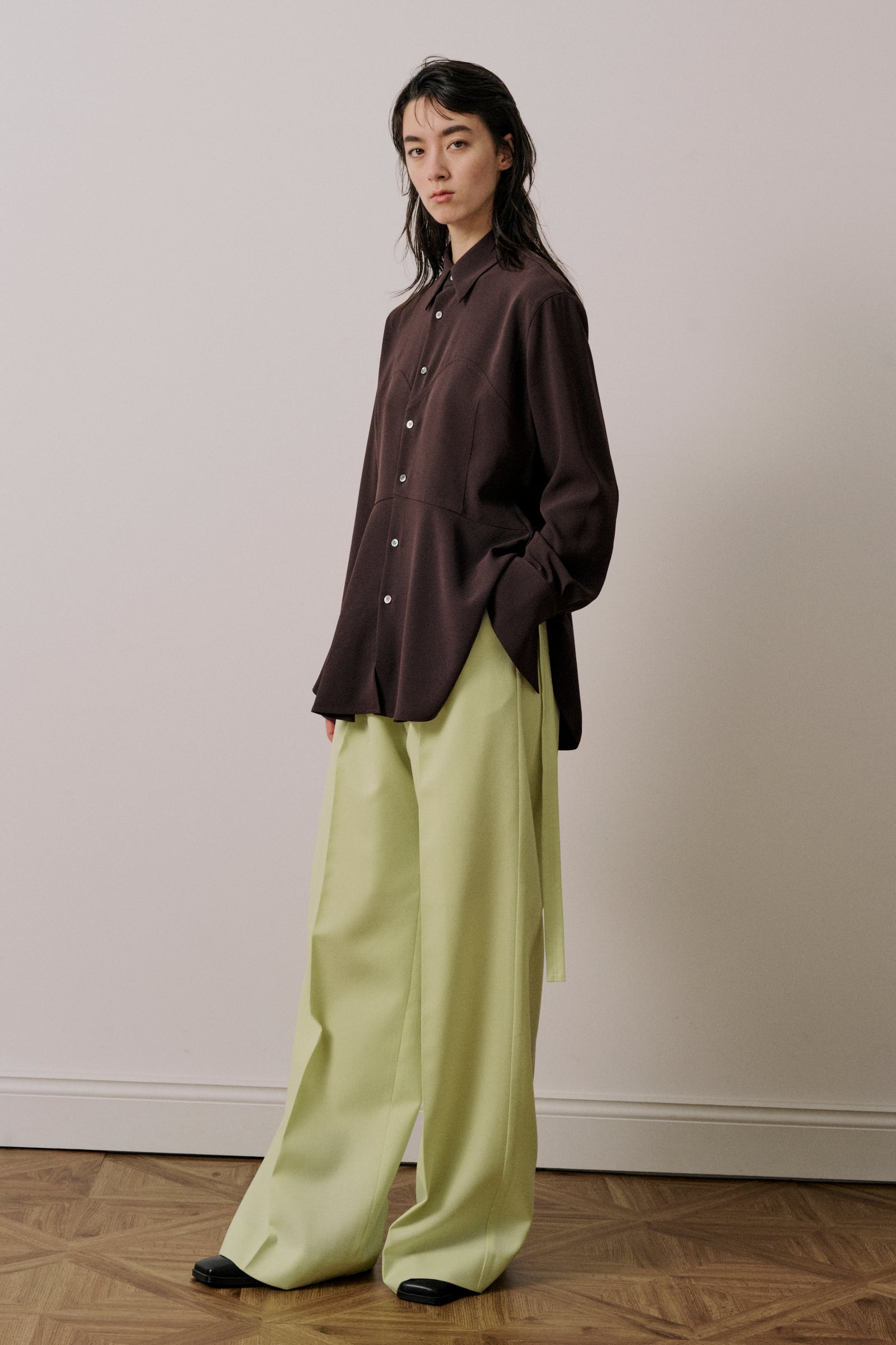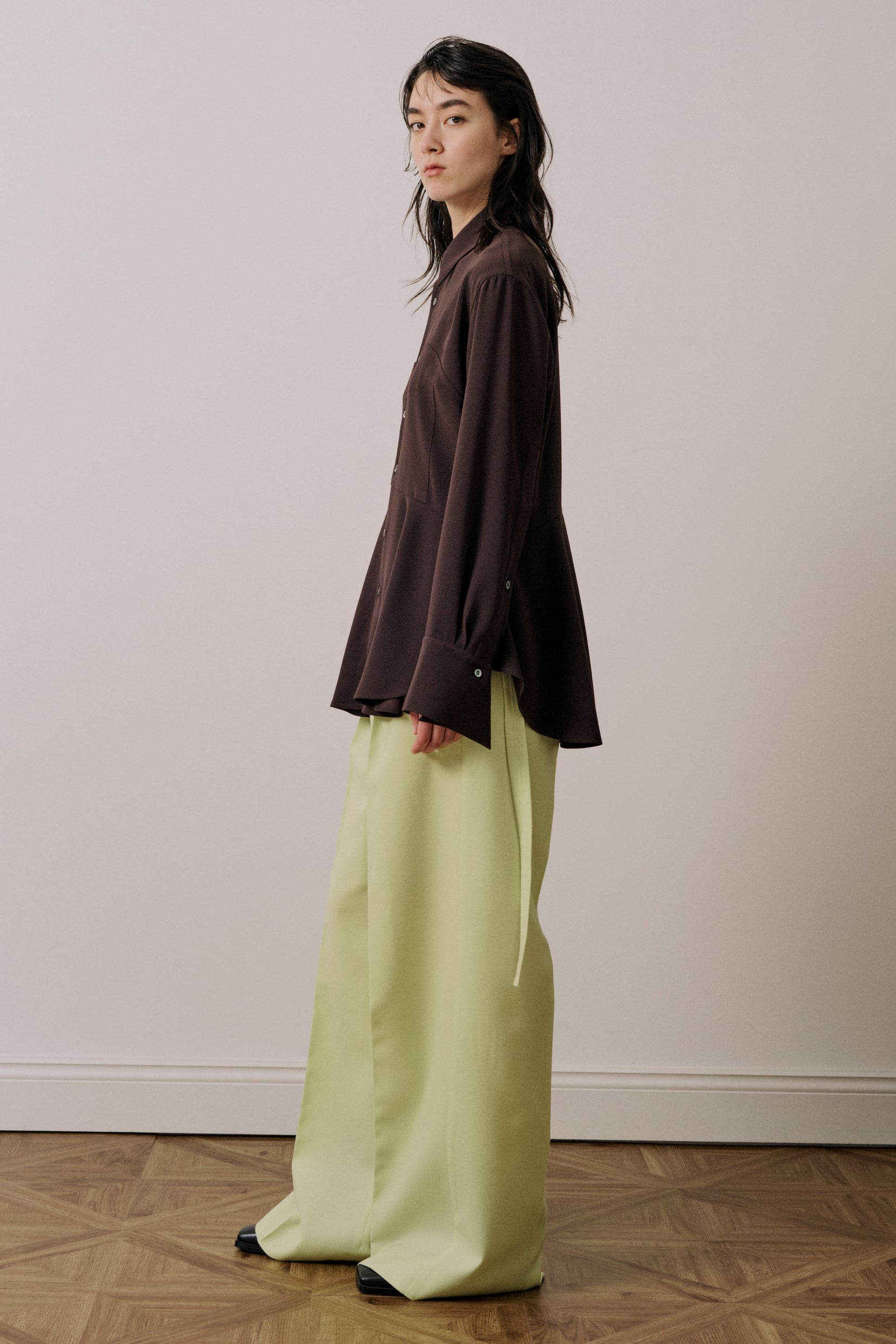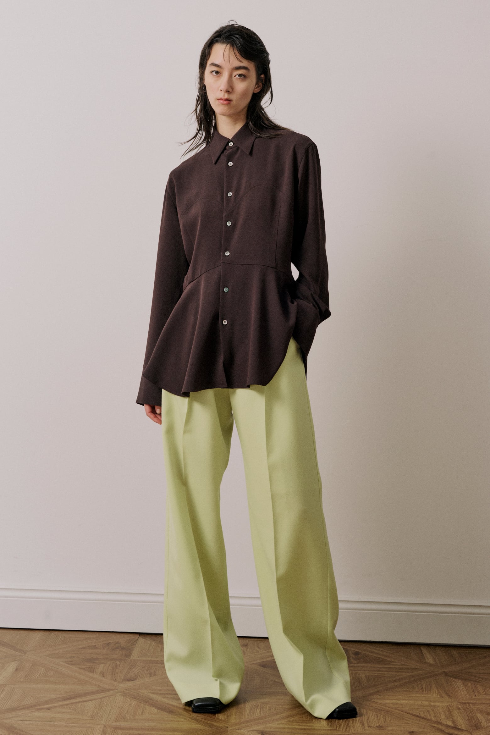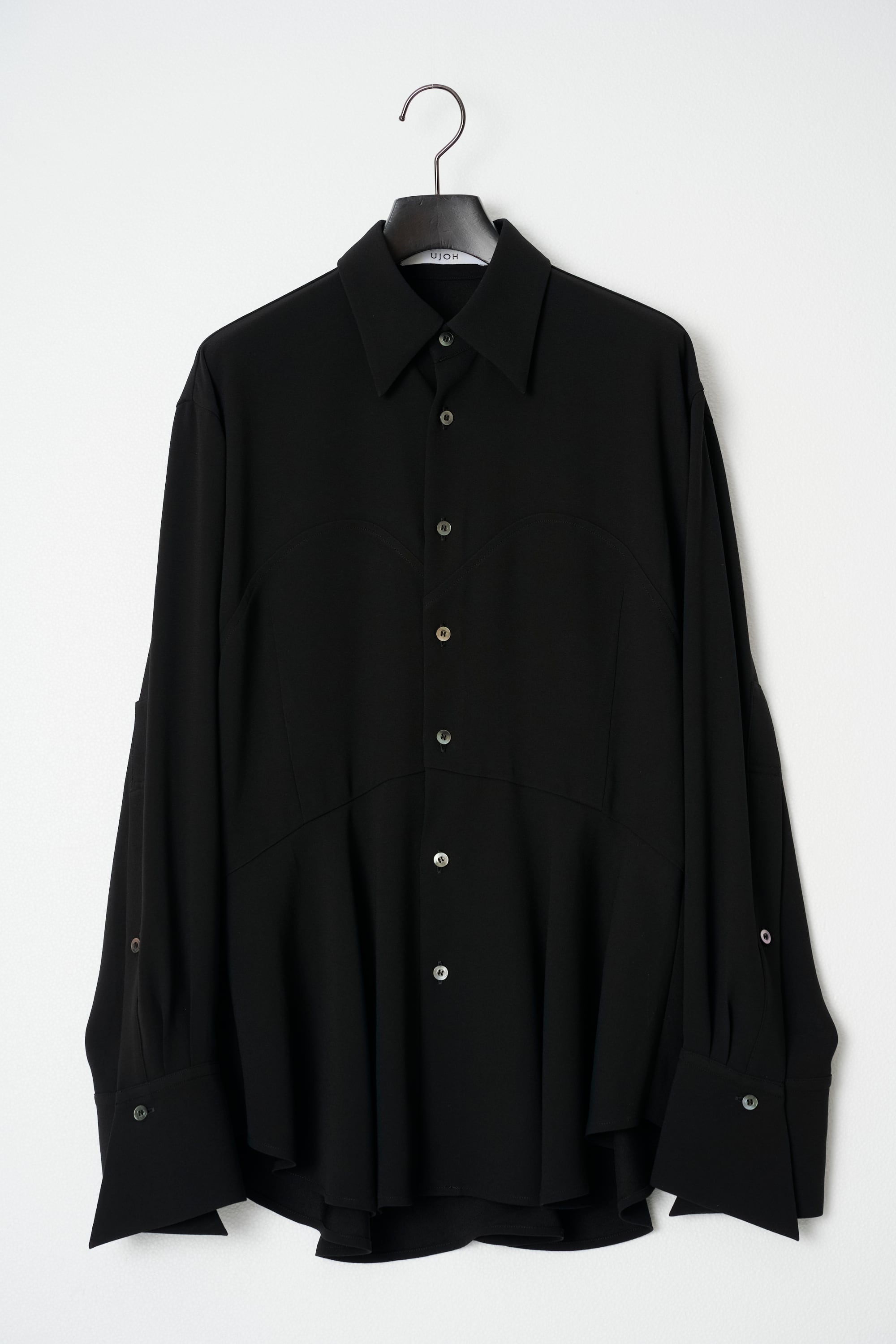 ダーツをとったスリムな身頃に切替しのフレアな裾が特徴のレギュラーカラーシャツです。シャープなカッティングの身頃とペプラム布のボリューム感によりメリハリのあるスタイルです。