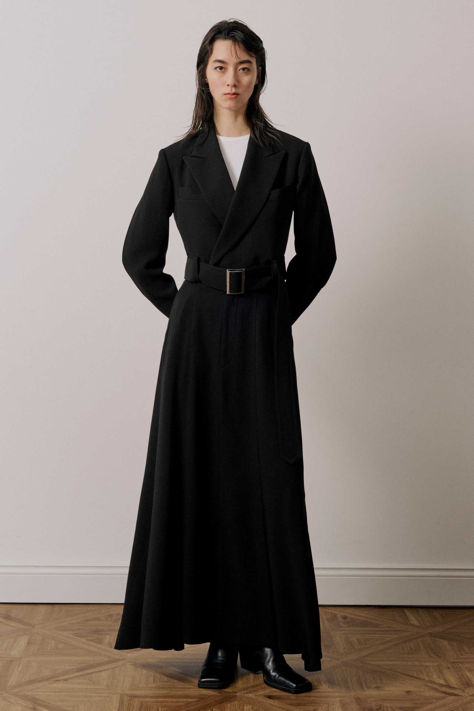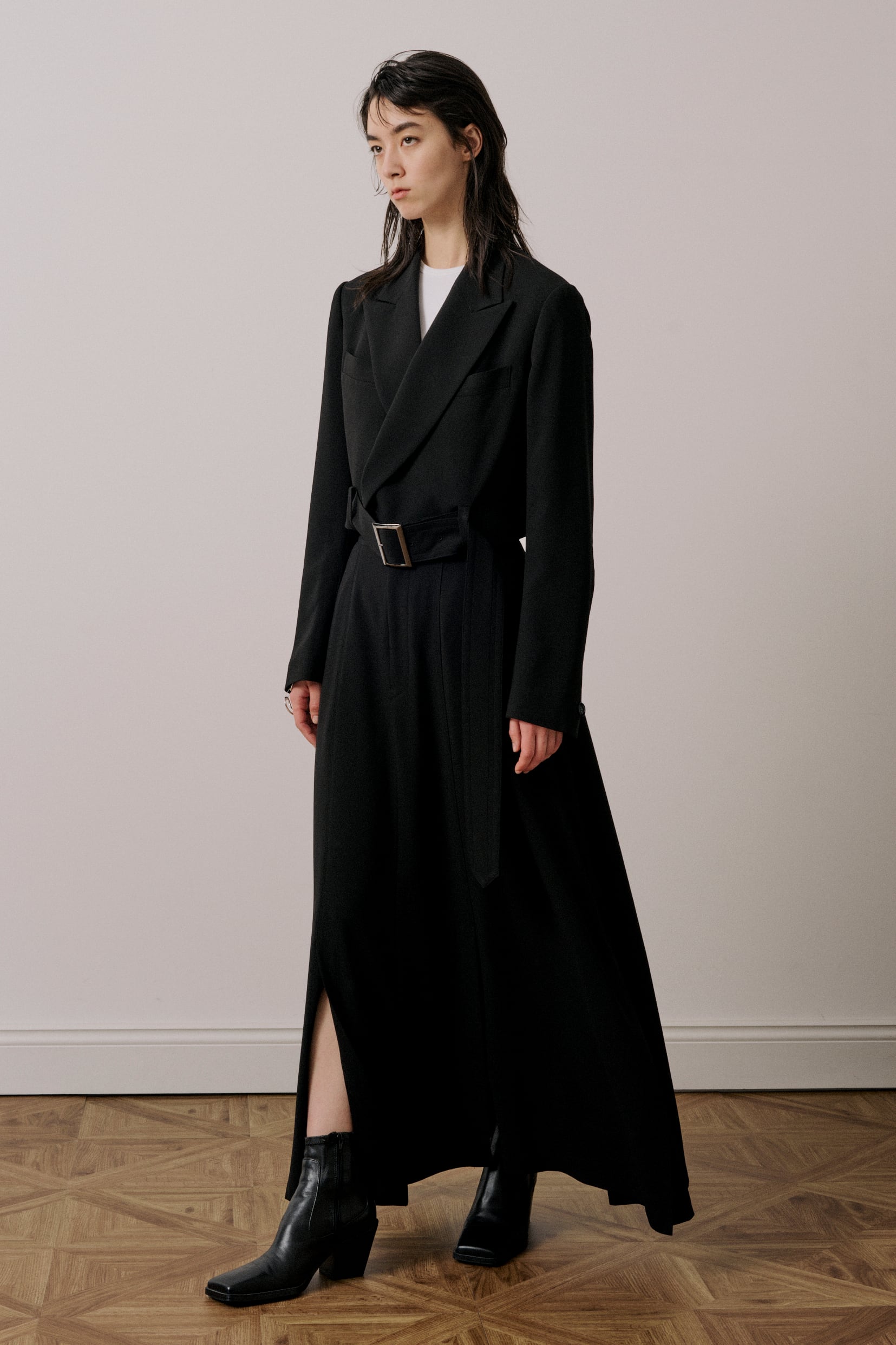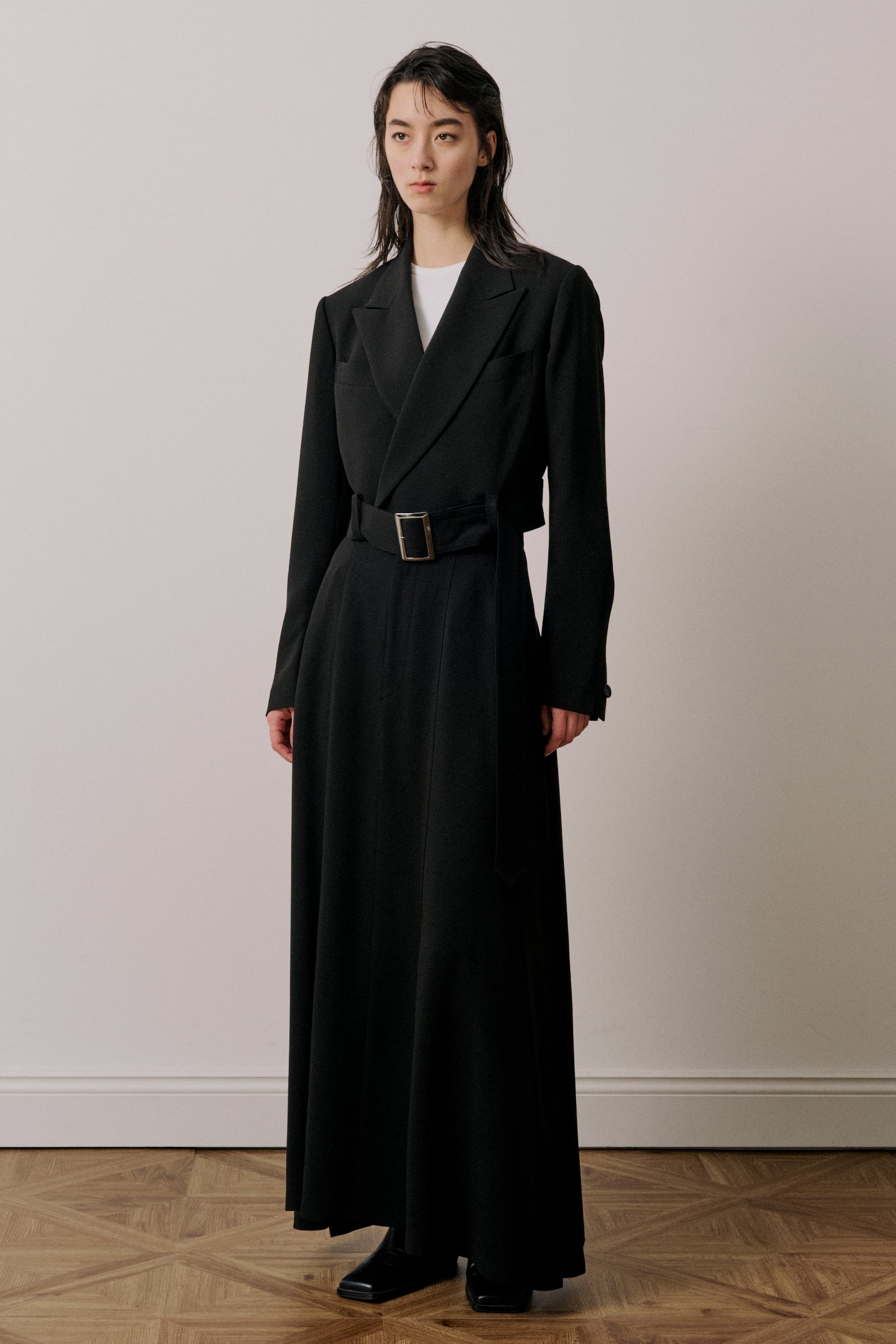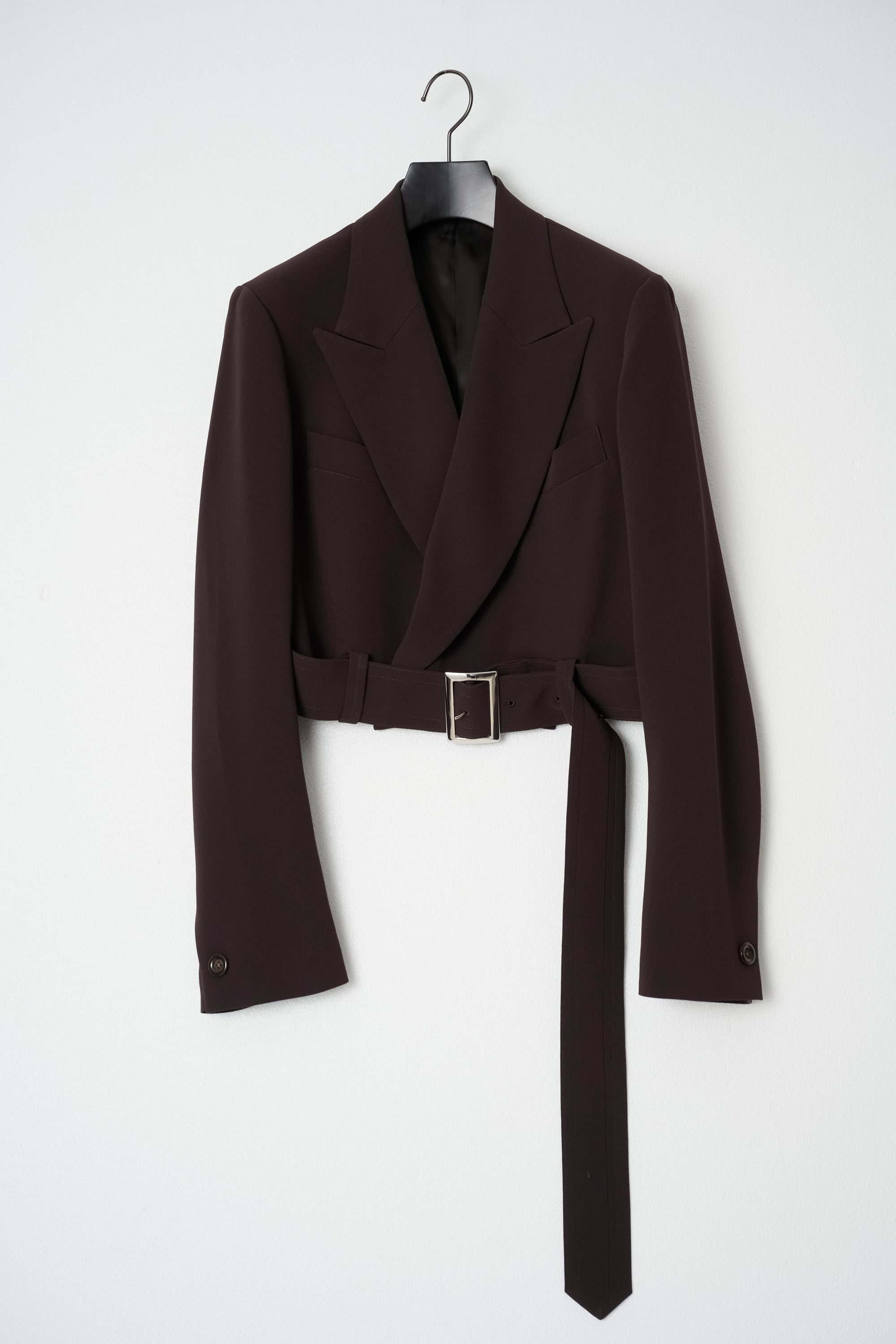 幅広のベルトが存在感があり、クラシカルで上品な印象のクロップド丈のダブルジャケットです。