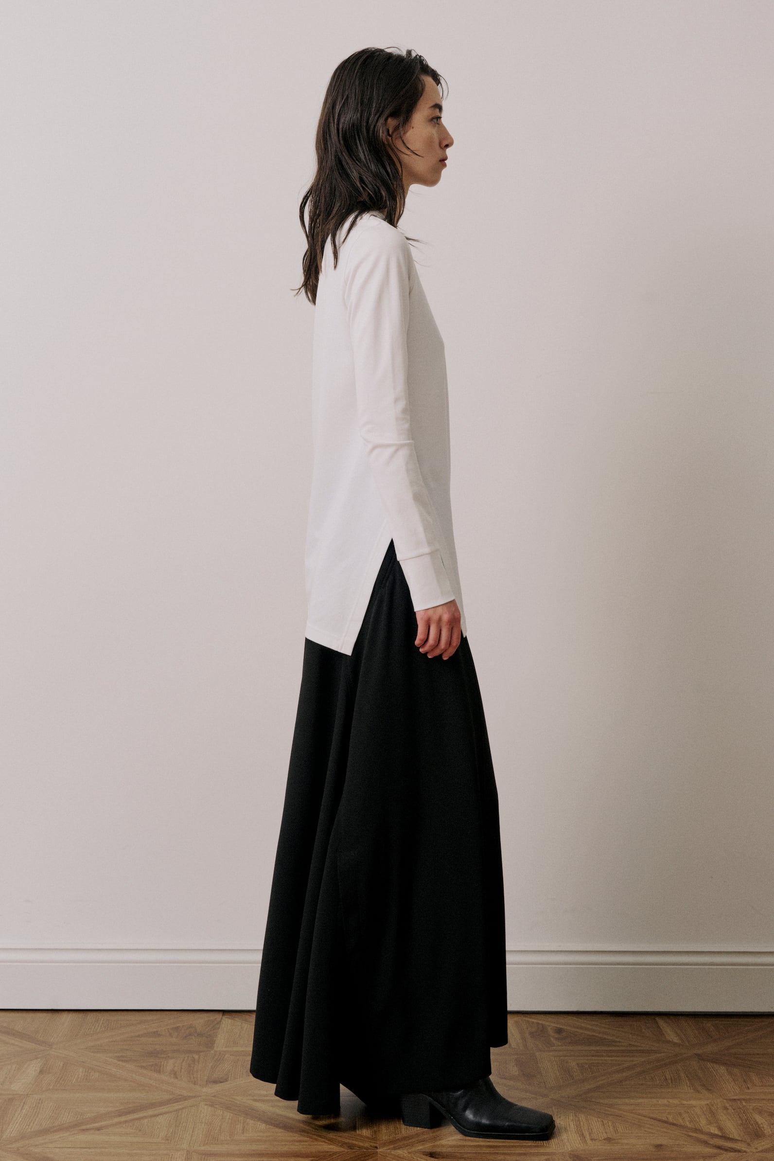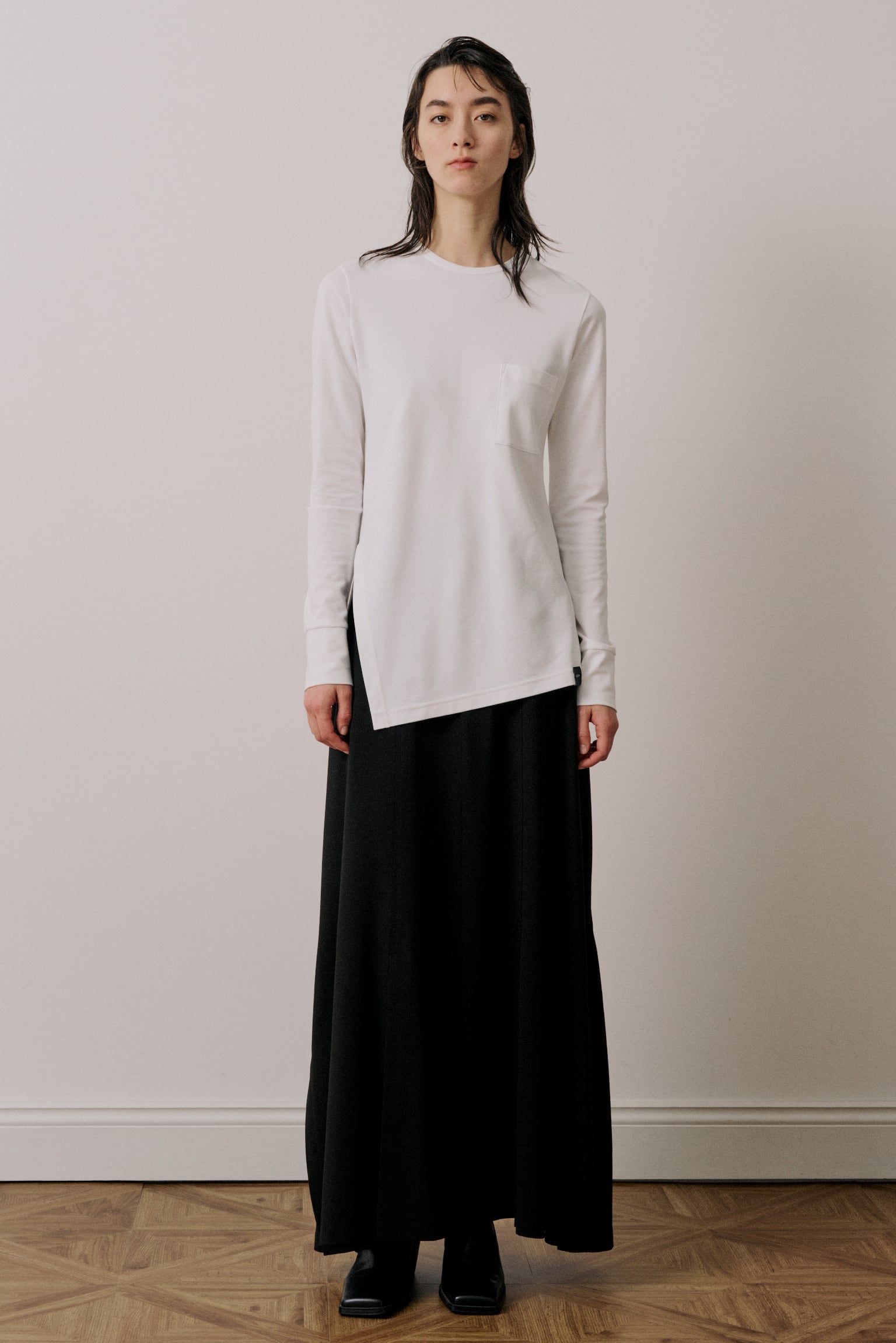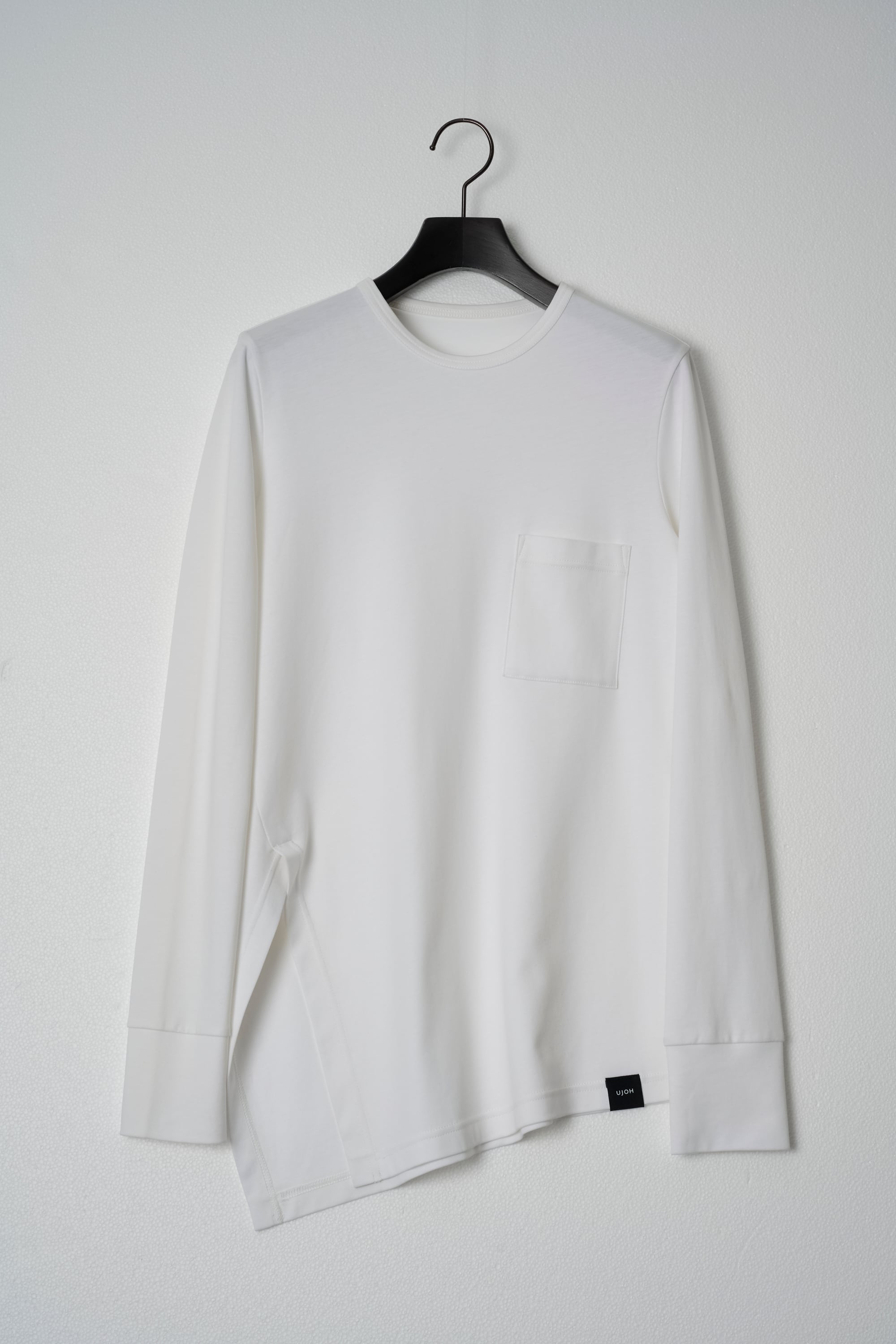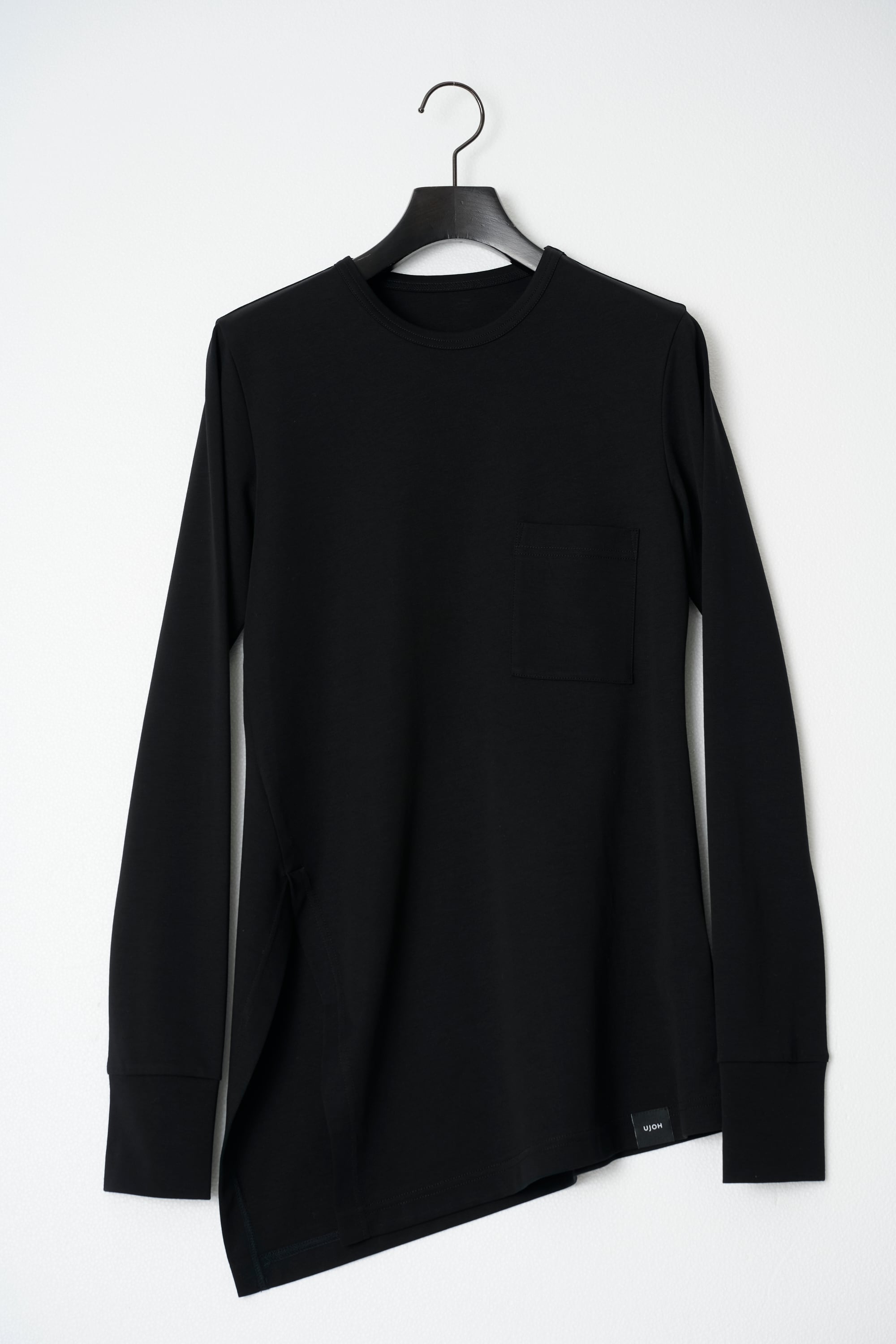 程よいフィット感のあるシルエットで、ベーシックな身頃にアンバランスな裾のデザインが特徴です。右側に入ったスリットと傾斜のついた裾がアクセントになっています。1枚で様になる上品なカットソーです。