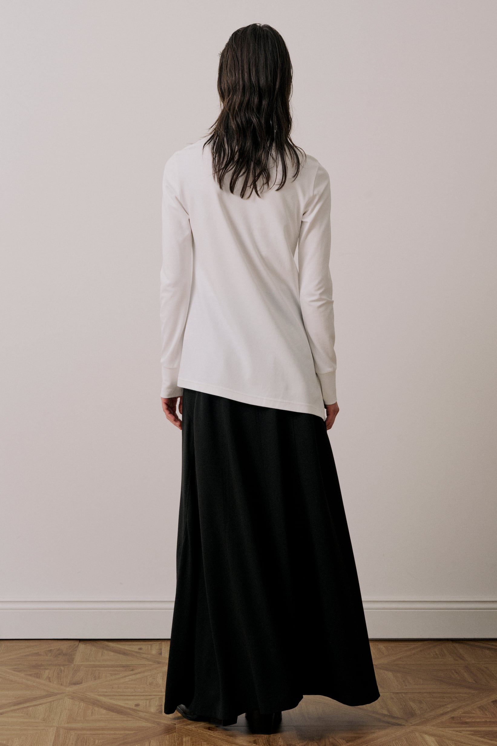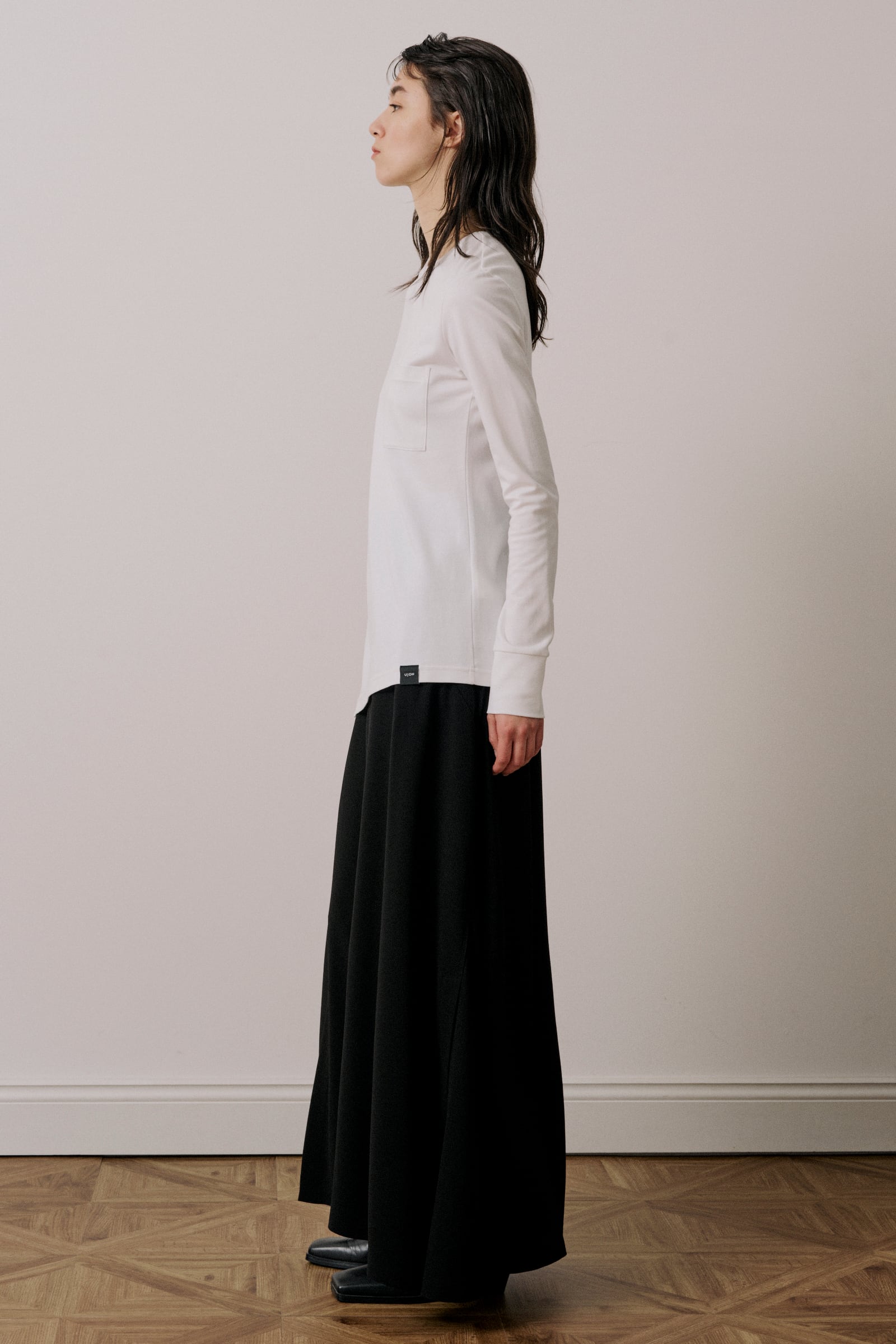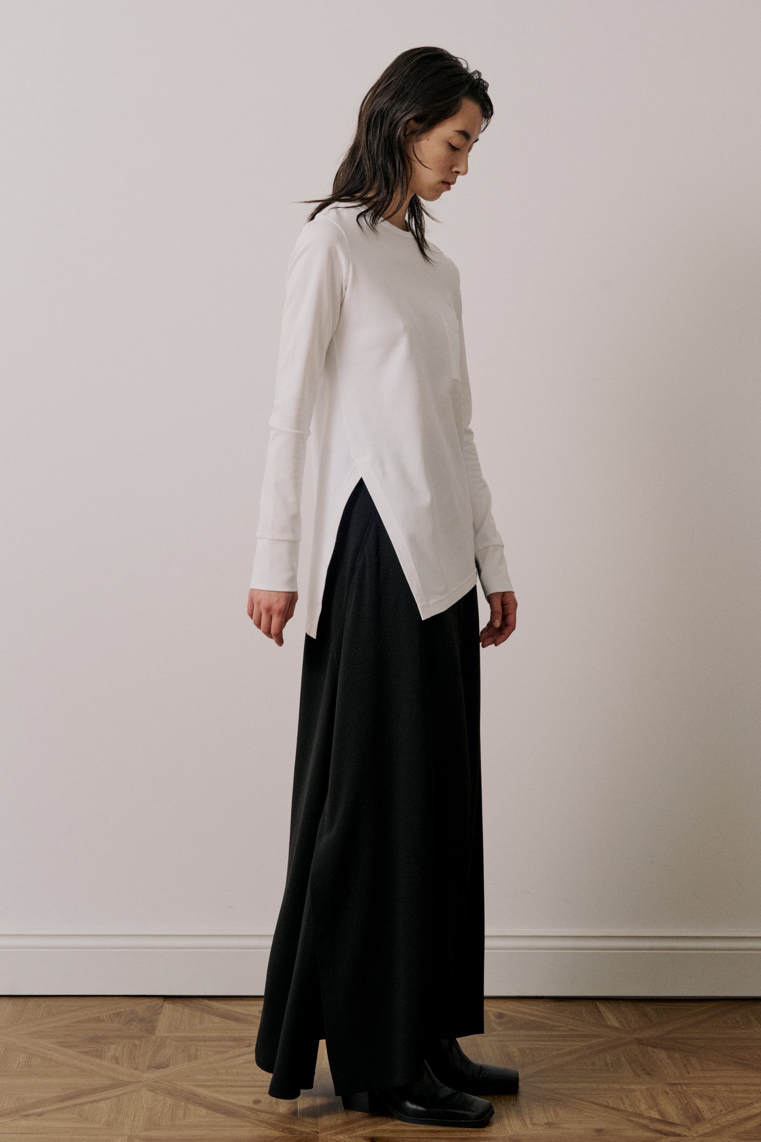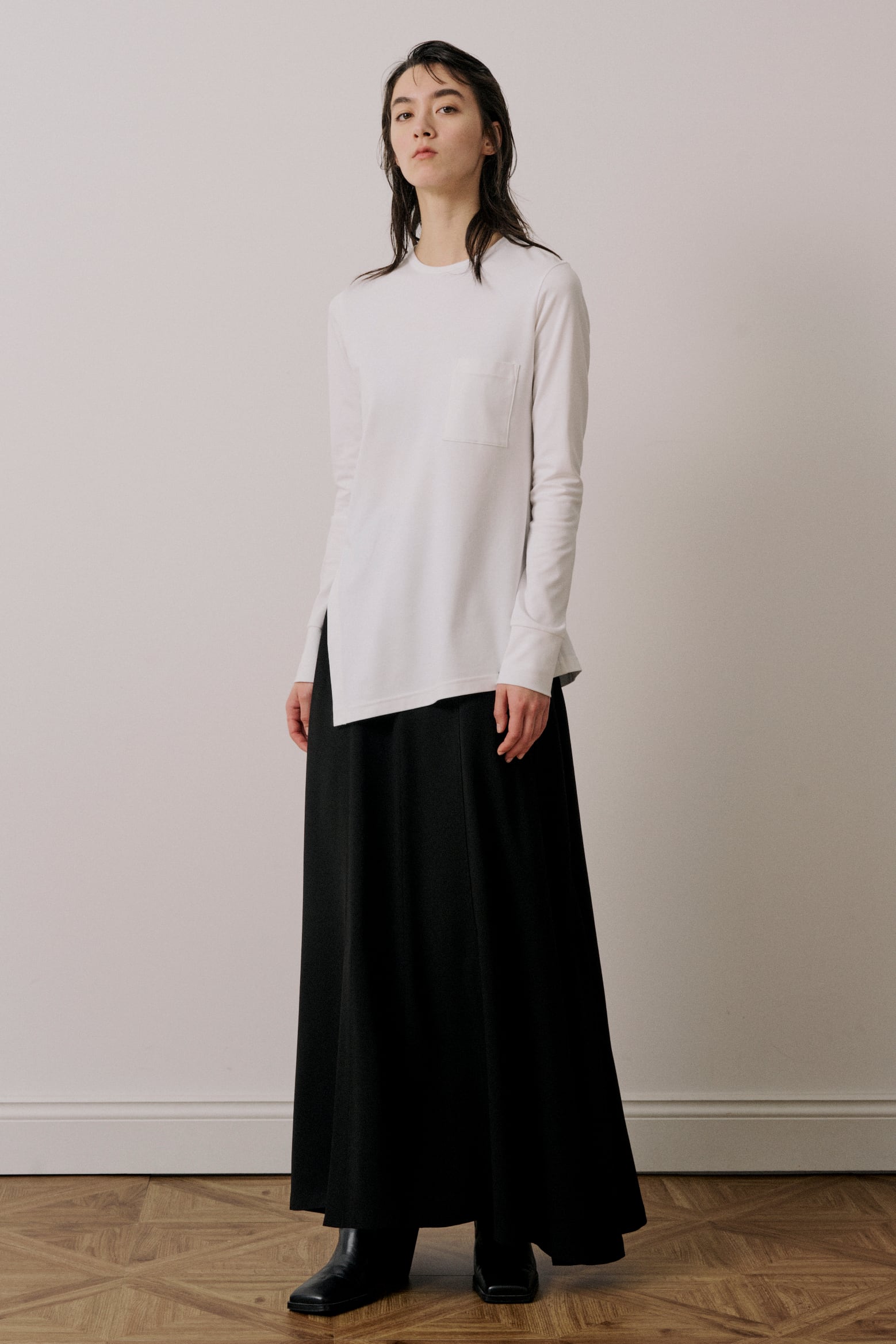 程よいフィット感のあるシルエットで、ベーシックな身頃にアンバランスな裾のデザインが特徴です。右側に入ったスリットと傾斜のついた裾がアクセントになっています。1枚で様になる上品なカットソーです。