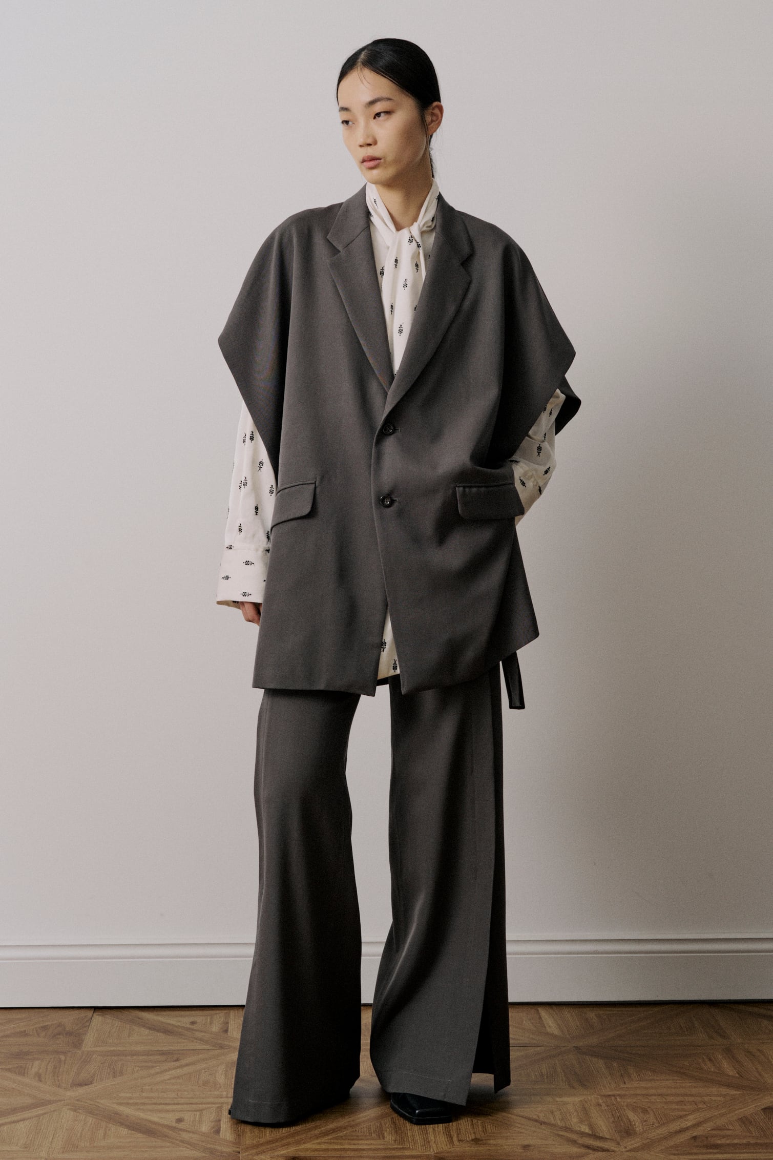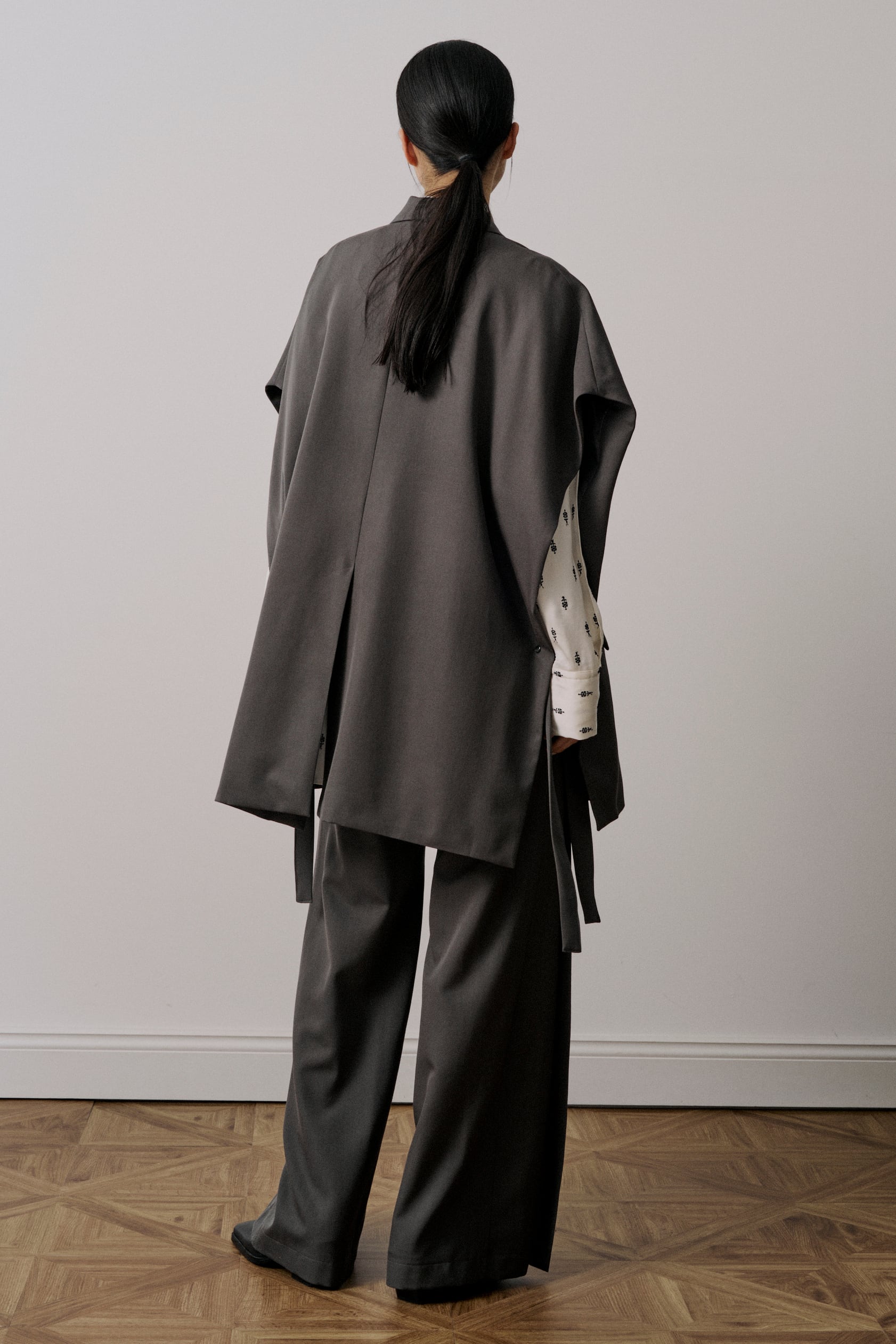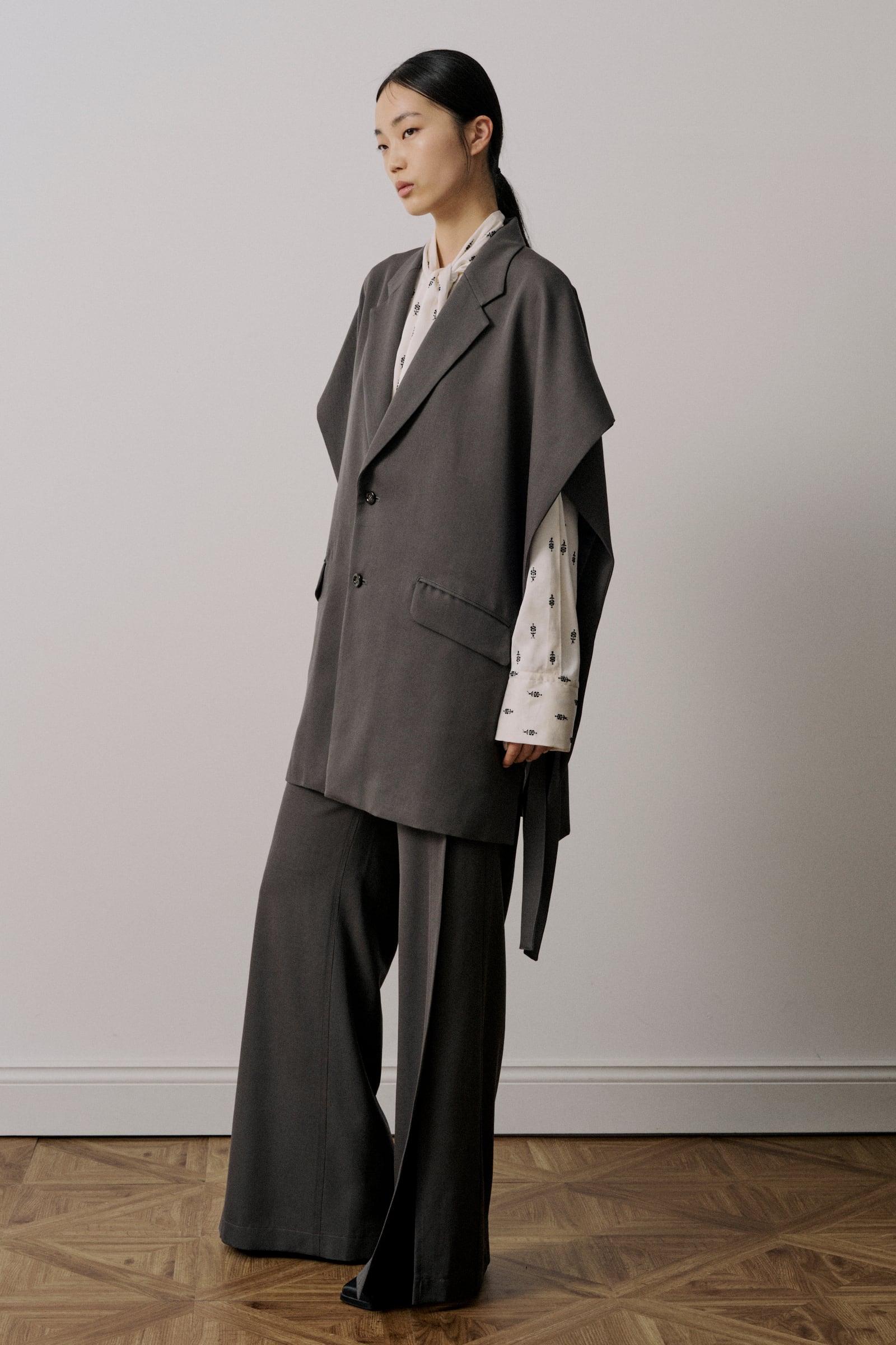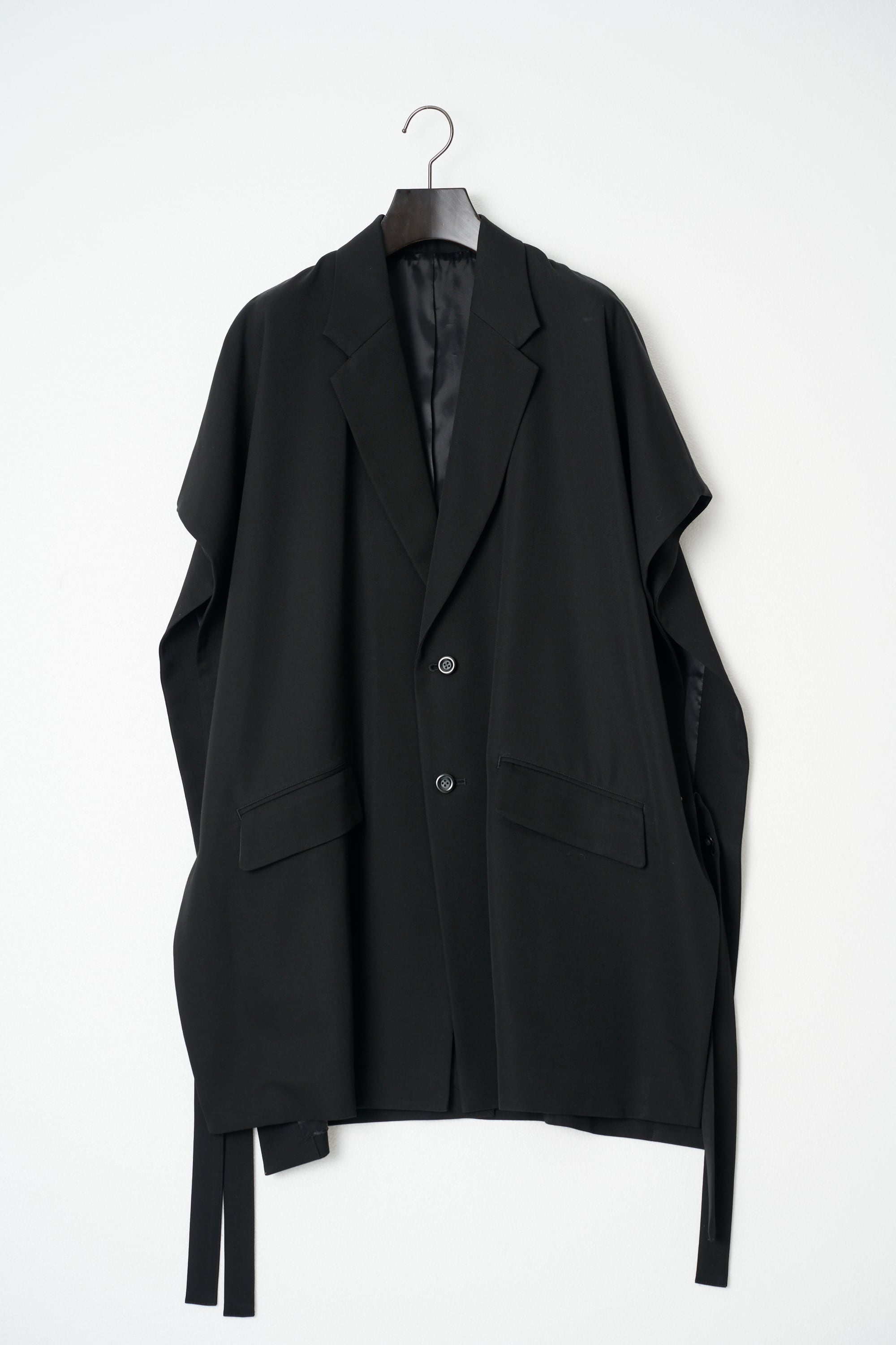 アームホールや脇のない抜け感のある印象でありながら、ノッチドラペルジャケットの要素で上品な雰囲気に仕上がっています。両脇のベルトデザインもポイントです。