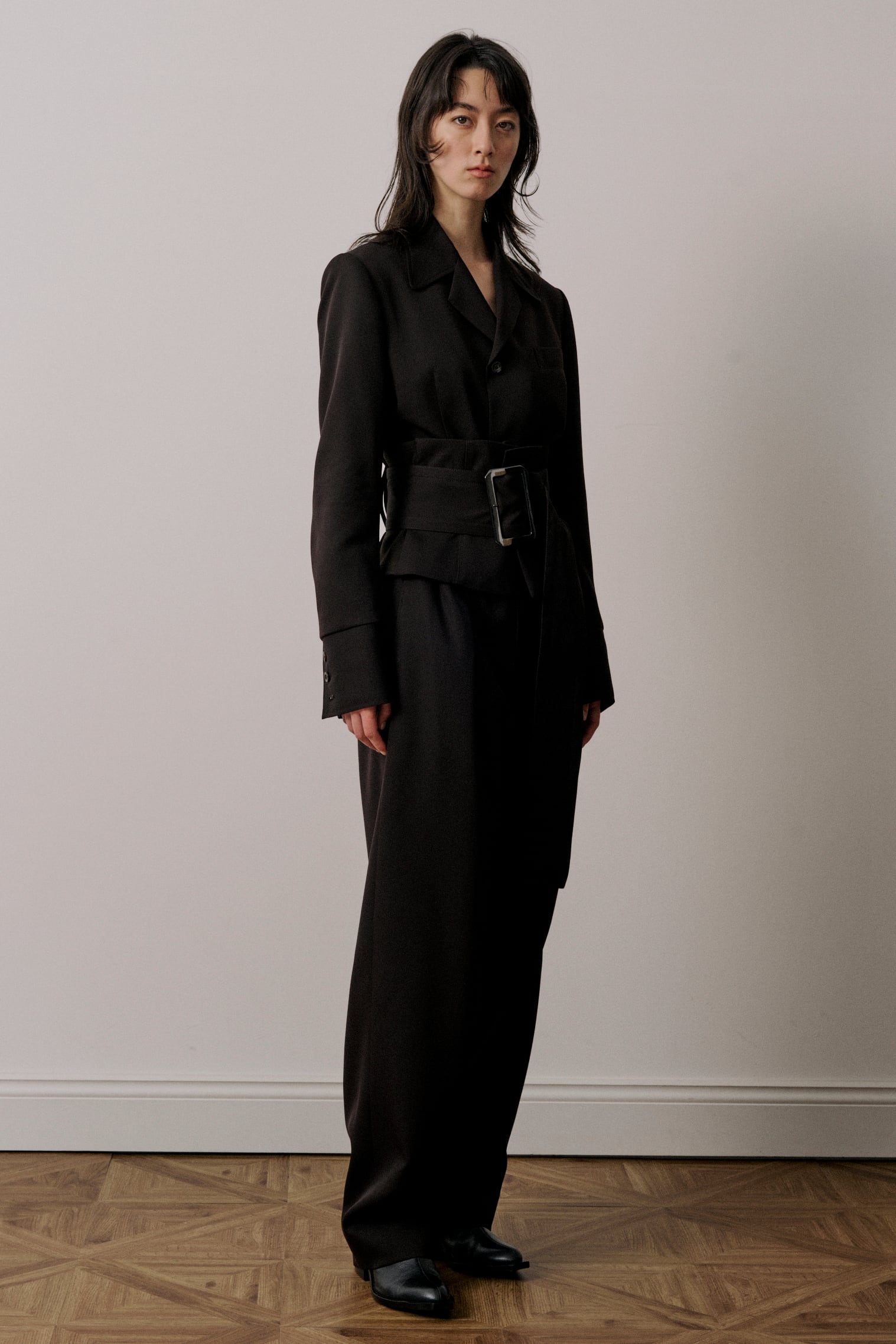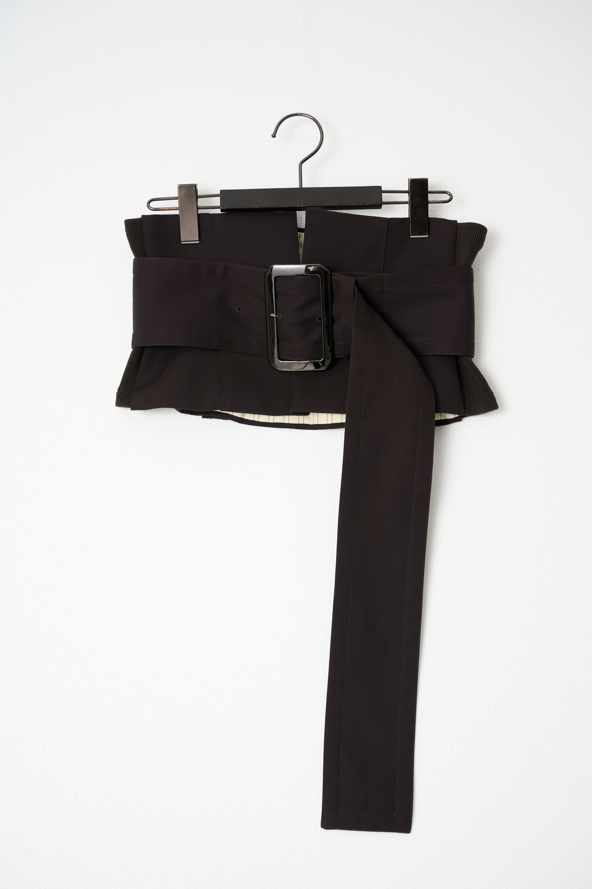コーディネートのアクセントに使えるコルセットスタイルのワイドベルトです。本体は釦での着脱仕様で、上から広幅のベルトを巻き付けるデザインです。サイドはリブ仕様になっているので着心地も楽です。