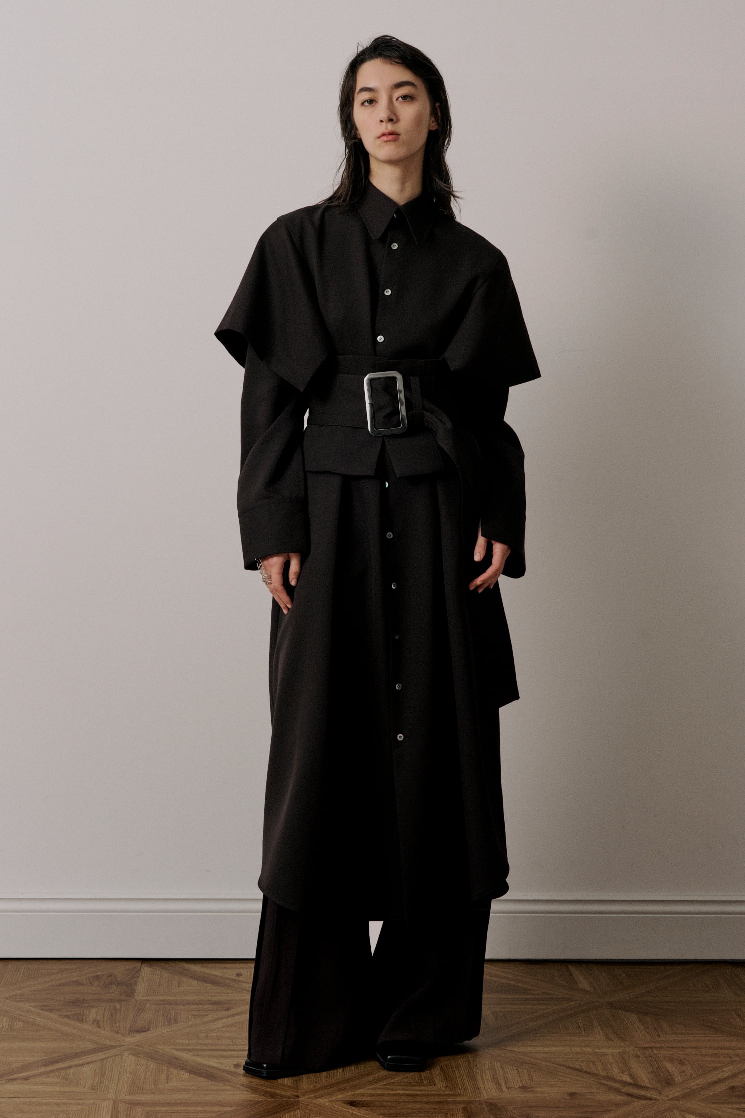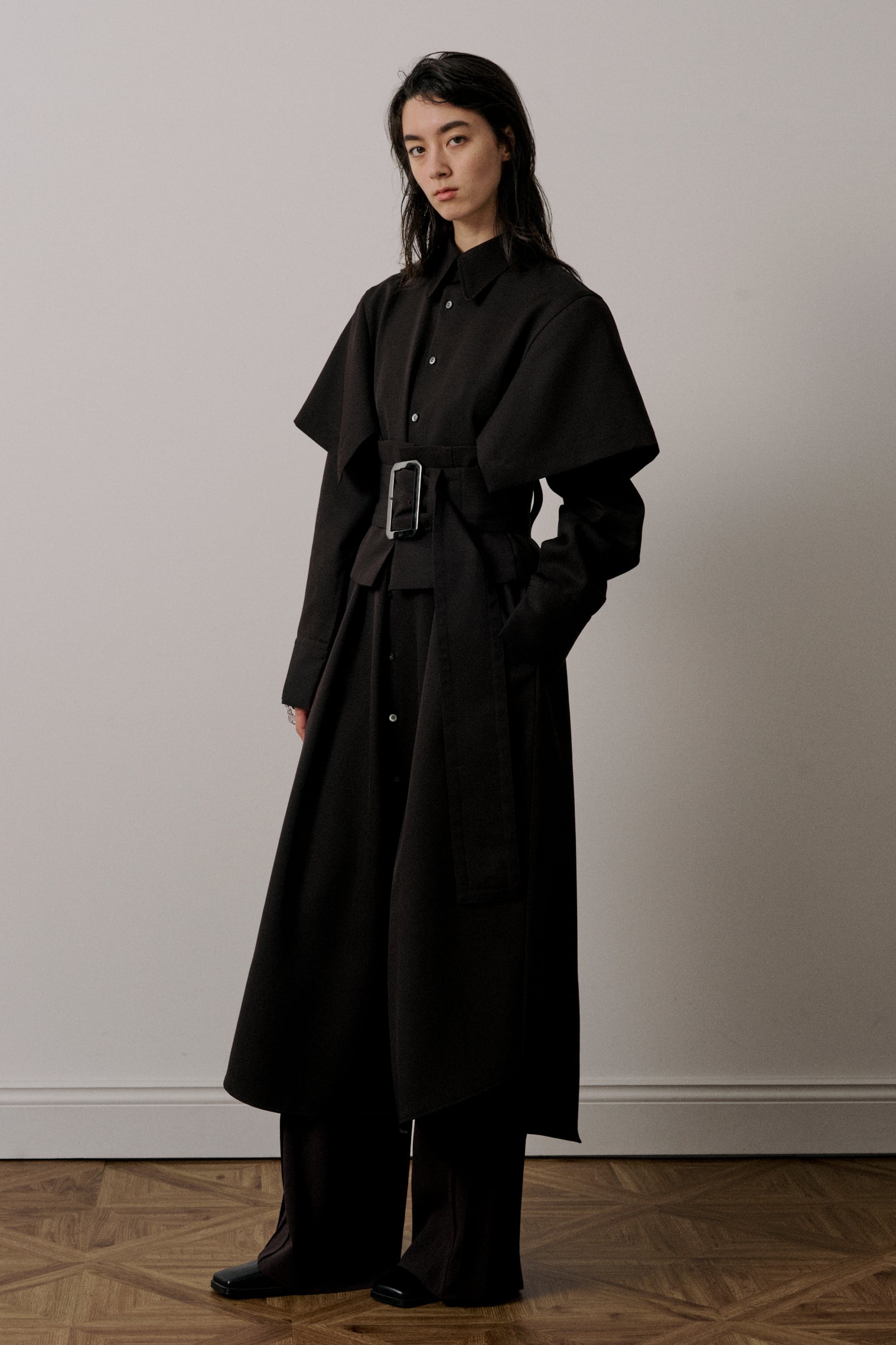 高密度織したギャバジンに樹脂加工を施した素材で、ペーパー加工と名付けられたように、紙のような落ち感を表現した生地です。パリッとハリのある仕上がりに、光沢と滑らかな肌触りで、高級感がある素材です。