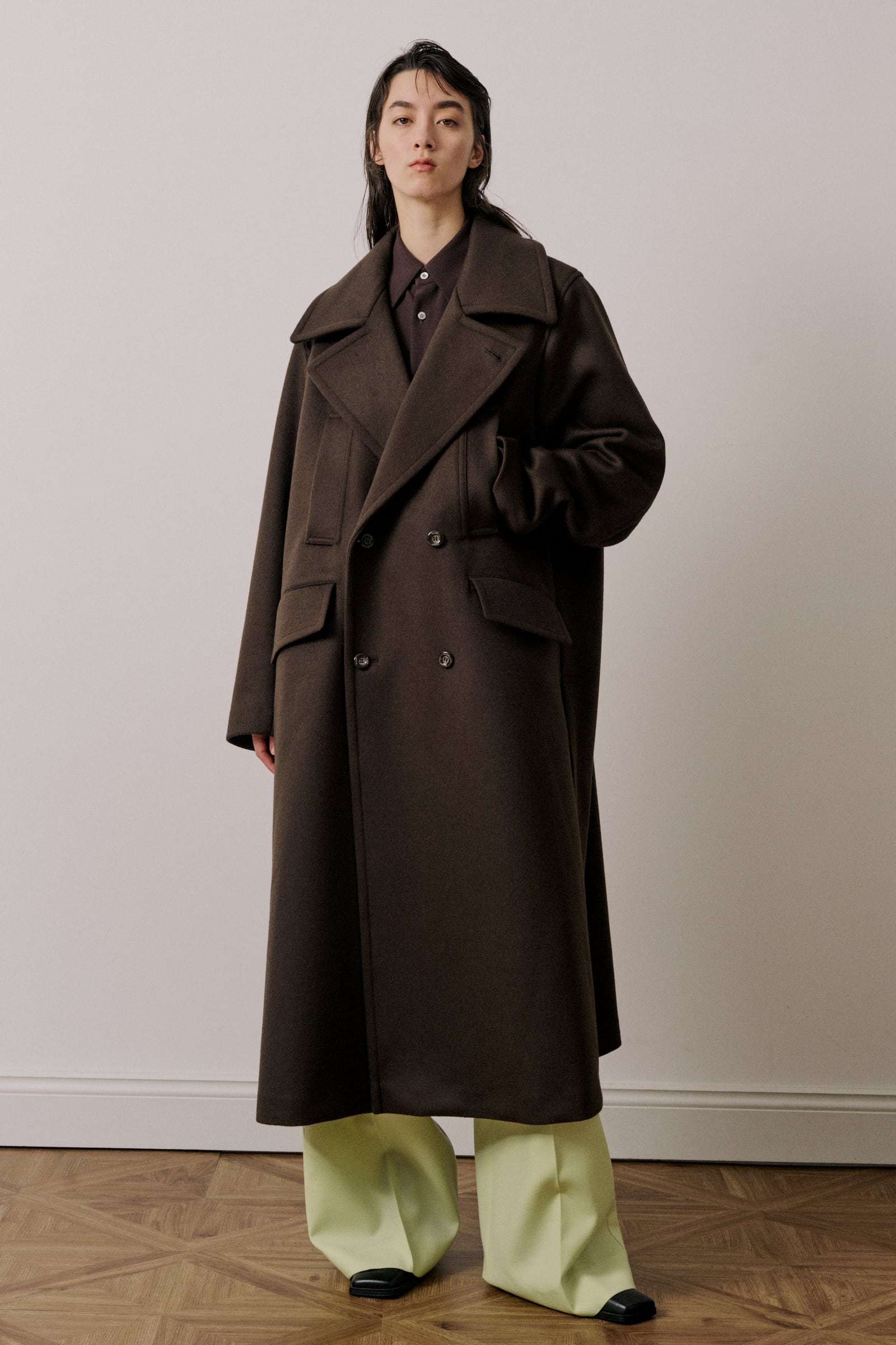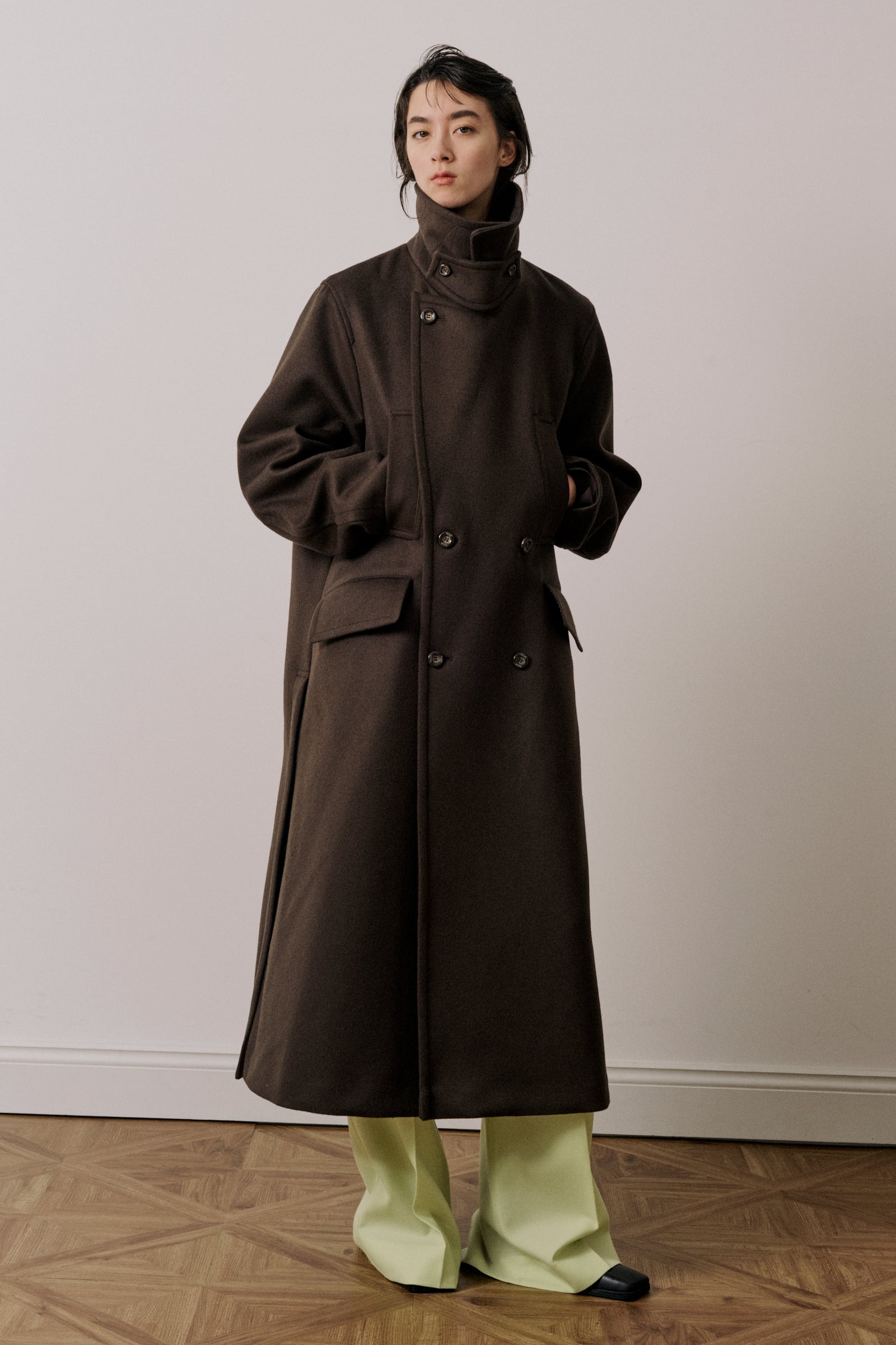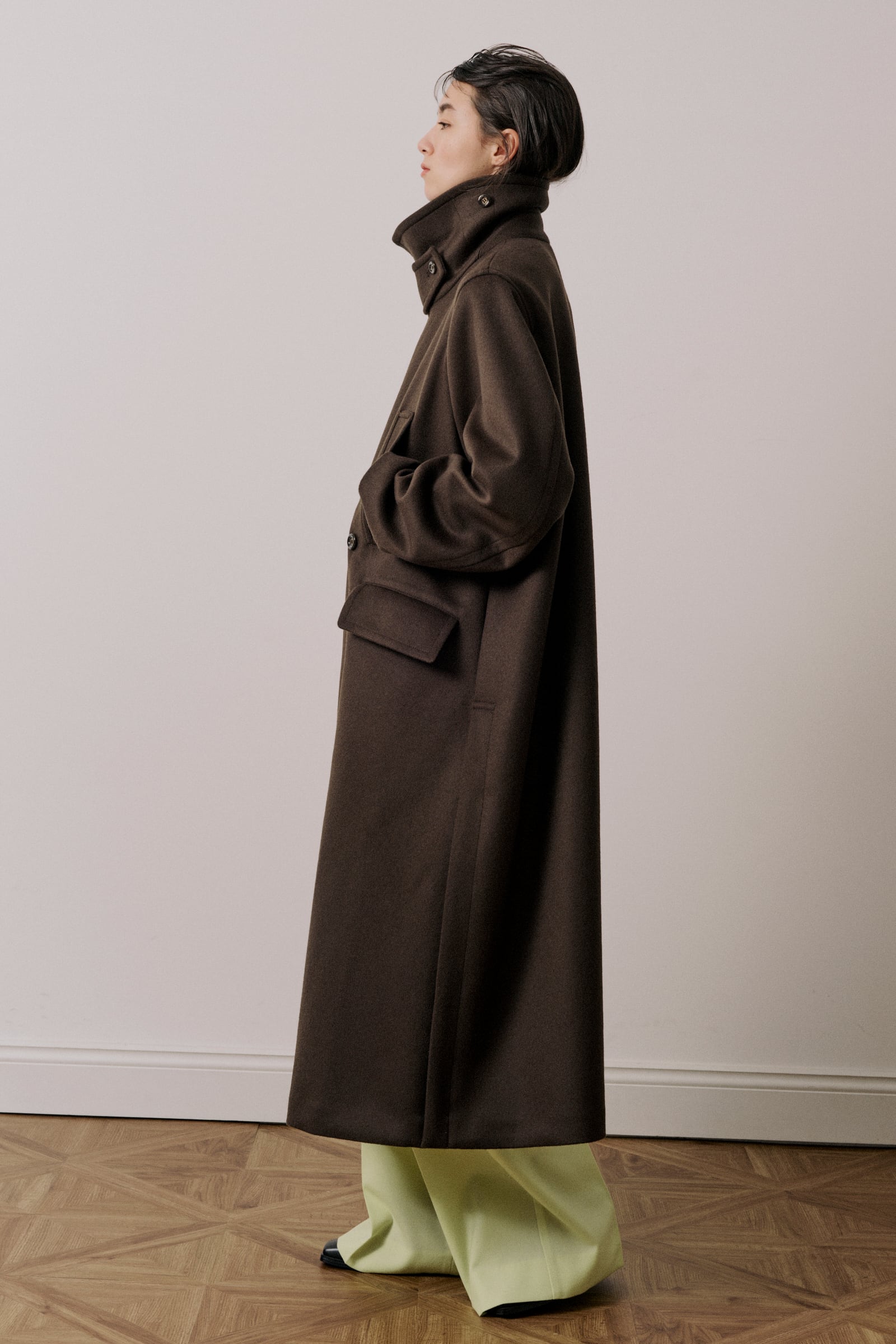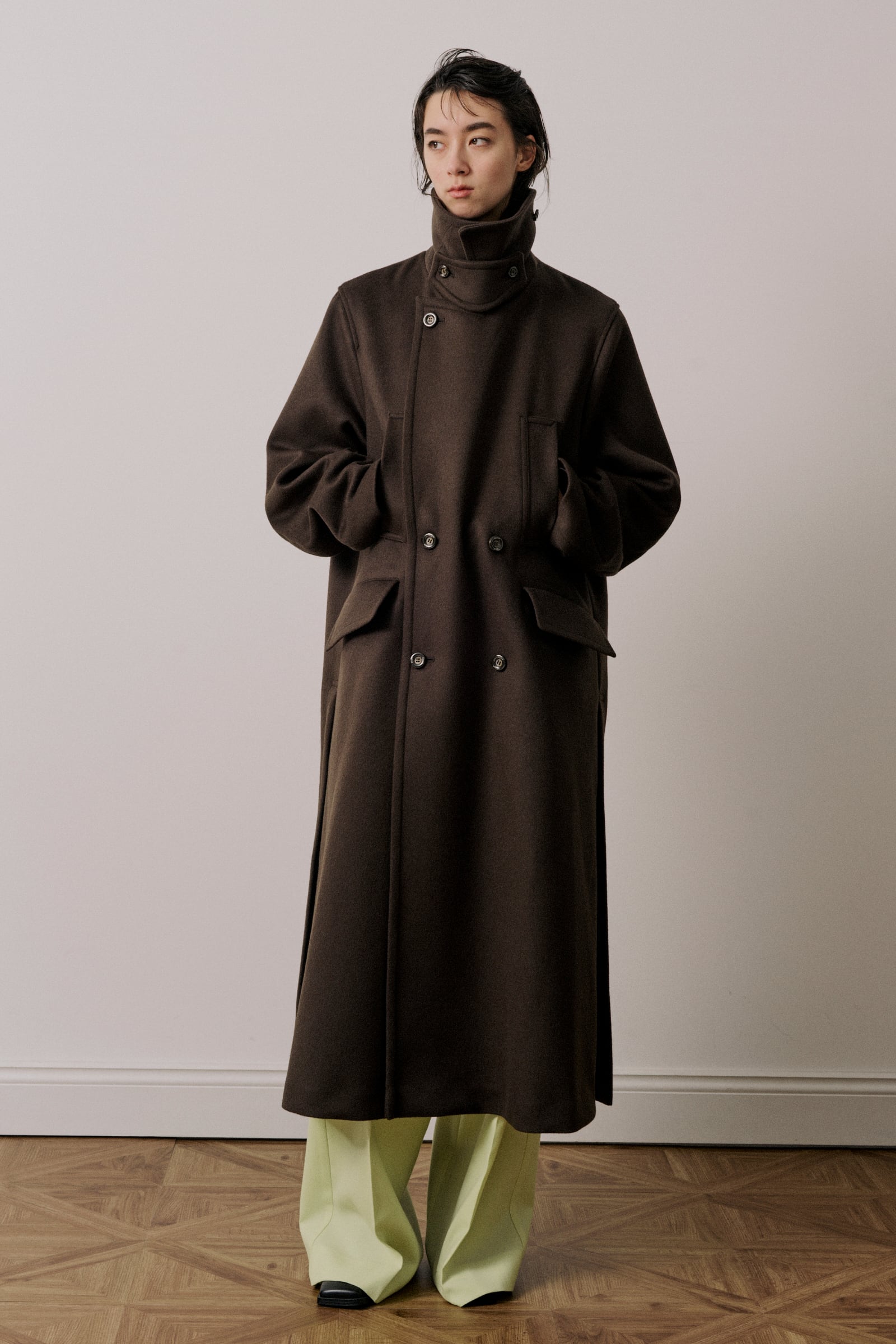 ミニマルなデザインでサイズ感やシルエットにこだわったコートです。タブを利用して衿を立たせることでよりモードな印象になります。ハンドウォーマーやサイドの釦あきの深いスリットがアクセントになっています。
