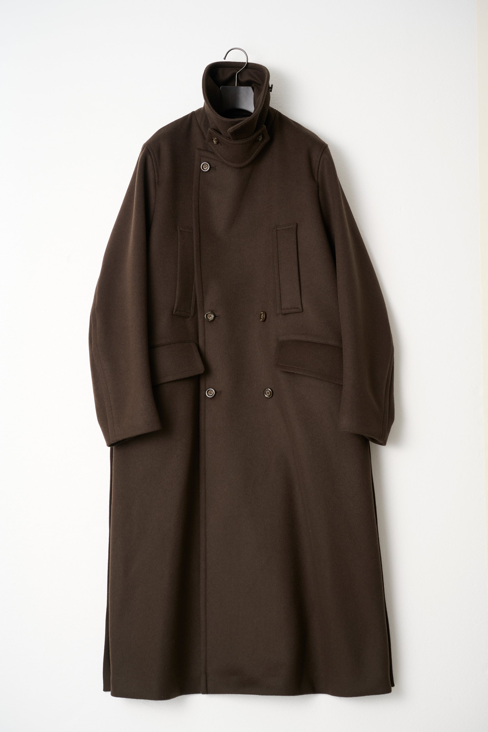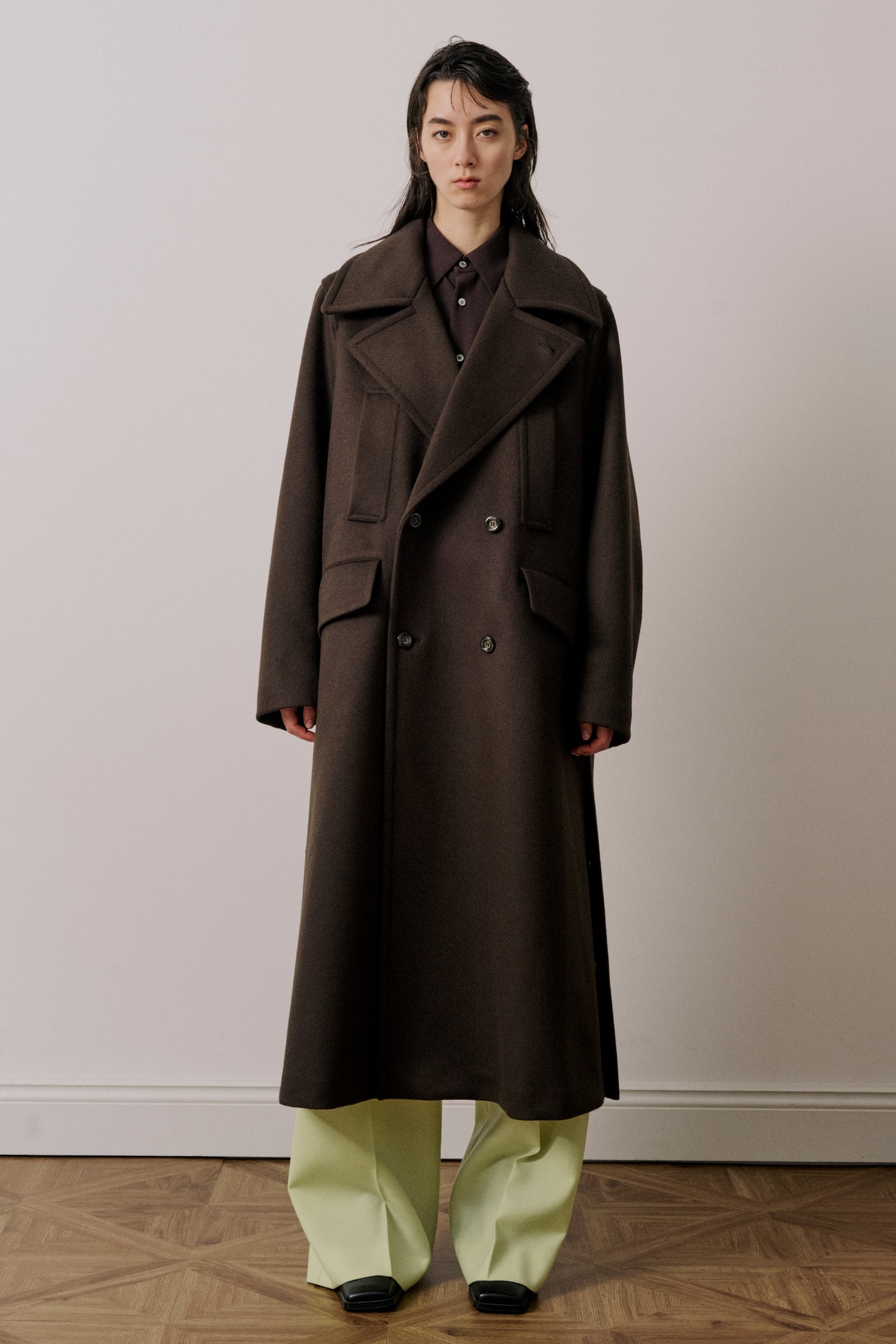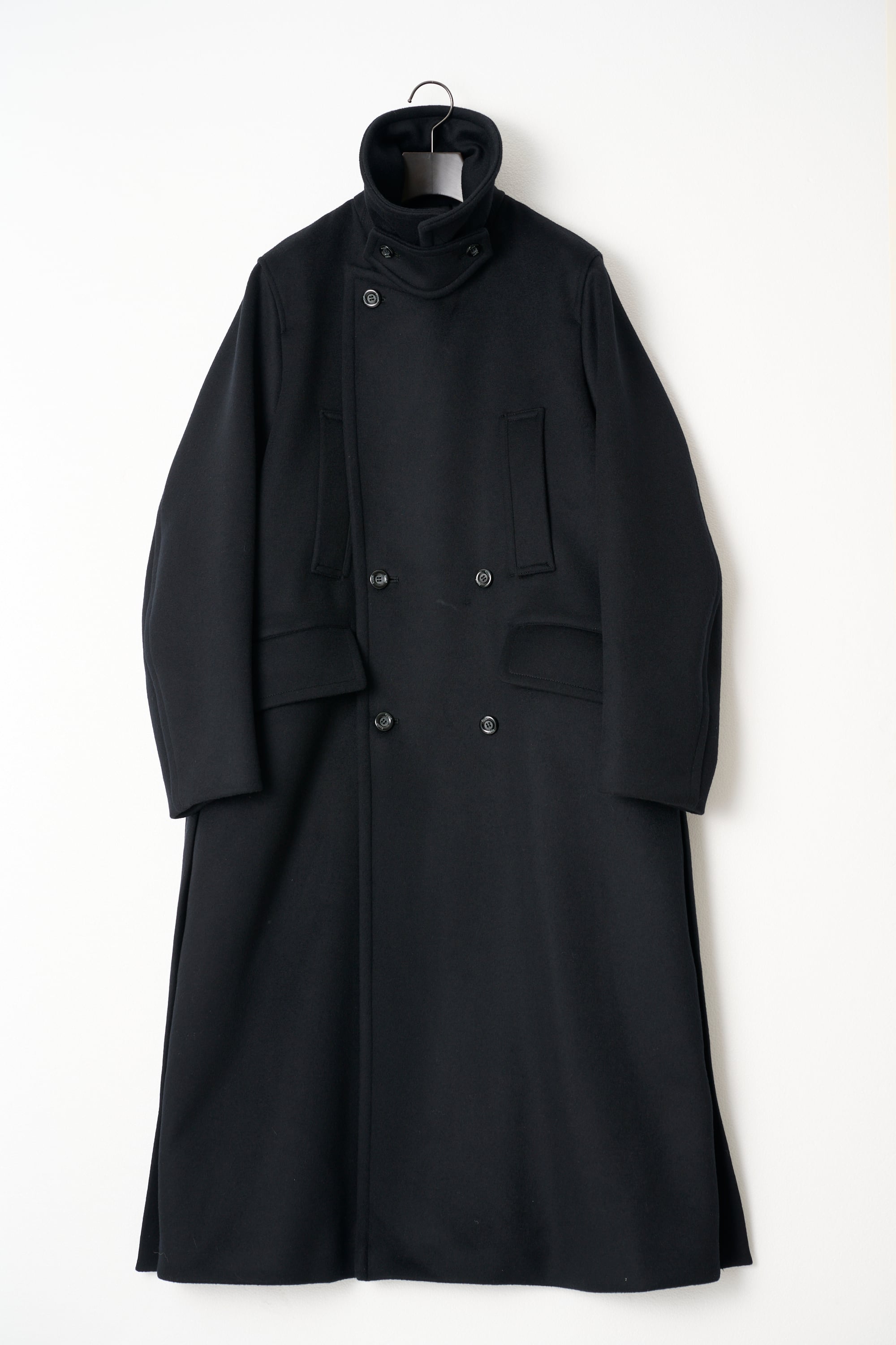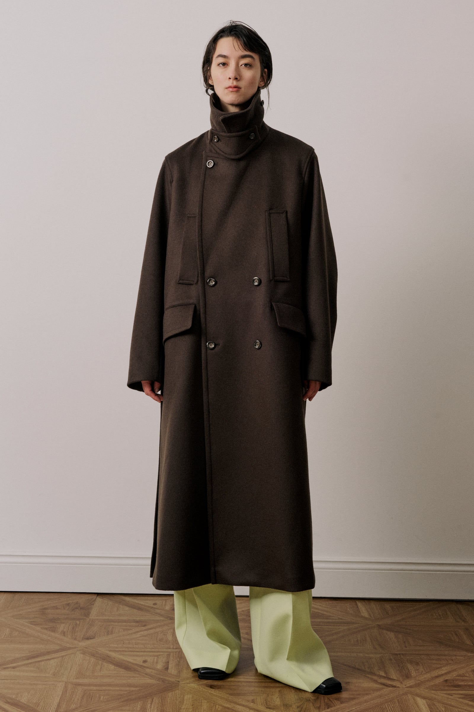 ミニマルなデザインでサイズ感やシルエットにこだわったコートです。タブを利用して衿を立たせることでよりモードな印象になります。ハンドウォーマーやサイドの釦あきの深いスリットがアクセントになっています。