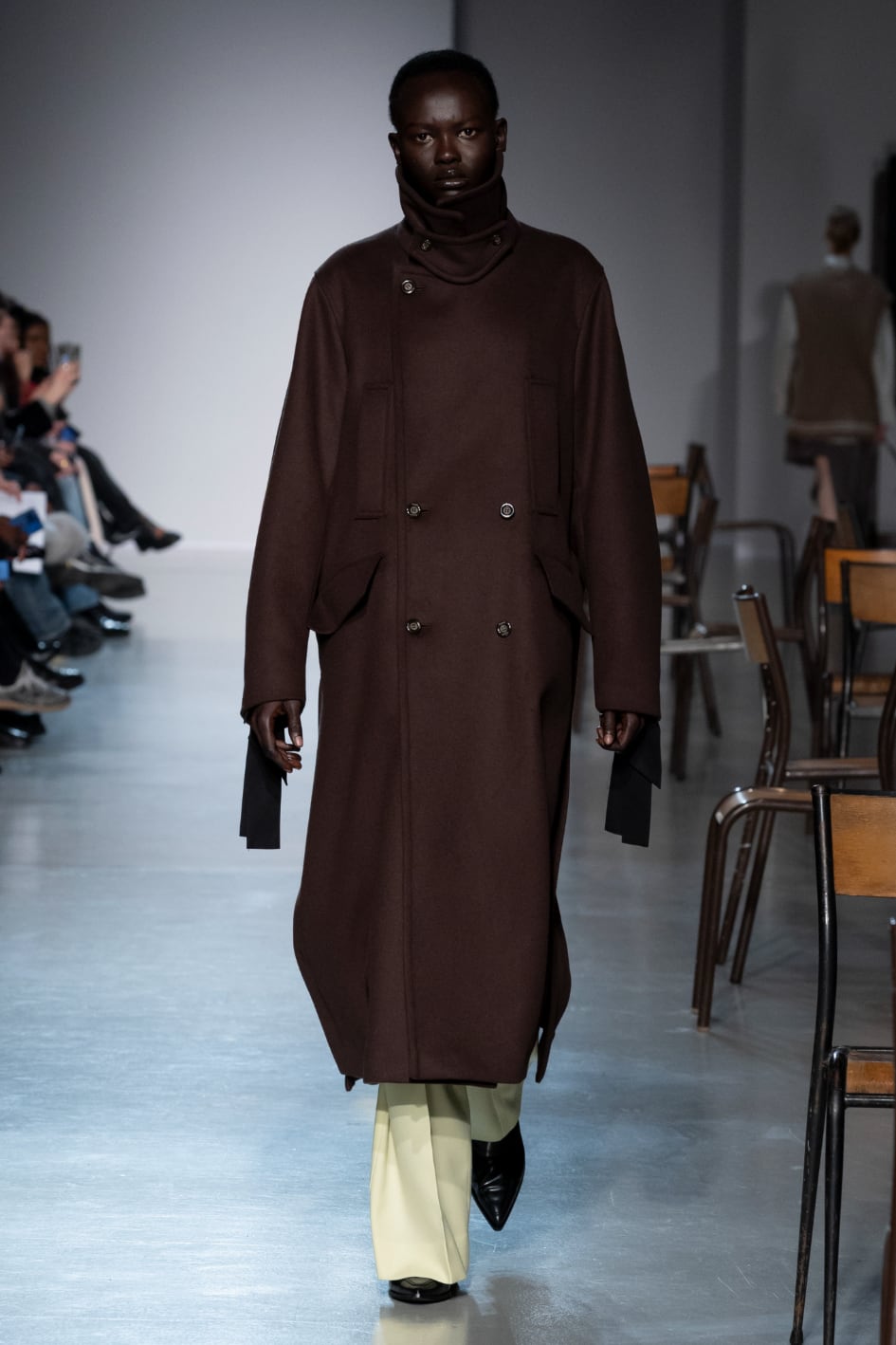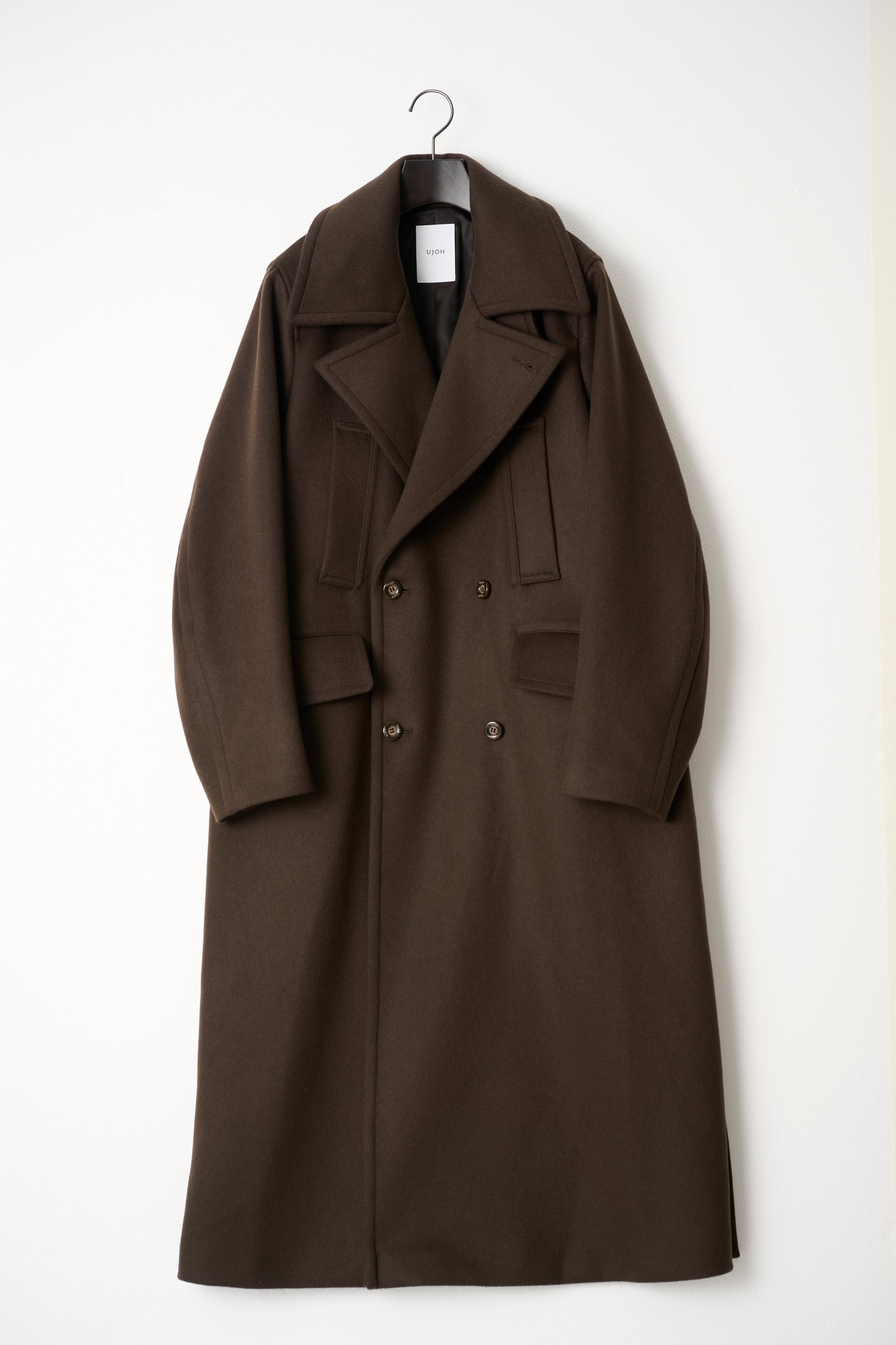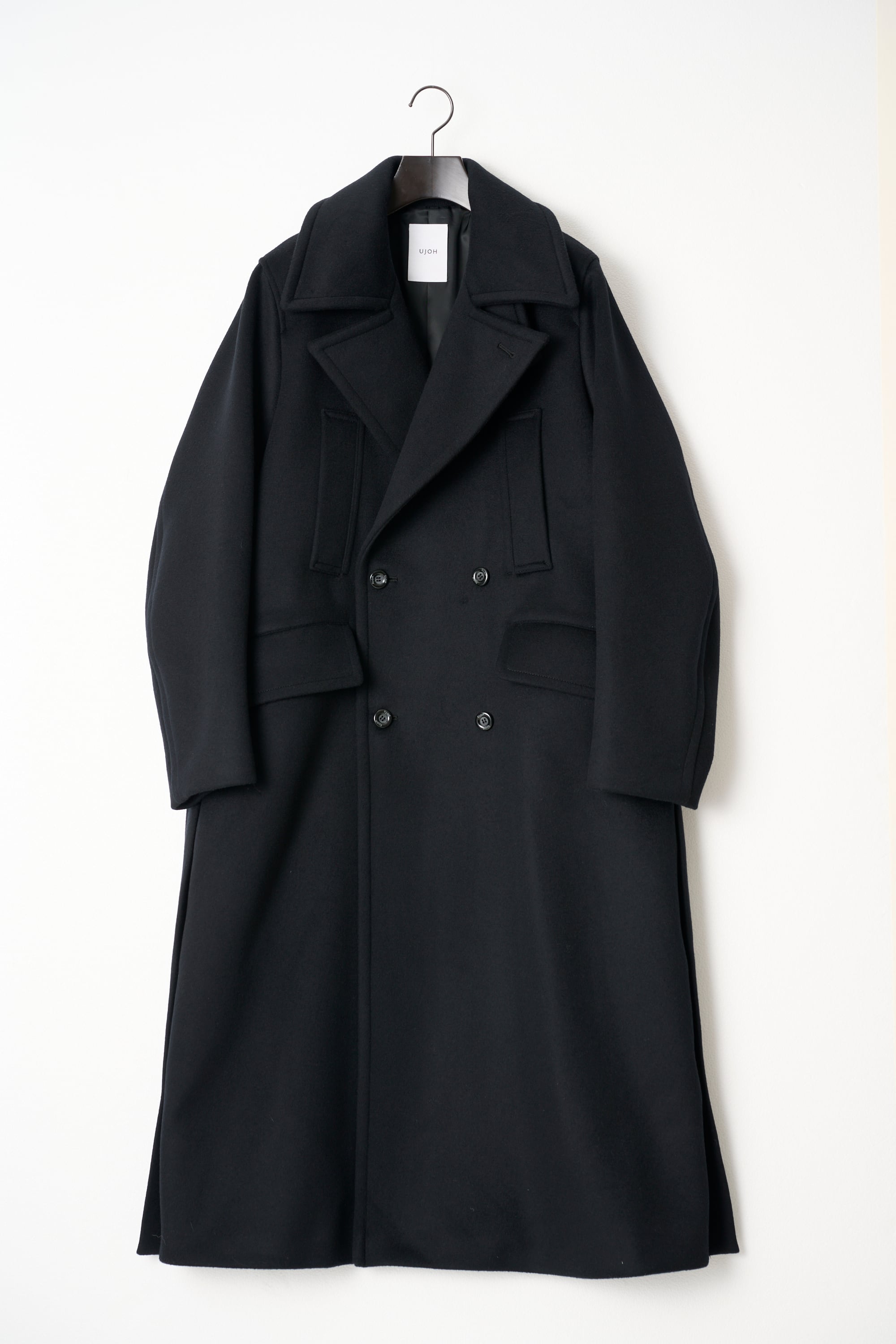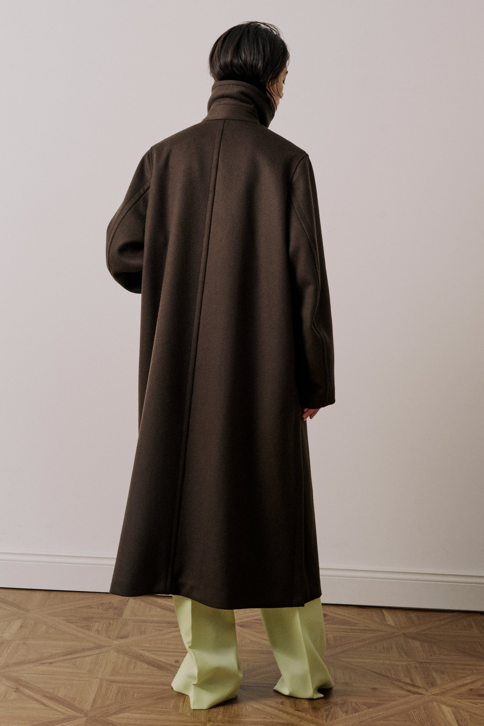 ミニマルなデザインでサイズ感やシルエットにこだわったコートです。タブを利用して衿を立たせることでよりモードな印象になります。ハンドウォーマーやサイドの釦あきの深いスリットがアクセントになっています。
