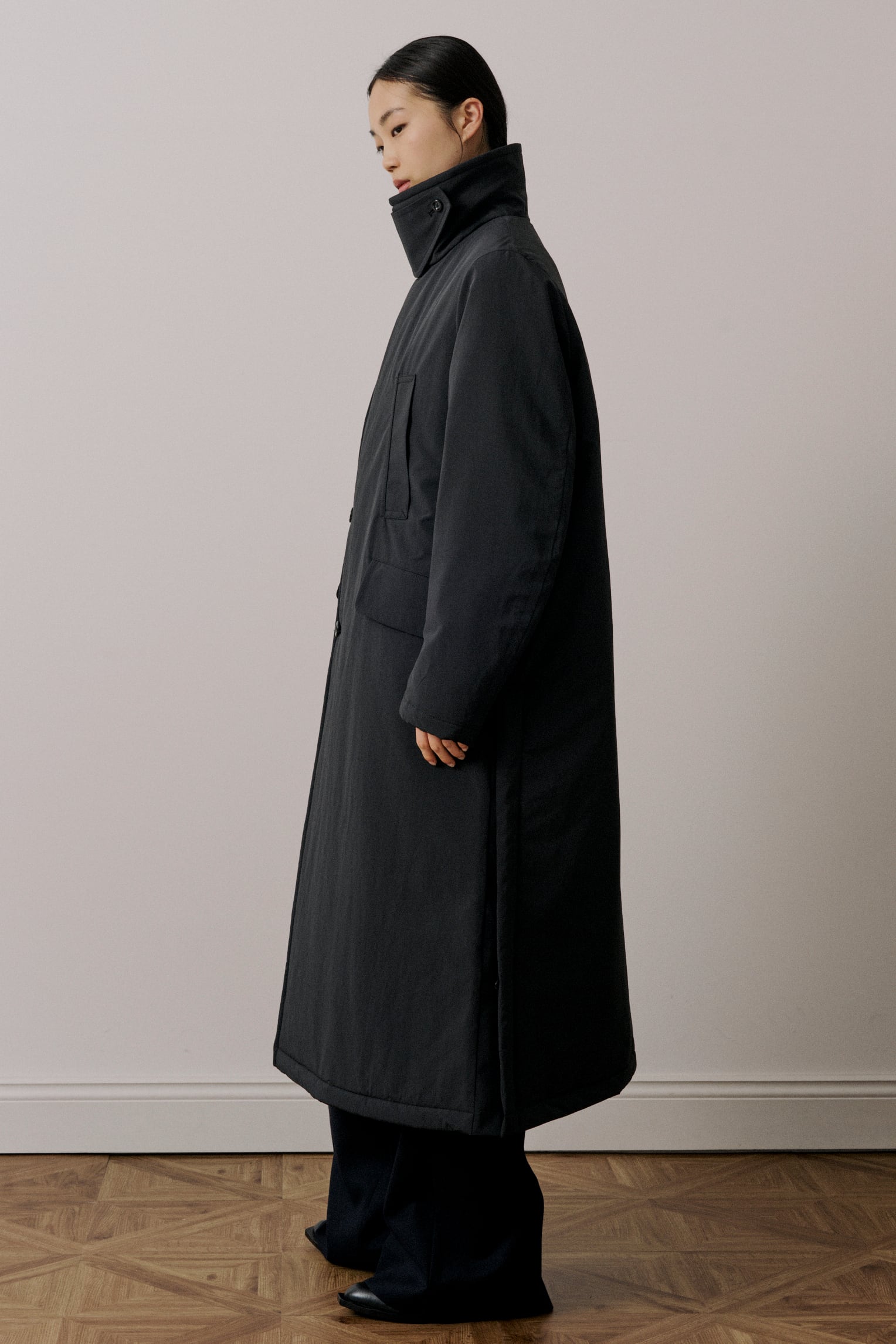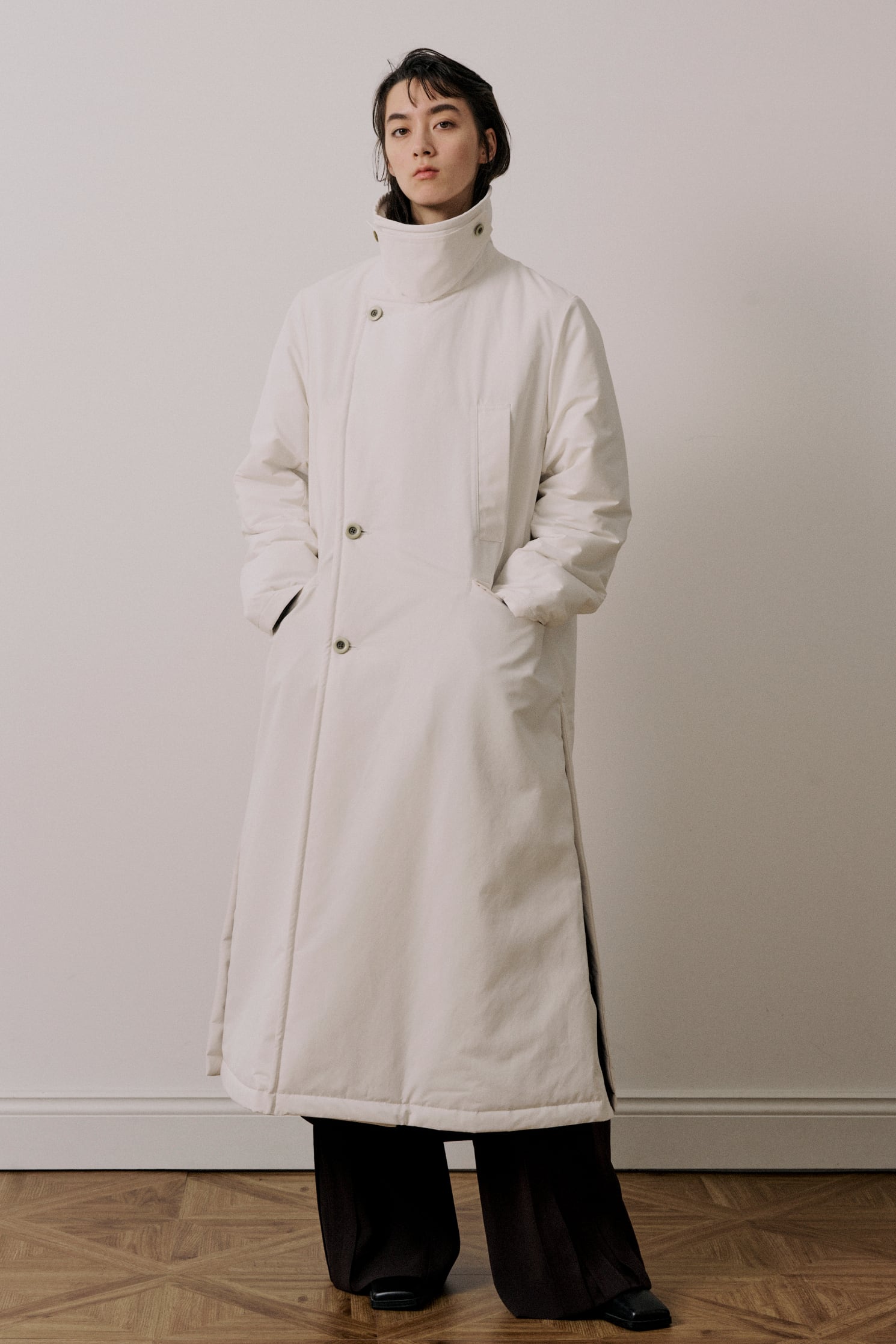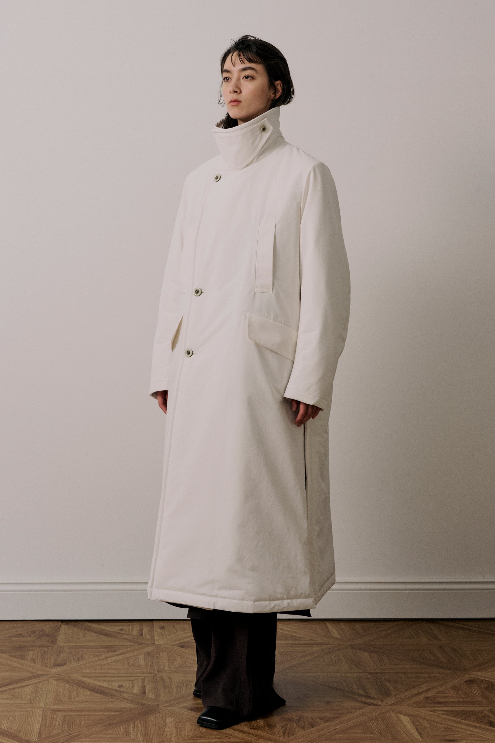 チンストラップ付きのスタンドカラーを活かしたミニマルなデザインのコートです。裏地にキルティングを使用し立体感のあるシルエットに仕上げました。ハンドウォーマーやサイドの釦あきの深いスリットがアクセントになっています。キルティングの綿は光電子の綿を使用し、軽さと高い保温性を両立しています。