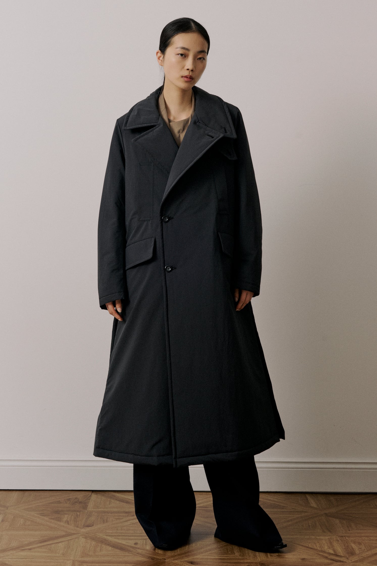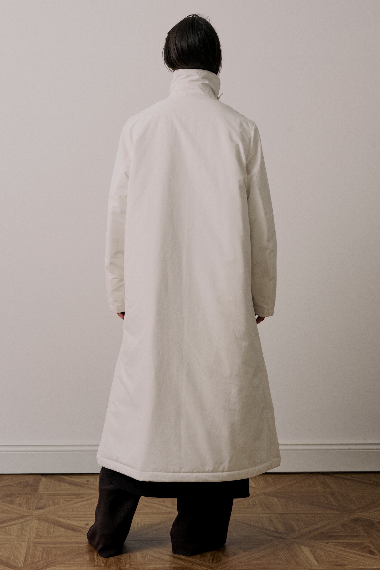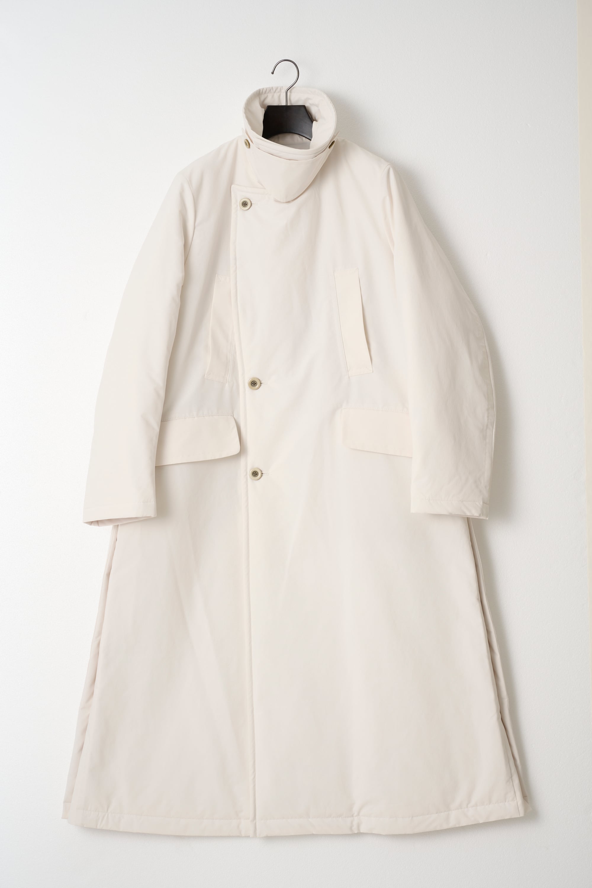 チンストラップ付きのスタンドカラーを活かしたミニマルなデザインのコートです。裏地にキルティングを使用し立体感のあるシルエットに仕上げました。ハンドウォーマーやサイドの釦あきの深いスリットがアクセントになっています。キルティングの綿は光電子の綿を使用し、軽さと高い保温性を両立しています。