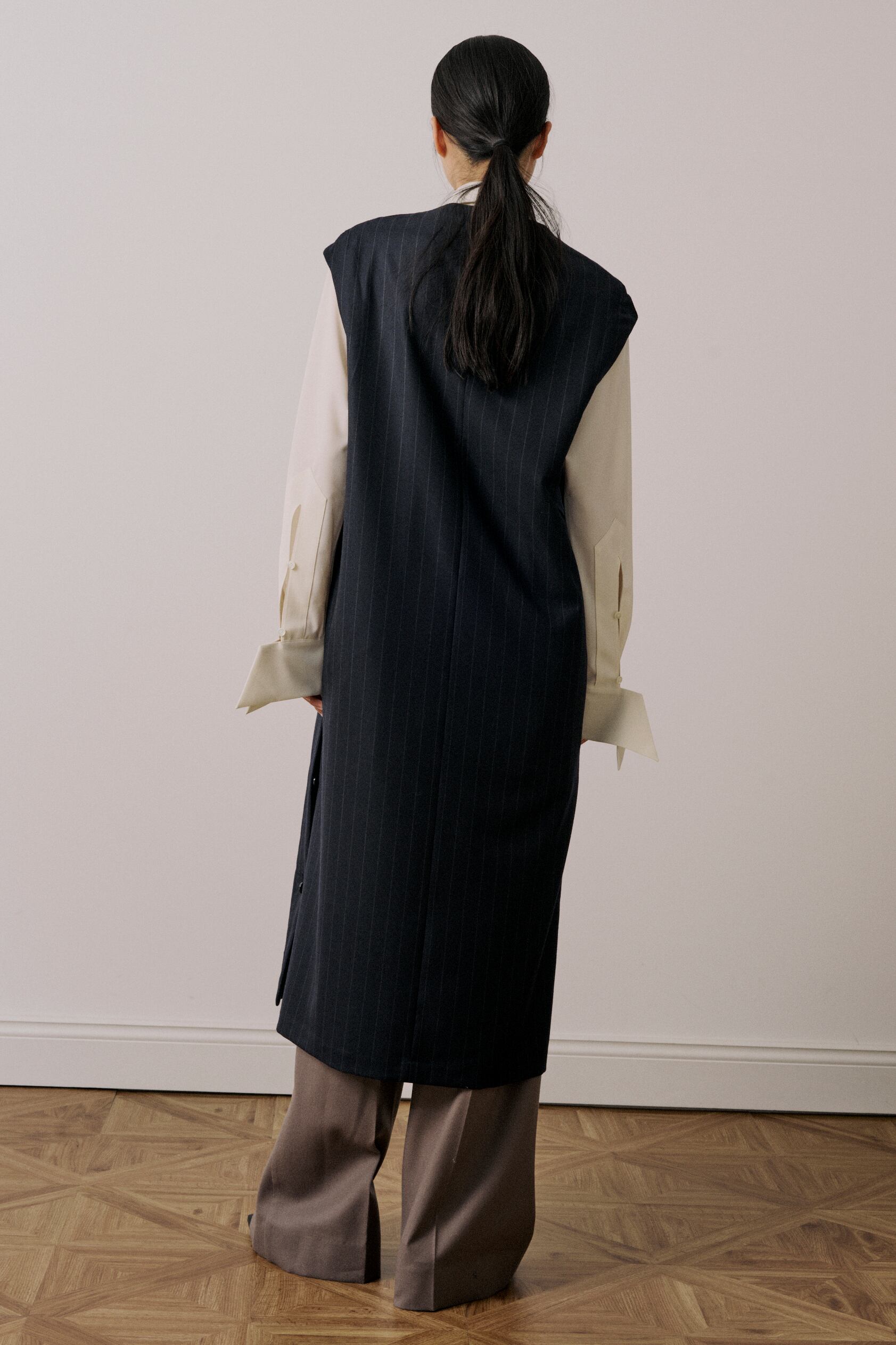 脇に釦が配置されたVネックドレスです。釦を外すと、脇まで大胆に広がるスリットになるデザインです。スリット内側にはポケットが付いています。