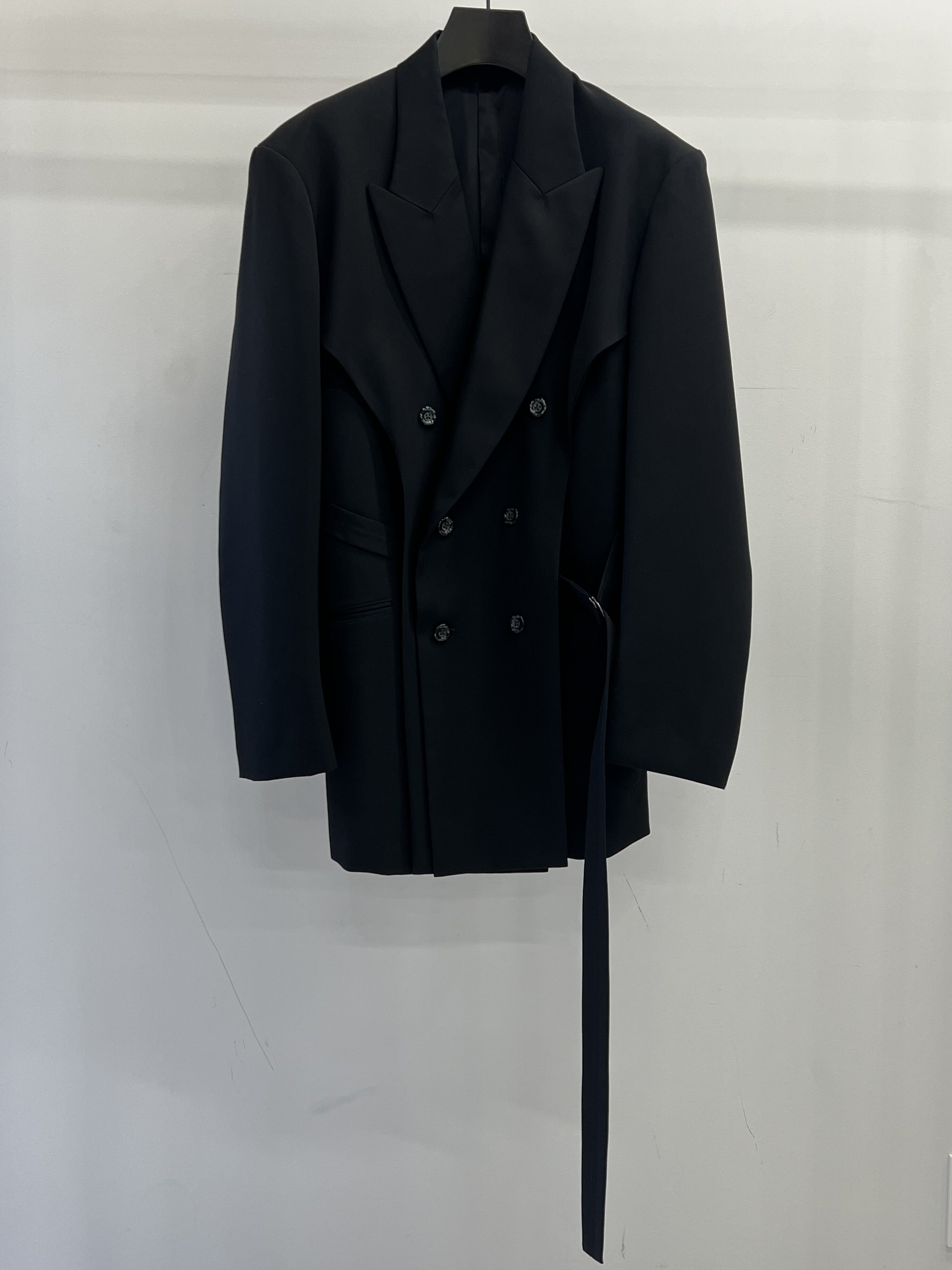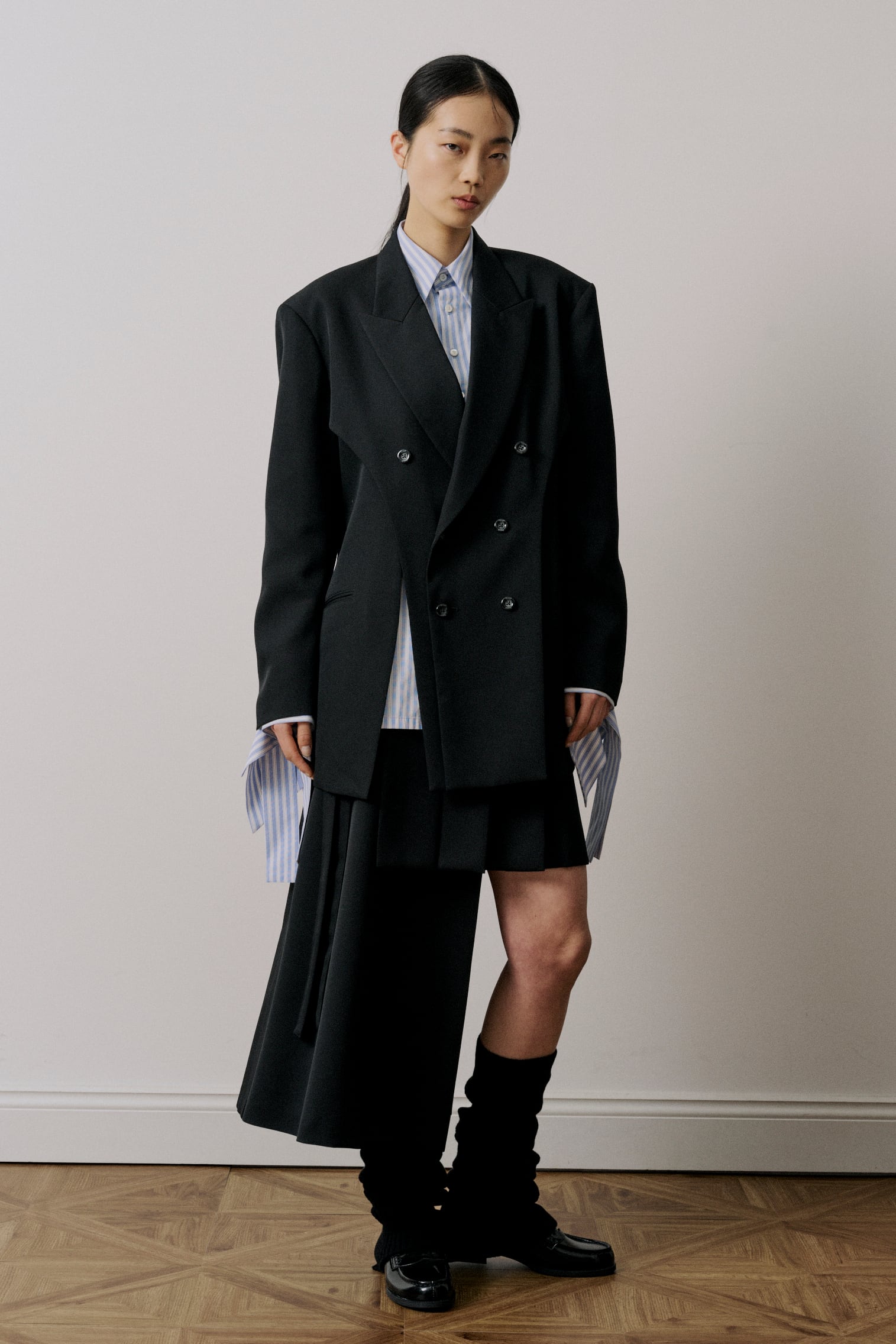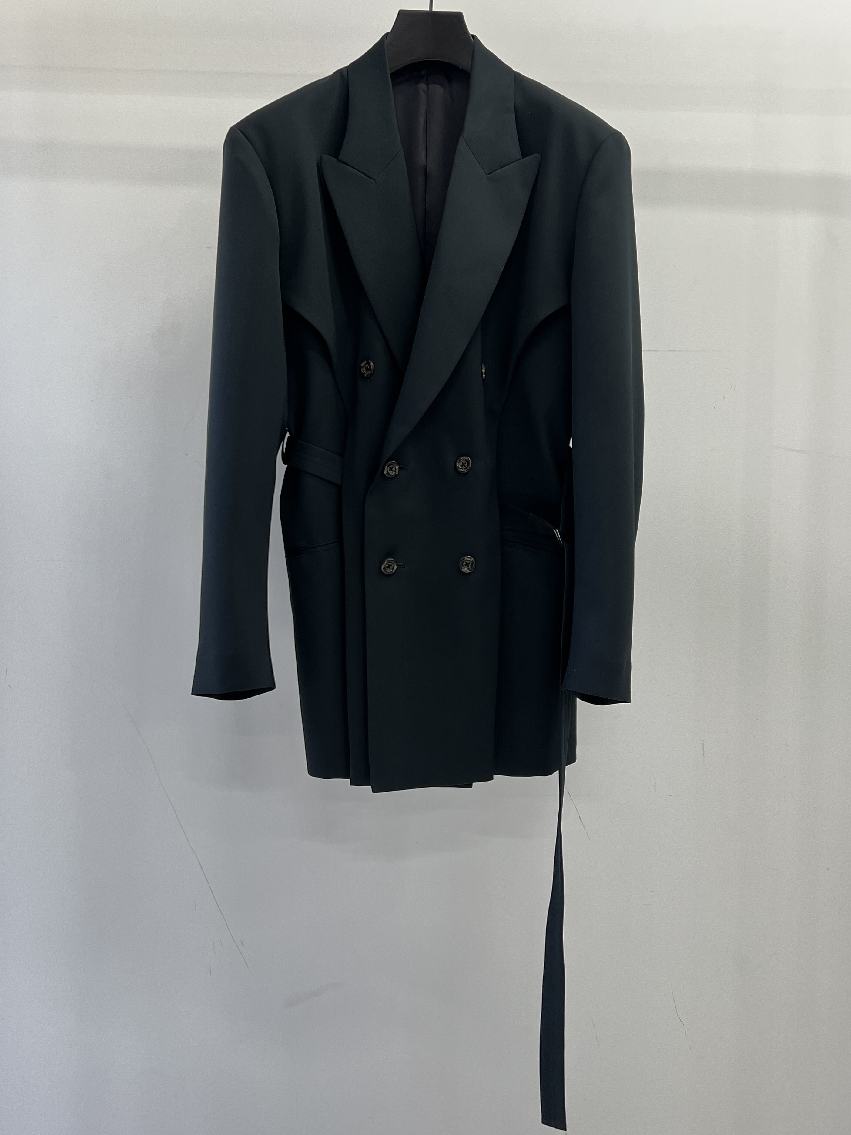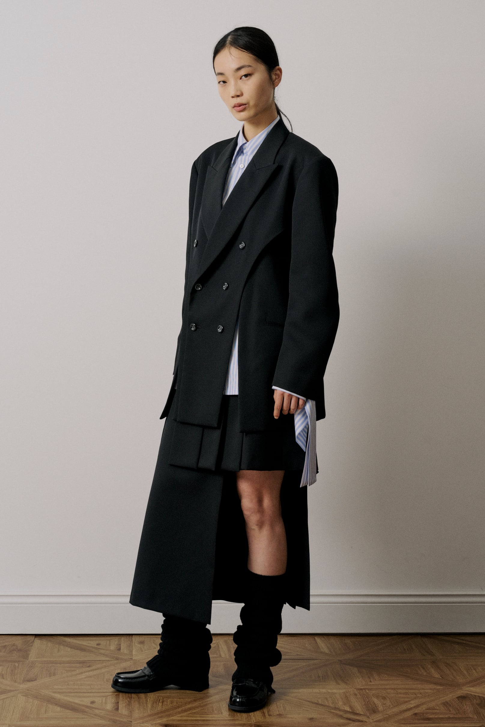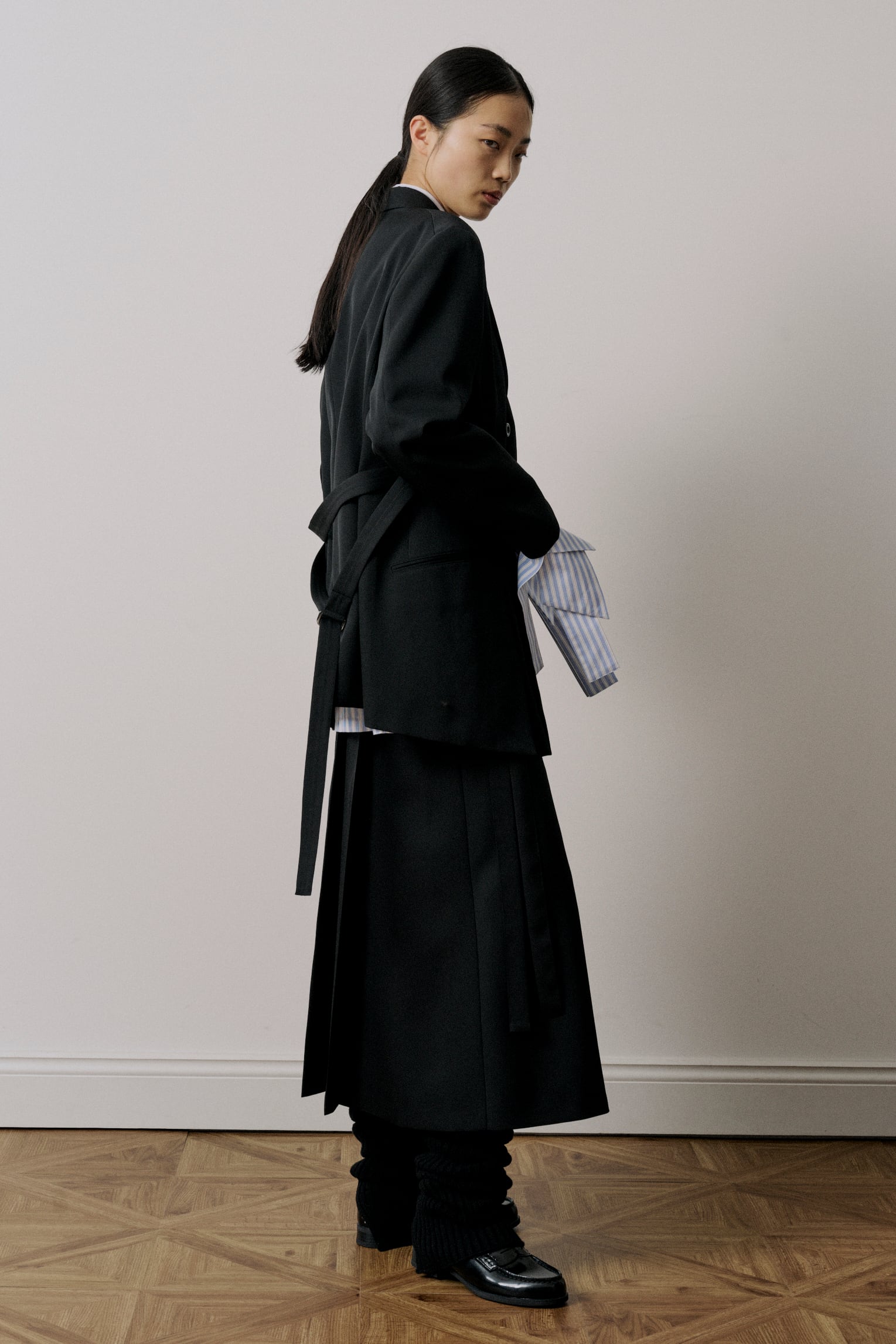 オーセンティックな佇まいのピークドラペルジャケットをベースに、カーブのカッティングを利用したスリットディテールが特徴です。ボリュームを持たせた肩周りとウエストベルトでメリハリのあるシルエットを構築しています。