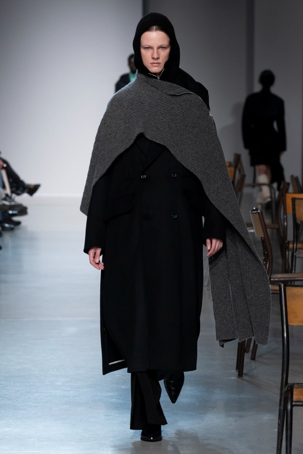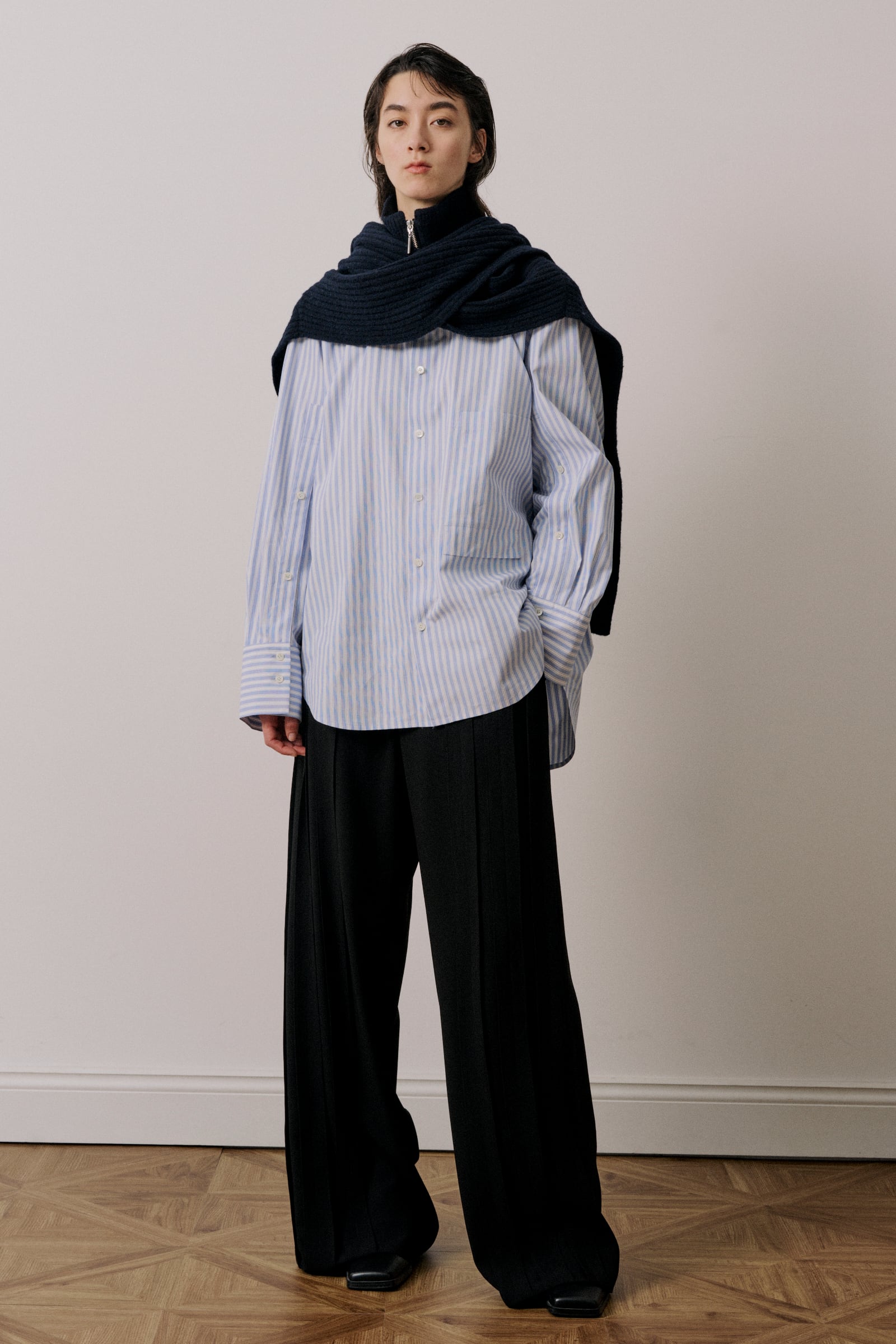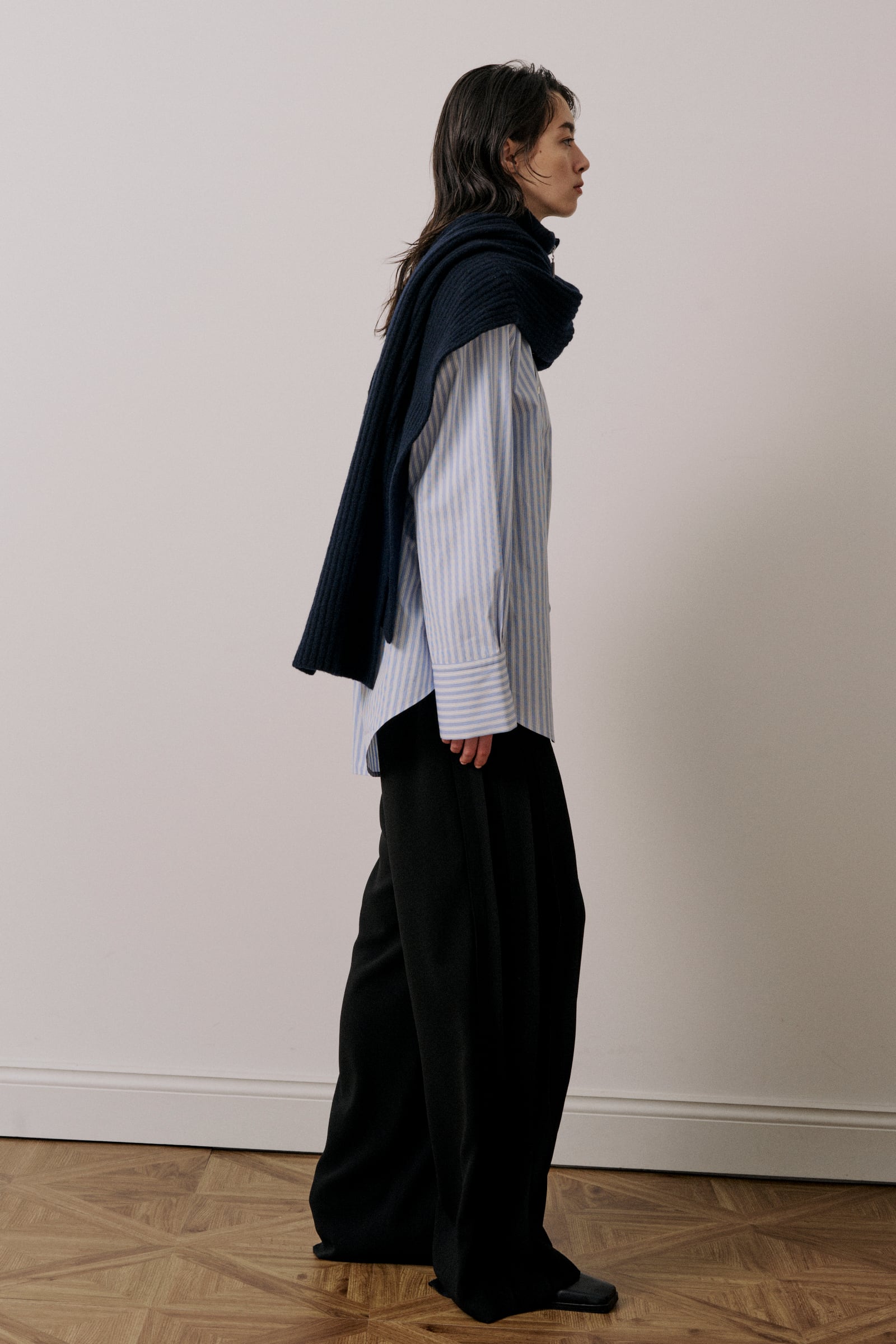 ベストとして着用したりマフラーのように巻いたりコーディネートのアクセントになる一枚です。