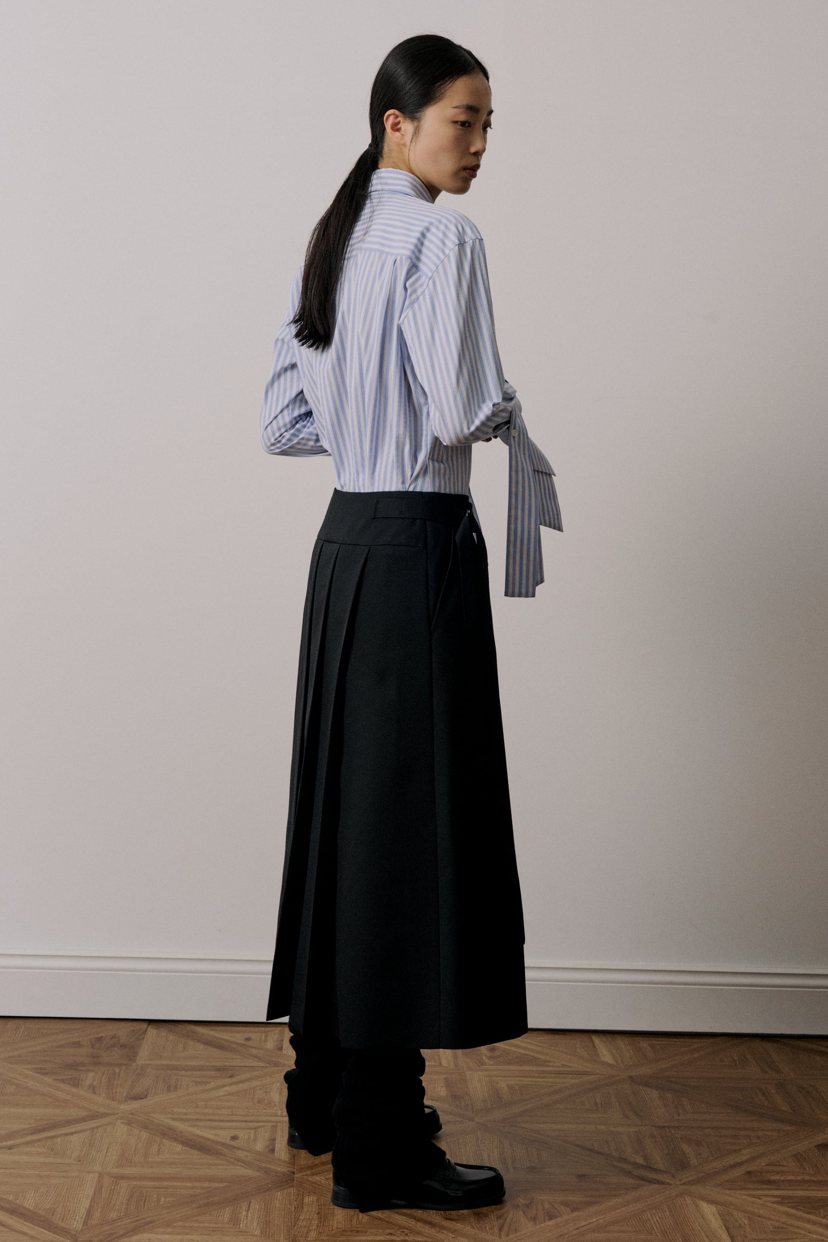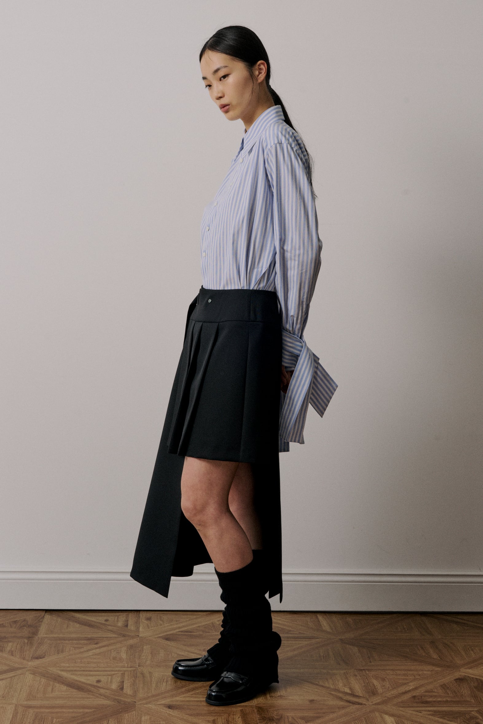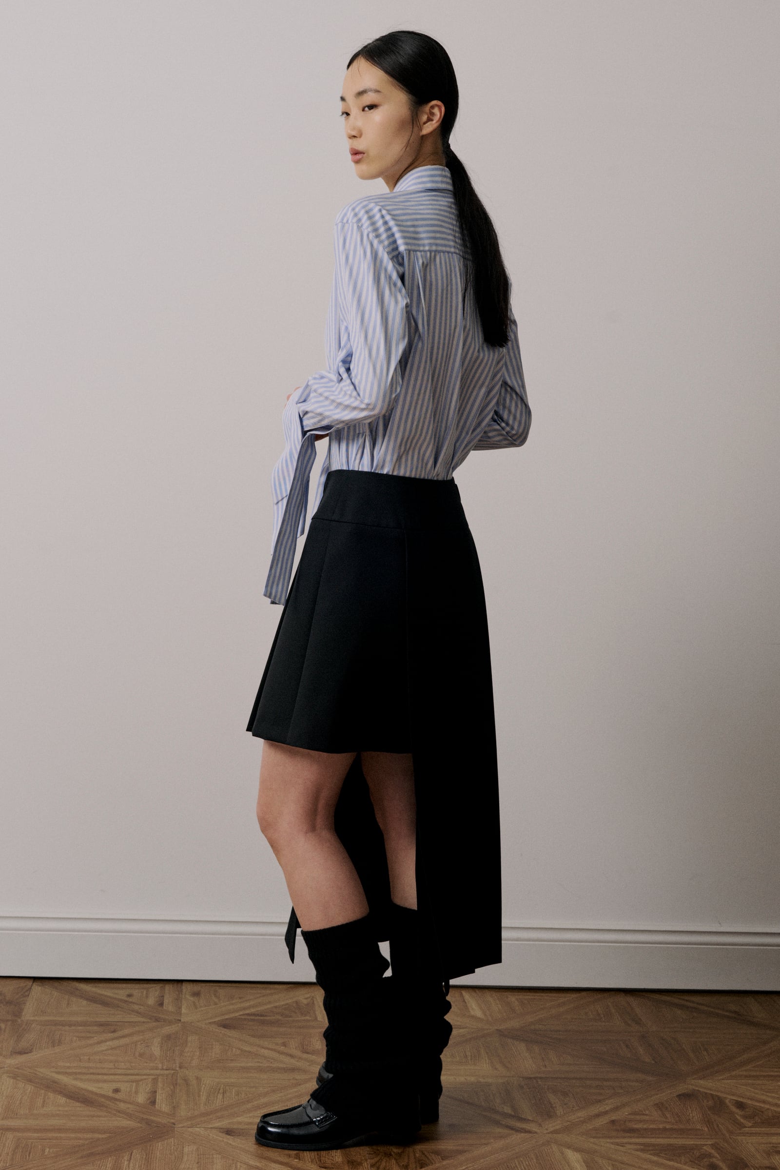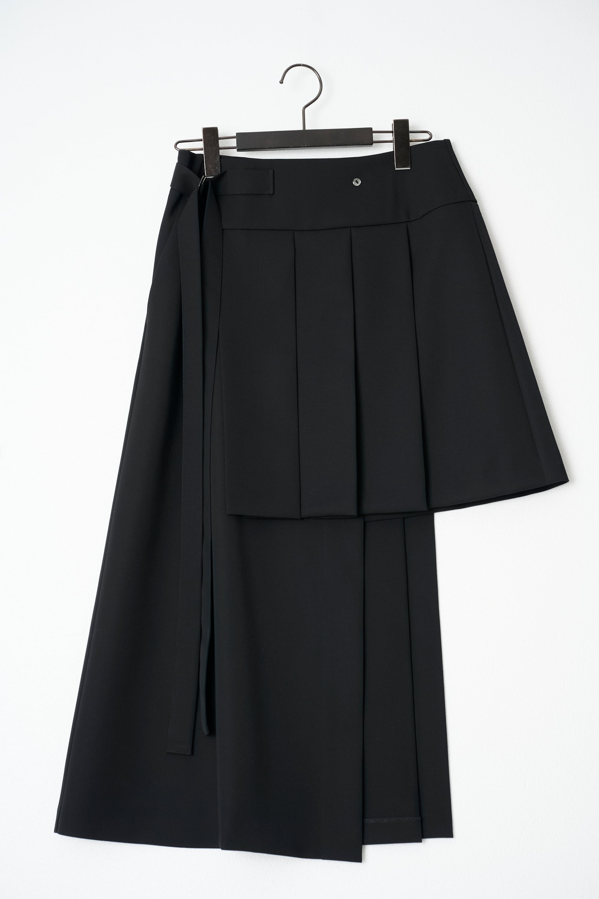 左右でアシンメトリーな丈感が特徴のラッププリーツスカートです。パンツの上にレイヤードしたり着回しが効くアイテムになっています。