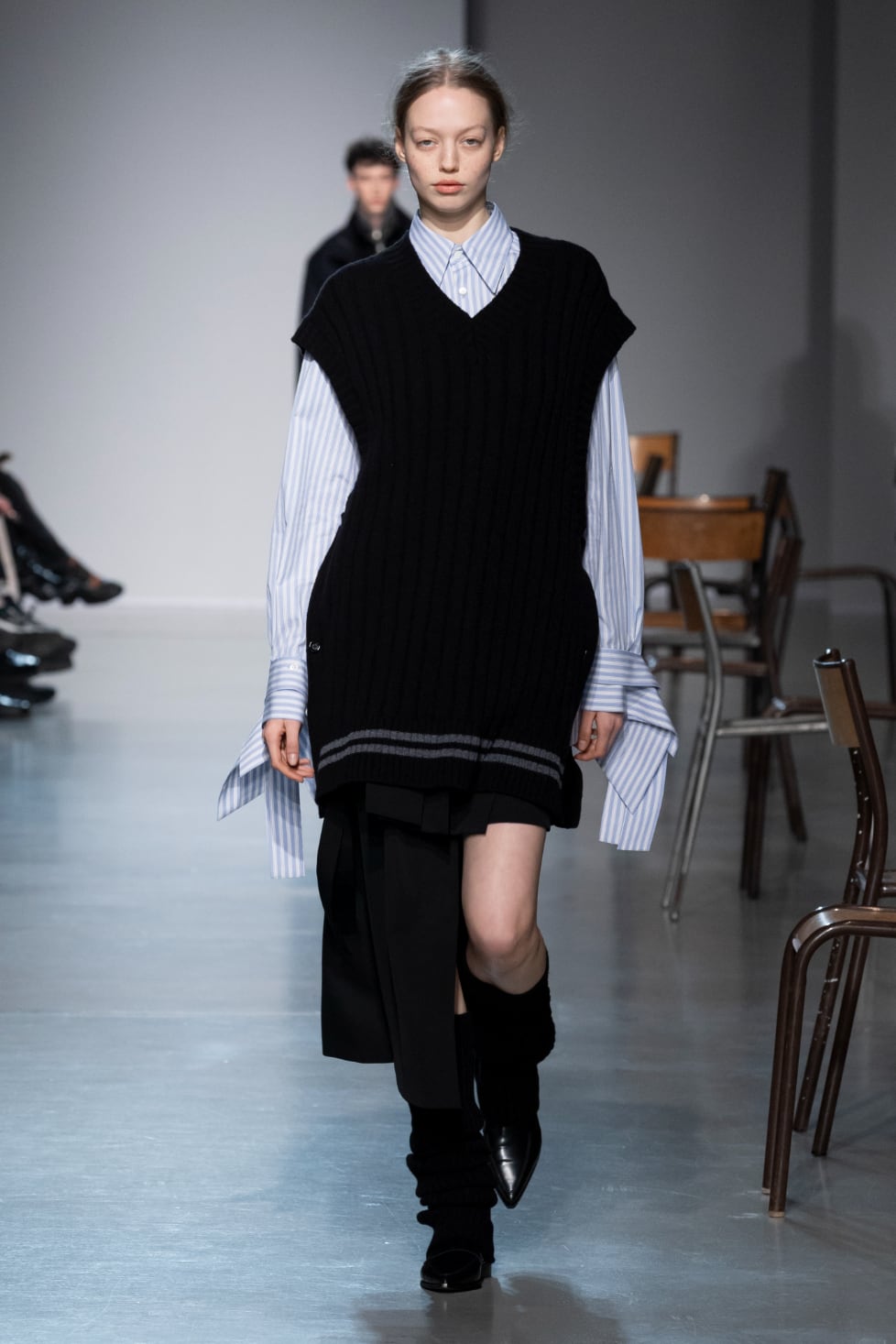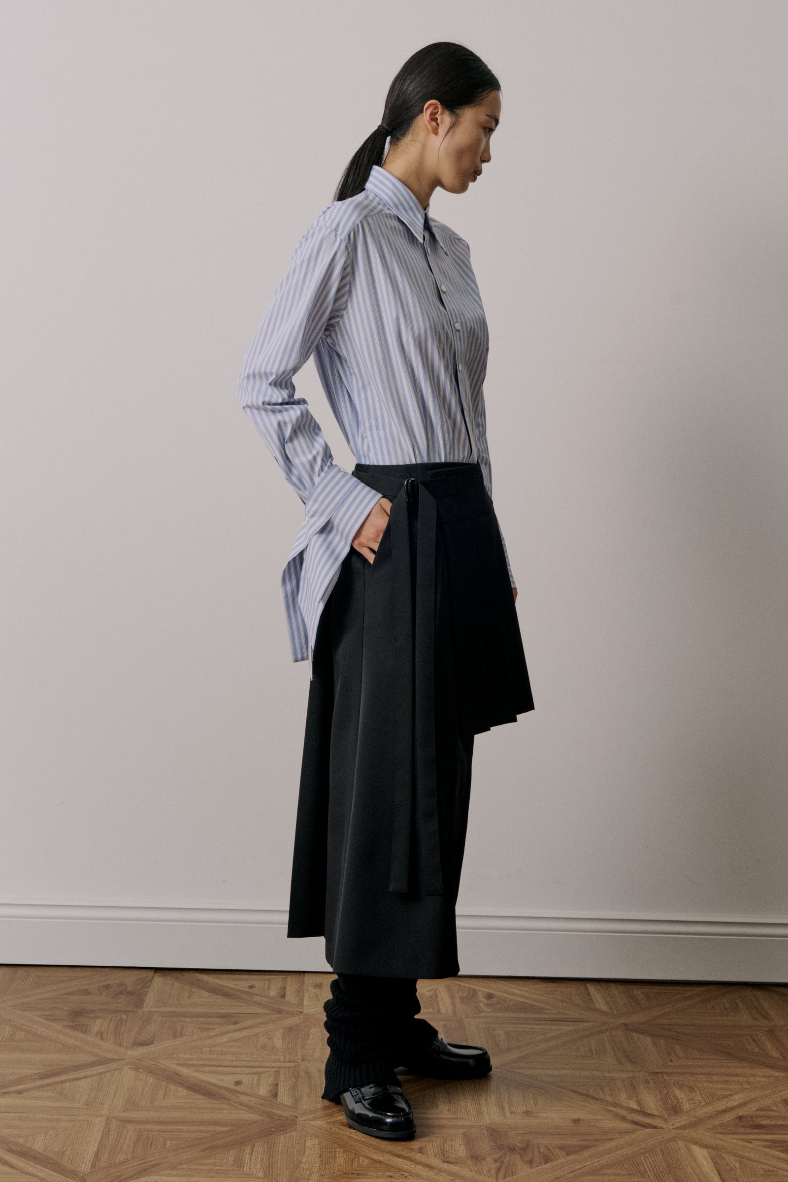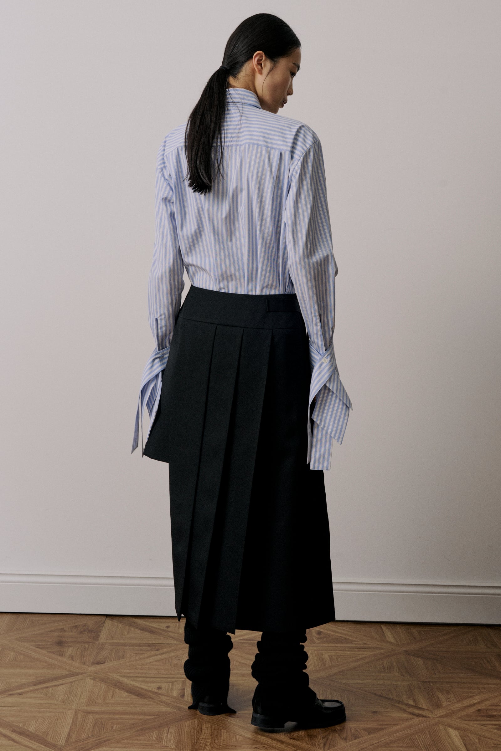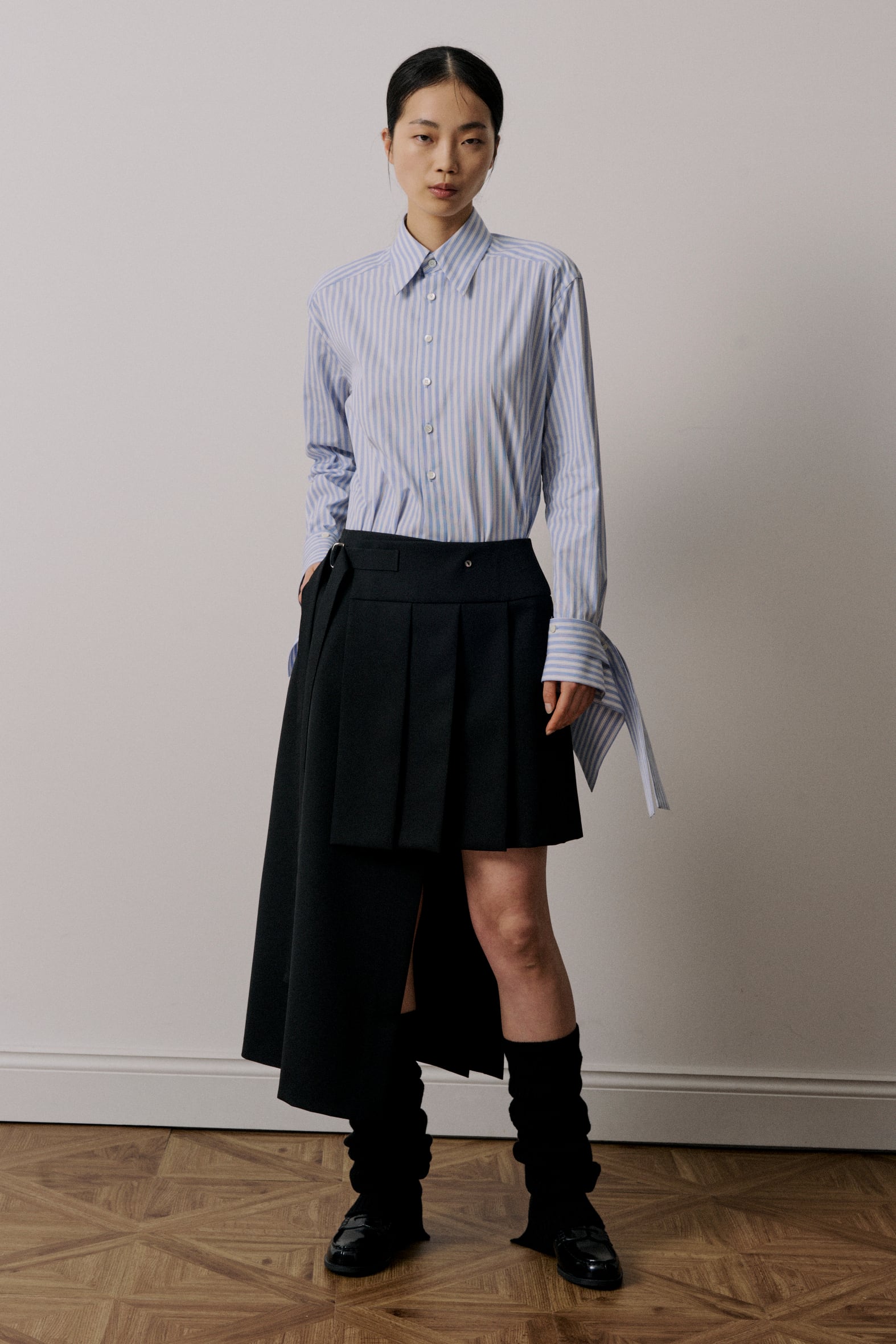左右でアシンメトリーな丈感が特徴のラッププリーツスカートです。パンツの上にレイヤードしたり着回しが効くアイテムになっています。