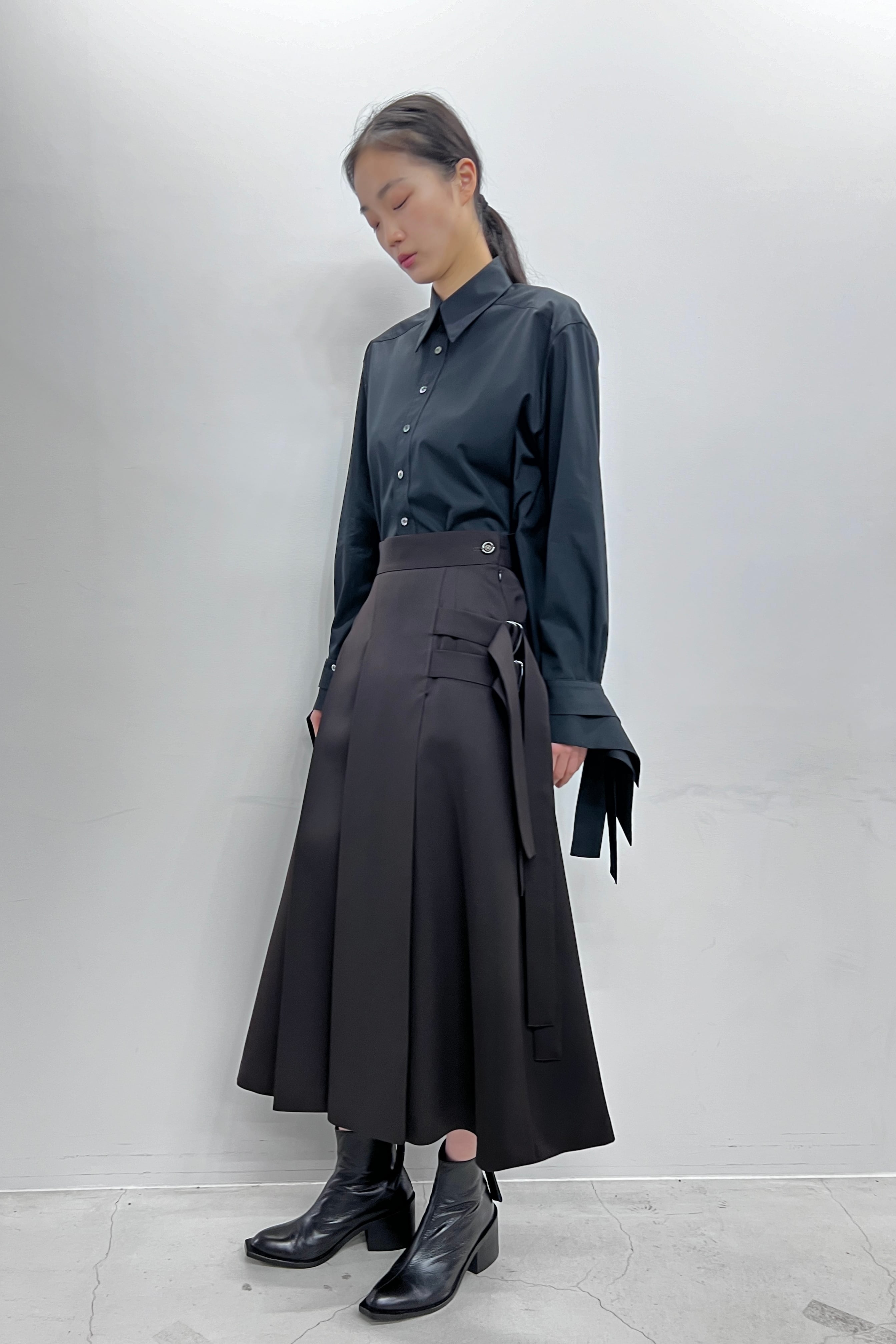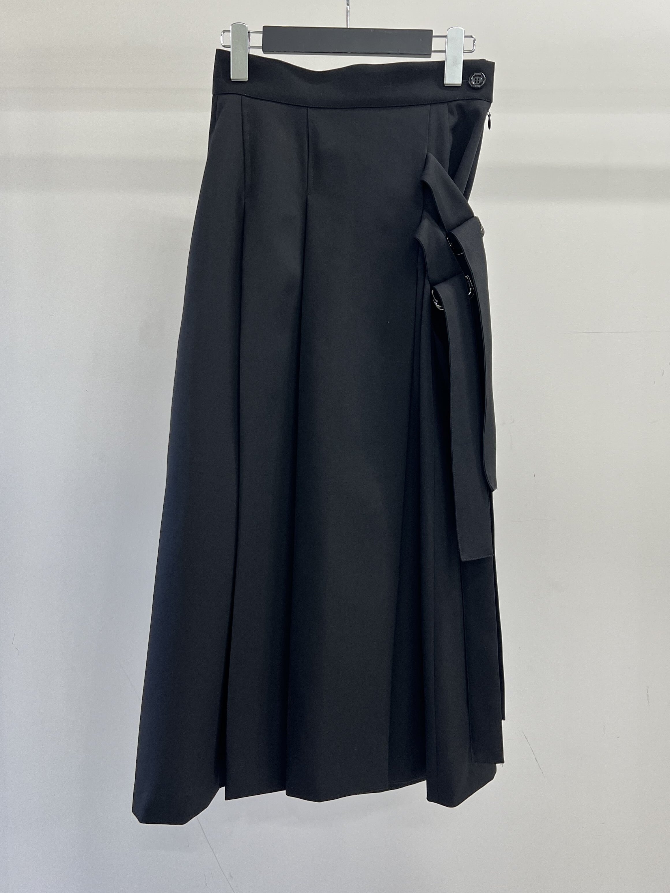 存在感のある幅の異なるプリーツが特徴のスカートです。2本の 飾りベルトがアクセントになっています。