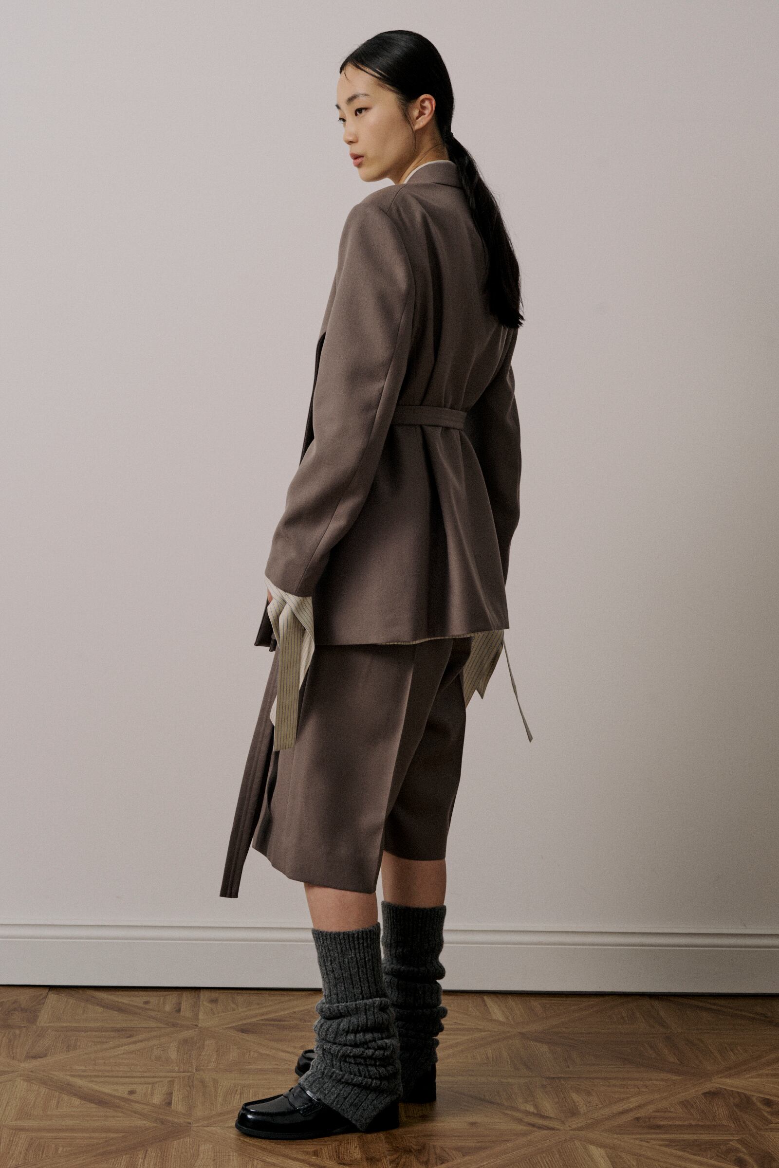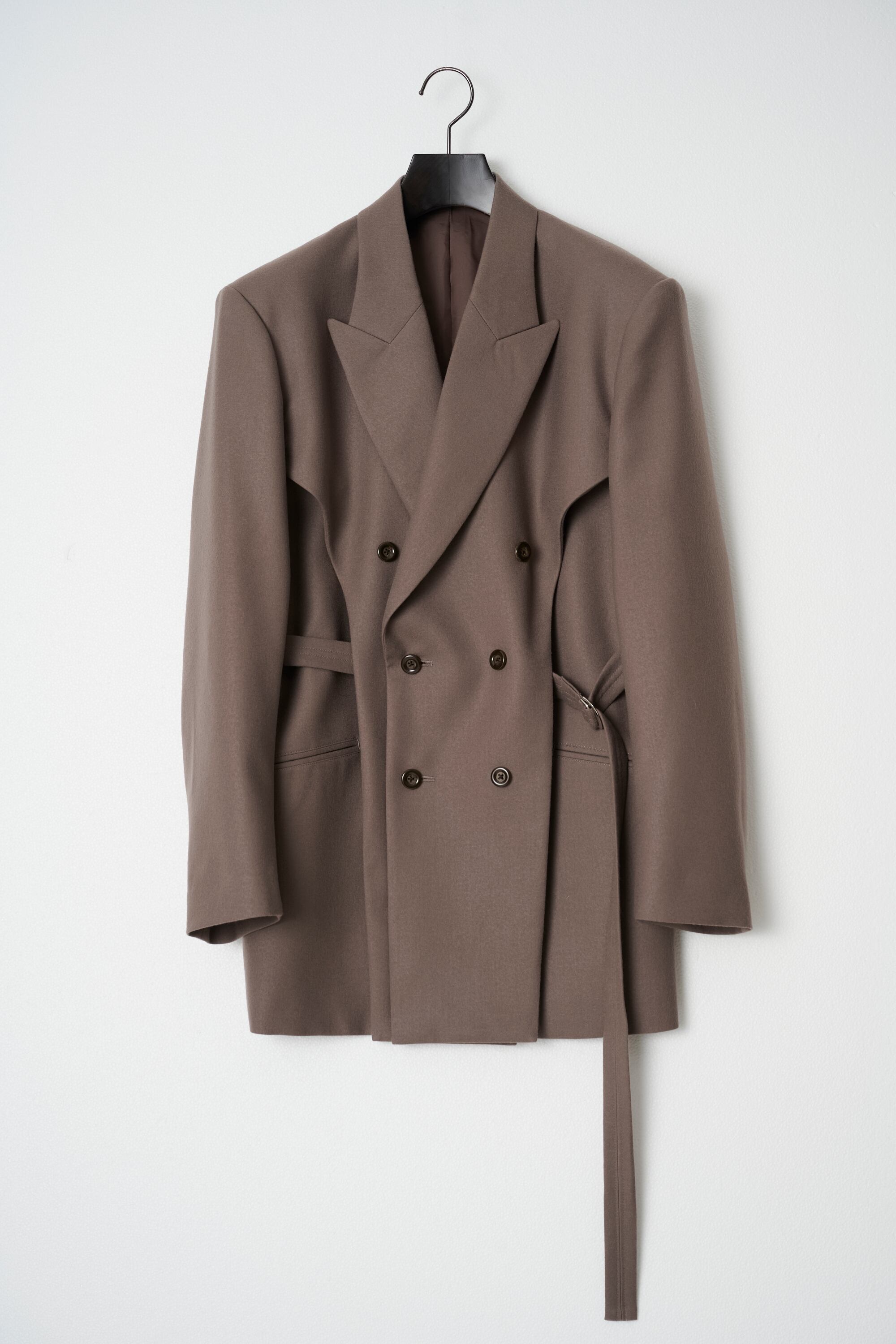 オーセンティックな佇まいのピークドラペルジャケットをベースに、カーブのカッティングを利用したスリットディテールが特徴です。ボリュームを持たせた肩周りとウエストベルトでメリハリのあるシルエットを構築しています。
