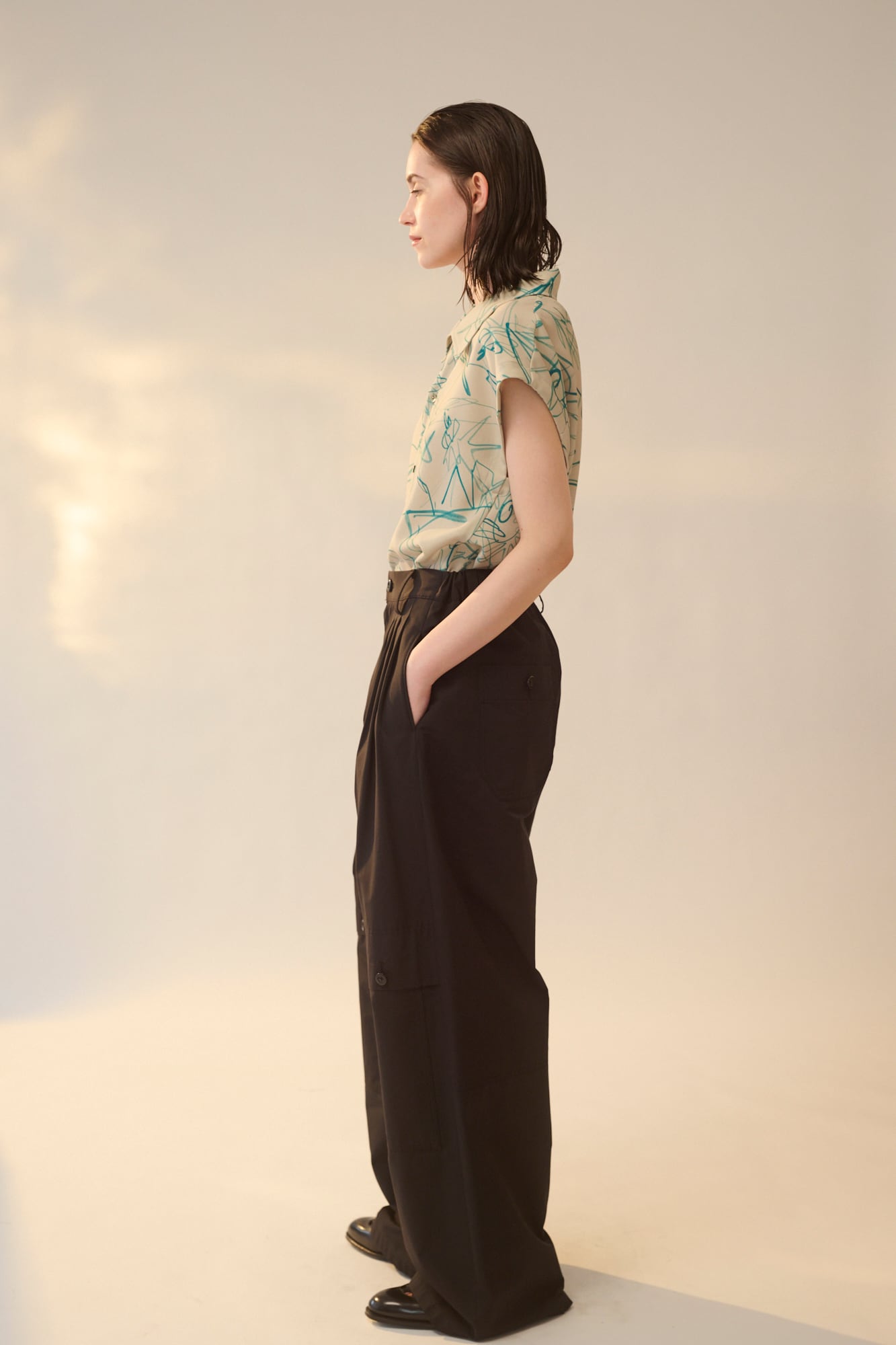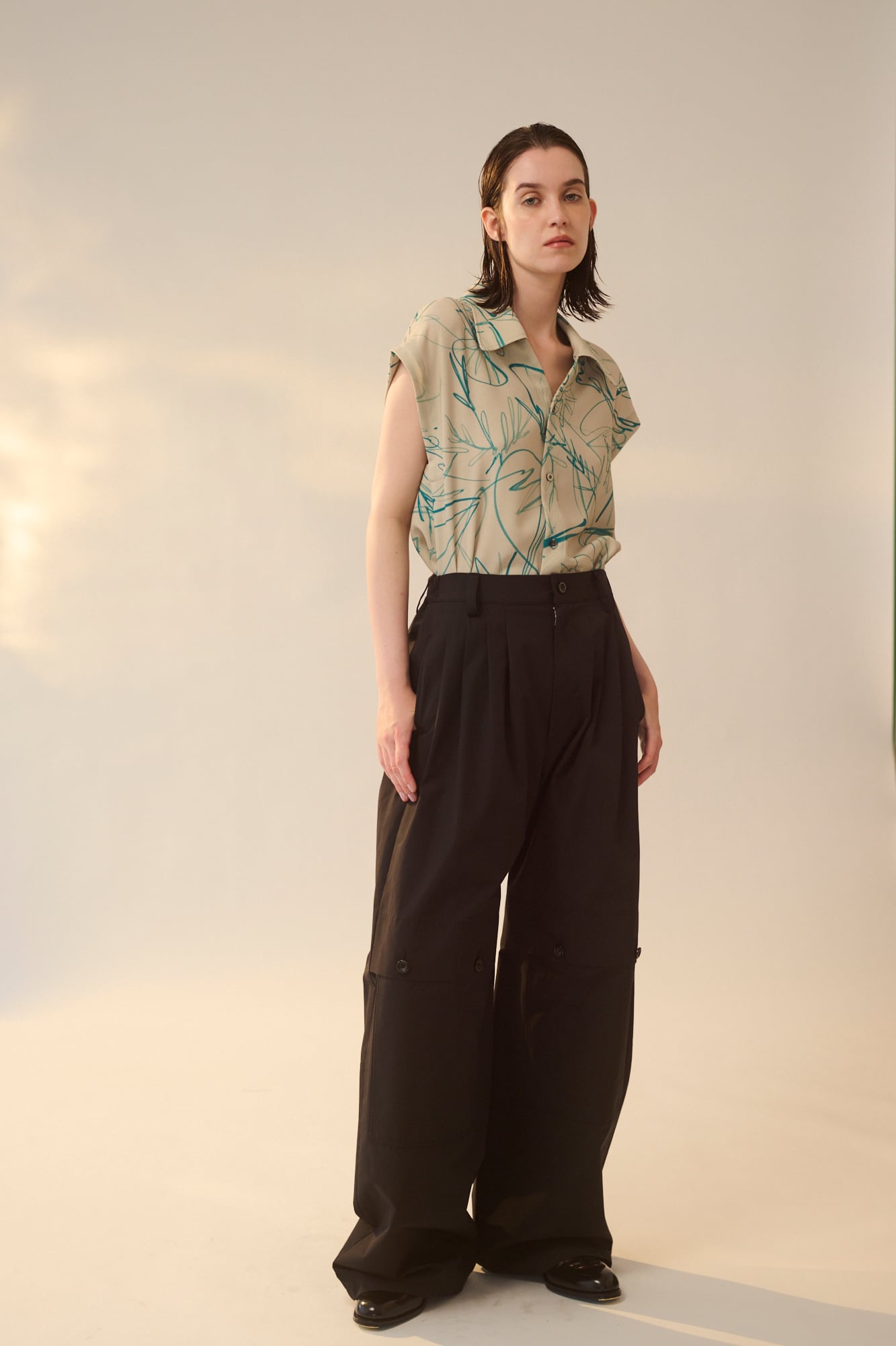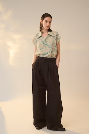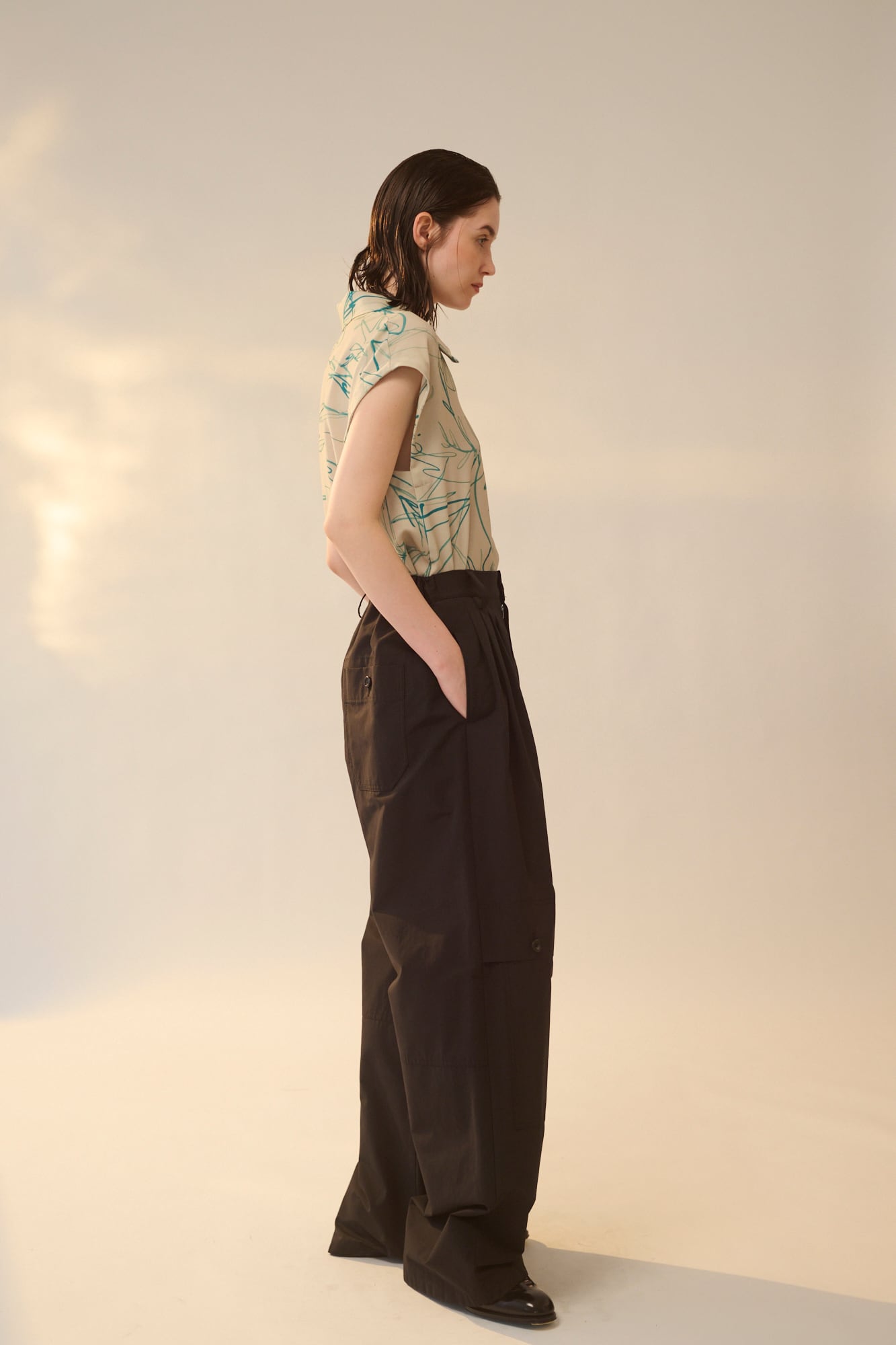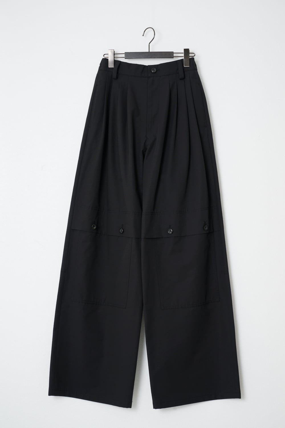 ワークテイストなディテールが特徴のパンツです。フロントの⾝頃続きのフラップやアウトポケット、ステッチなどがアクセントになっています。後ろはゴム仕様でストレスフリーな履き⼼地です。