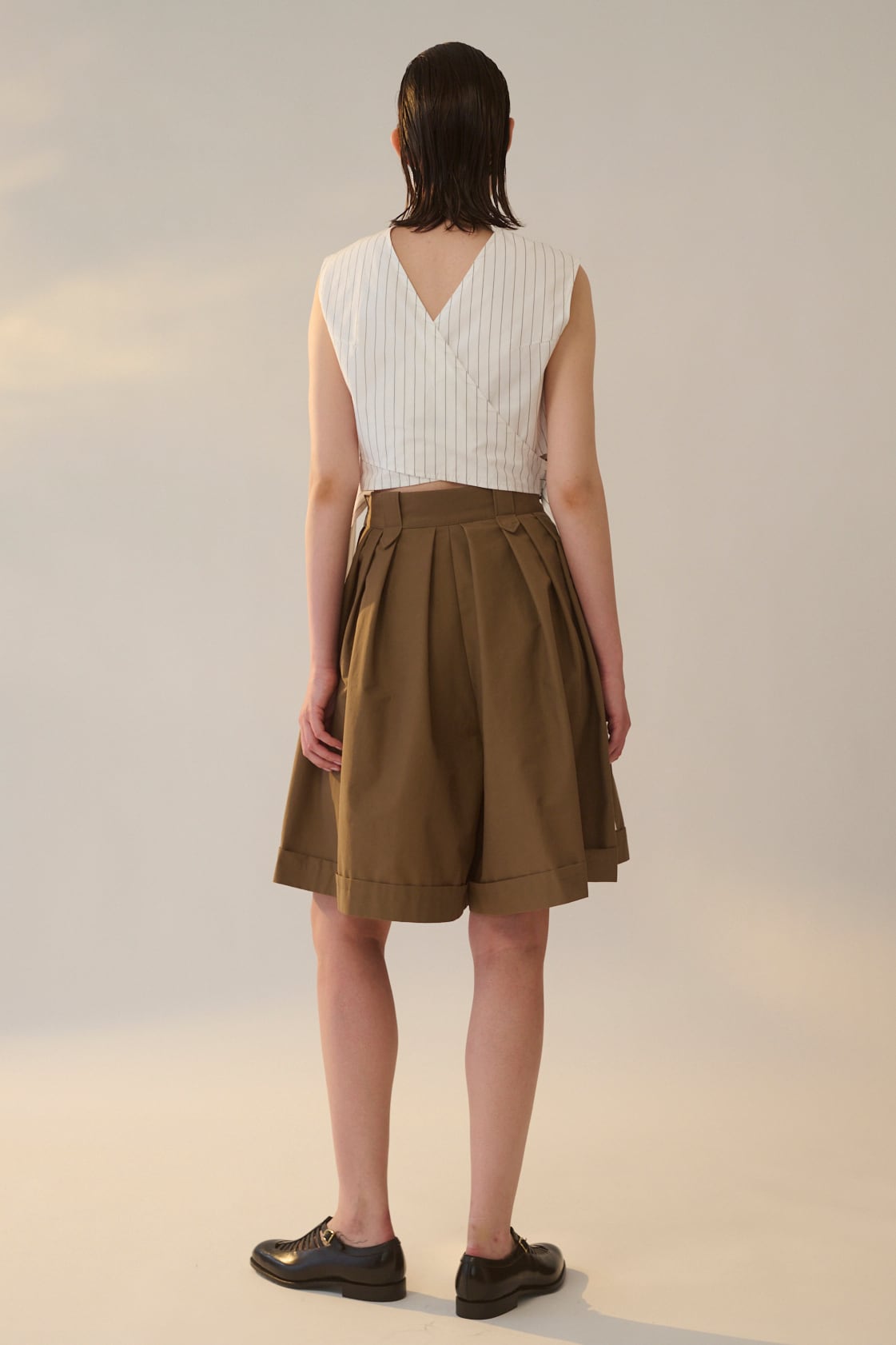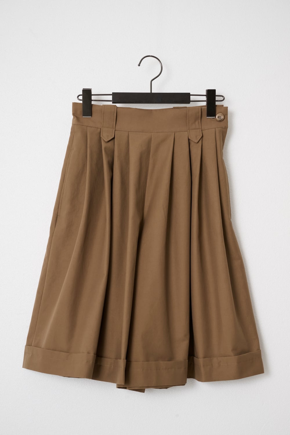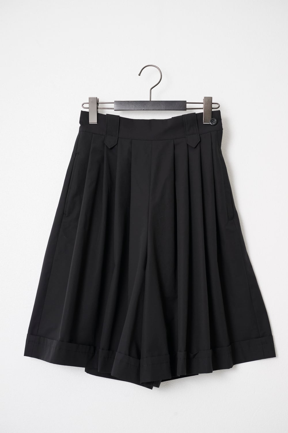 前後に施したたっぷりのタックから広がる⽴体的なボリュームが特徴のキュロットパンツです。デザイン性のあるベルトループと裾のマッキン仕⽴てがアクセントになりモードな印象に仕上がっています。
