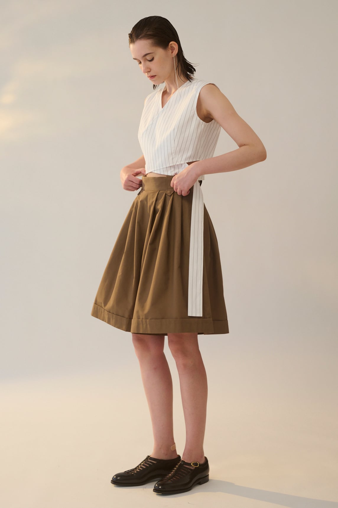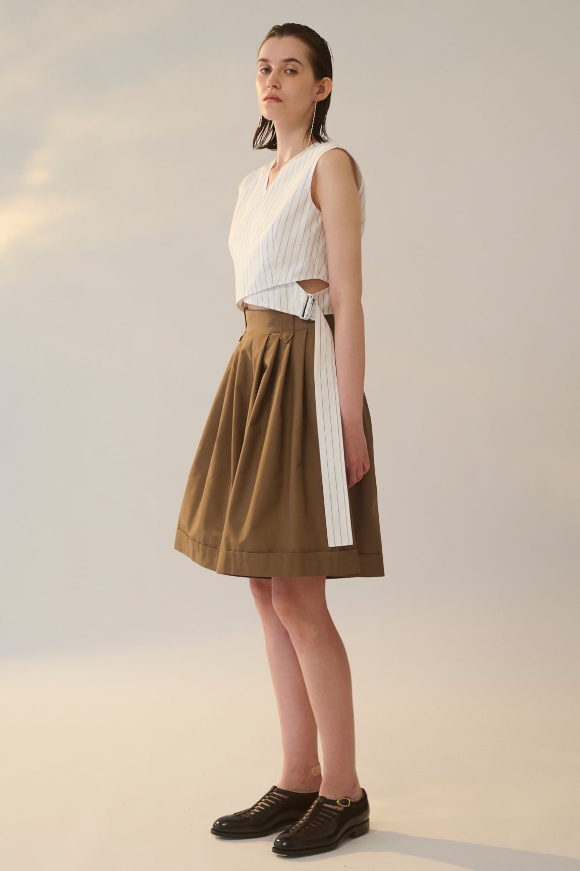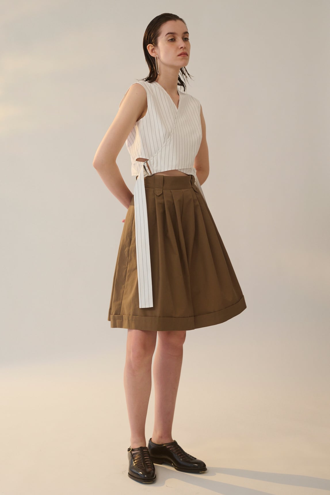 前後に施したたっぷりのタックから広がる⽴体的なボリュームが特徴のキュロットパンツです。デザイン性のあるベルトループと裾のマッキン仕⽴てがアクセントになりモードな印象に仕上がっています。