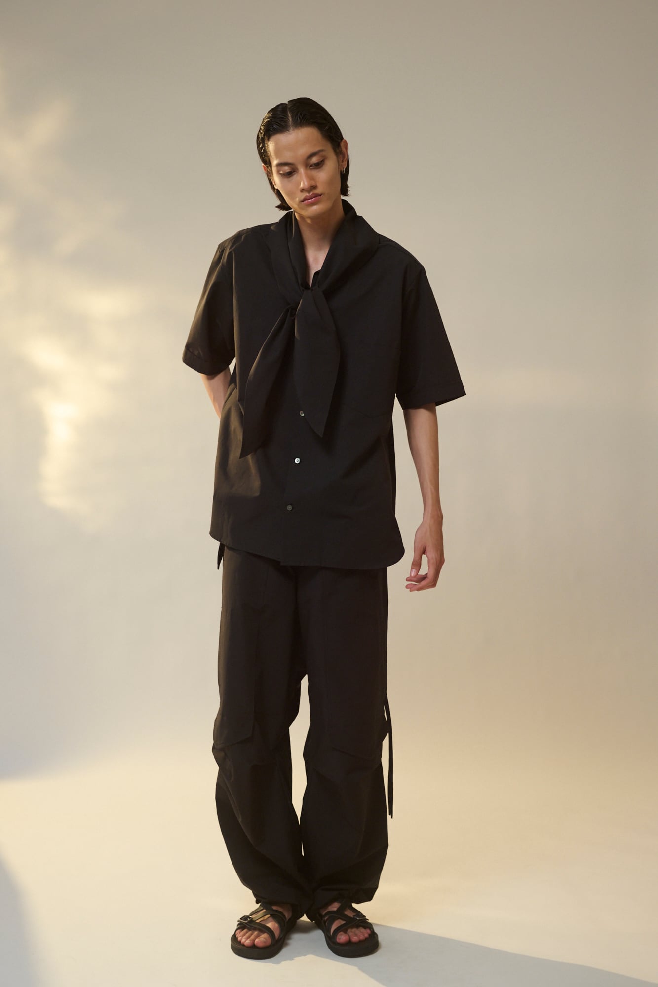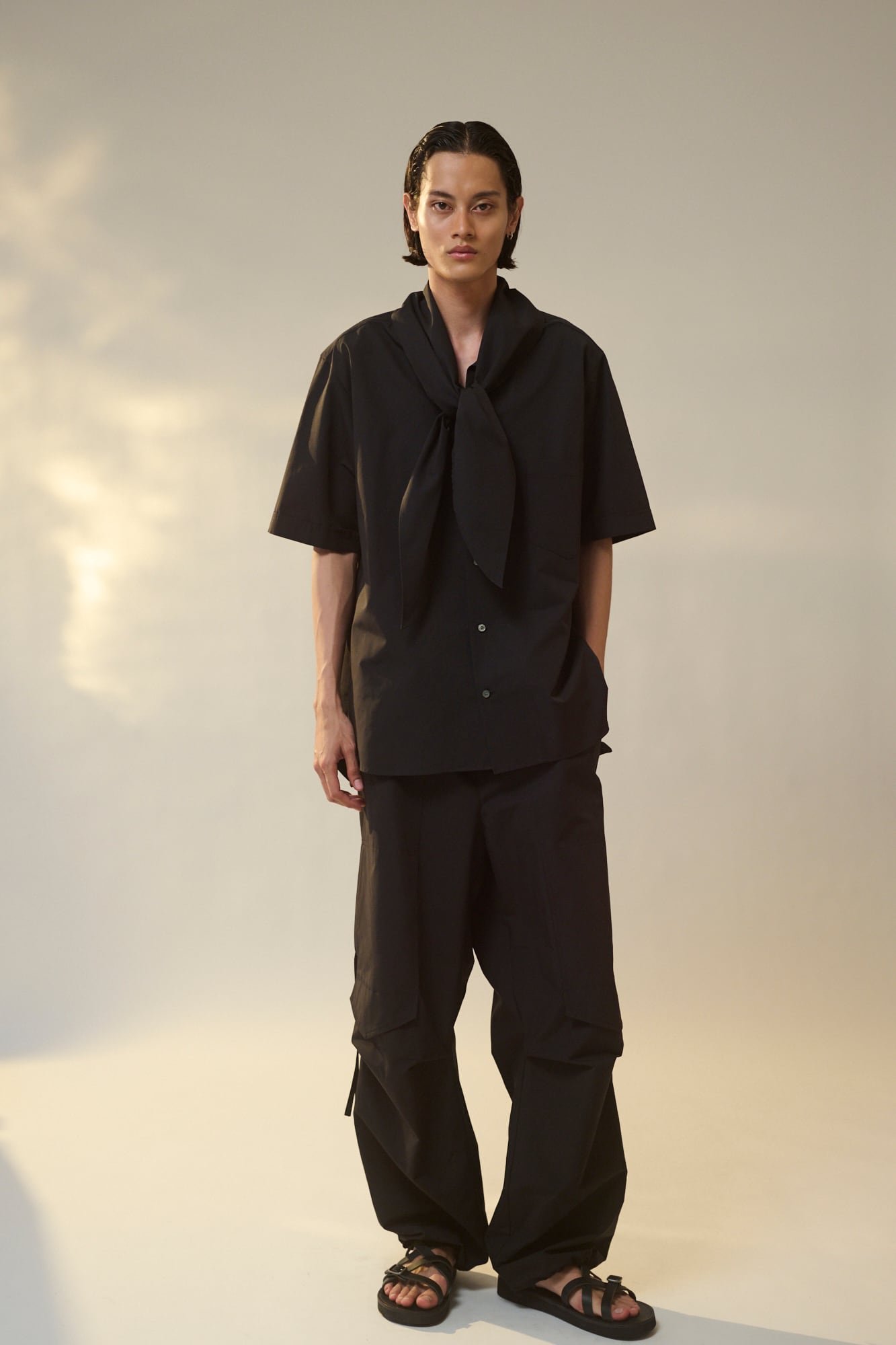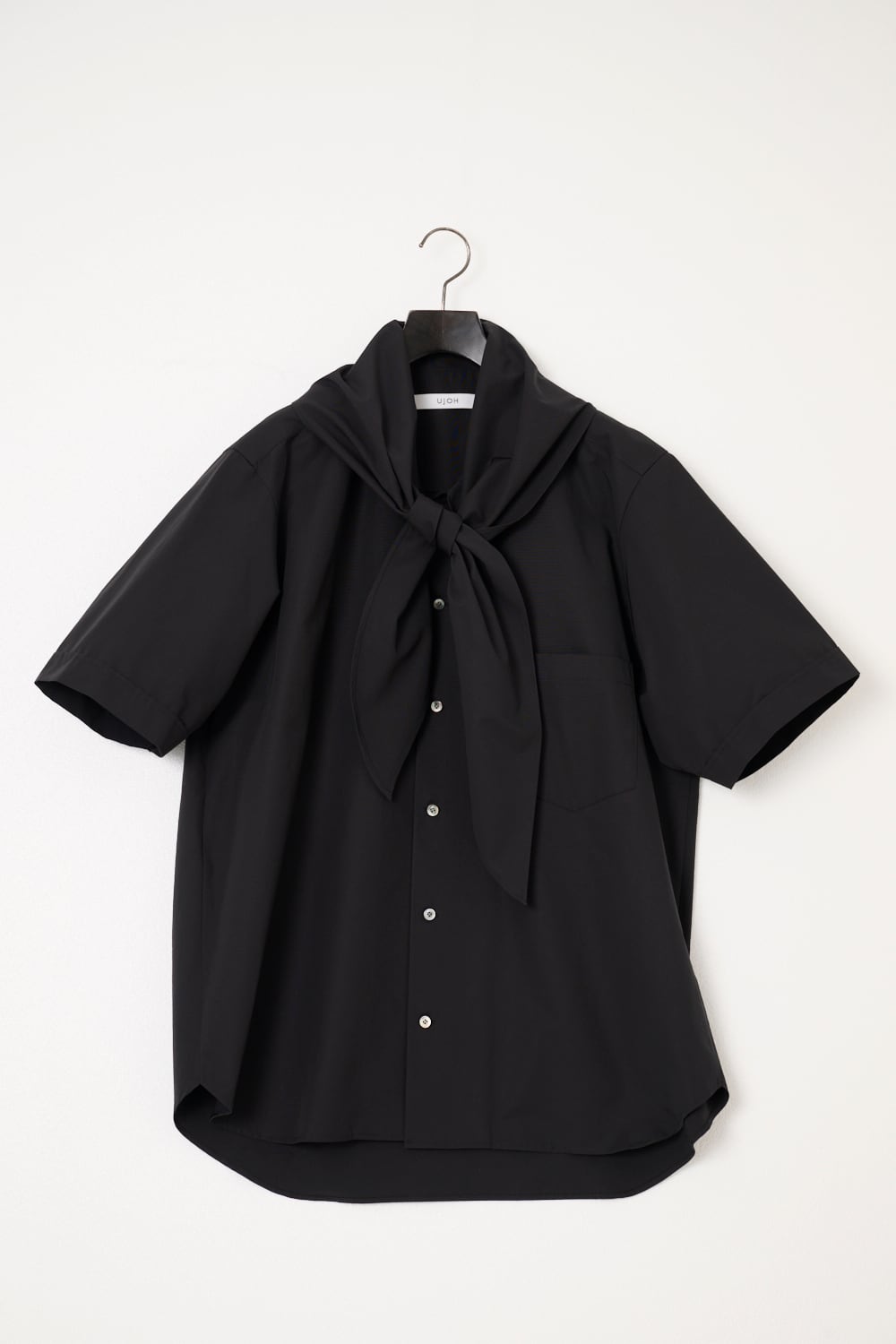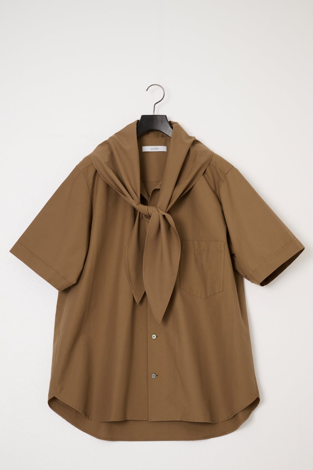 ⾸元を少し深めに設定し、スカーフの⽴体的なドレープは端正で柔らかい雰囲気のあるスタイルに仕上がっています。