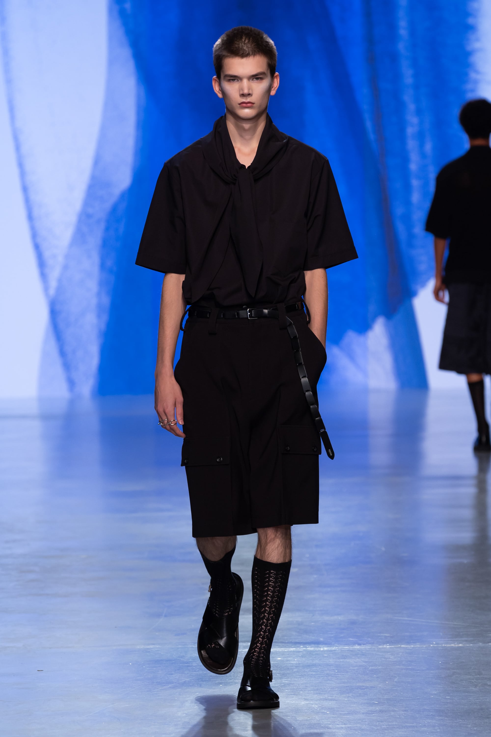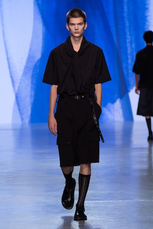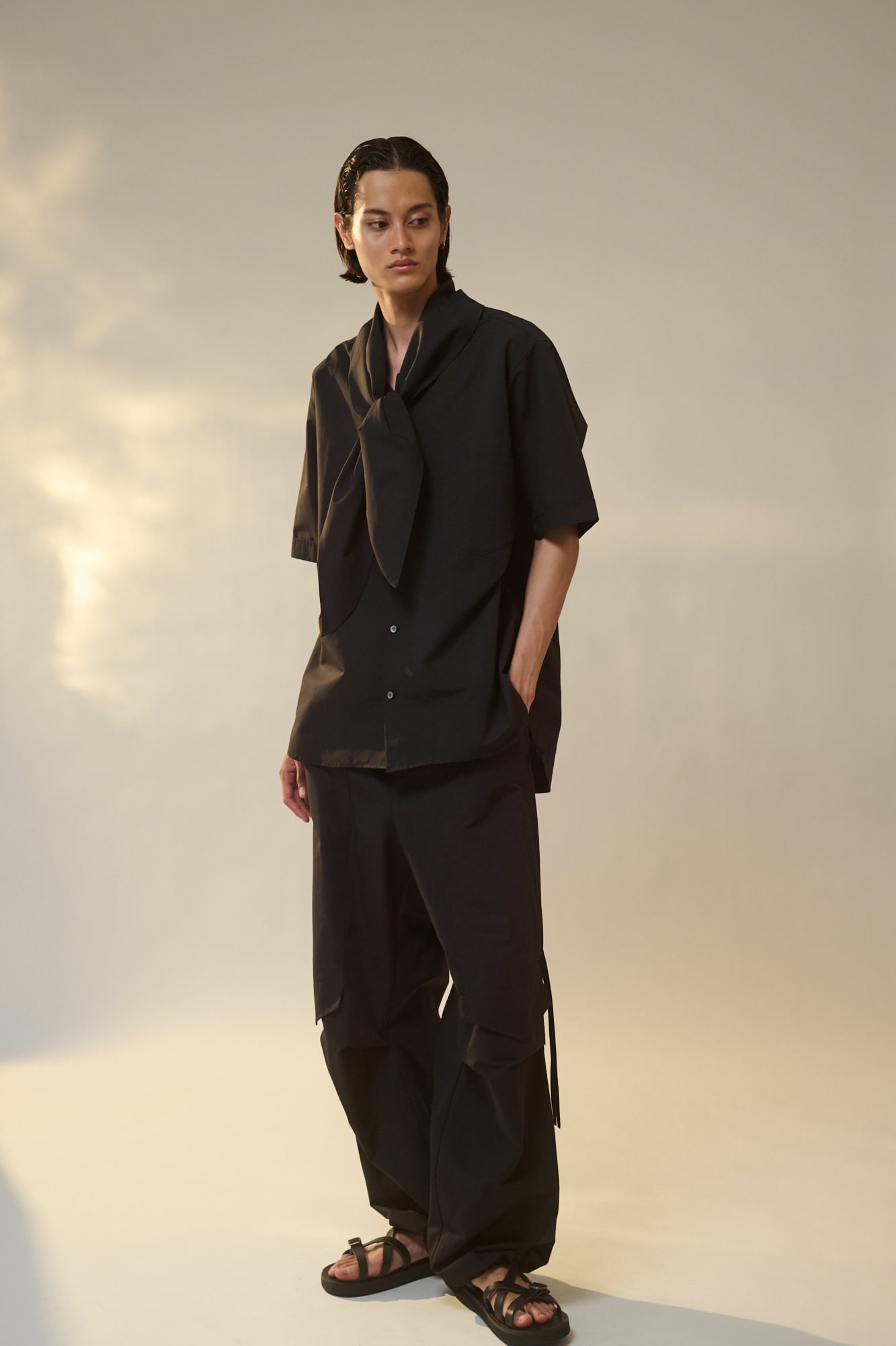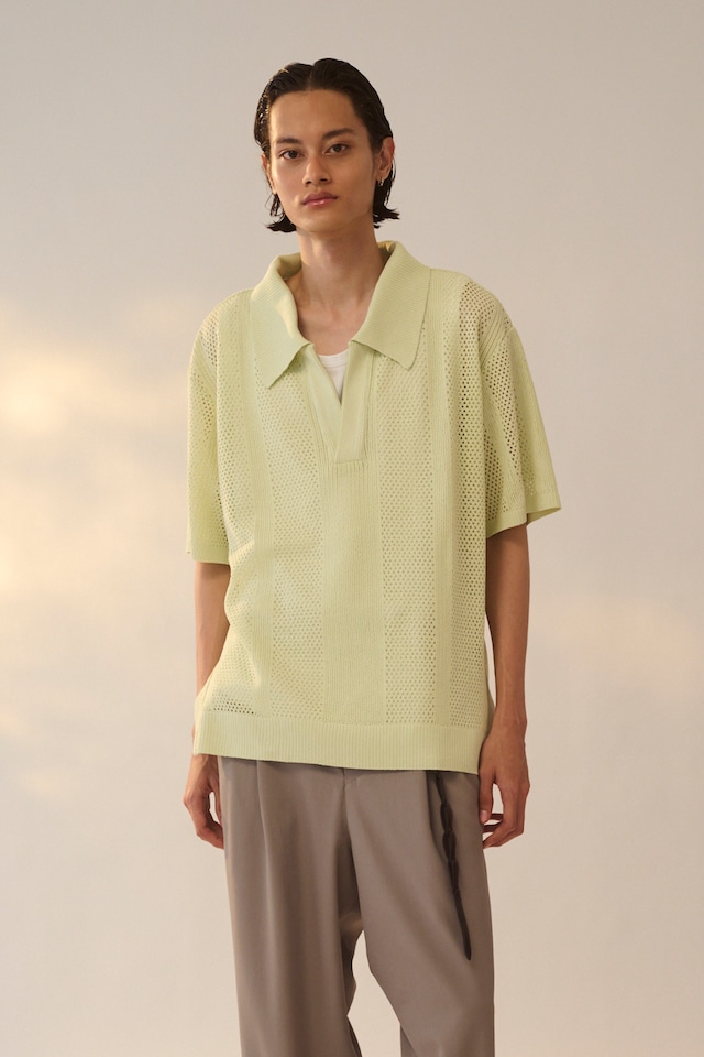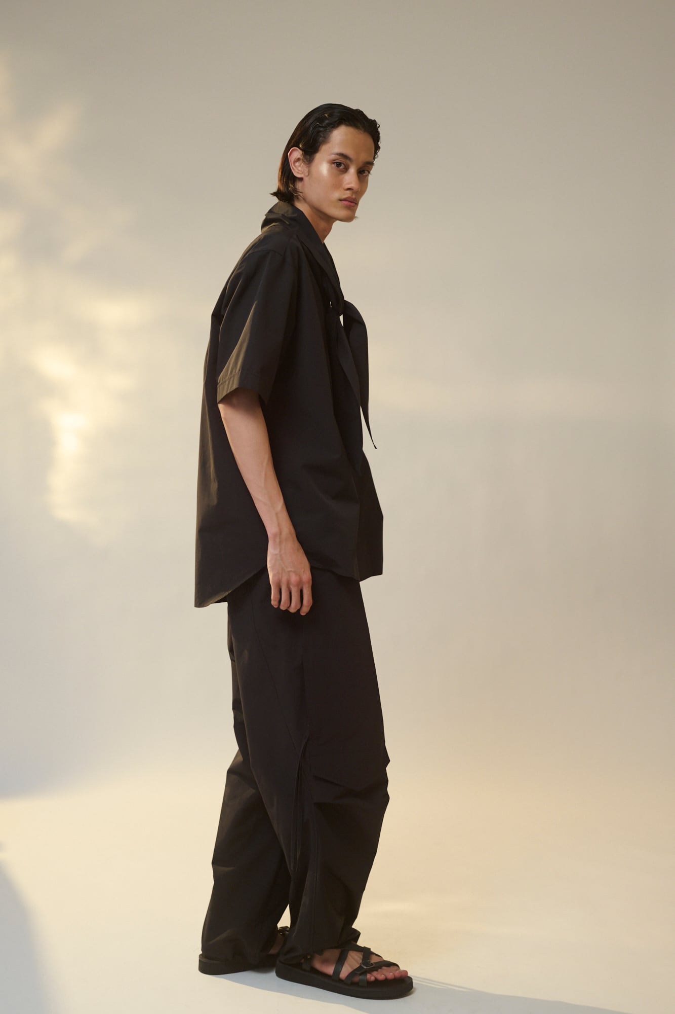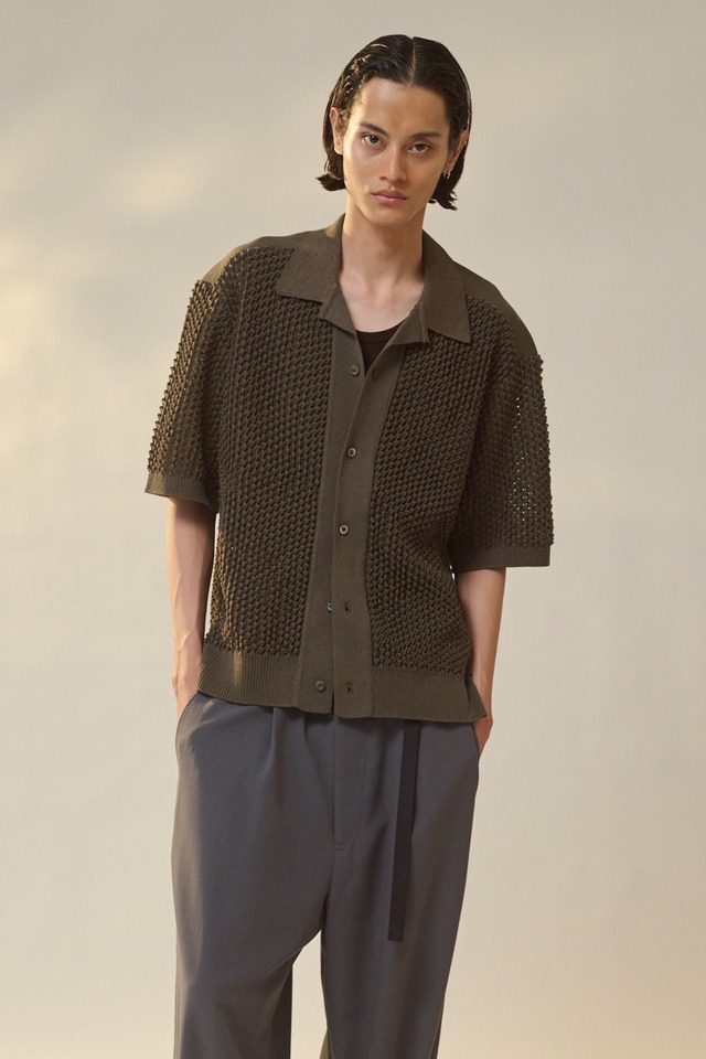 ⾸元を少し深めに設定し、スカーフの⽴体的なドレープは端正で柔らかい雰囲気のあるスタイルに仕上がっています。