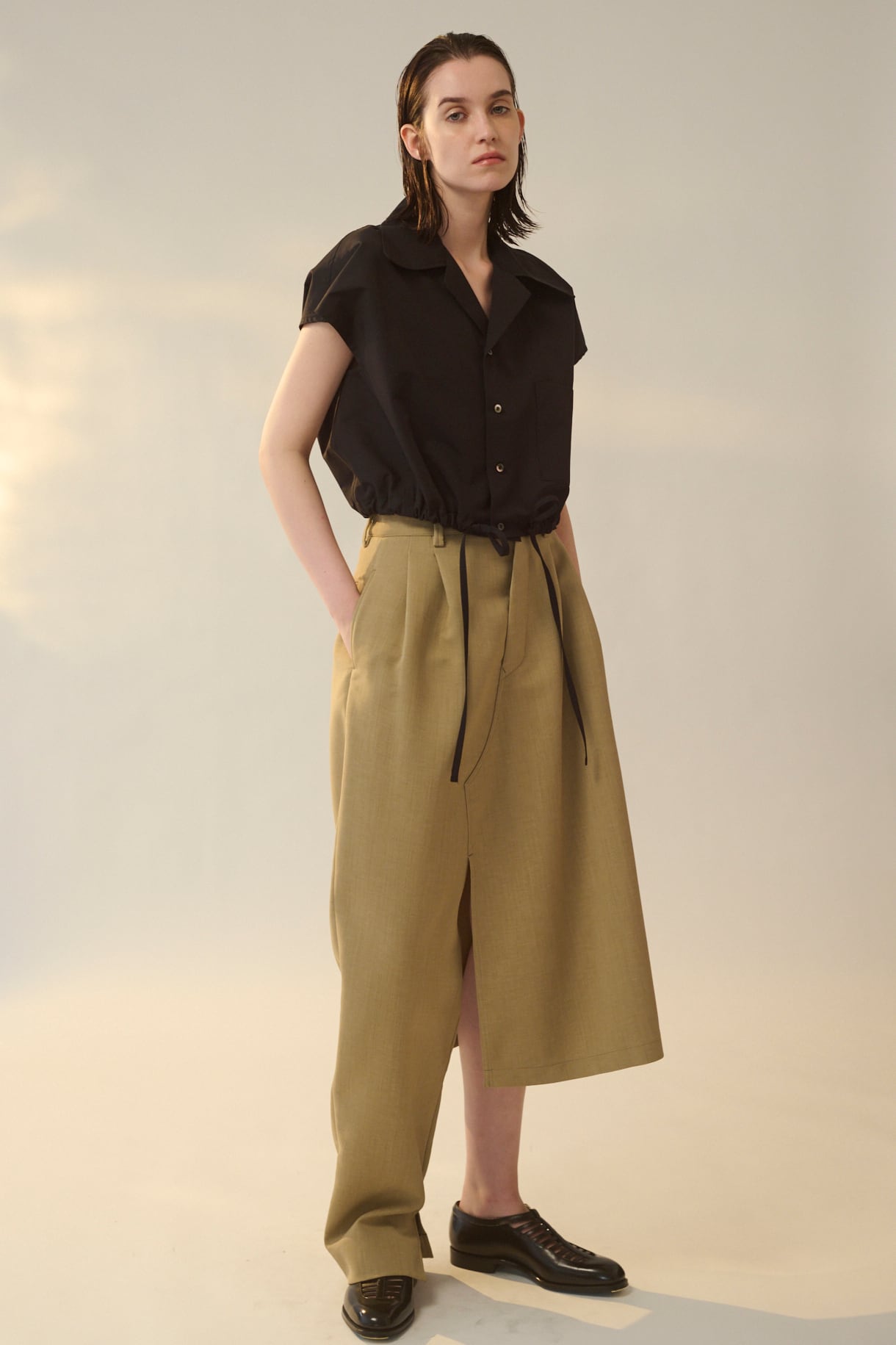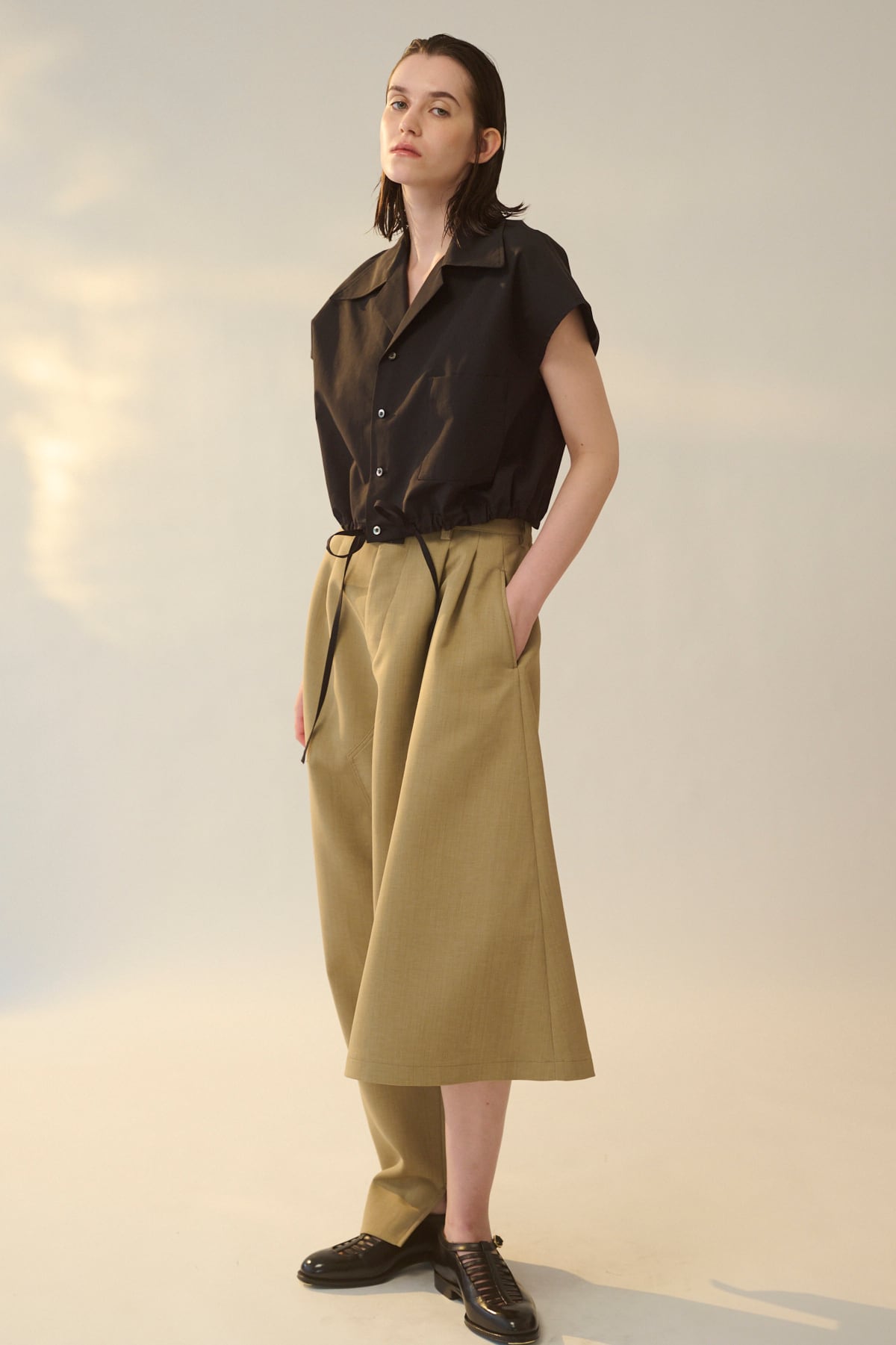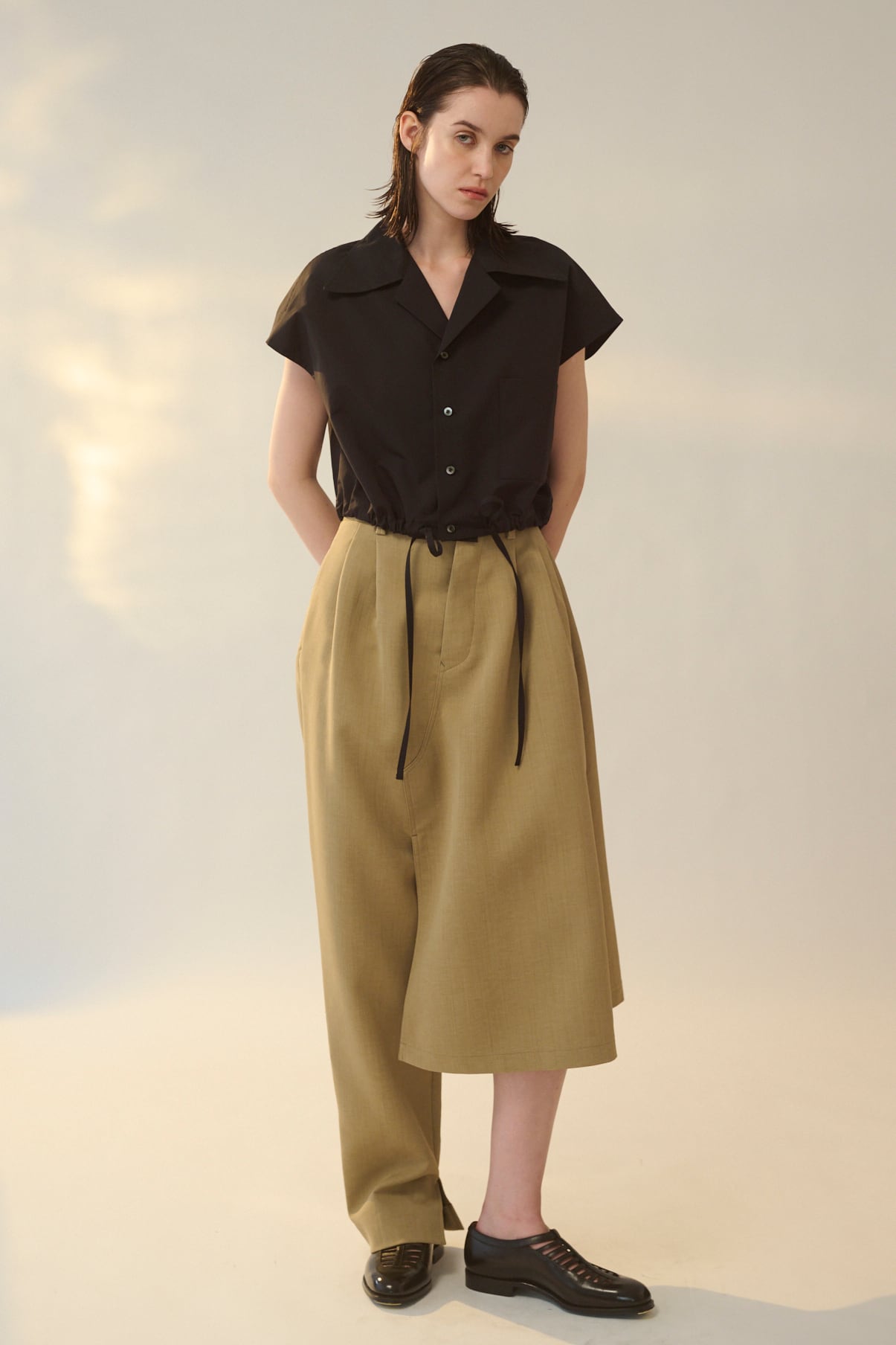 コンパクトなシルエットに大きい衿が特徴のオープンカラーシャツです。ギャザーを寄せたウエストから垂れるドローコードがアクセントになっています。