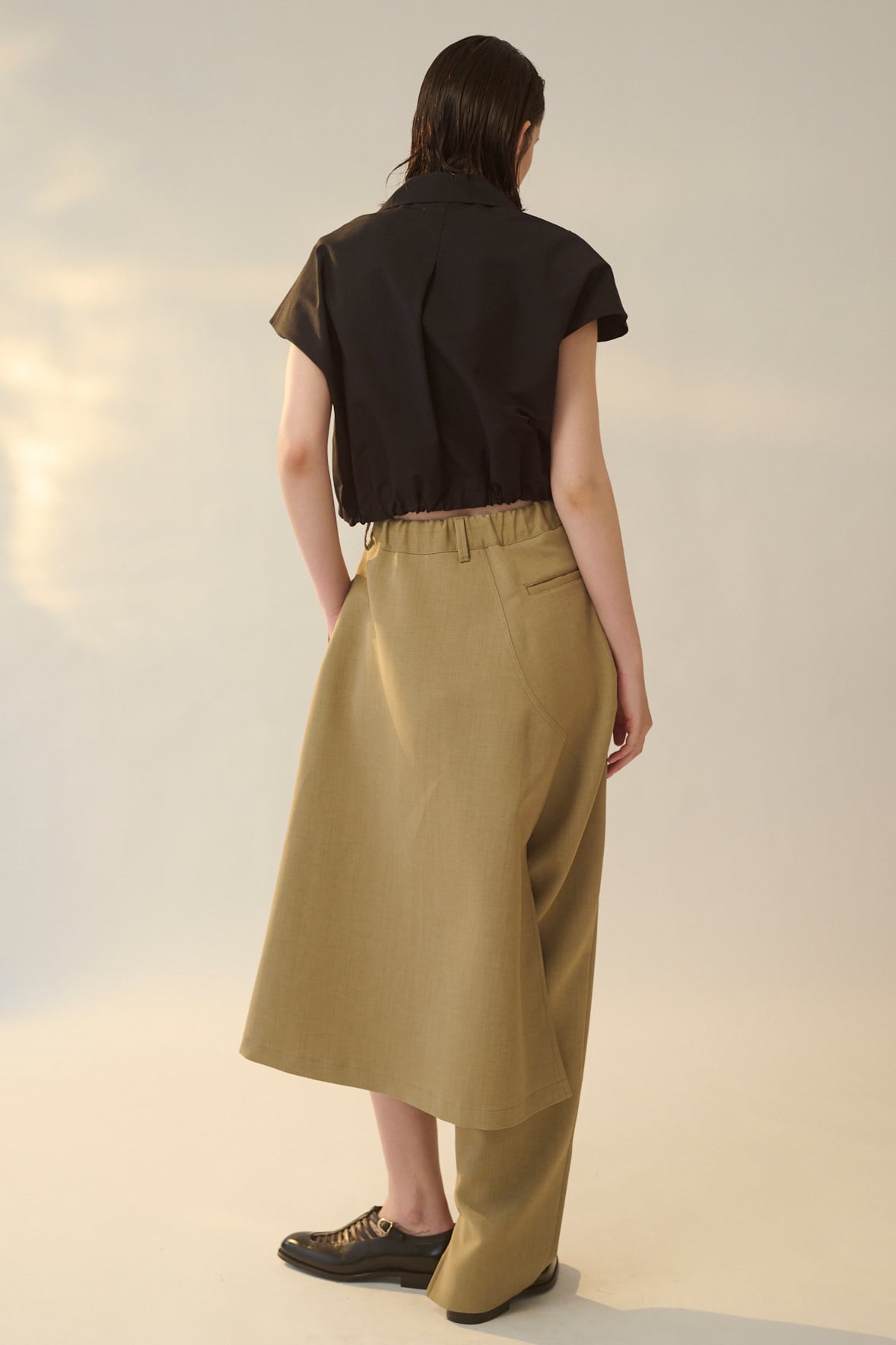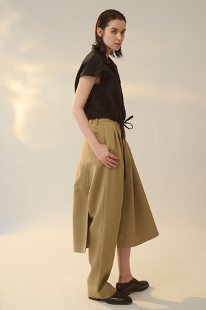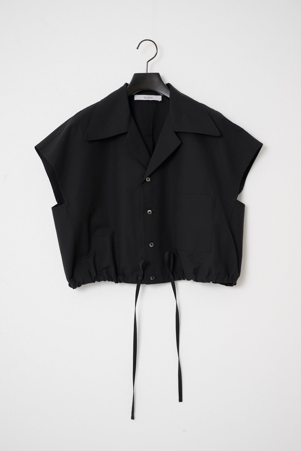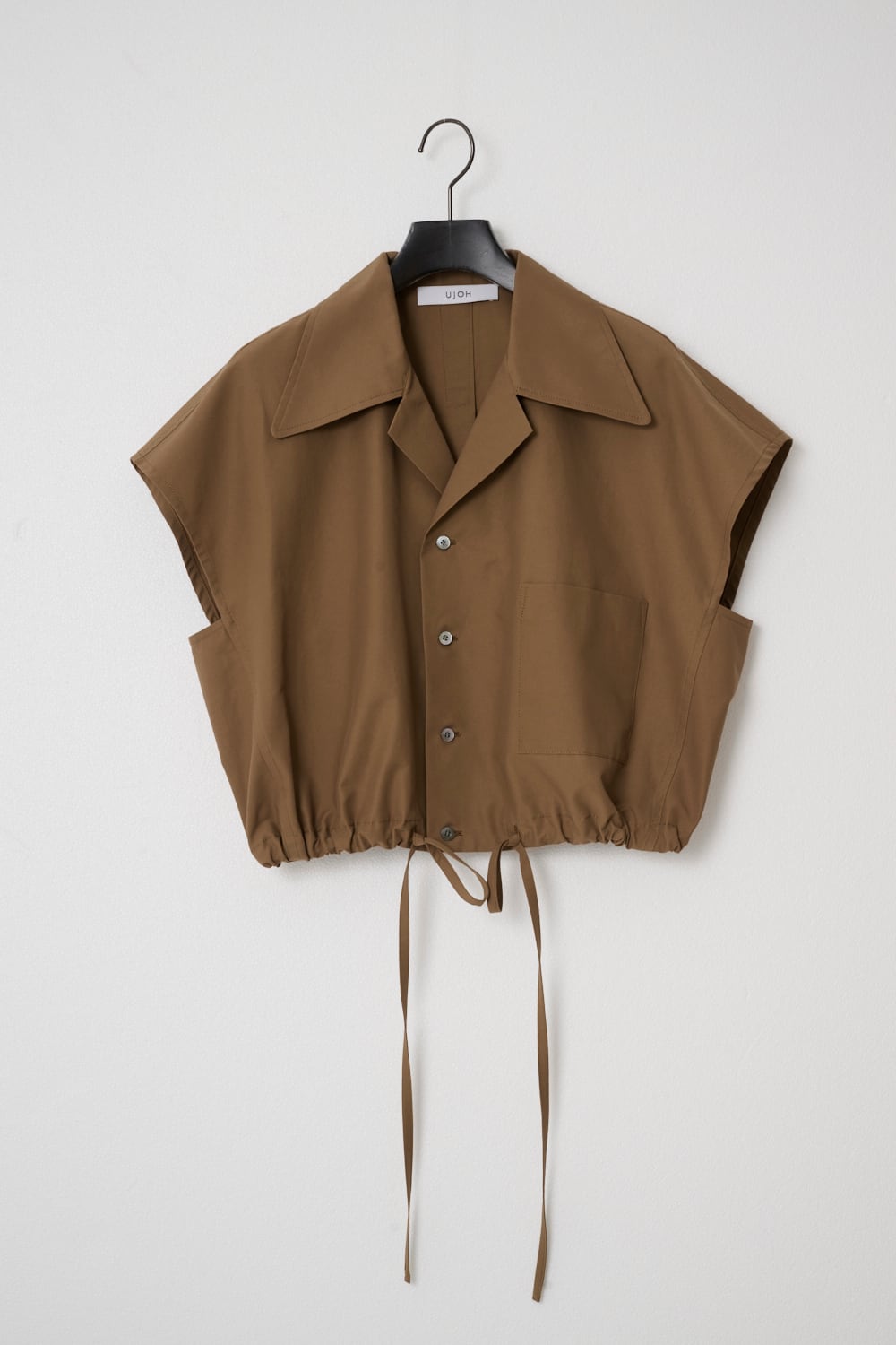 コンパクトなシルエットに大きい衿が特徴のオープンカラーシャツです。ギャザーを寄せたウエストから垂れるドローコードがアクセントになっています。