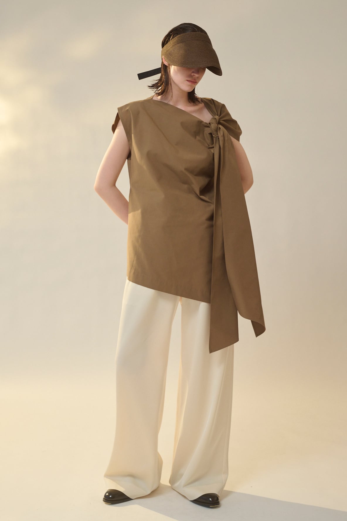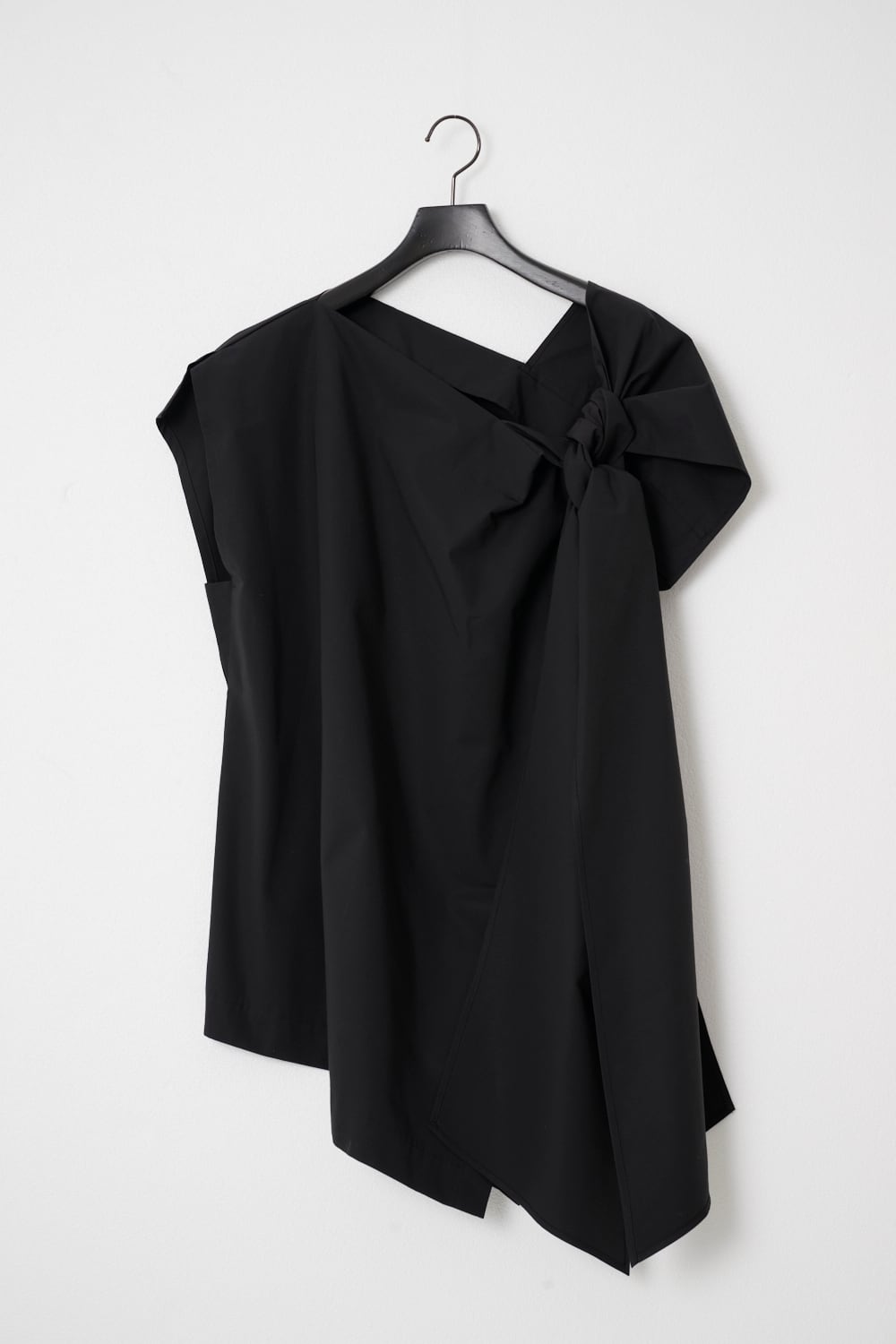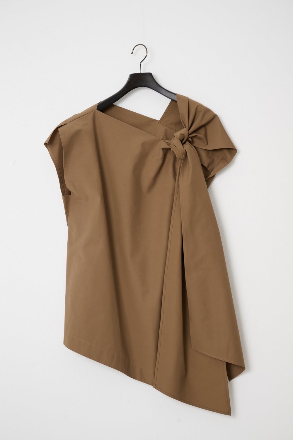 身頃から続くリボンを肩で結んで着るアシンメトリーのブラウスです。スクエアにカットした裾や直線的なネックラインがシャープな印象です。スタイリングの主役になる1枚です。