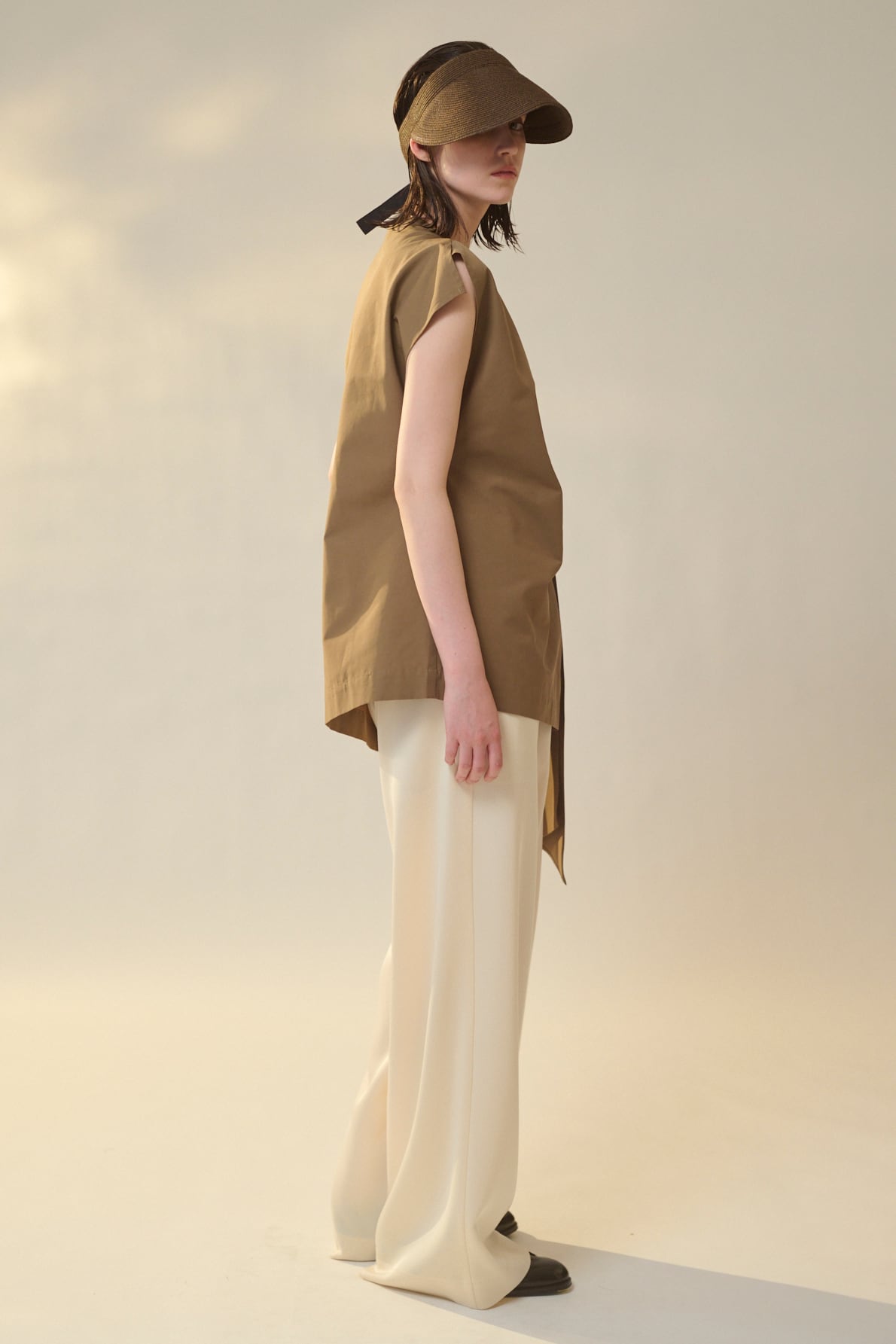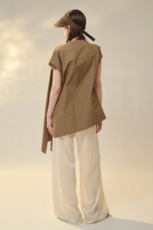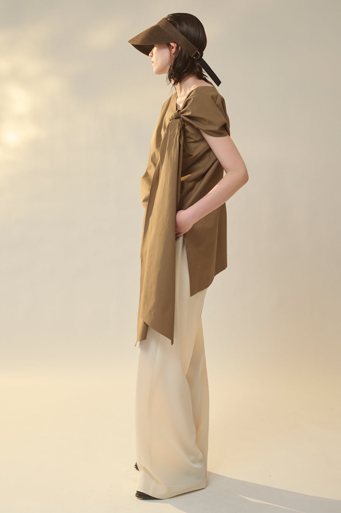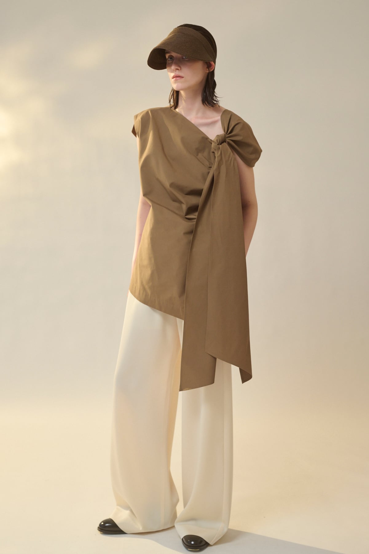 身頃から続くリボンを肩で結んで着るアシンメトリーのブラウスです。スクエアにカットした裾や直線的なネックラインがシャープな印象です。スタイリングの主役になる1枚です。