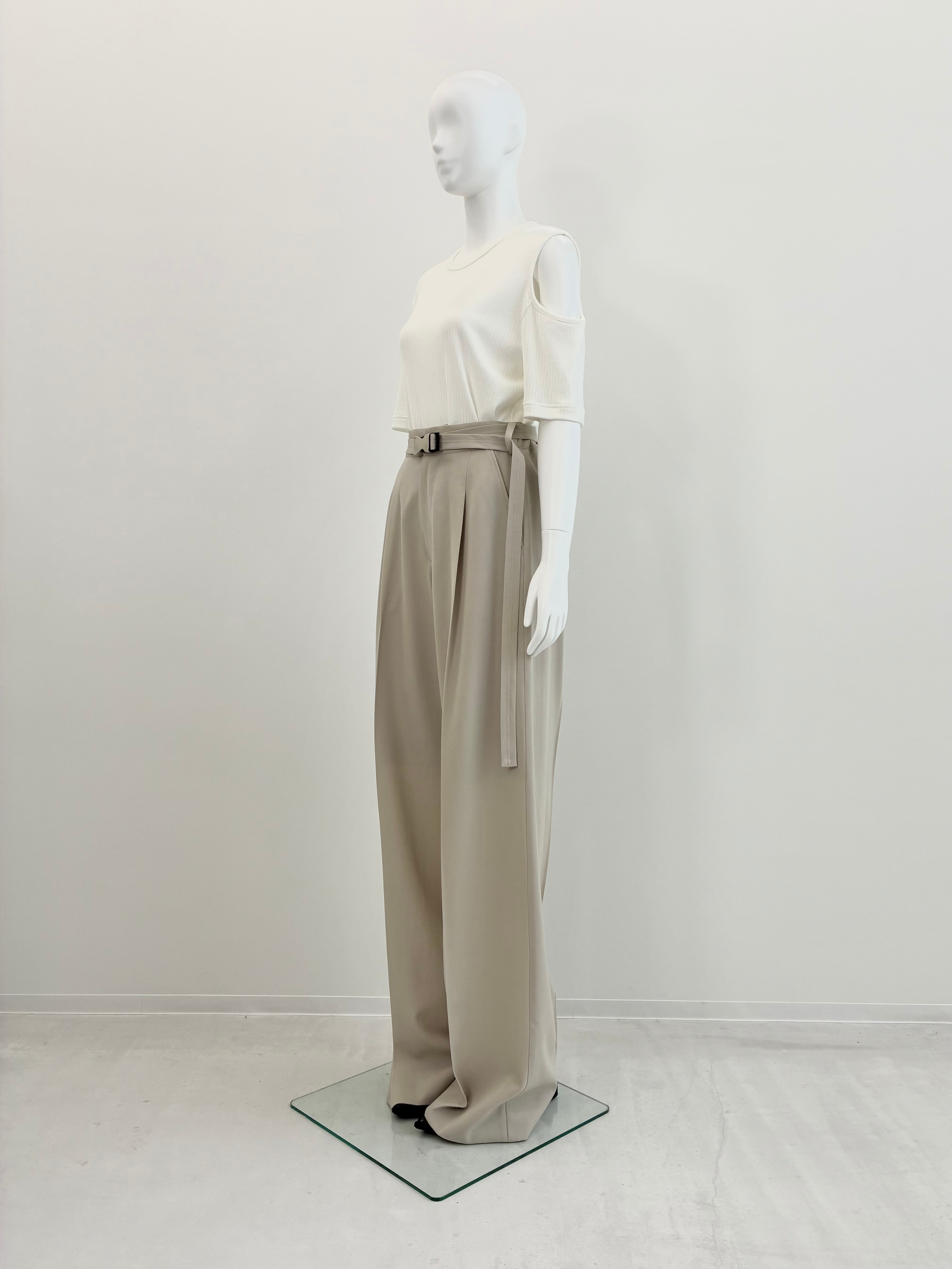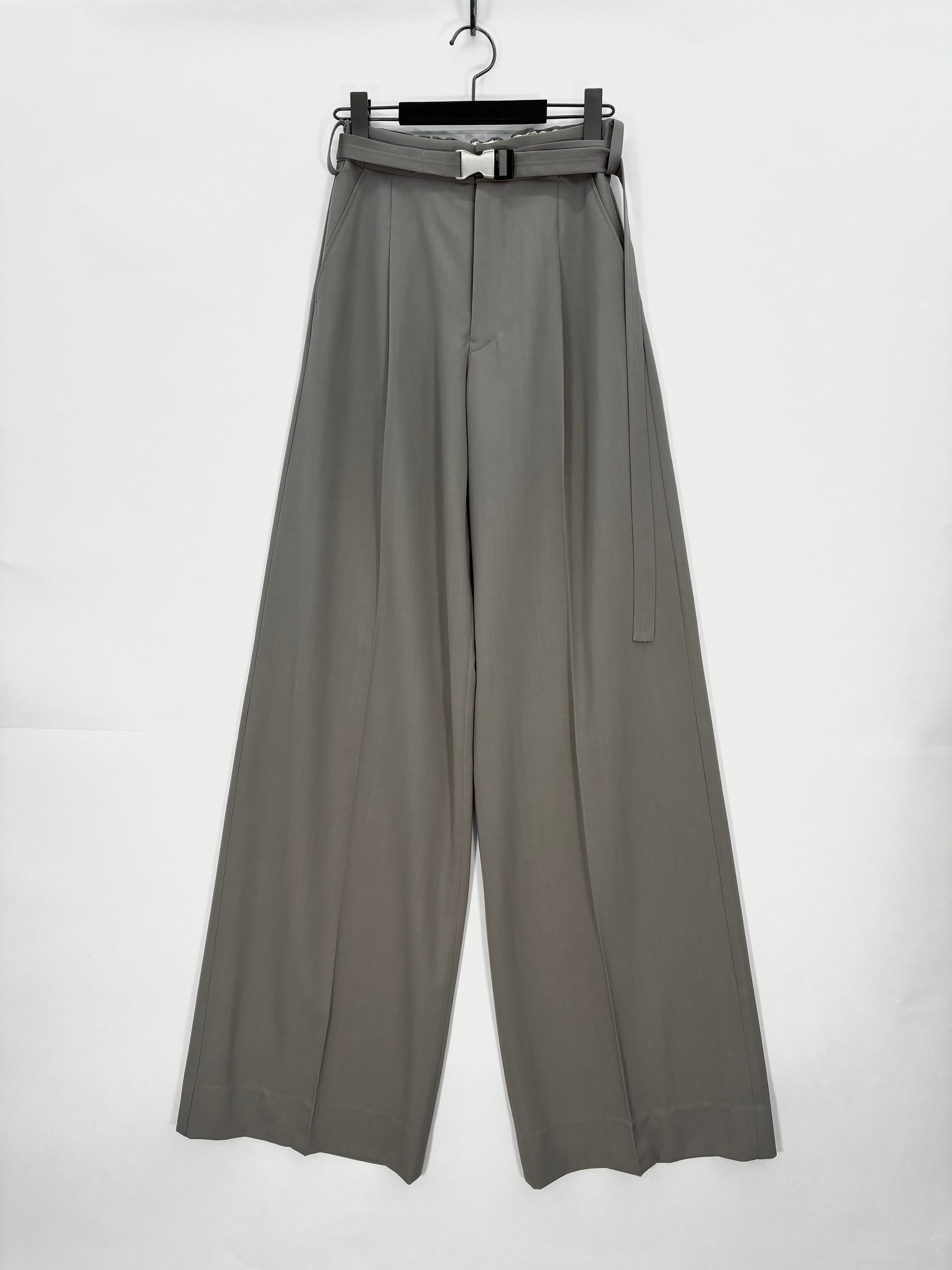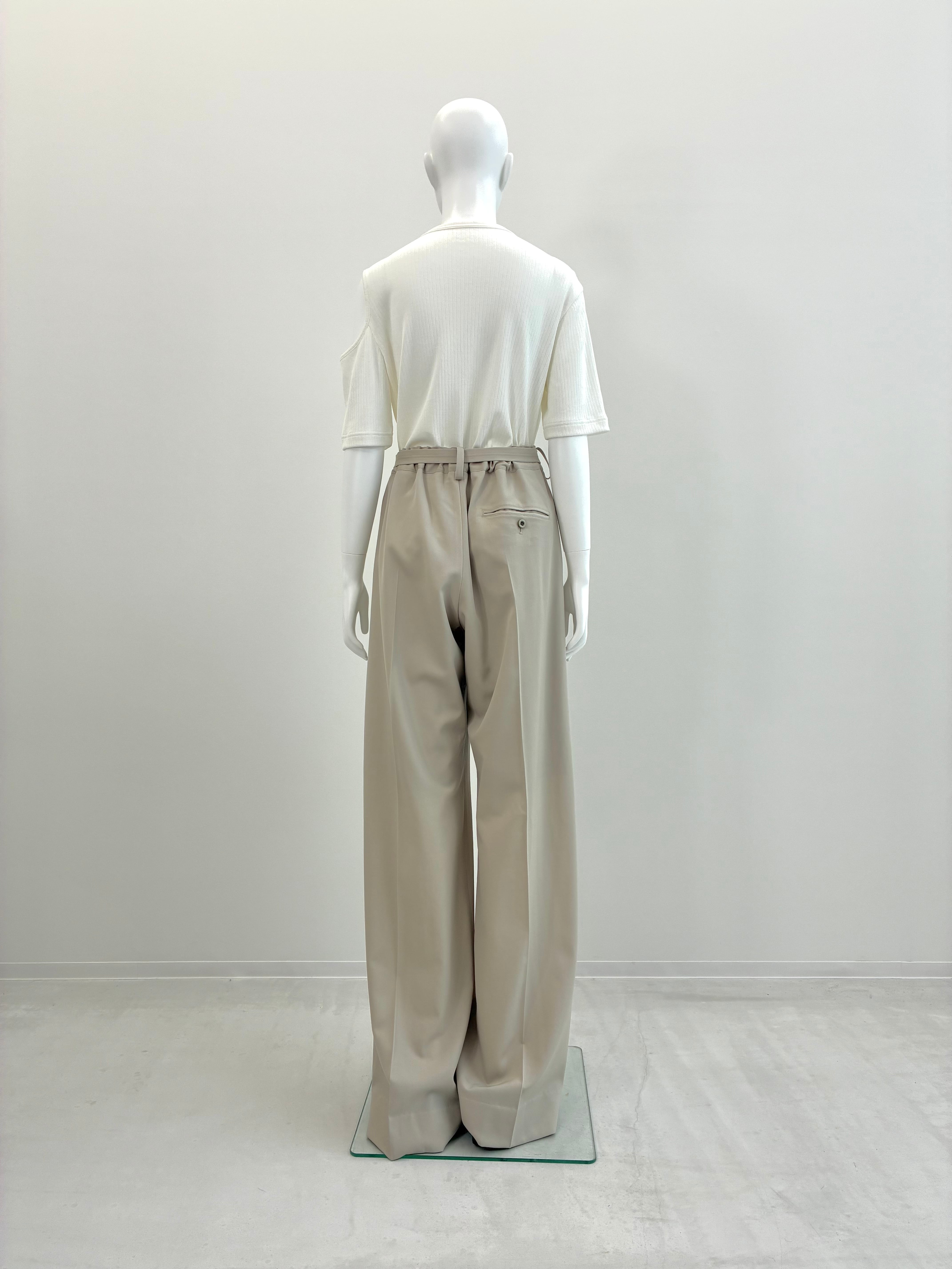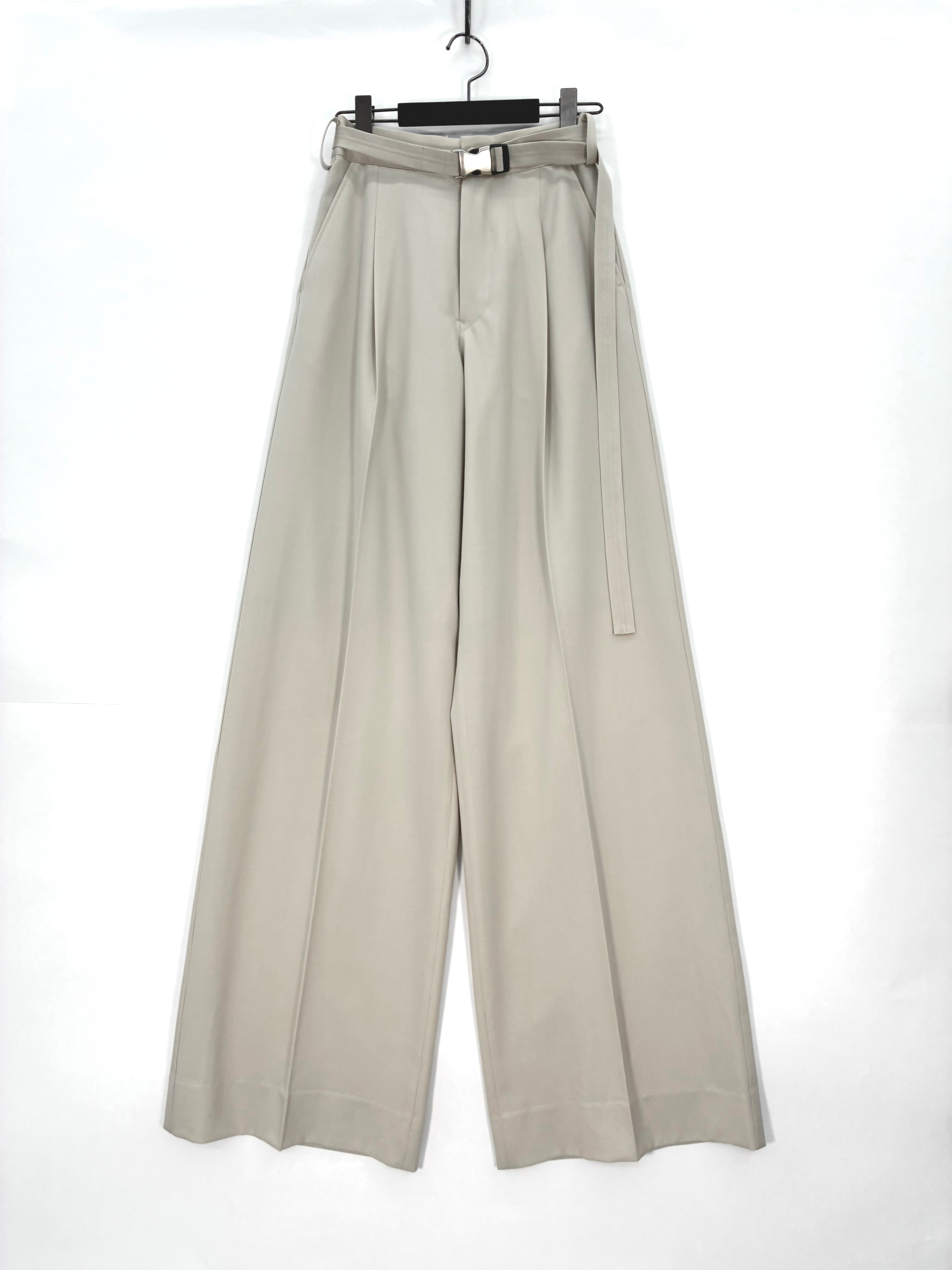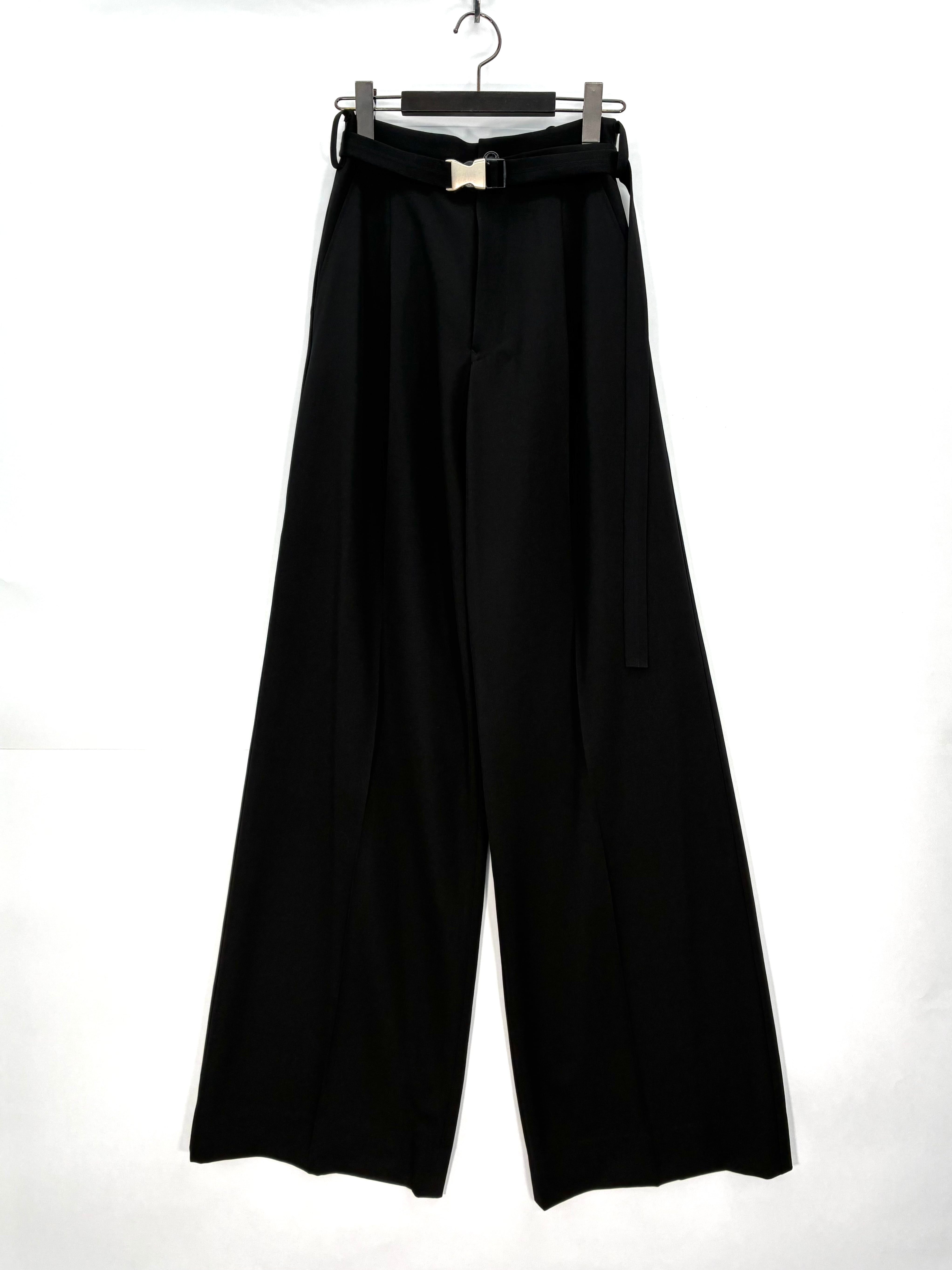 ボリュームがありエレガントなスタイリングの中に、スポーティなベルトをアクセントとして使用したワイドパンツです。ウエスト後ろはゴム仕様になっています。