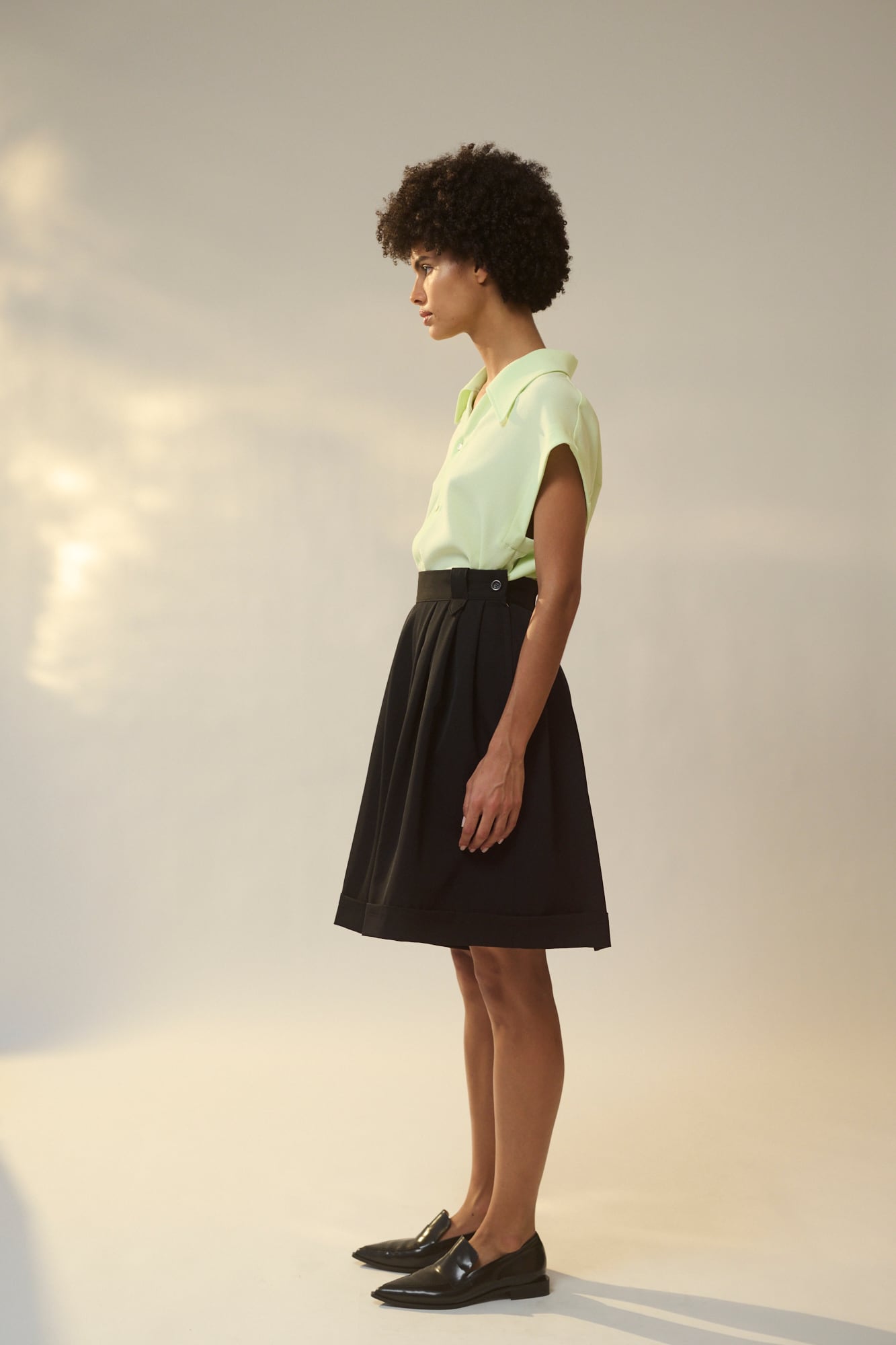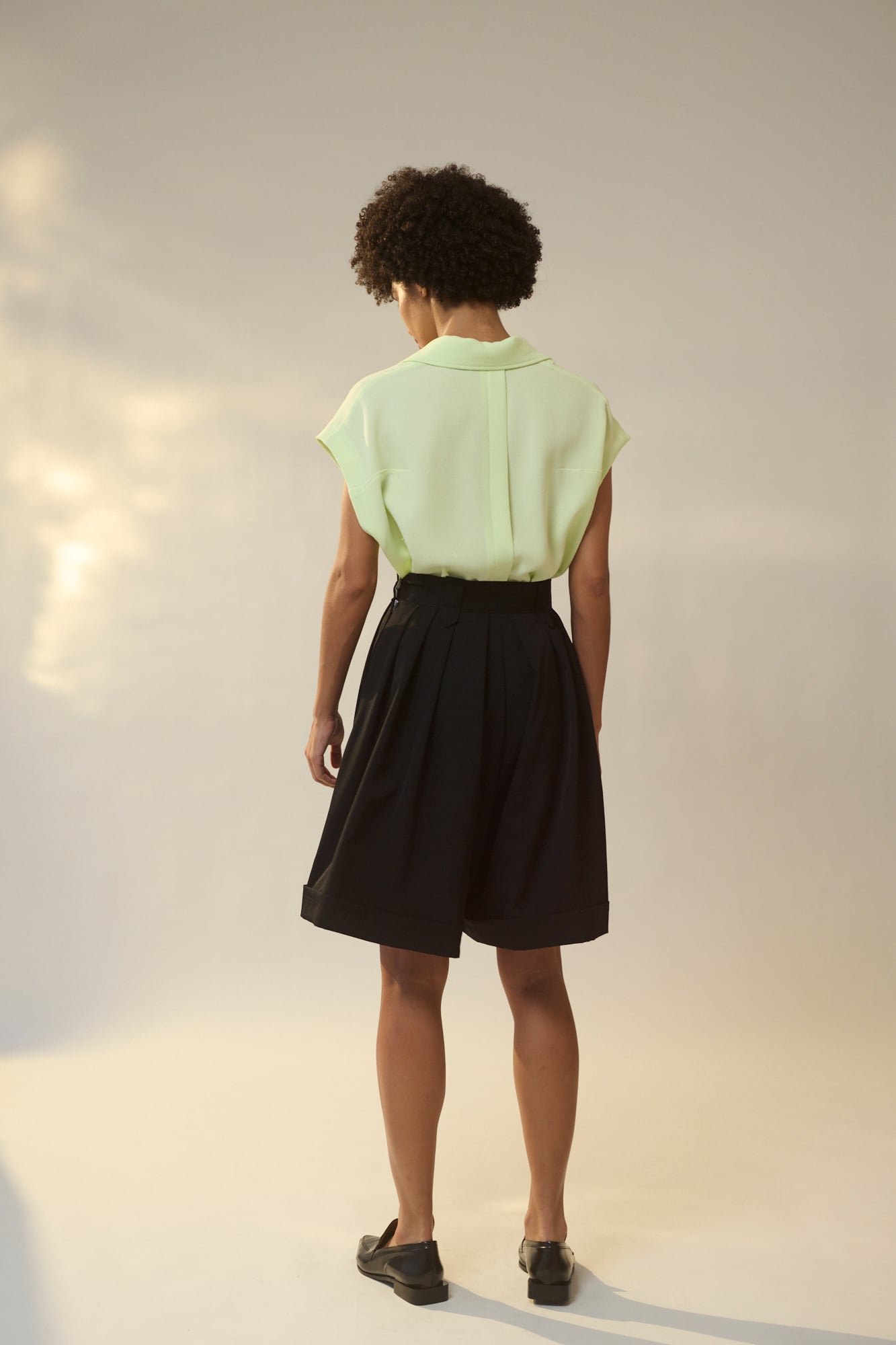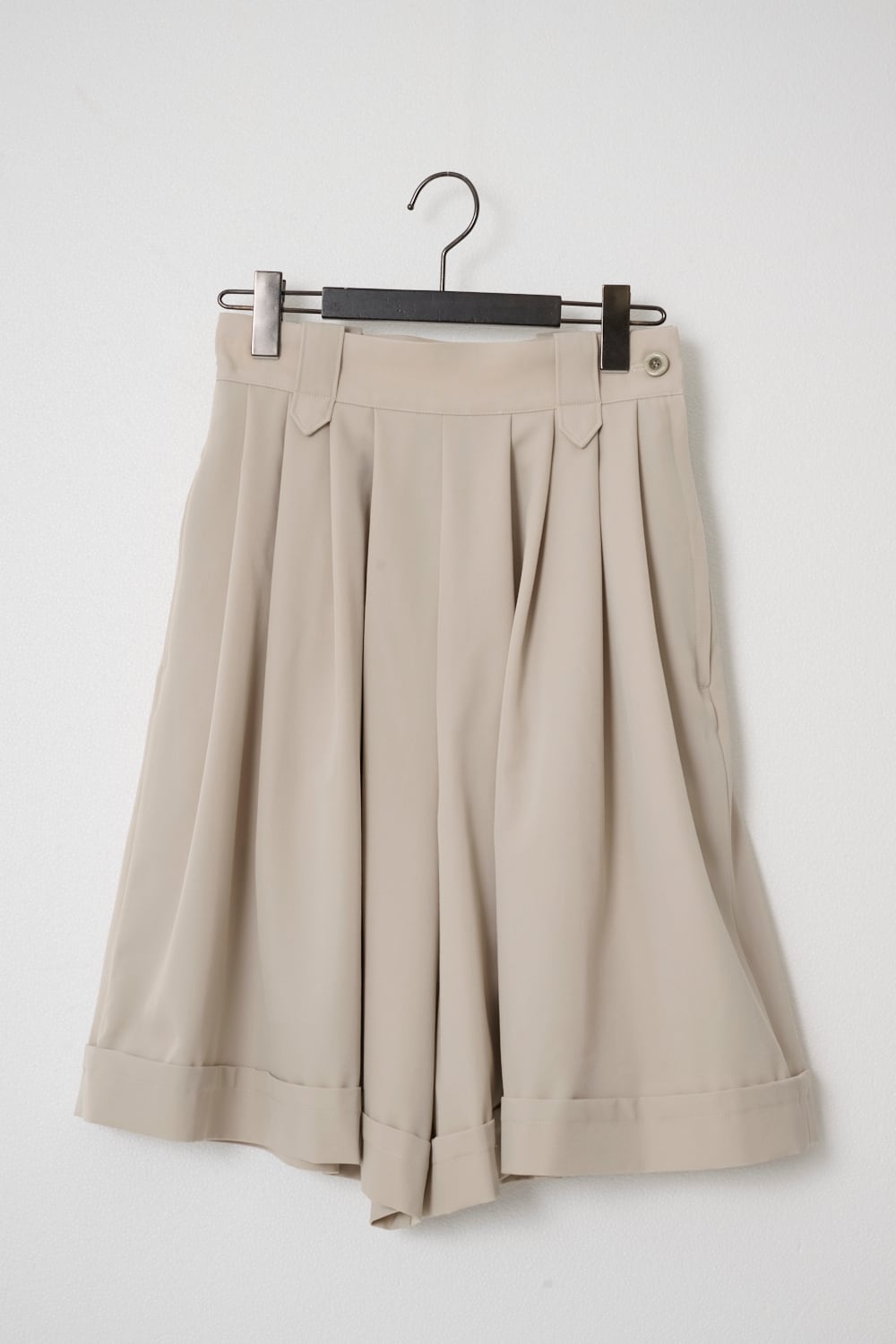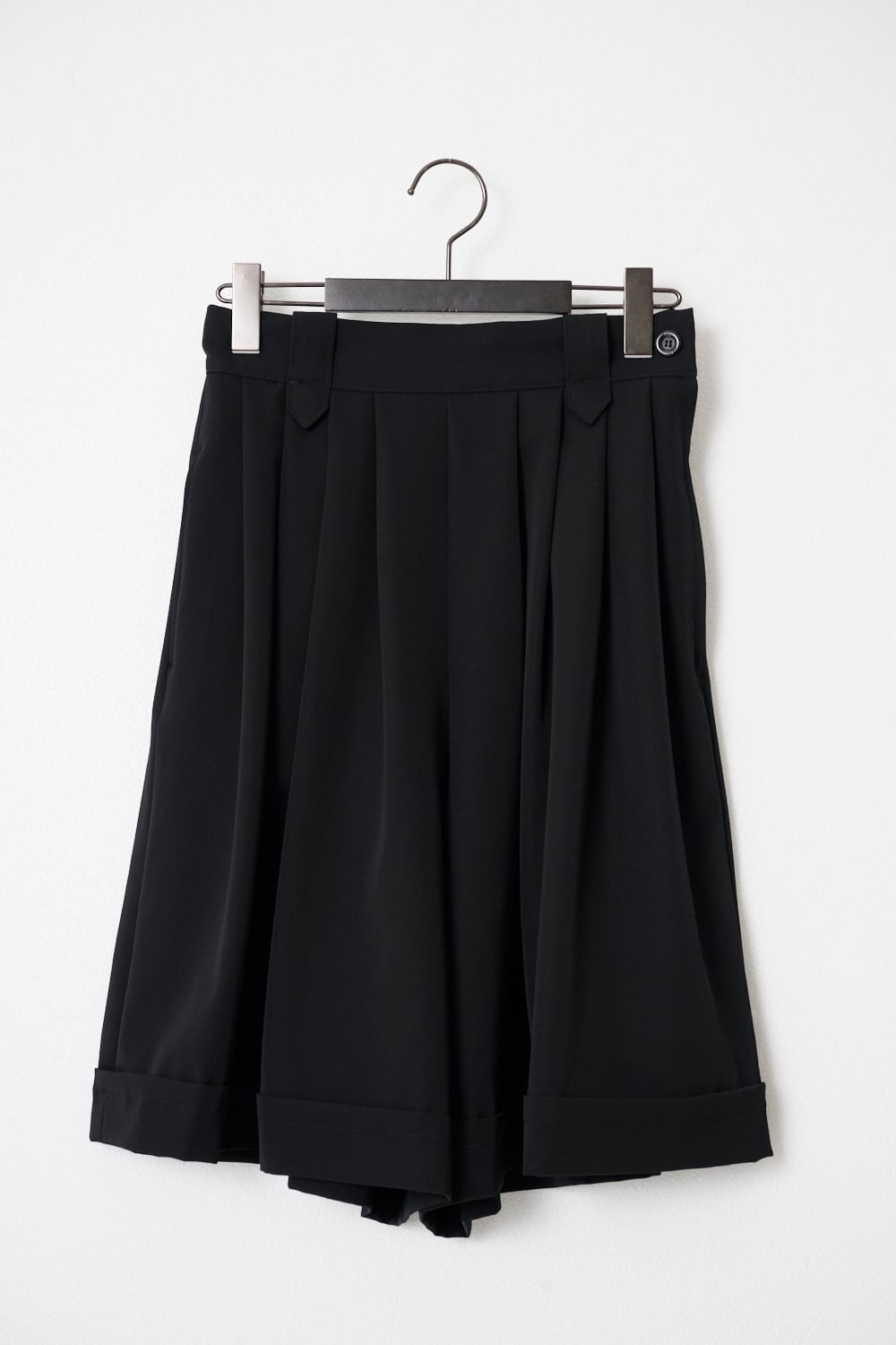 前後に施したたっぷりのタックから広がる立体的なボリュームが特徴のキュロットパンツです。デザイン性のあるベルトループと裾のマッキン仕立てがアクセントになりモードな印象に仕上がっています。