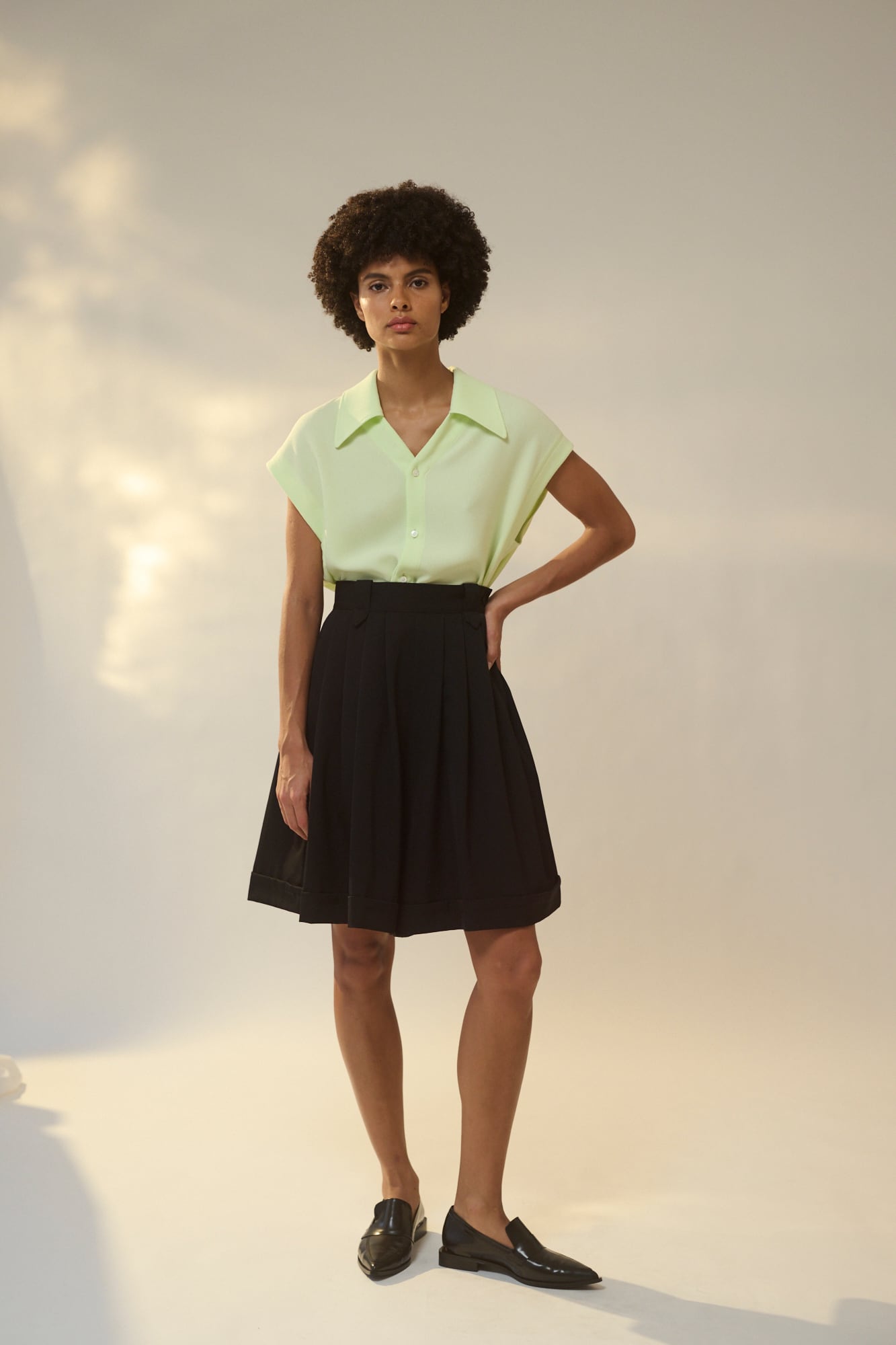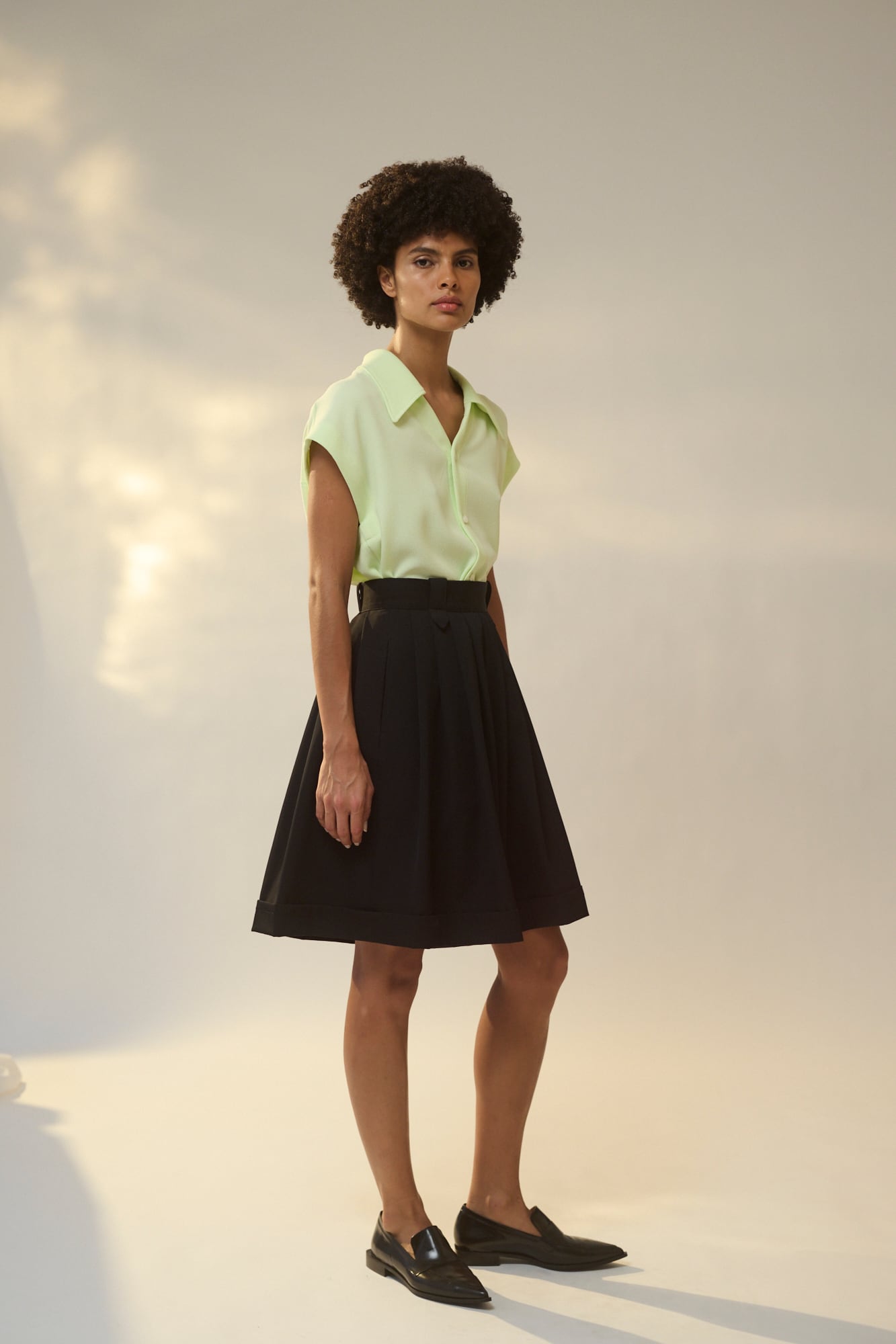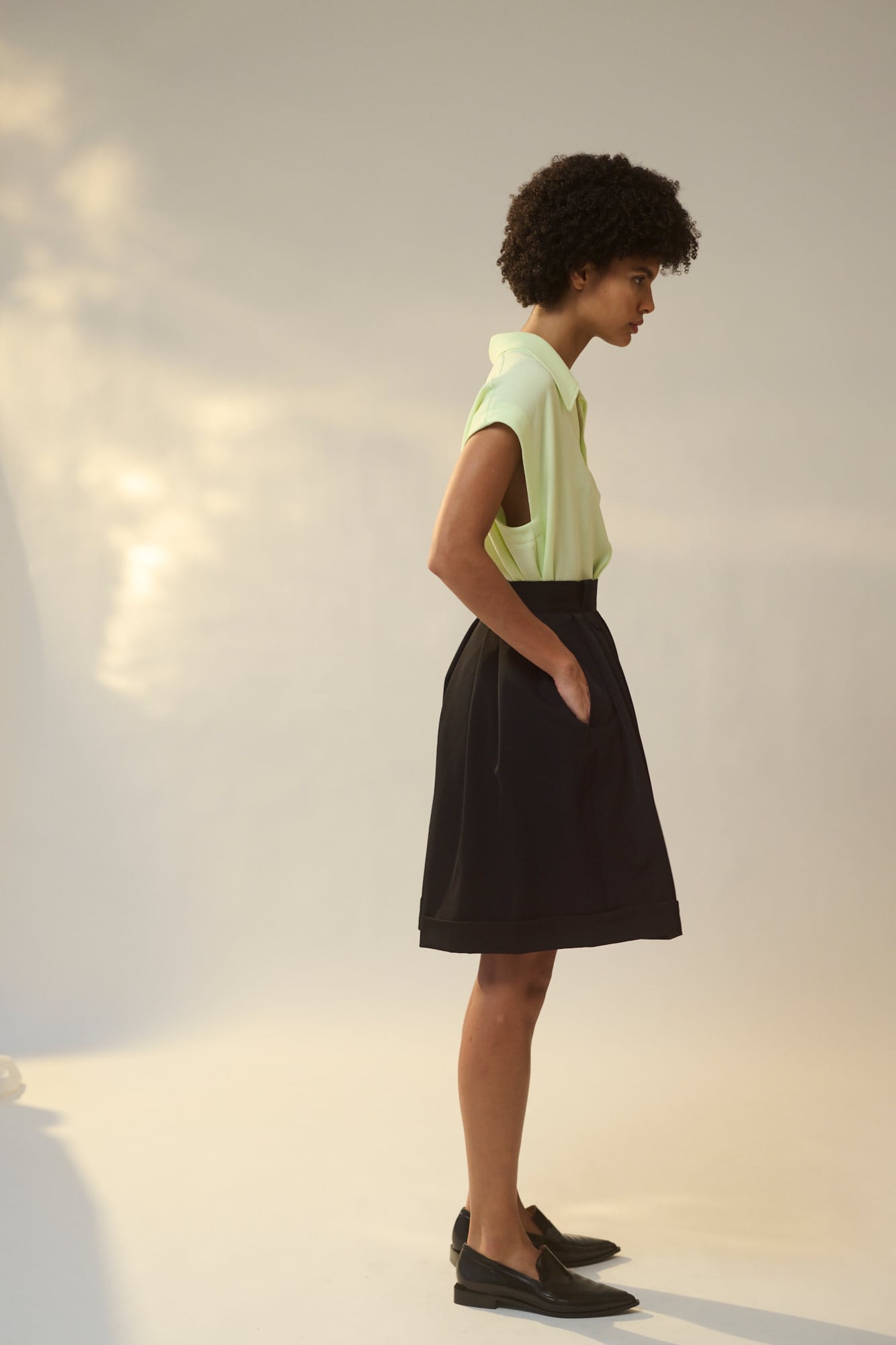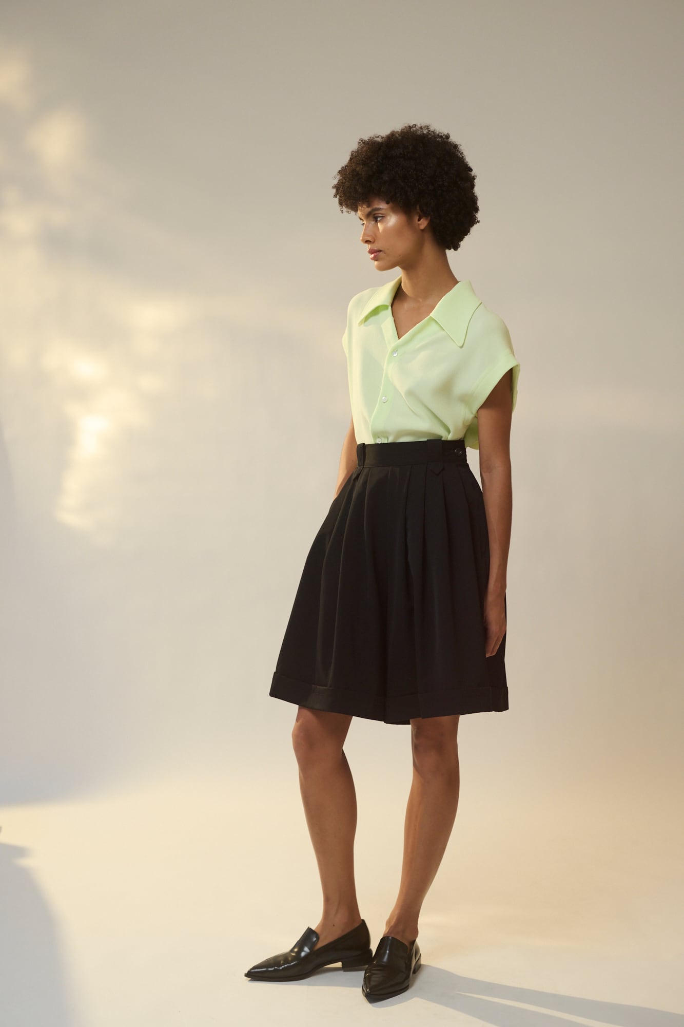前後に施したたっぷりのタックから広がる立体的なボリュームが特徴のキュロットパンツです。デザイン性のあるベルトループと裾のマッキン仕立てがアクセントになりモードな印象に仕上がっています。