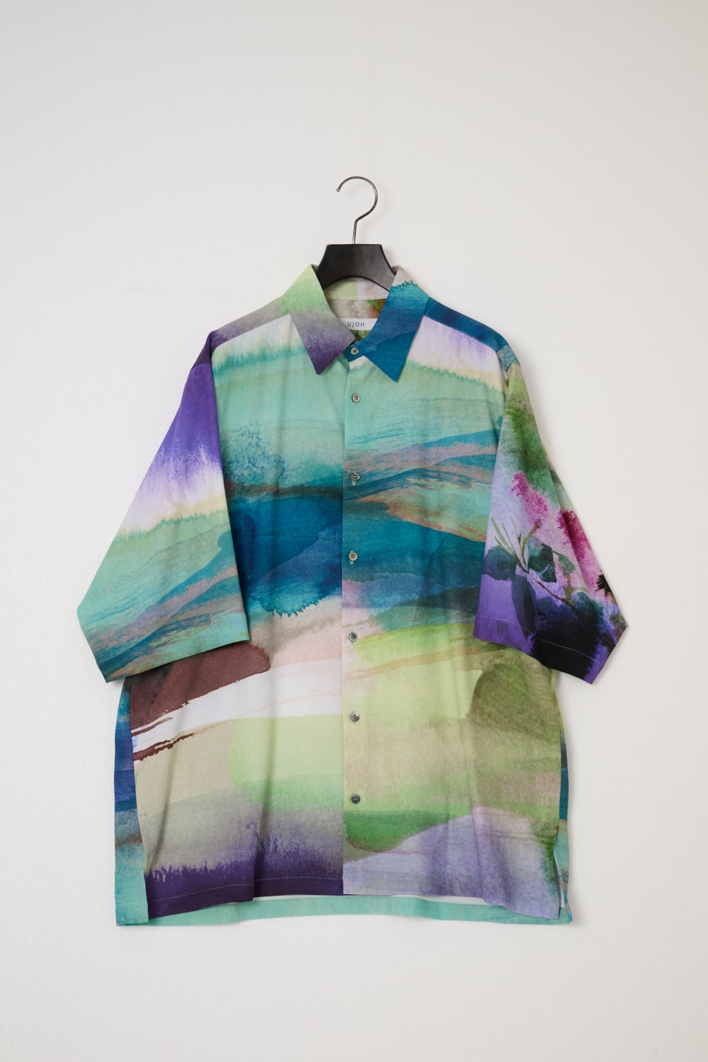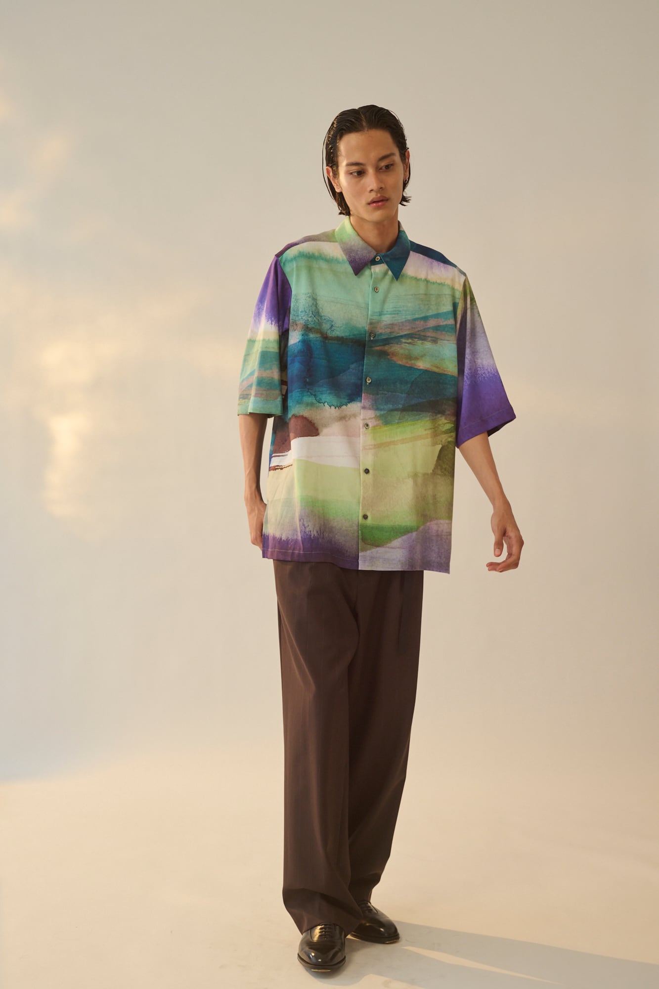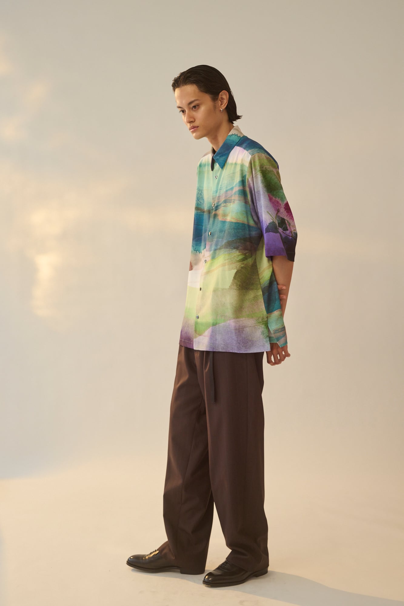ジョーゼット生地にプリントを施した素材です。記憶の中に残る、静かに揺れる砂地の浜辺や日陰をつくる海浜植物の景色を、大胆かつグラフィカルに描きました。プリントカラーは、昼日中の光に包まれた明るい海辺と、宵のうちの幻想的な時間帯をイメージしています。軽やかな透け感と柔らかな風合いが、豊かな表情を演出します。
