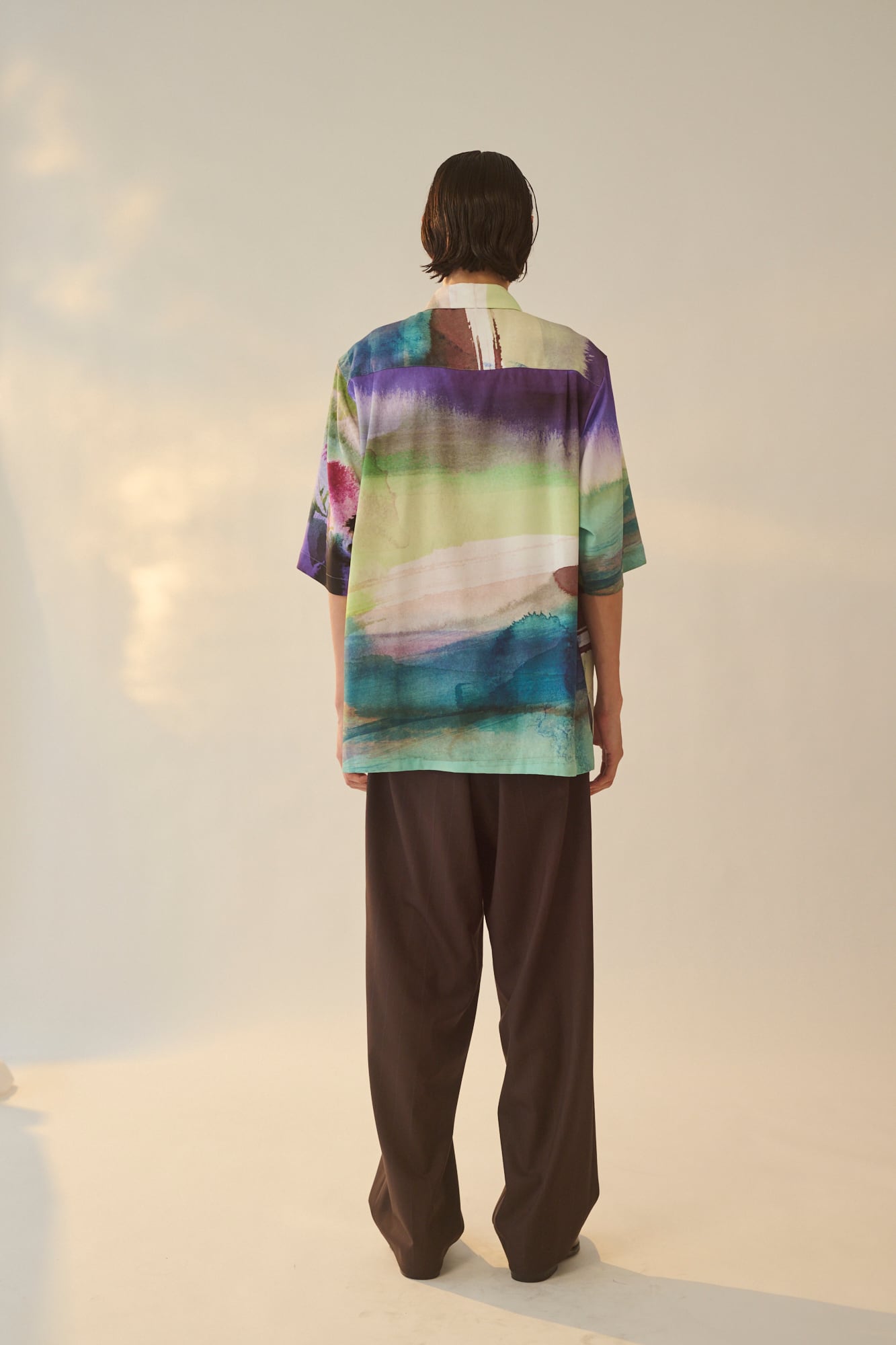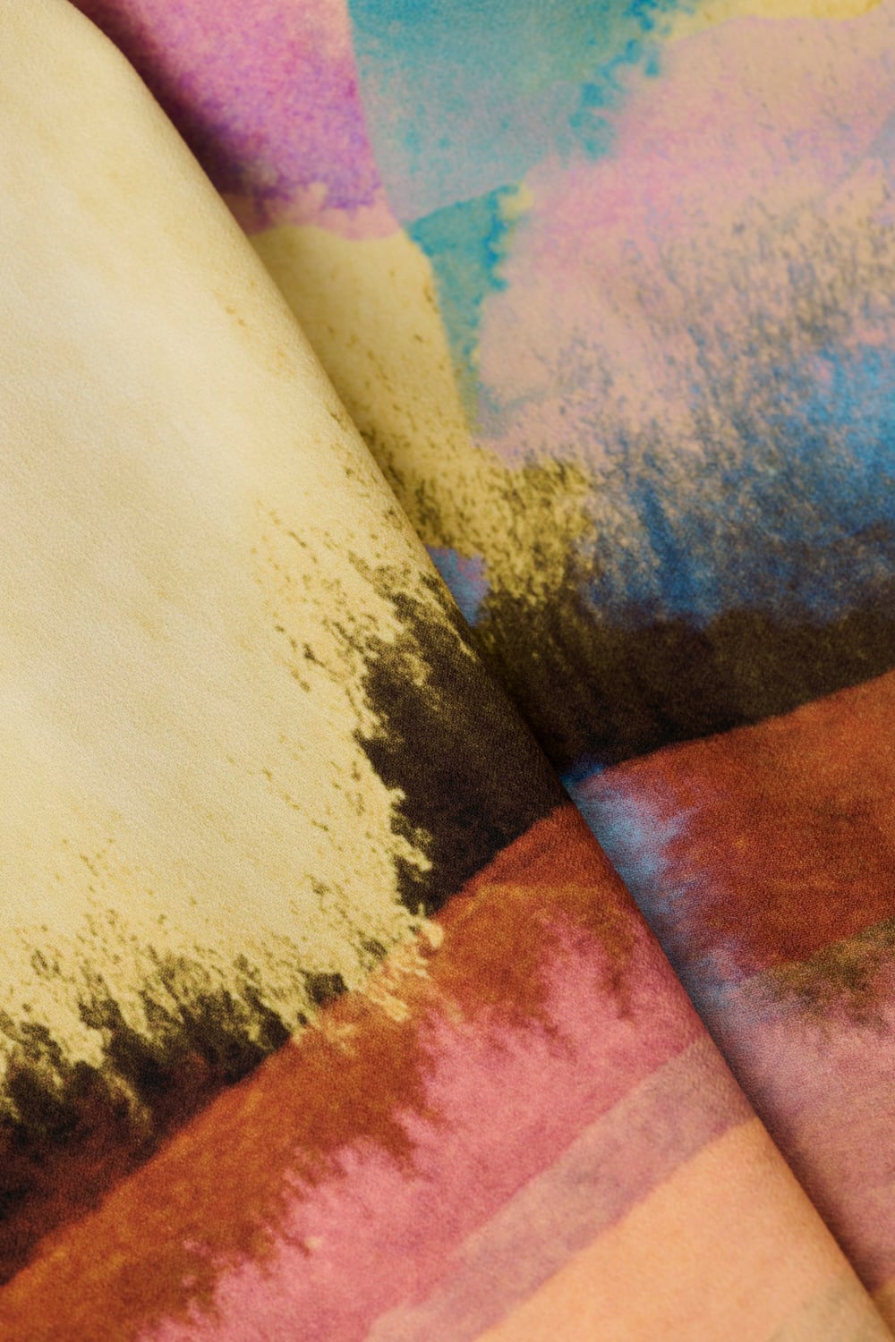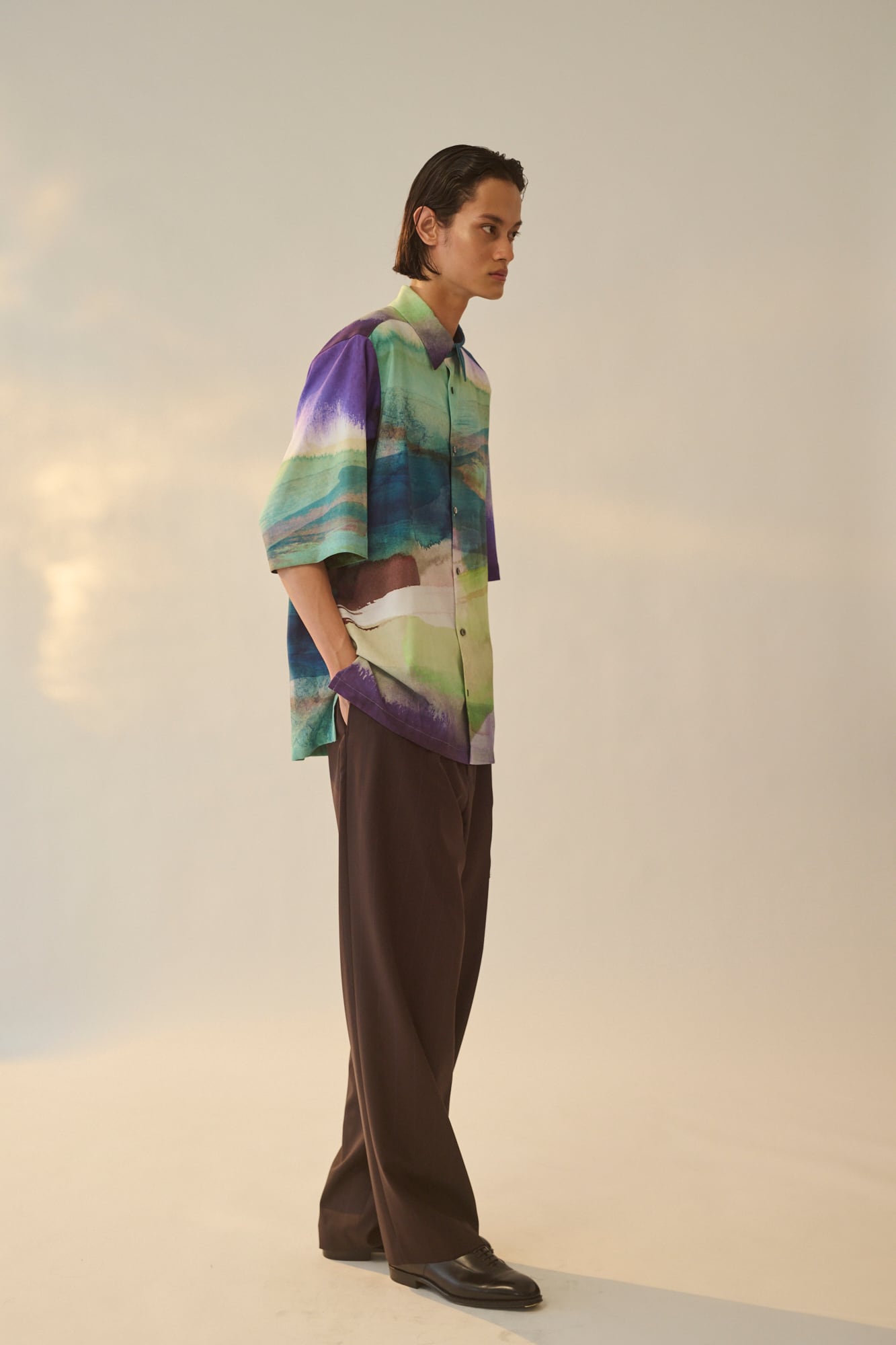 ジョーゼット生地にプリントを施した素材です。記憶の中に残る、静かに揺れる砂地の浜辺や日陰をつくる海浜植物の景色を、大胆かつグラフィカルに描きました。プリントカラーは、昼日中の光に包まれた明るい海辺と、宵のうちの幻想的な時間帯をイメージしています。軽やかな透け感と柔らかな風合いが、豊かな表情を演出します。