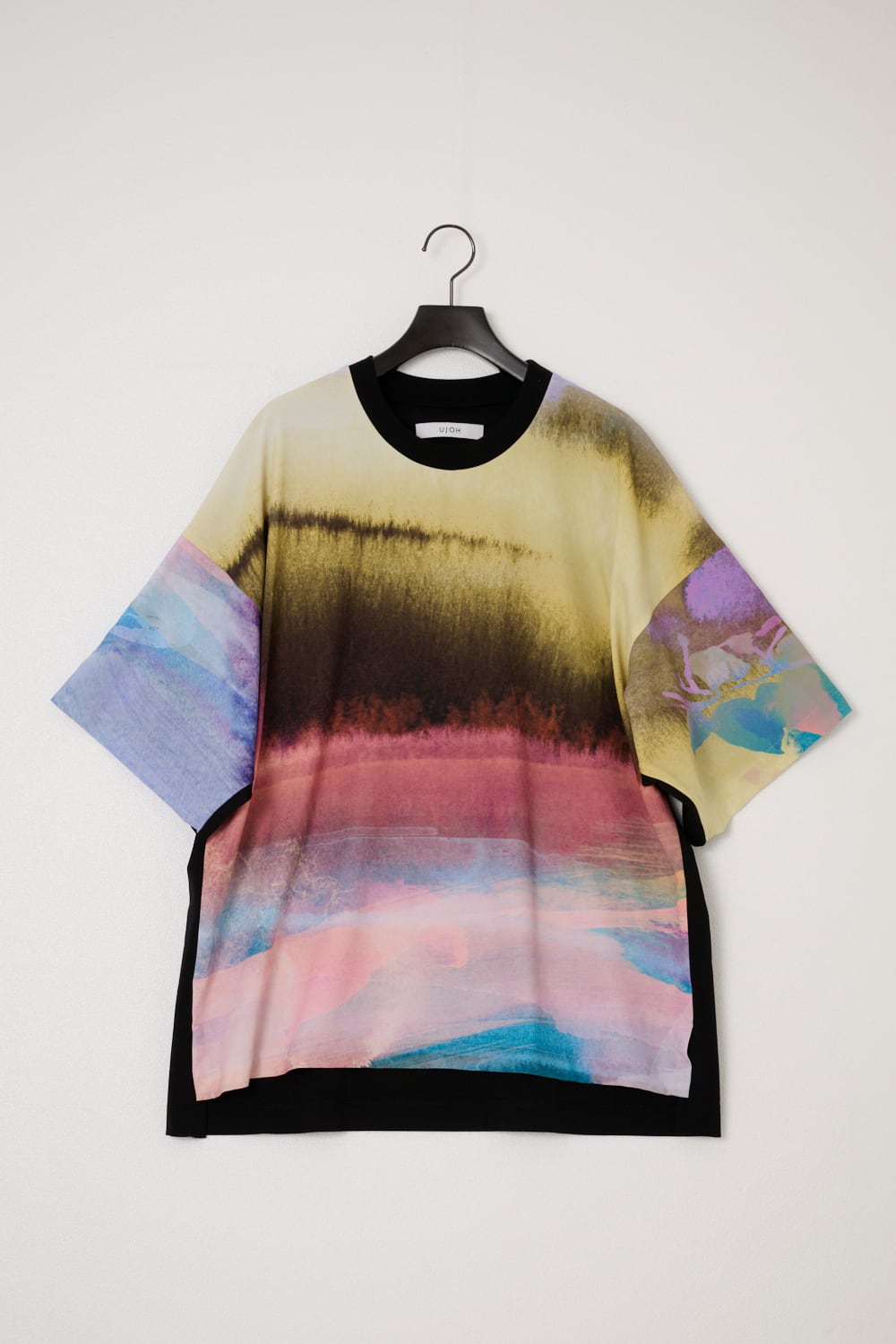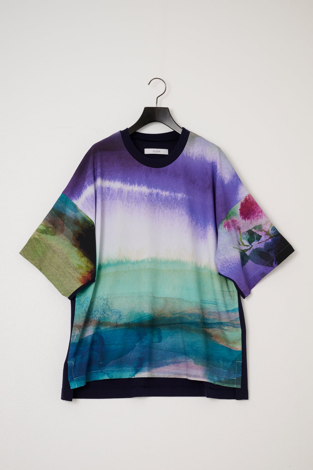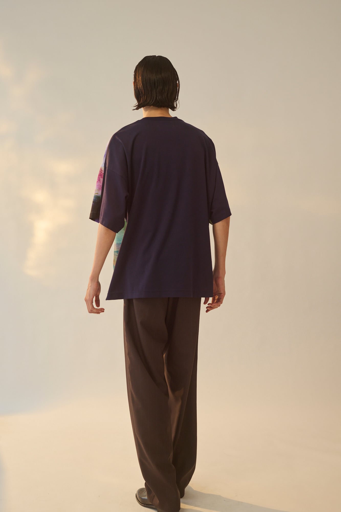 前⾯にプリント⽣地と後ろ⾝頃にモクロディ⽣地を使⽤した異素材組み合わせのプルオーバーです。