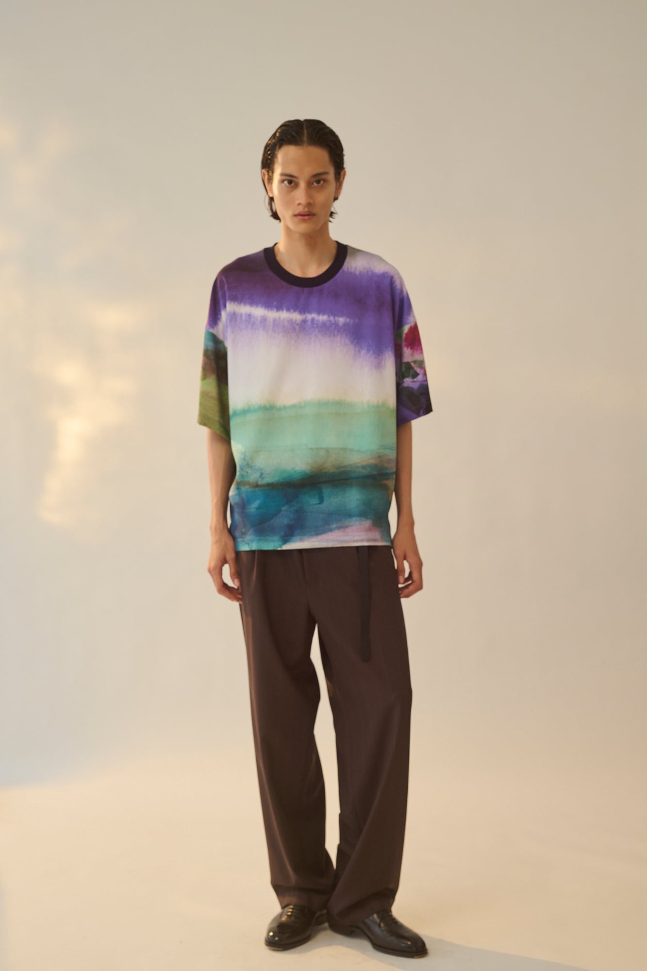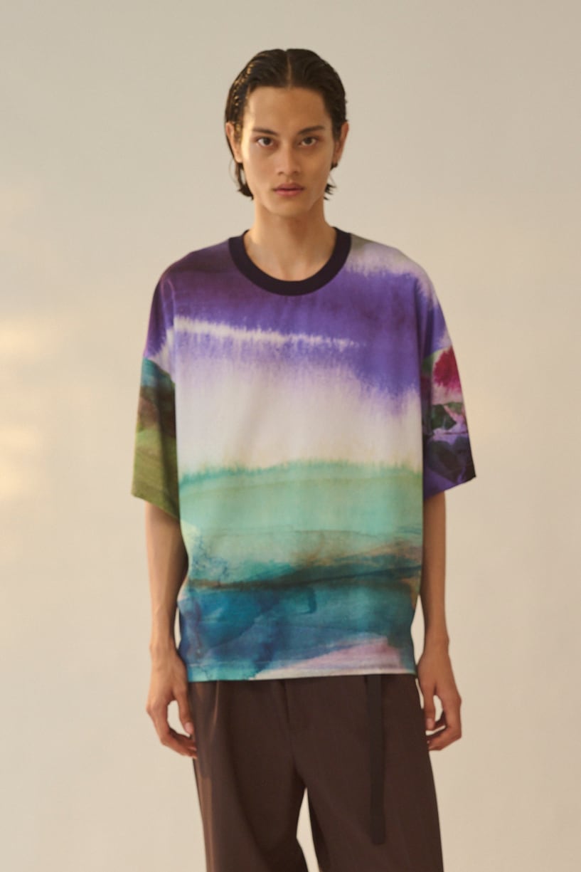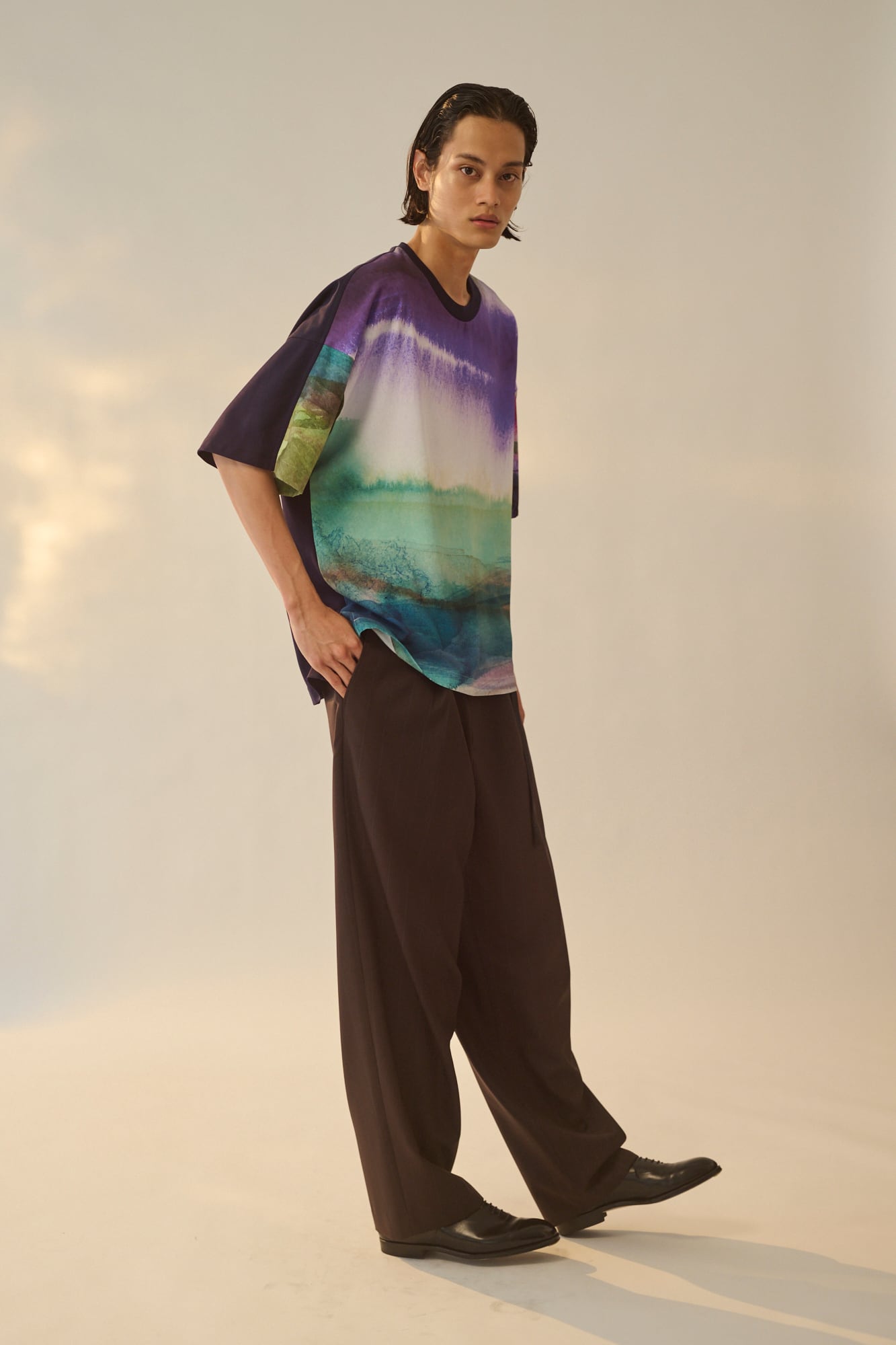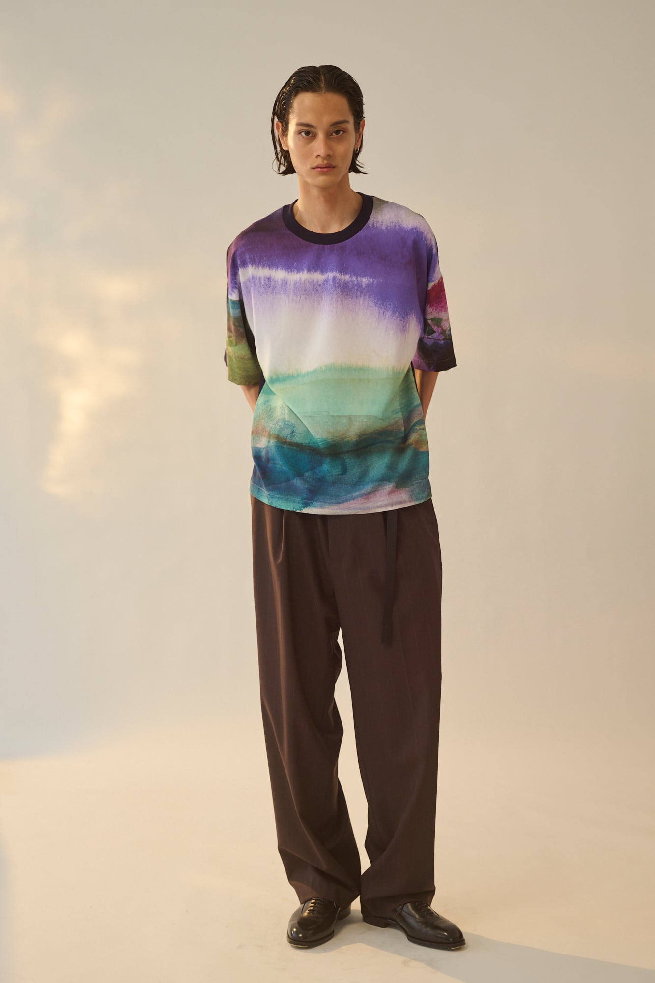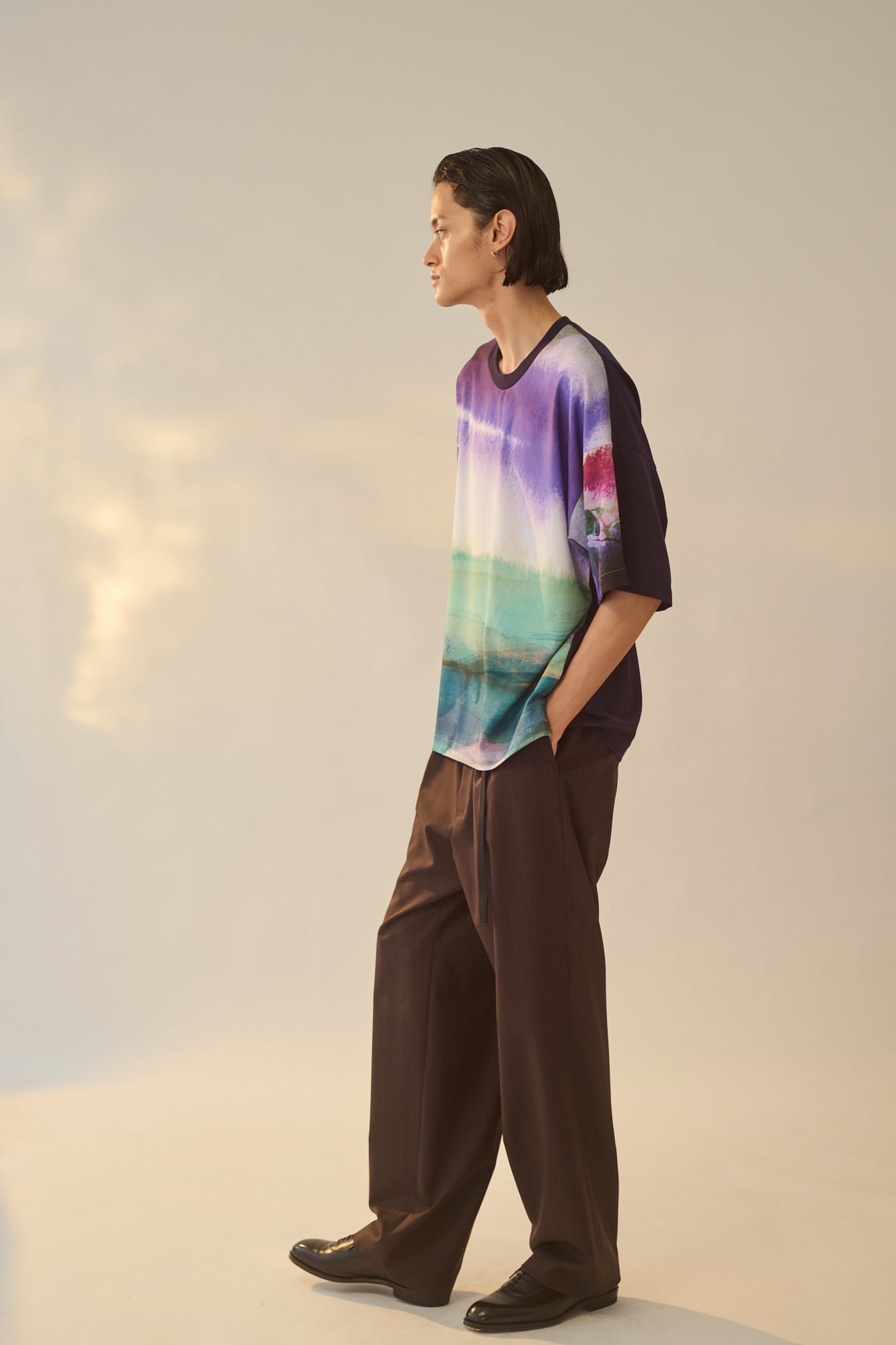 ジョーゼット生地にプリントを施した素材です。記憶の中に残る、静かに揺れる砂地の浜辺や日陰をつくる海浜植物の景色を、大胆かつグラフィカルに描きました。プリントカラーは、昼日中の光に包まれた明るい海辺と、宵のうちの幻想的な時間帯をイメージしています。軽やかな透け感と柔らかな風合いが、豊かな表情を演出します。