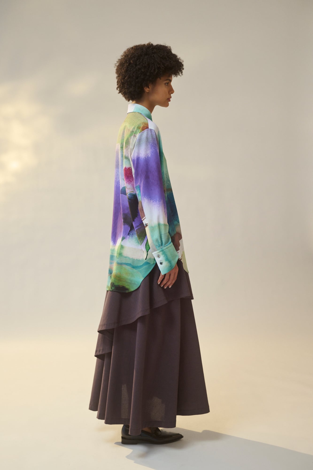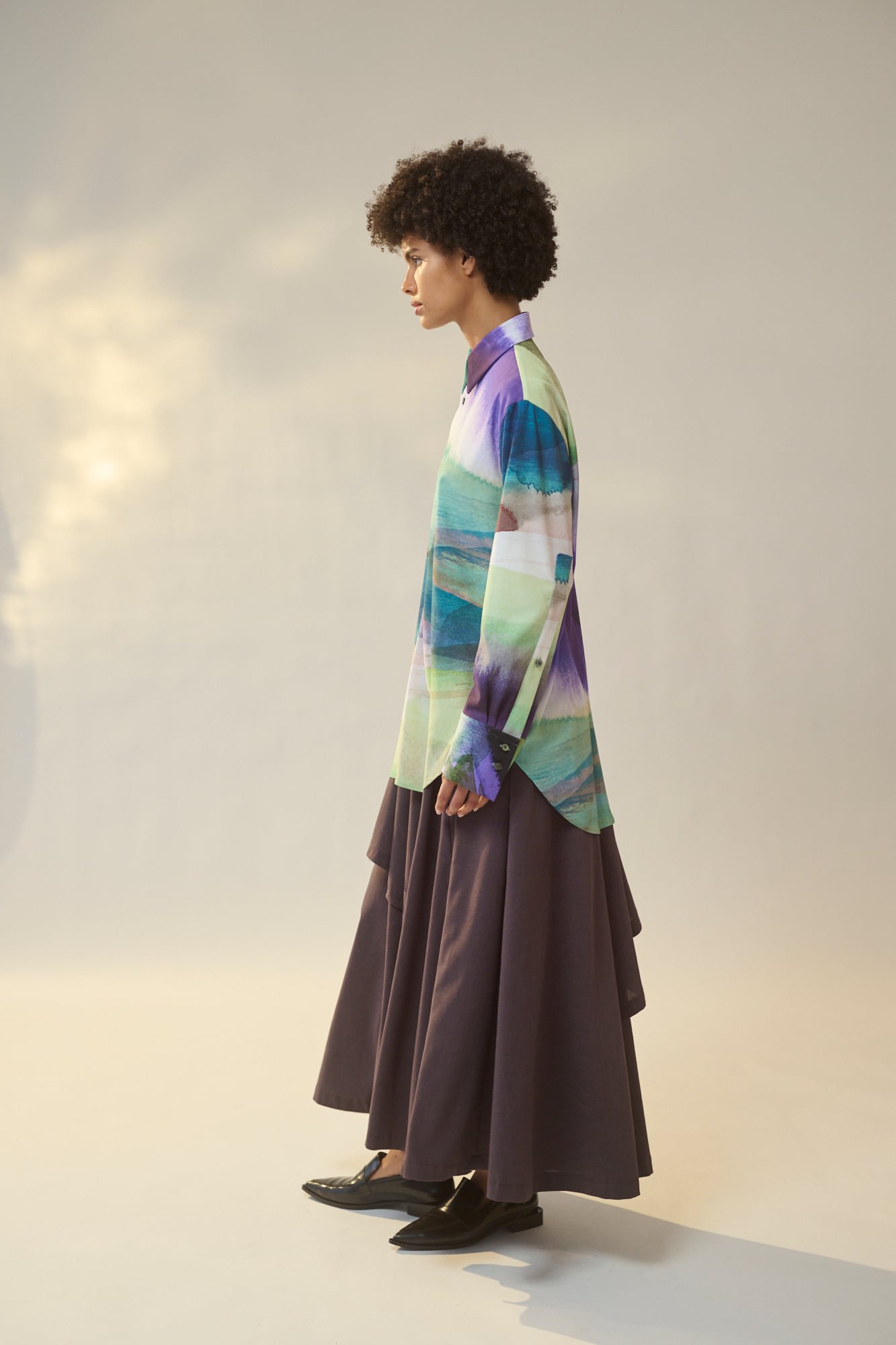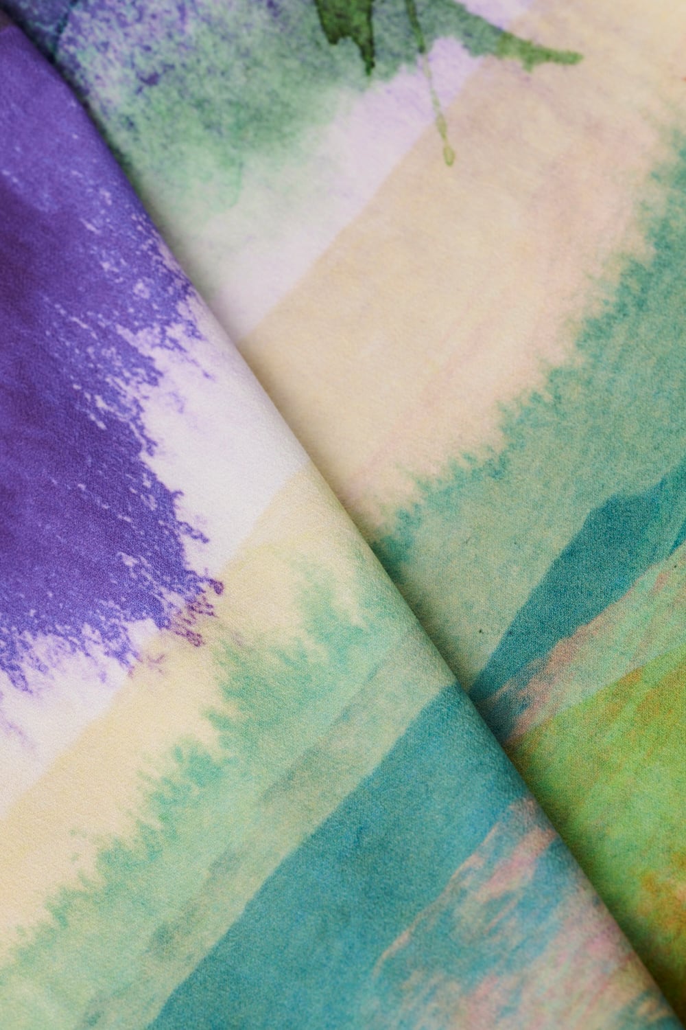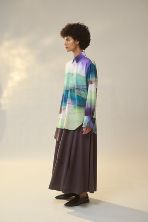 ジョーゼット生地にプリントを施した素材です。記憶の中に残る、静かに揺れる砂地の浜辺や日陰をつくる海浜植物の景色を、大胆かつグラフィカルに描きました。プリントカラーは、昼日中の光に包まれた明るい海辺と、宵のうちの幻想的な時間帯をイメージしています。軽やかな透け感と柔らかな風合いが、豊かな表情を演出します。