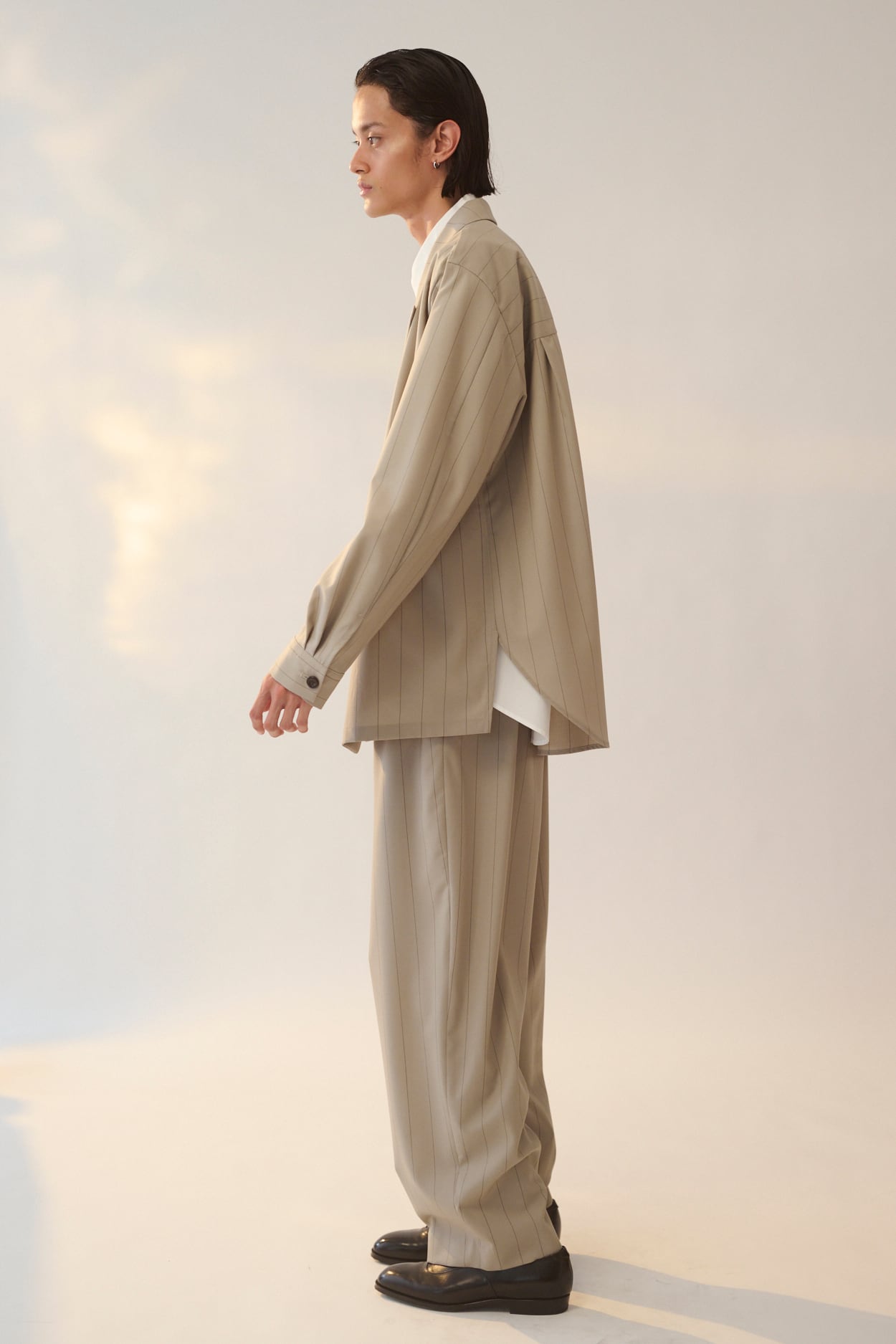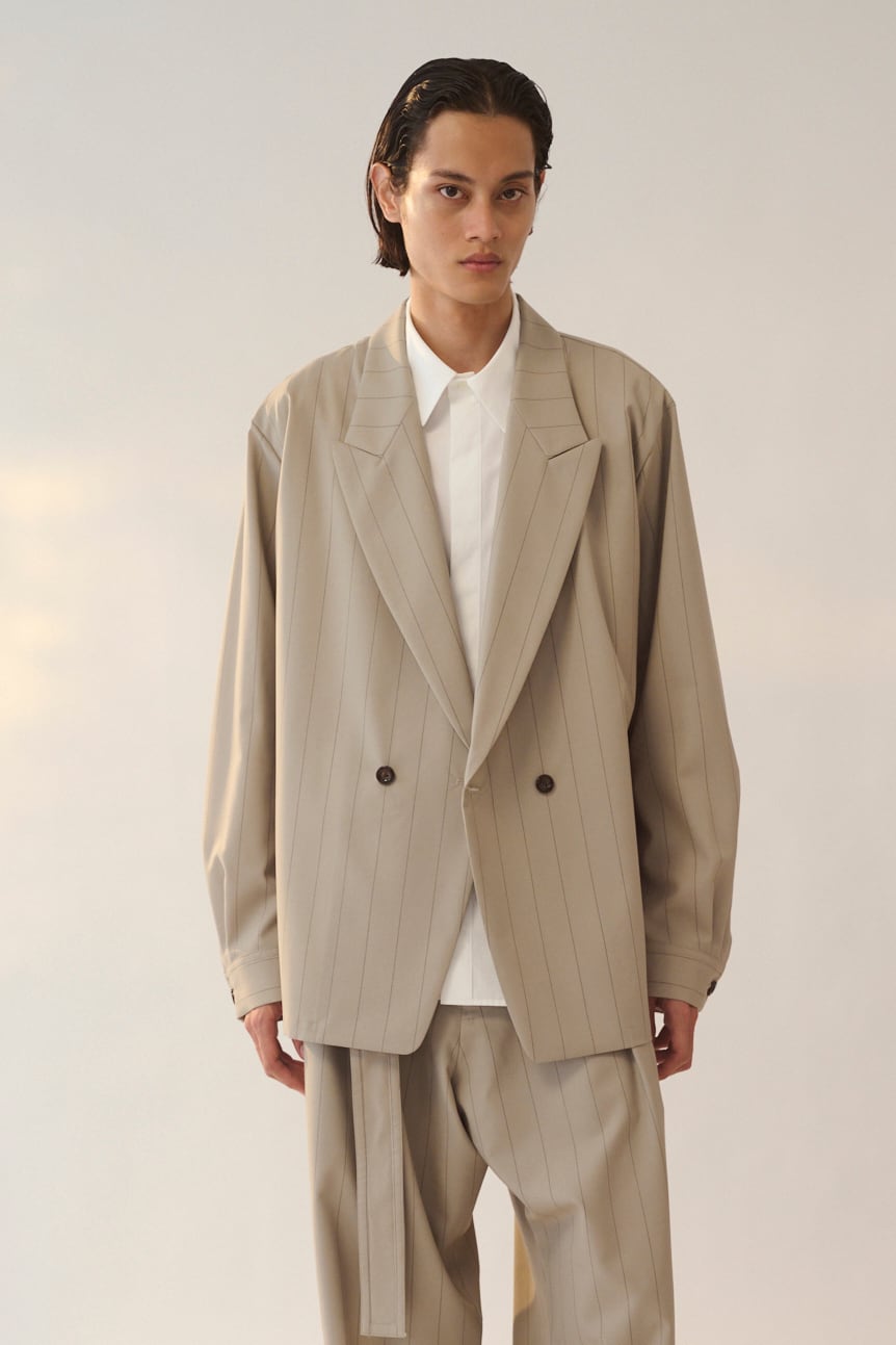 ピークドラペルの端正な表情を持ちながら、ヨーク仕⽴てやカフス仕様の袖⼝といったシャツの要素を巧みに融合させた⼀着です。