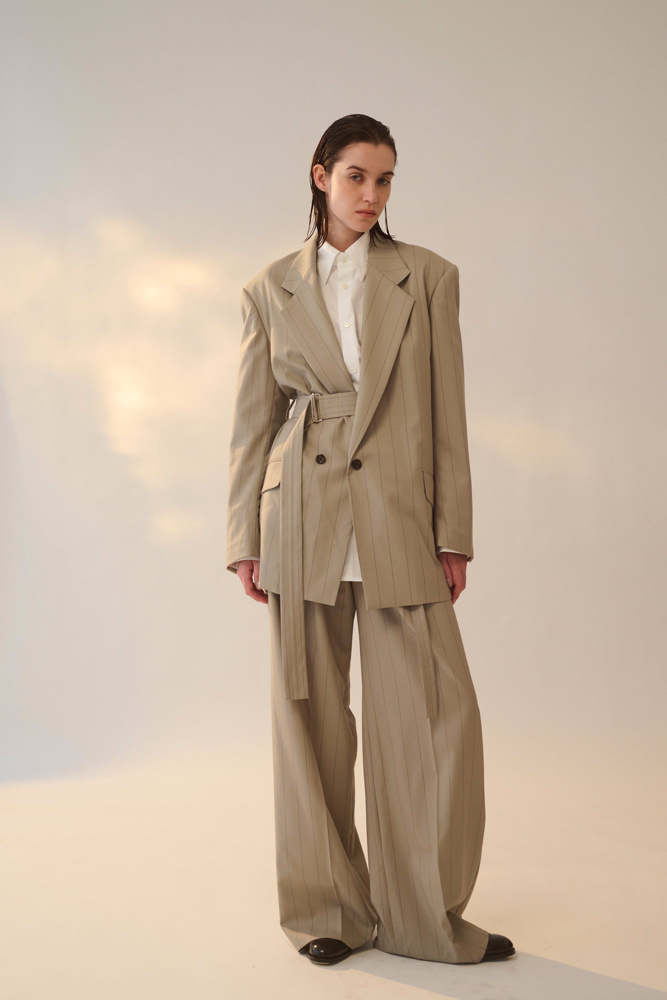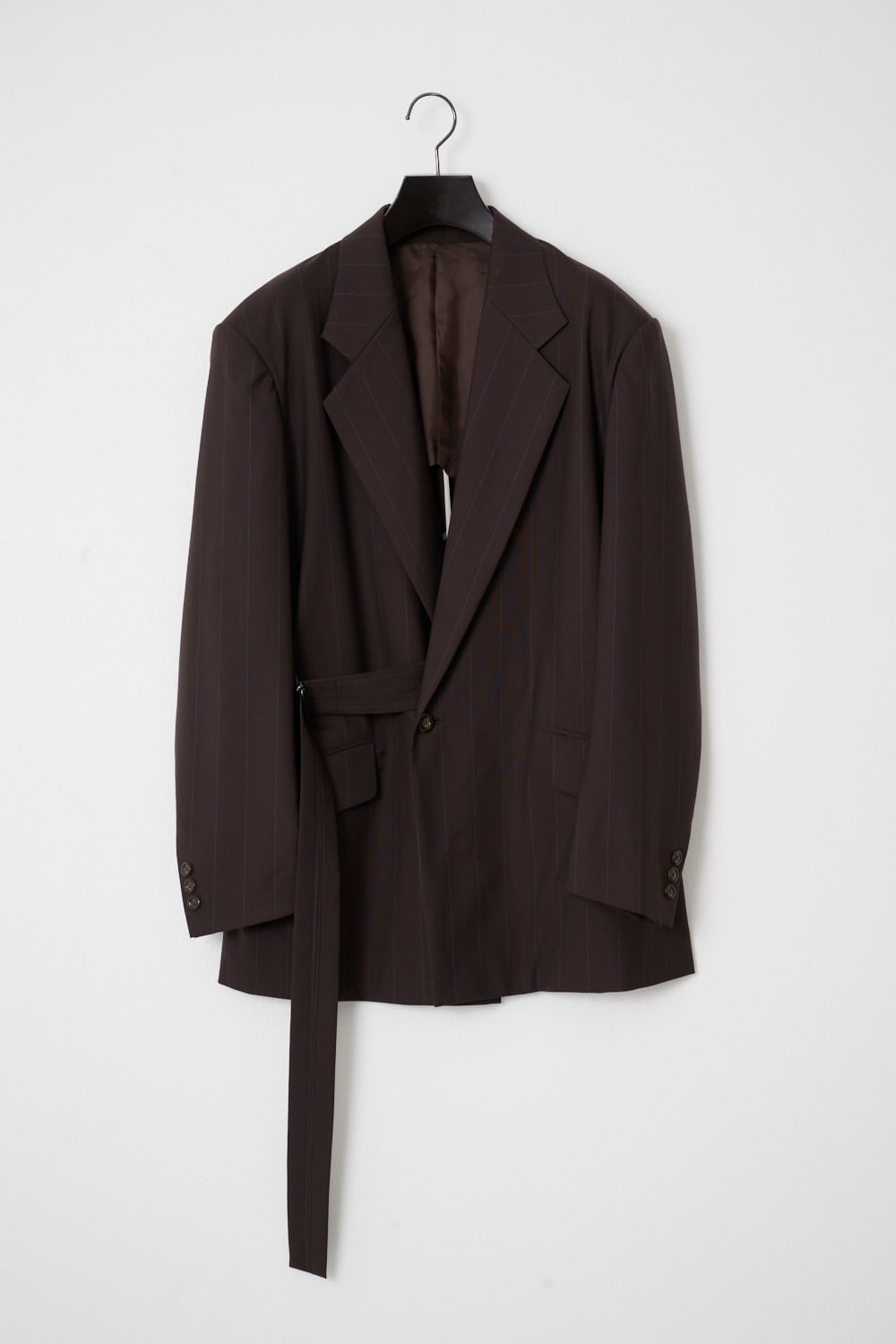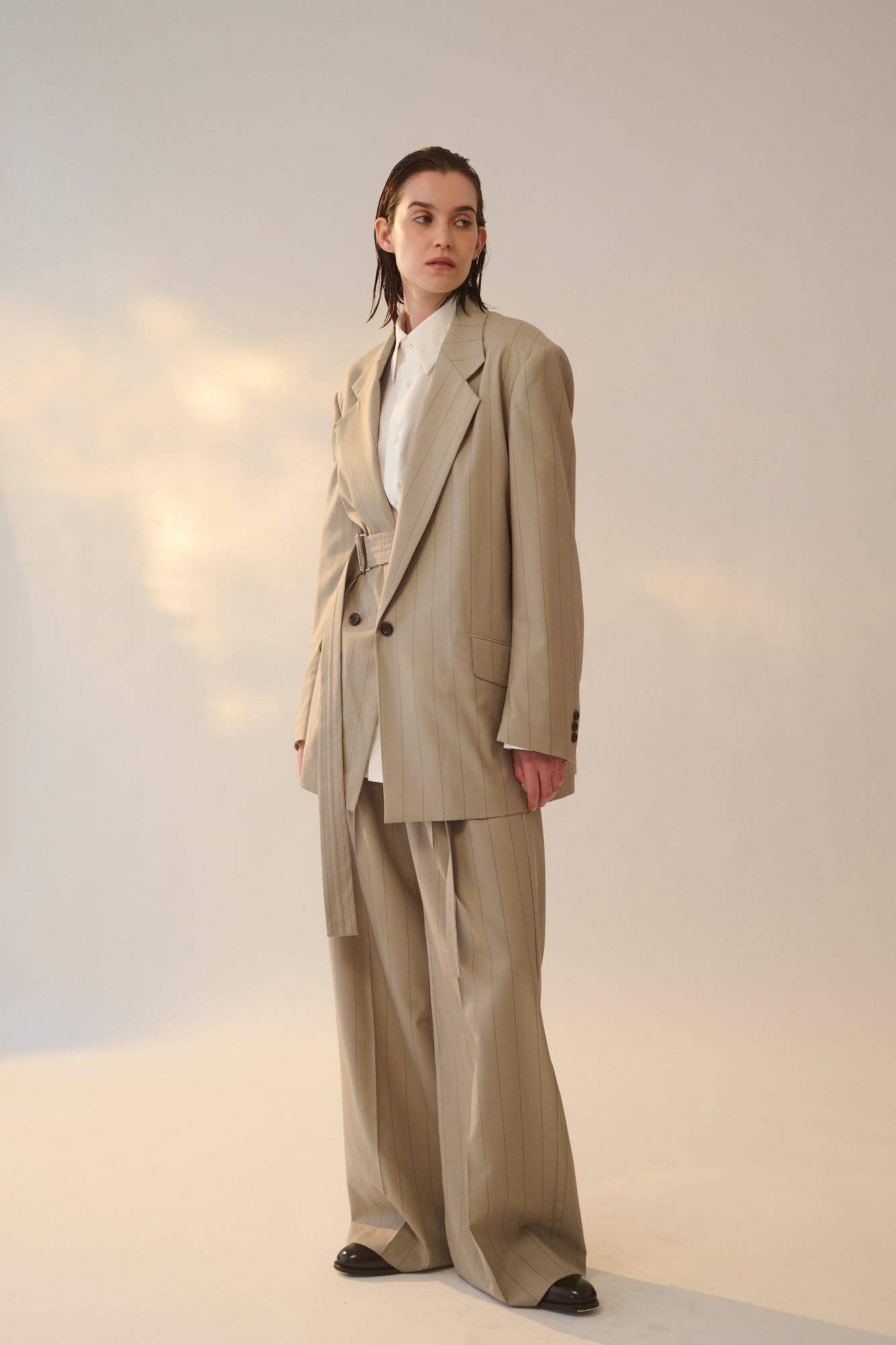 オーバーサイズに仕立てたテーラードカラージャケットです。後ろのスリットから通したベルトでシルエットにメリハリを出しモードな印象に仕上げました。