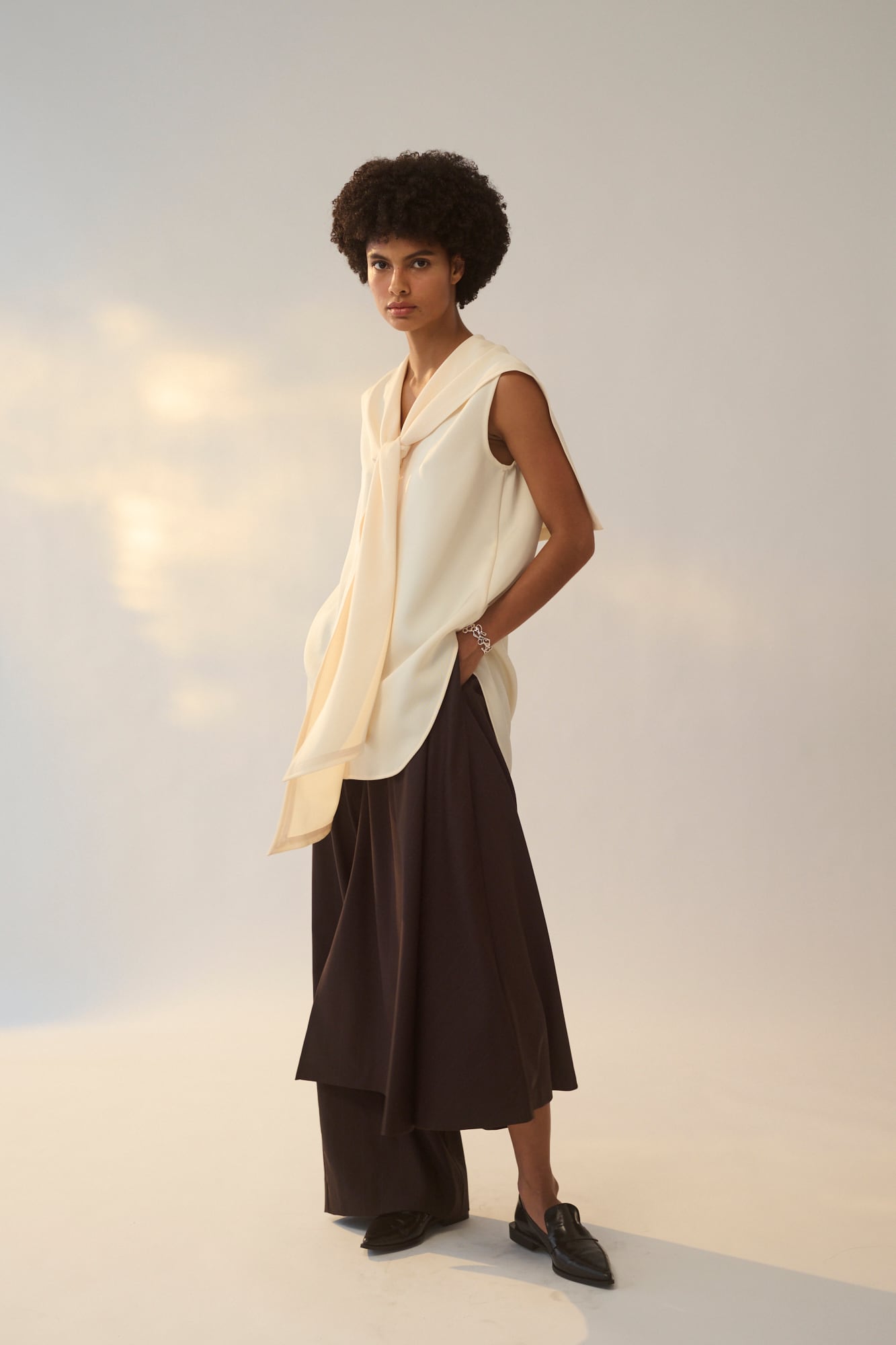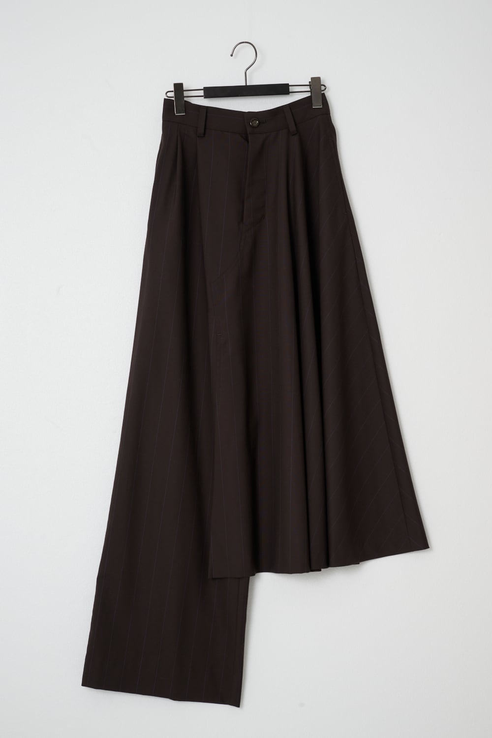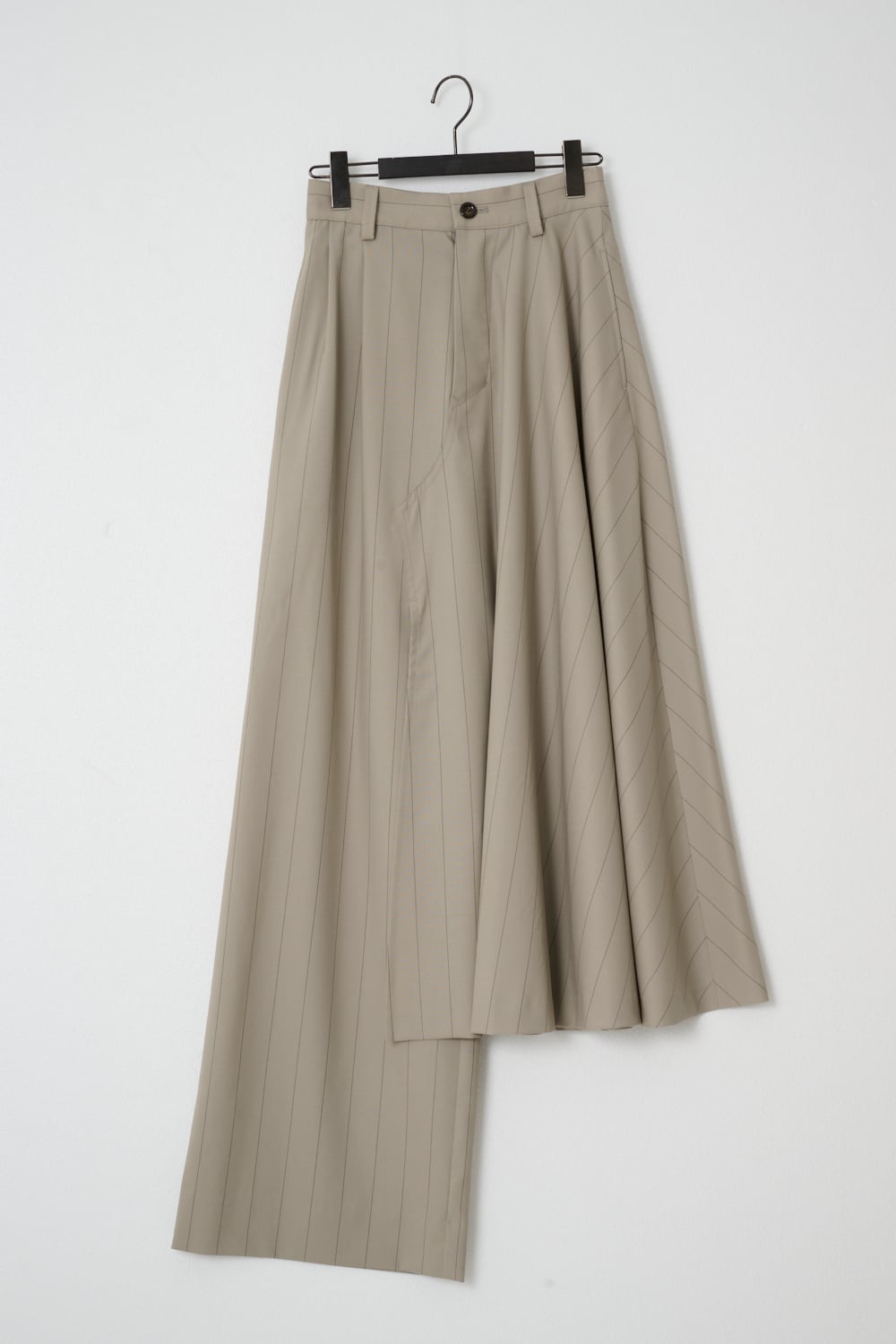 左はフレアスカート、右はワイドパンツで左右で異なるデザインを大胆に組み合わせました。アシンメトリーなシルエットがスタイリングの主役になる1着です。