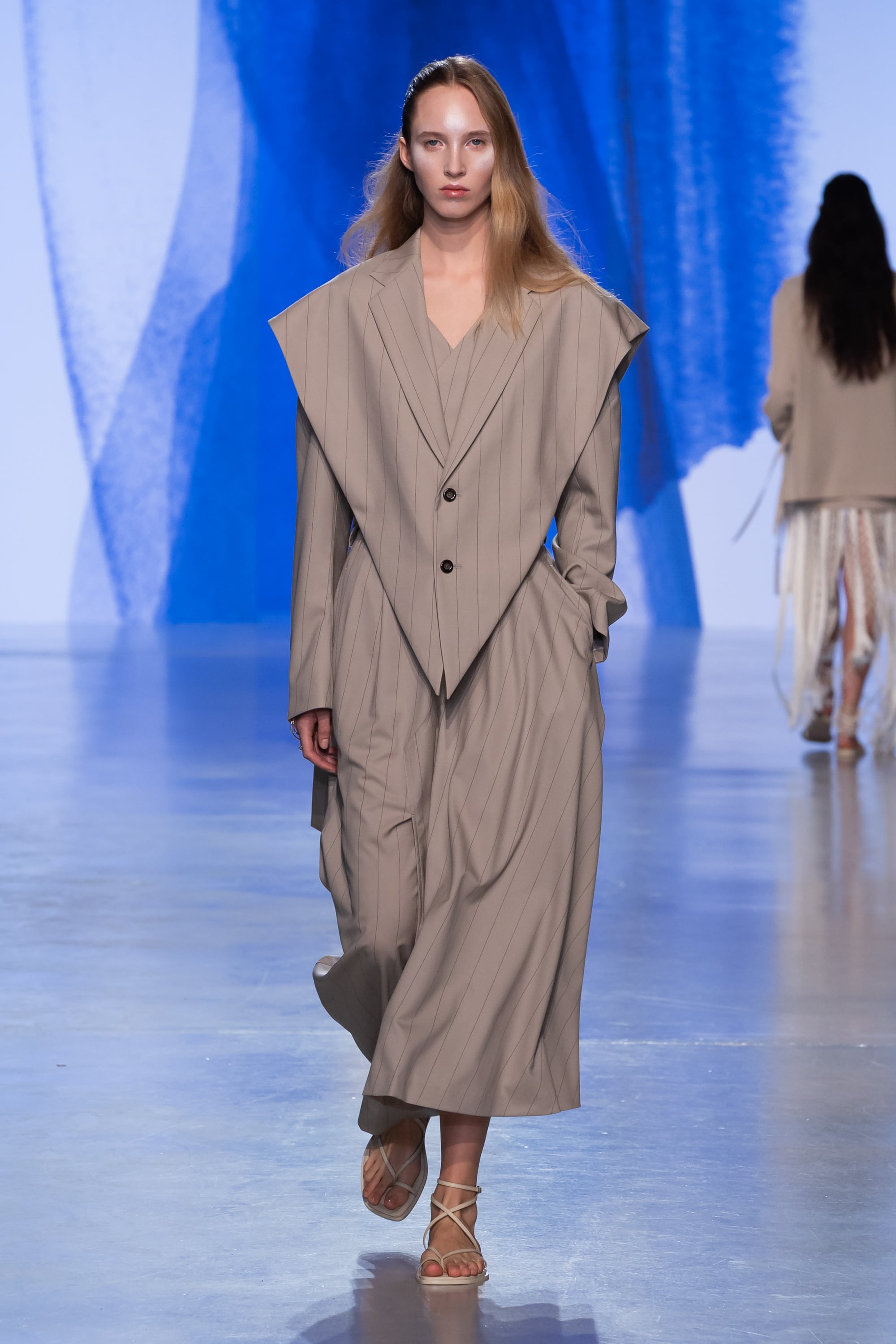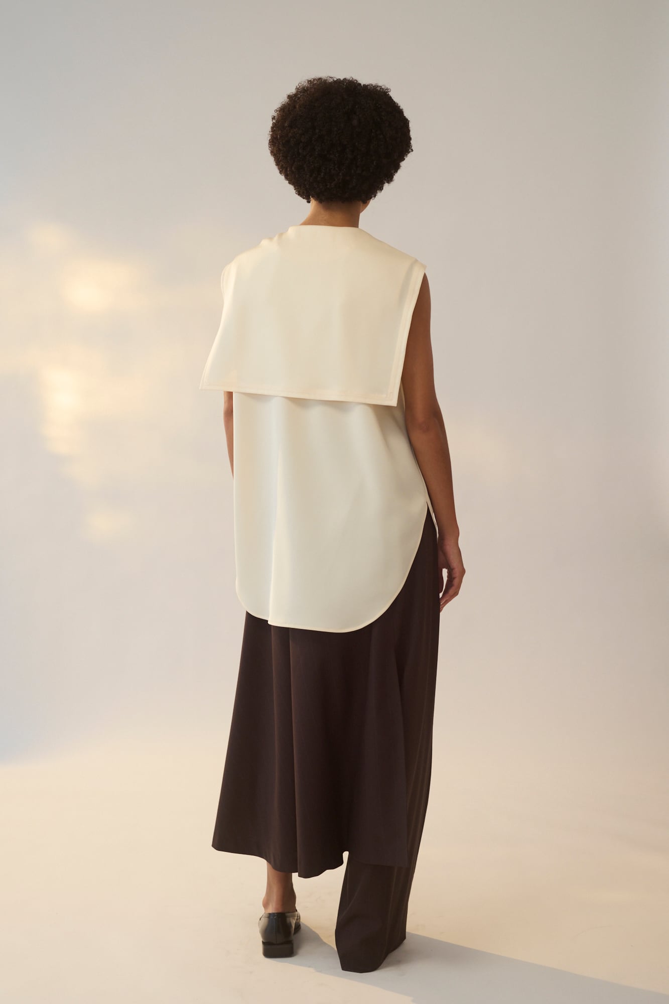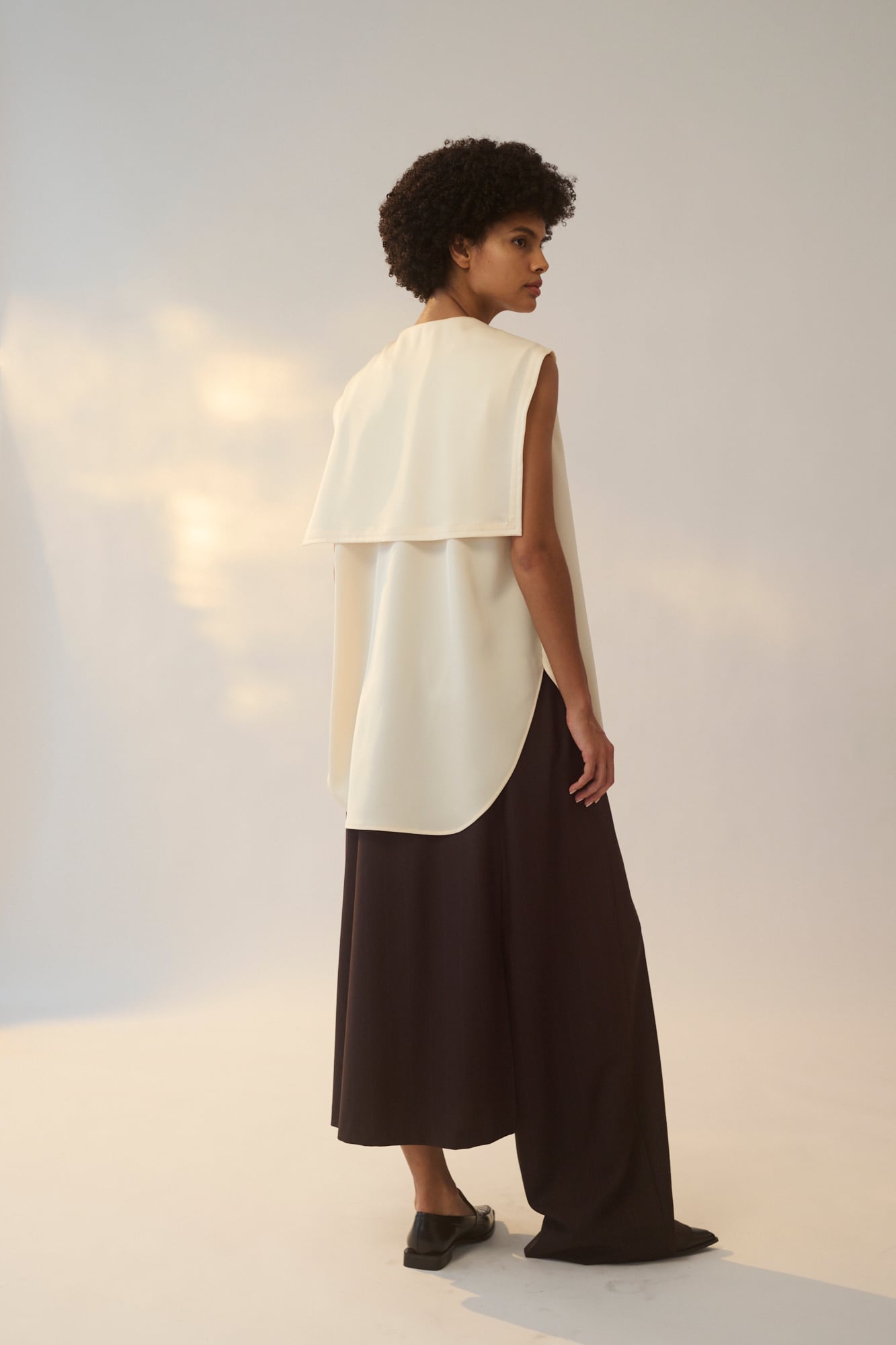 左はフレアスカート、右はワイドパンツで左右で異なるデザインを大胆に組み合わせました。アシンメトリーなシルエットがスタイリングの主役になる1着です。