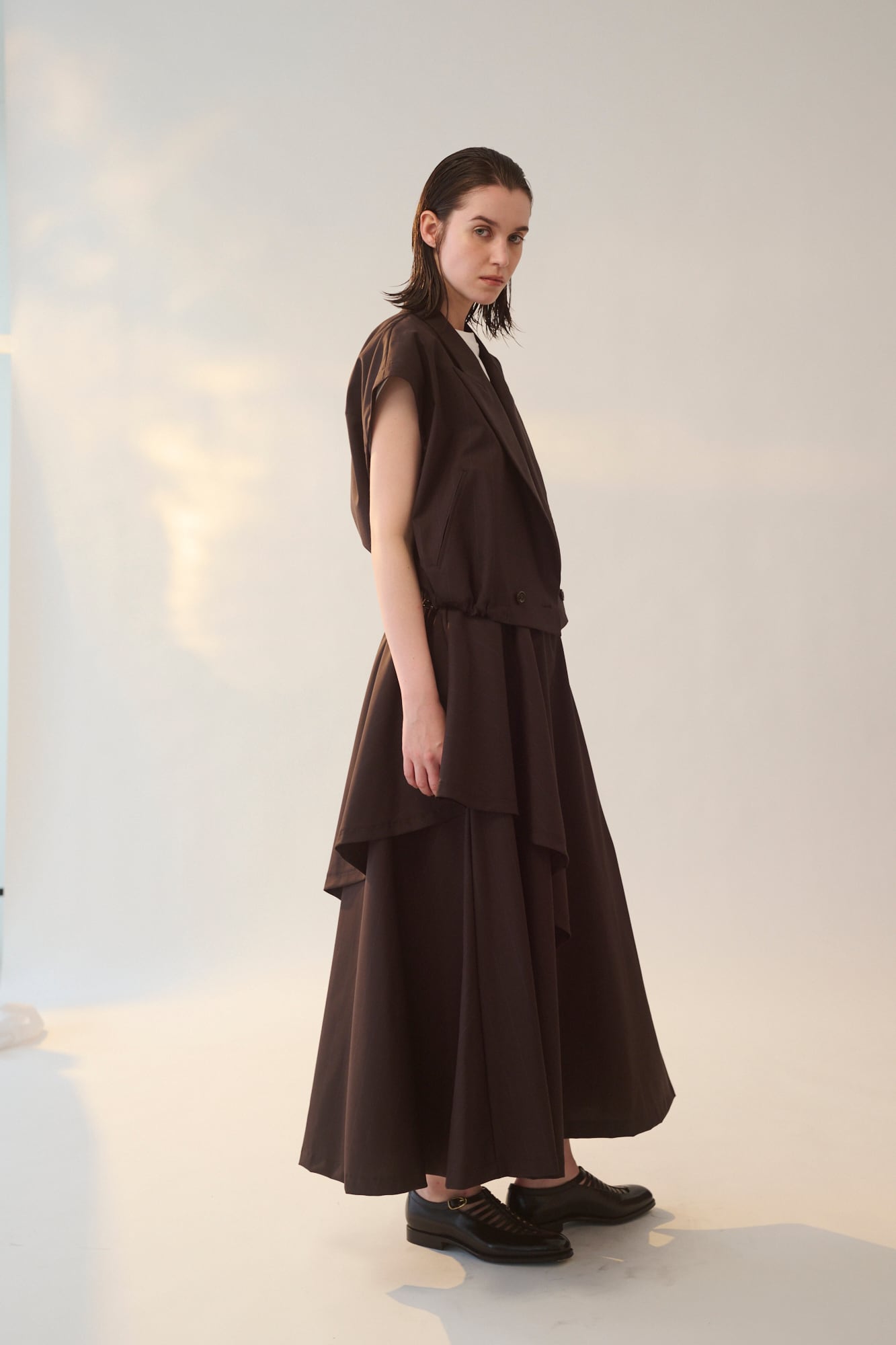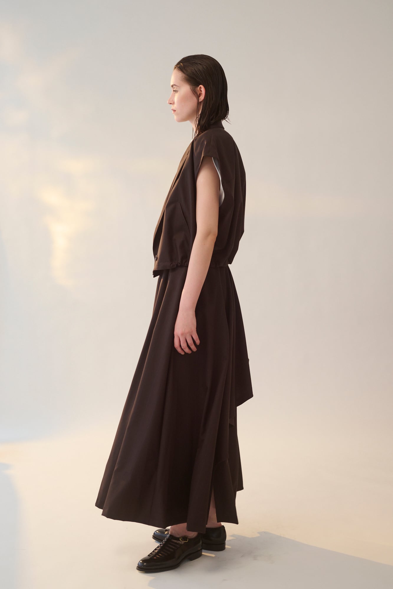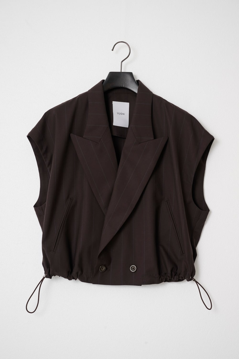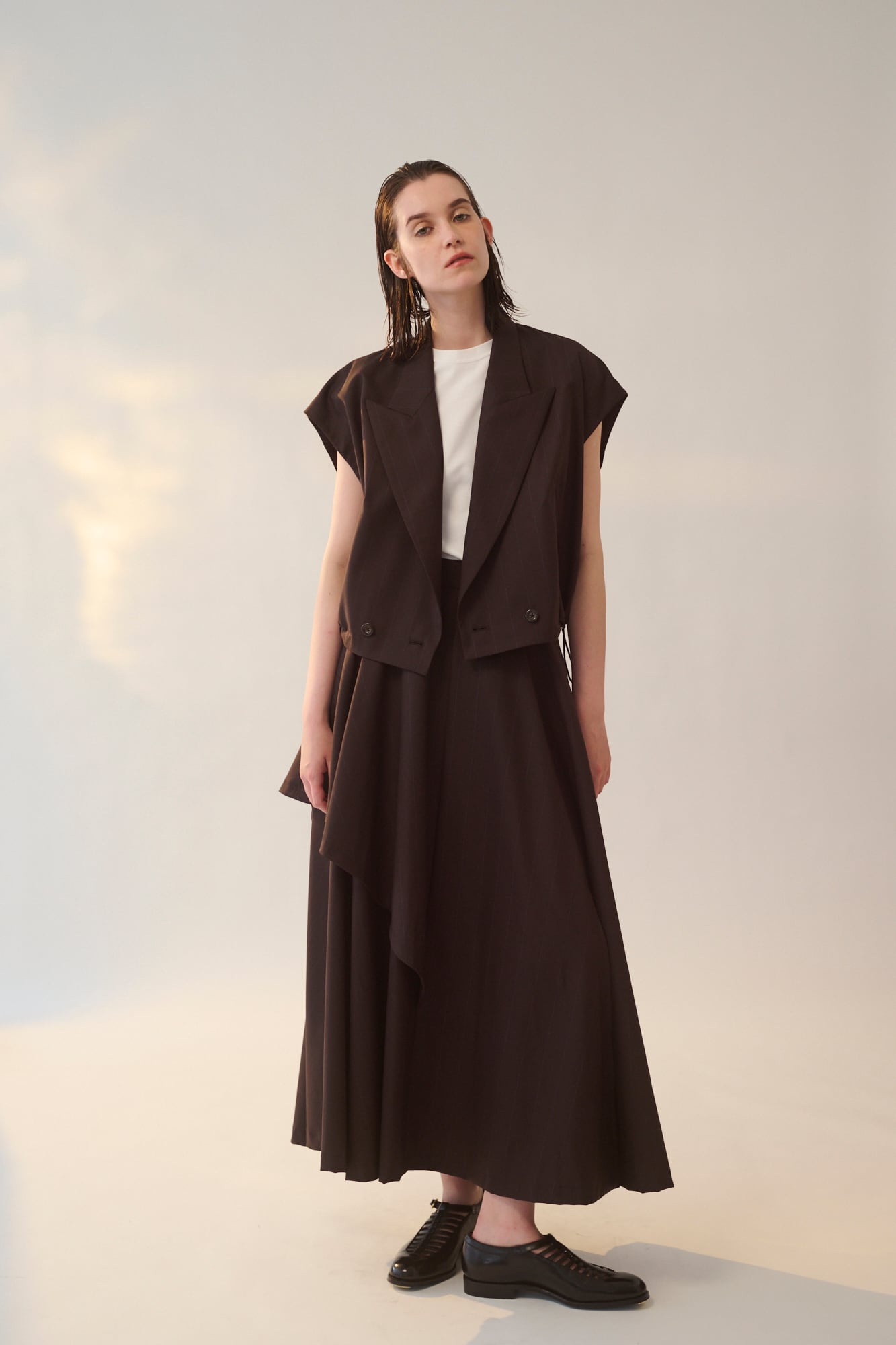 V字にカットしたシャープなシルエットが特徴のベストです。脇が開いた仕様でシャツやジャケットなど様々なアイテムにレイヤードできる幅広さが魅力です。