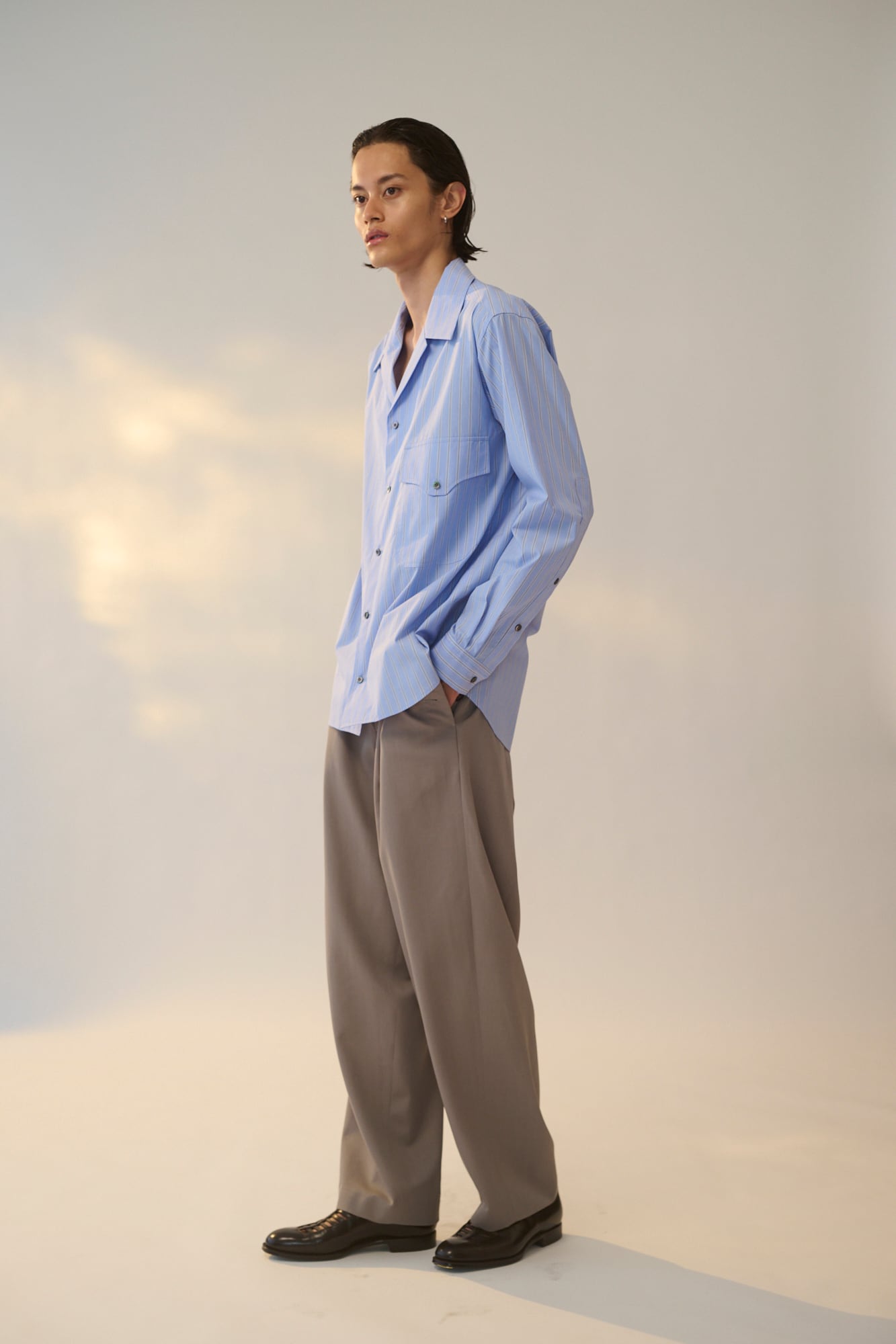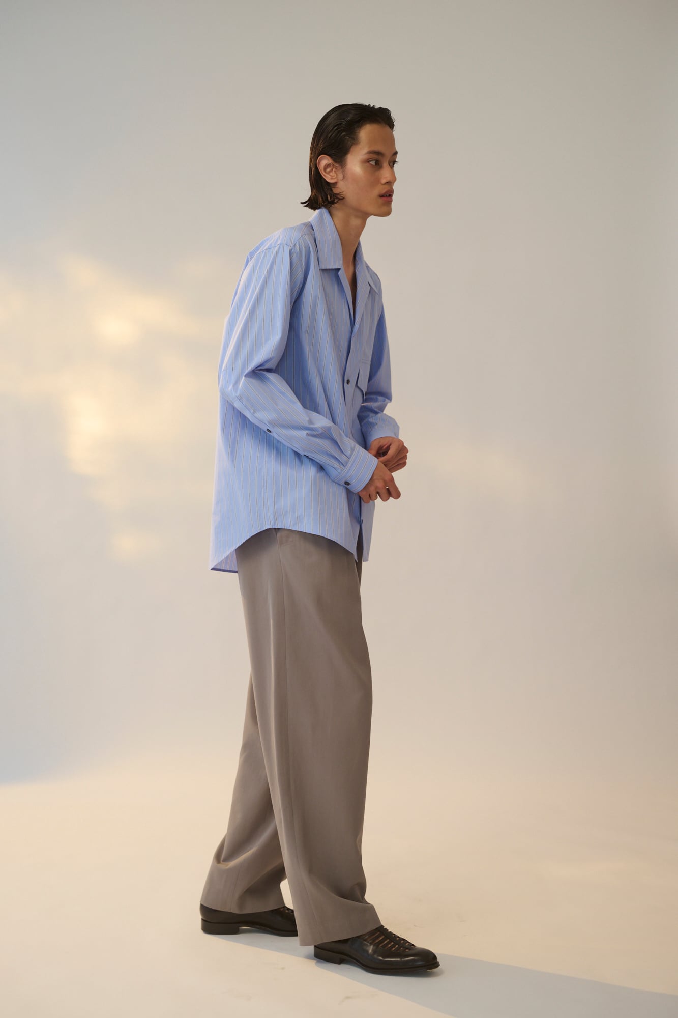 衿の開きを深めに設定することで胸元に抜け感を与え、細⾝のシルエットがシャープでモダンな印象に仕上げています。