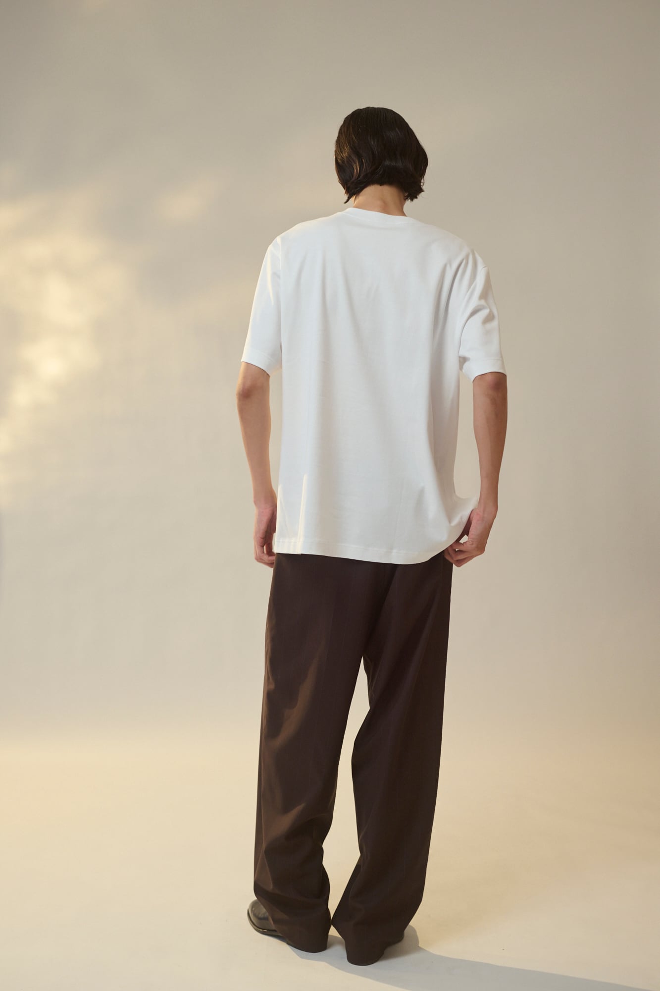 スーピマコットンの細番手糸を使用したハイゲージのモクロディ素材です。密度によるハリ感、細かい微起毛、特殊柔軟仕上げによる柔らかな手触りが特徴の生地です。