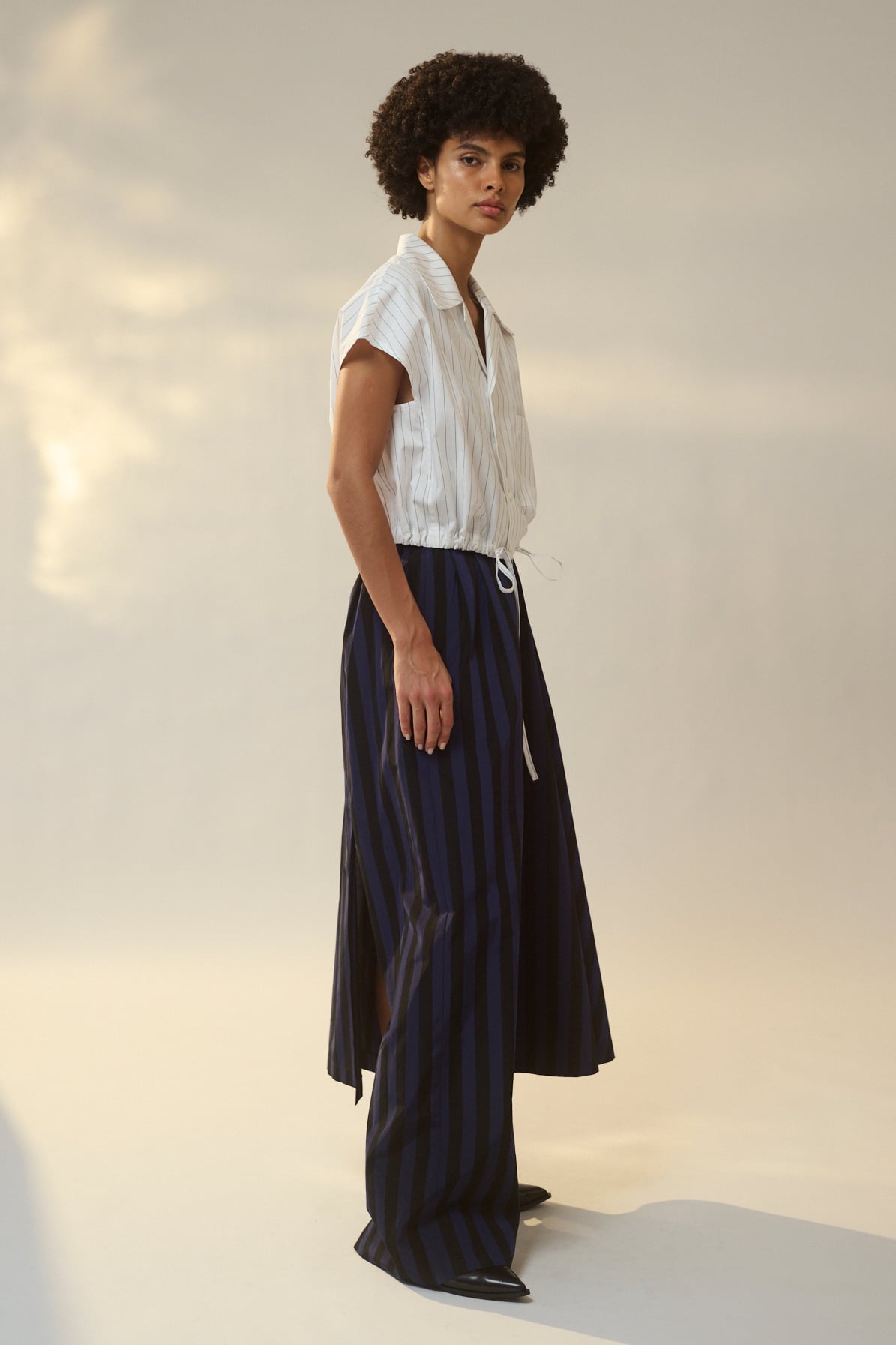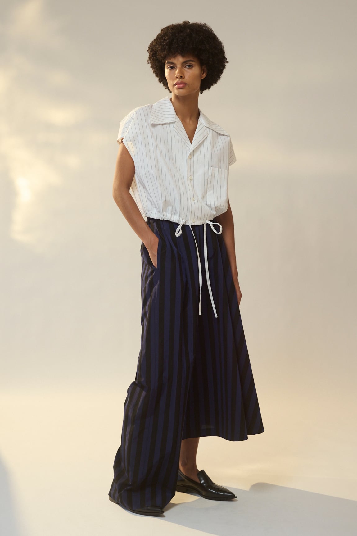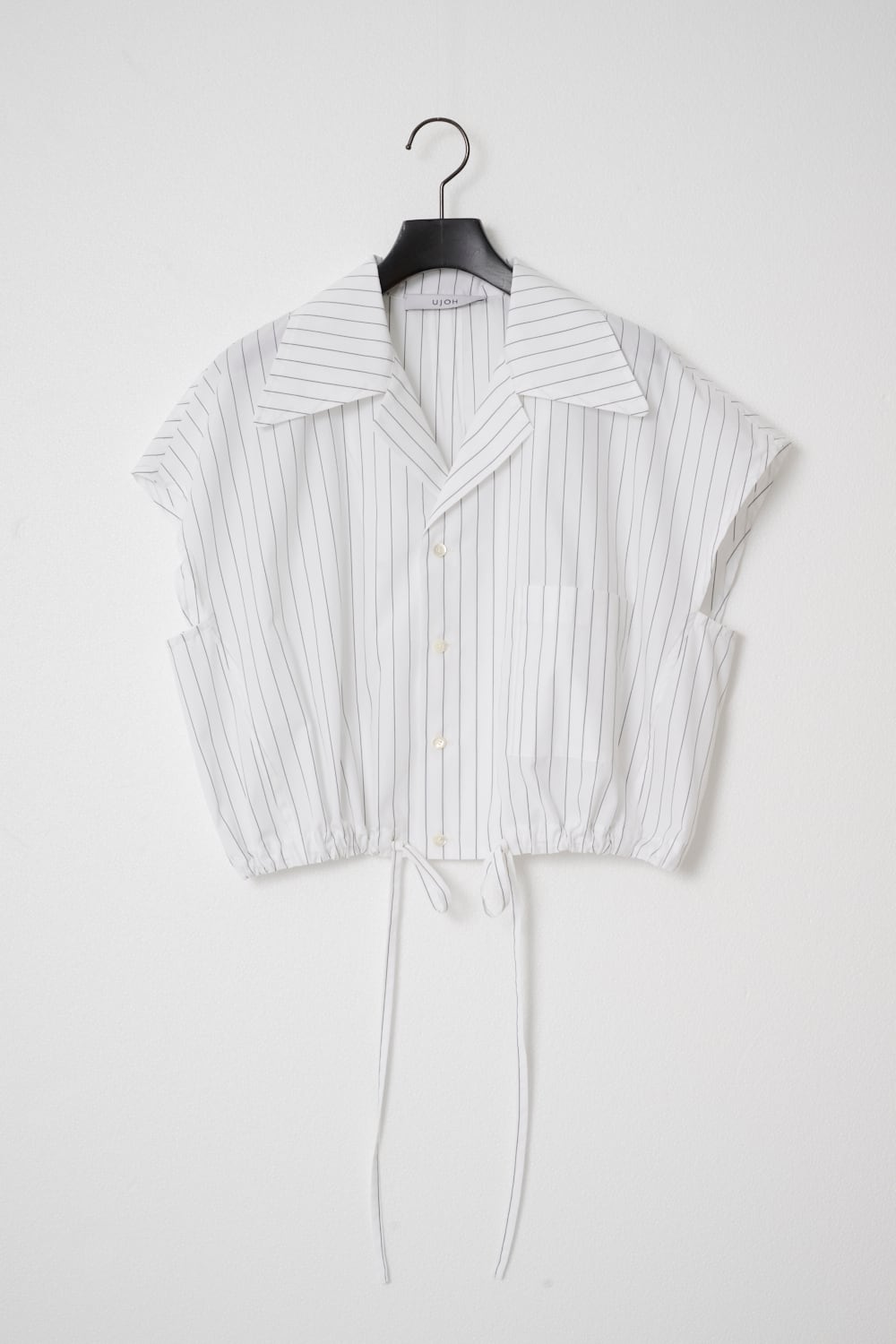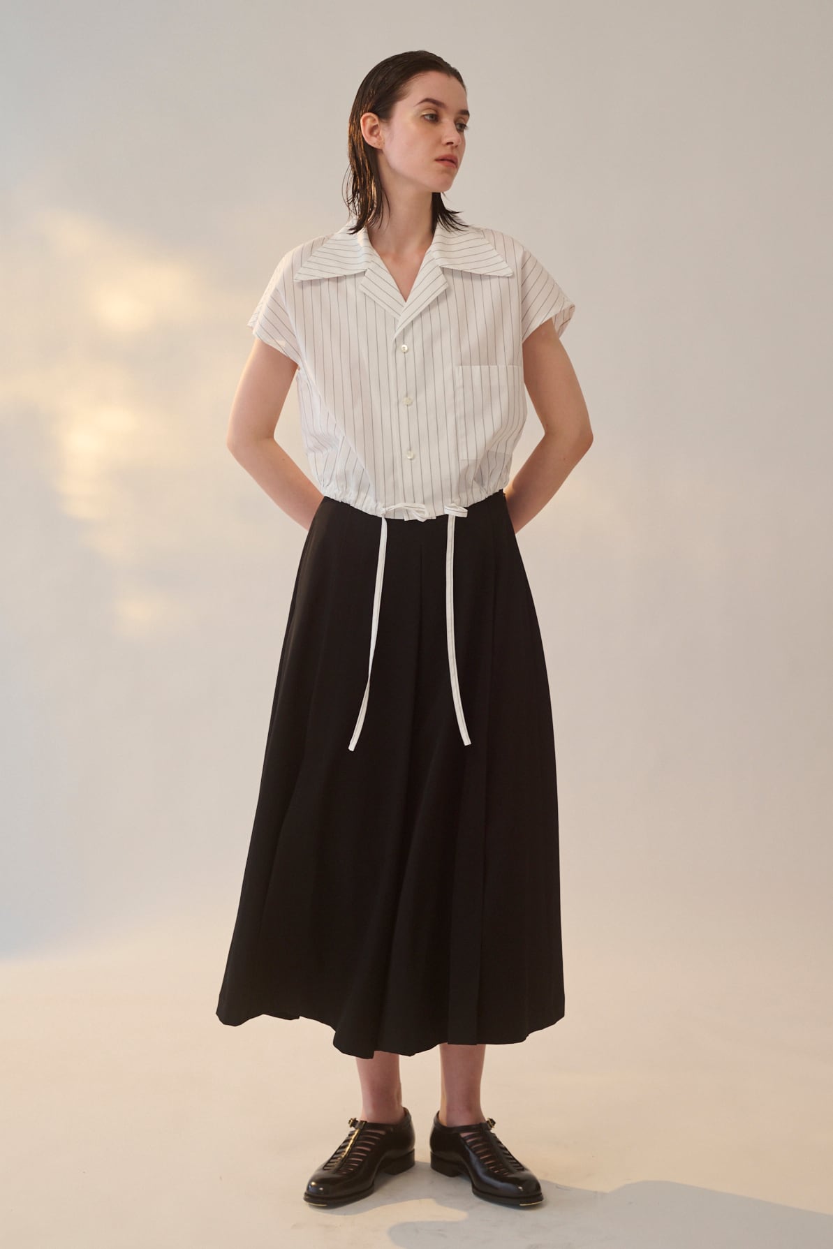 コンパクトなシルエットに大きい衿が特徴のオープンカラーシャツです。ギャザーを寄せたウエストから垂れるドローコードがアクセントになっています。